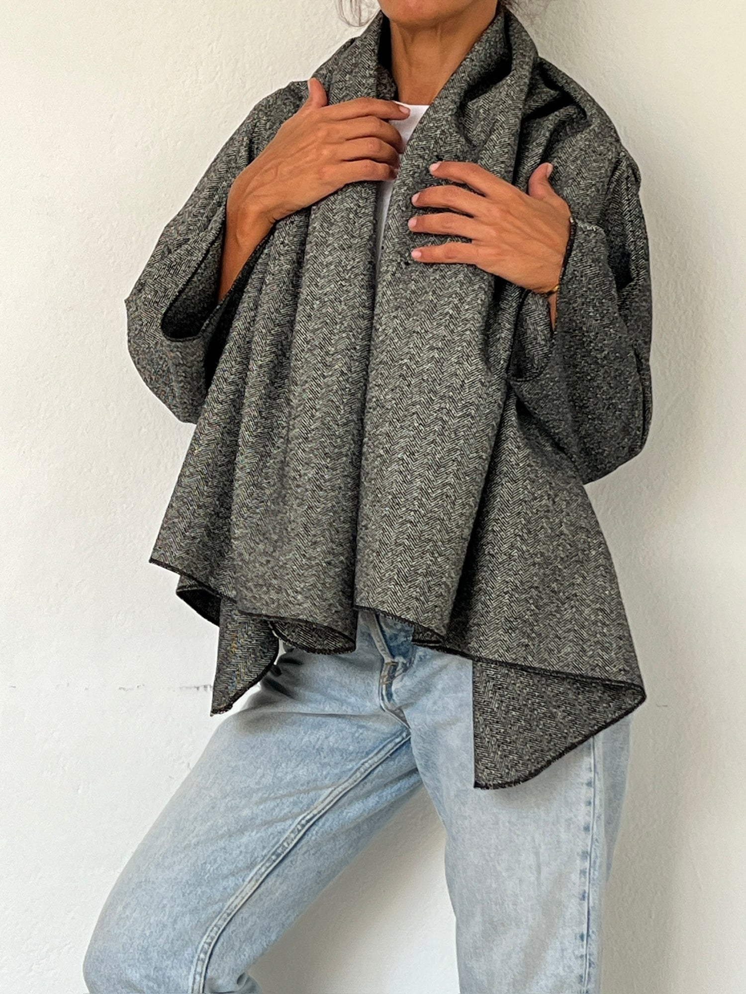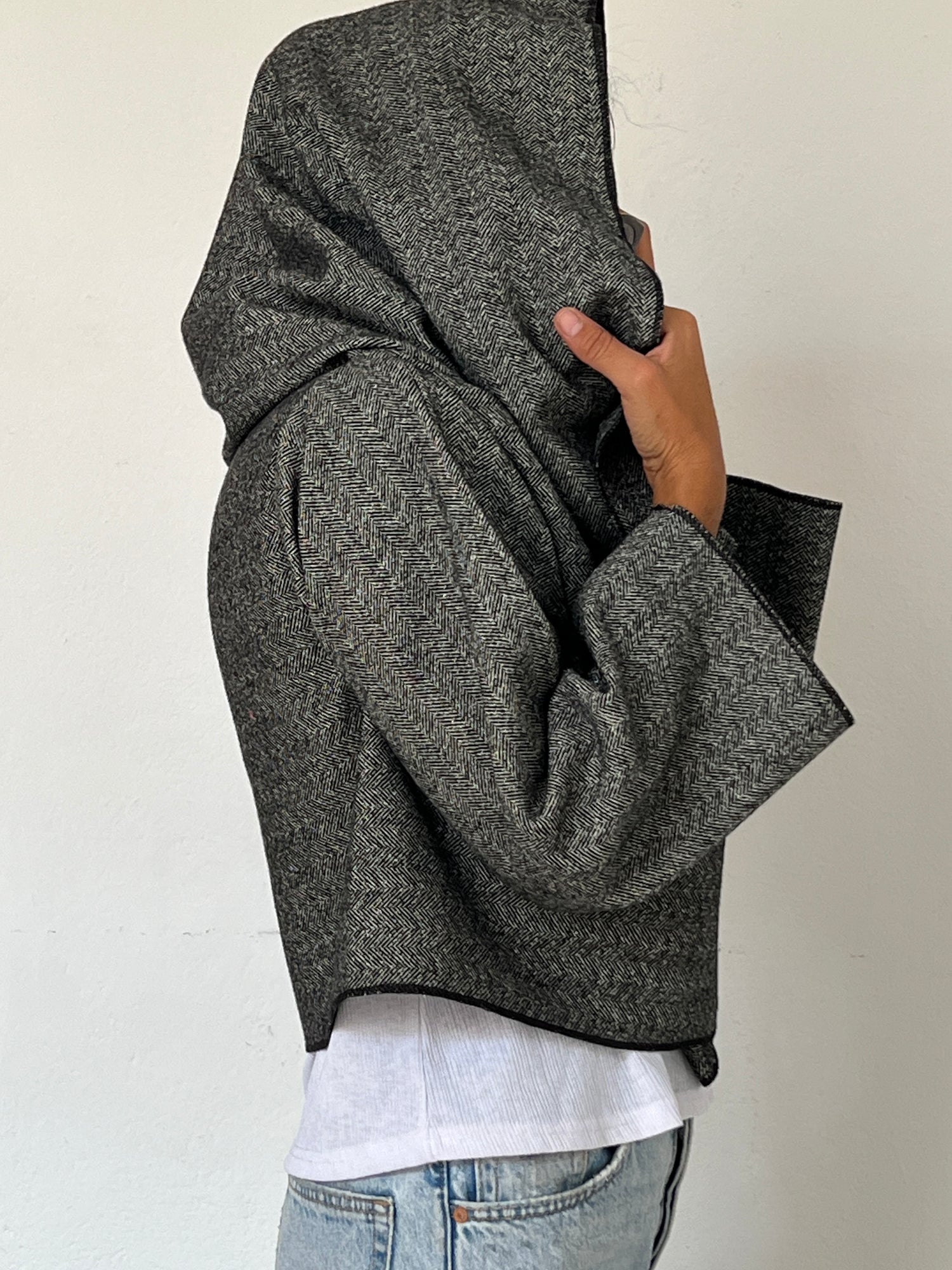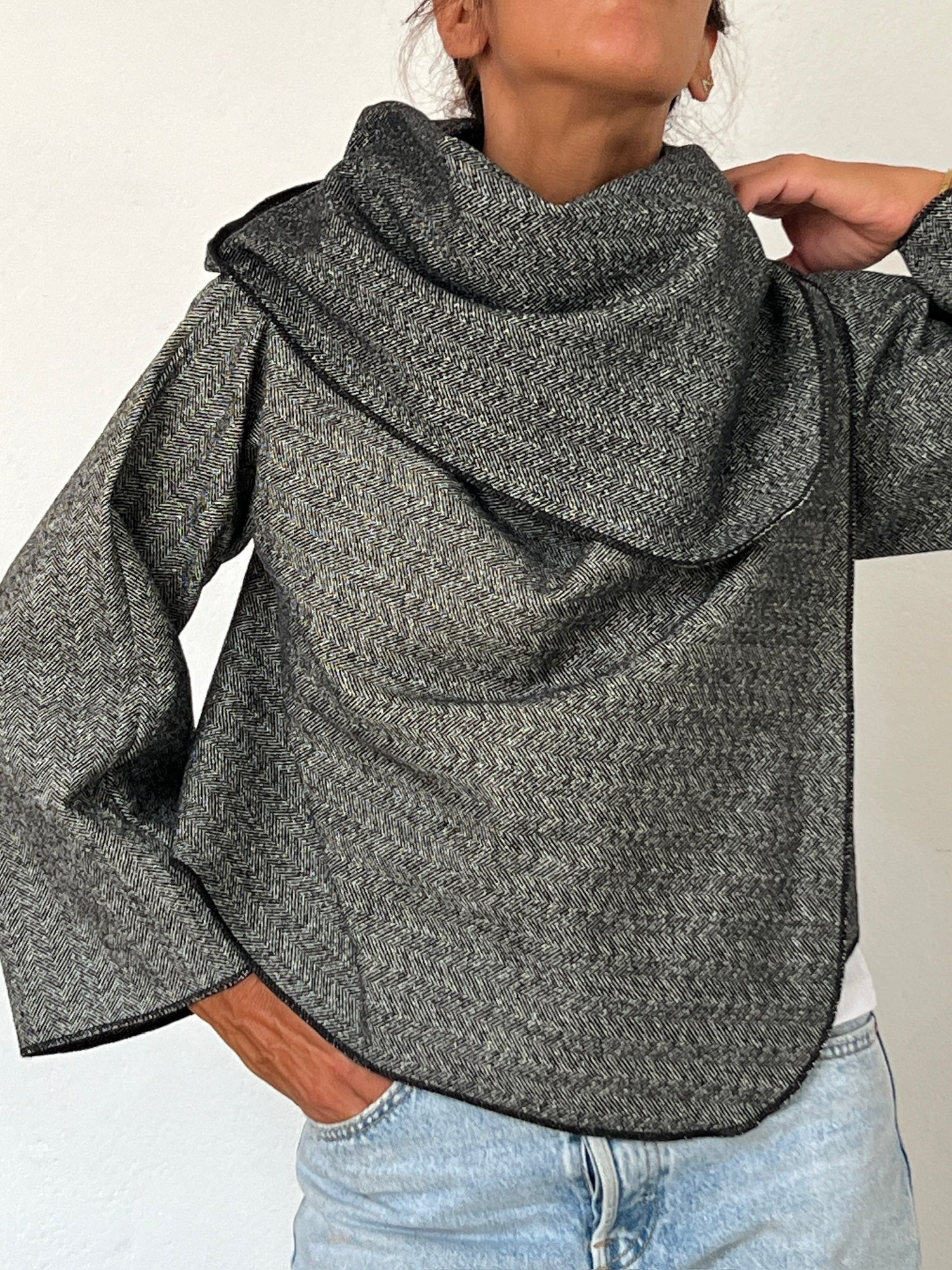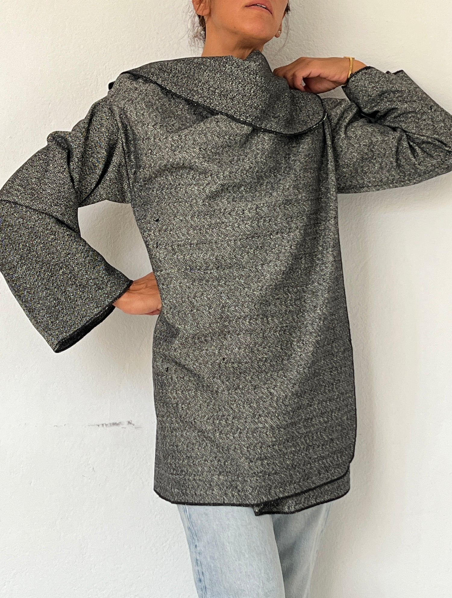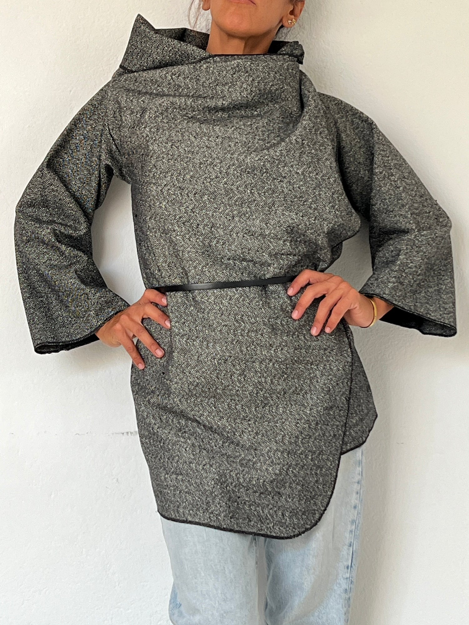 In this short version, the coat invites you to play with the extra fabric around the neckline. Instead of wearing it only as volume around the collar, you can also lift it up and cover the head, creating a sophisticated hood effect.This styling feels both refined and mysterious, adding an almost enigmatic touch to the silhouette while offering real protection against wind and cold. The fabric wraps you completely, not only making the coat warmer, but also transforming it into a truly original statement piece.The hood can be worn fully over the head for a dramatic, cozy look, or simply pushed back and left resting behind the neck, like a relaxed hooded collar.A practical and effortless way to turn your coat into something entirely unique.