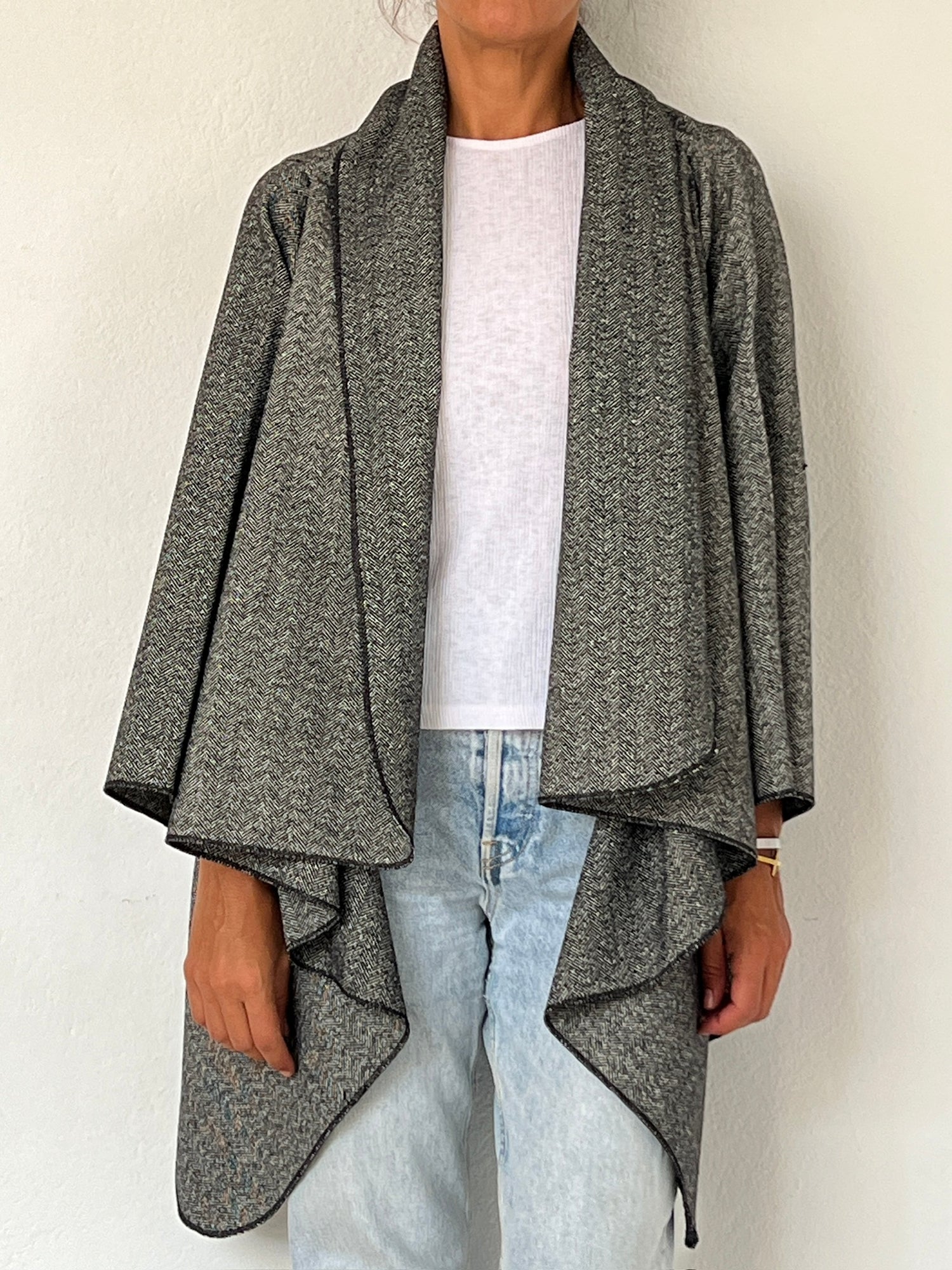 In this long version, the coat can be styled by crossing just one side over the body and placing it over the shoulder. The opposite panel is left to fall naturally, and its own weight helps hold the coat in place, creating a beautifully effortless drape.