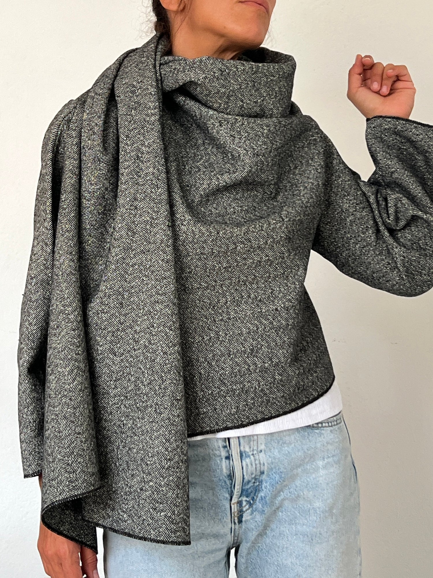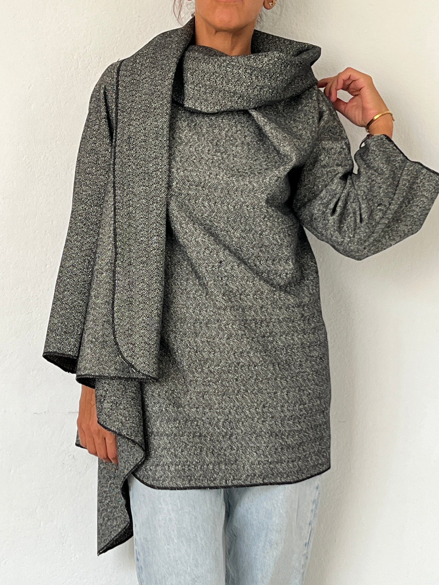 This styling transforms the coat into something difficult to define — part shawl, part oversized collar, almost like a sculptural pashmina — yet always effortless and wearable. The fabric gathers around the neckline and shoulder, adding presence and structure to the upper body while keeping the overall look light and modern.