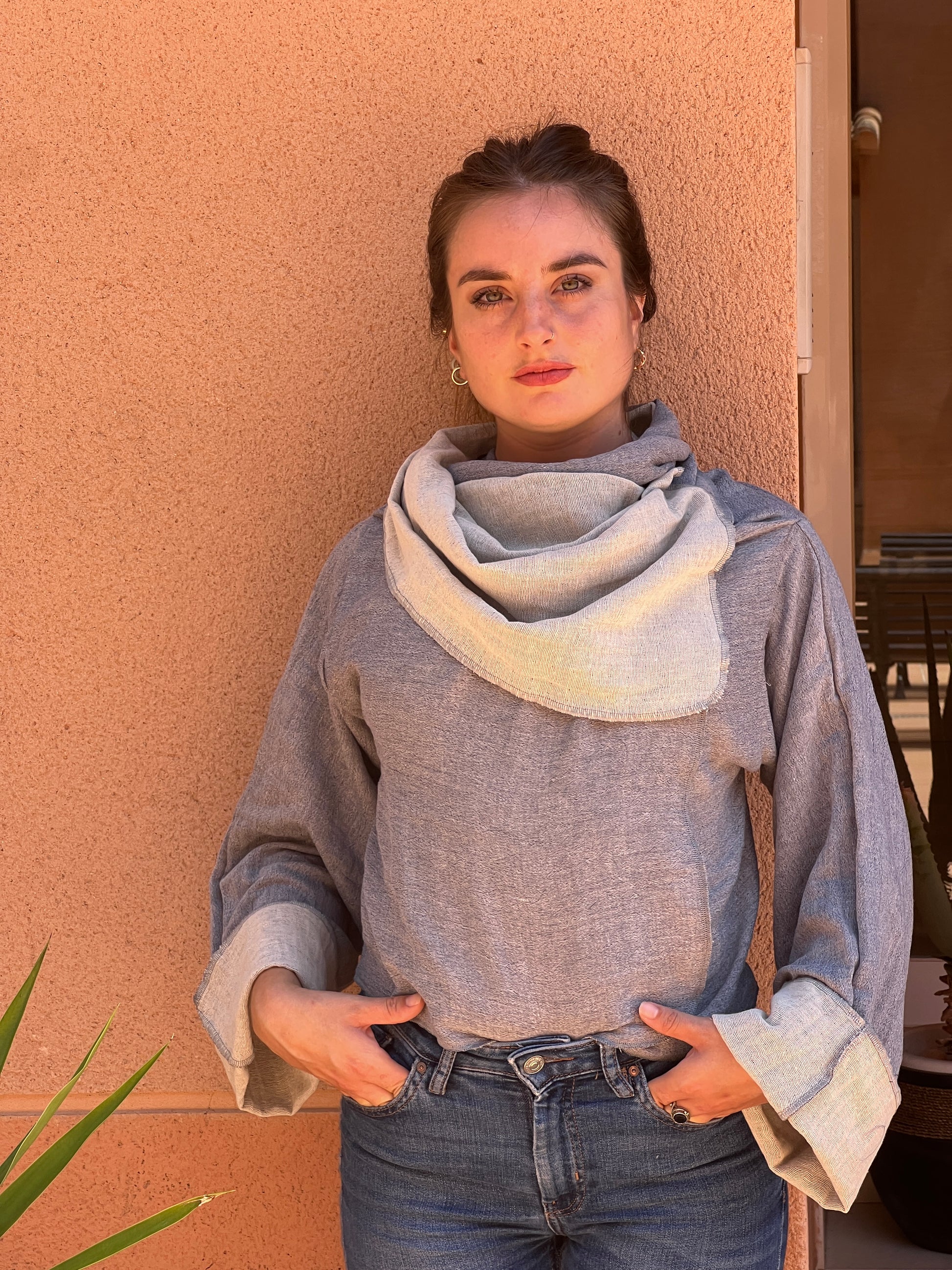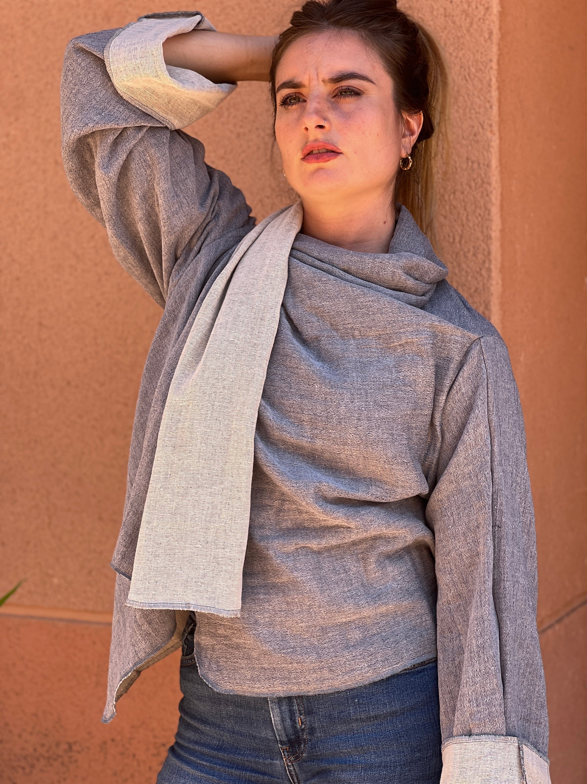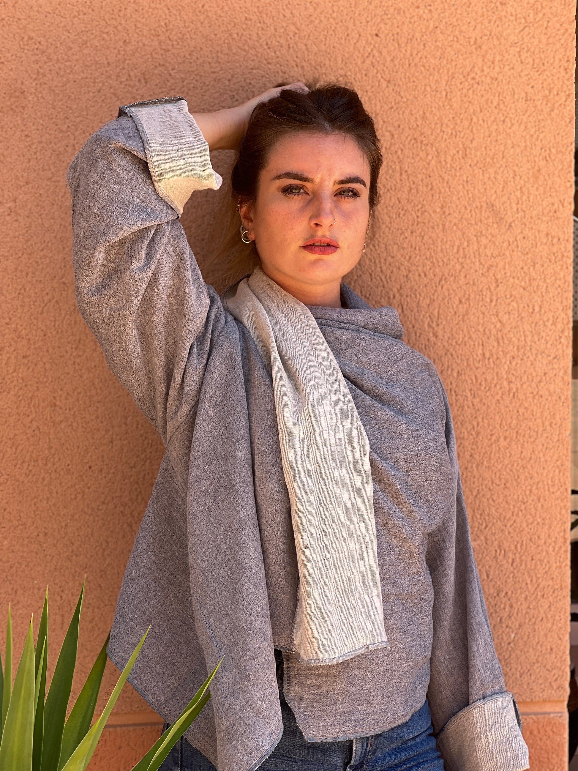 Confeccionado en un algodon suave y aspecto artesanal, combina un exterior en gris jaspeado. El interios es un blanco roto, aportando contraste, luz y sofisticación. Las mangas amplias y la caída ligera refuerzan la sensación de comodidad y libertad, mientras que su corte atemporal lo convierte en una pieza fácil de integrar en cualquier armario.