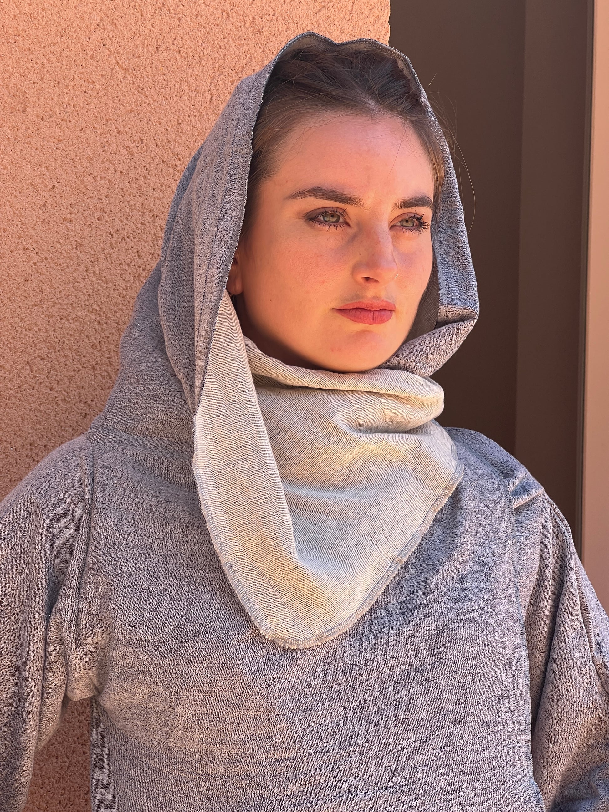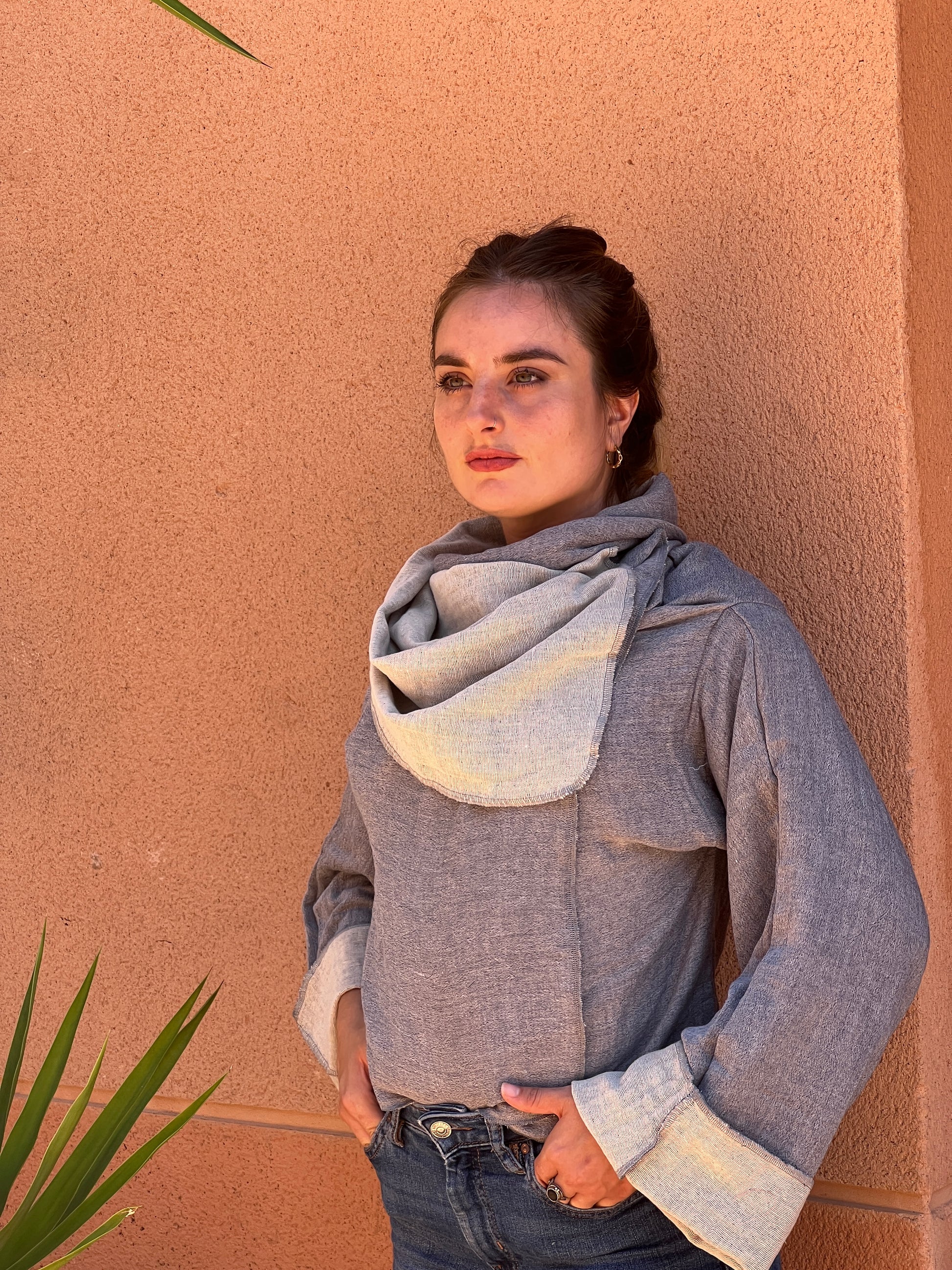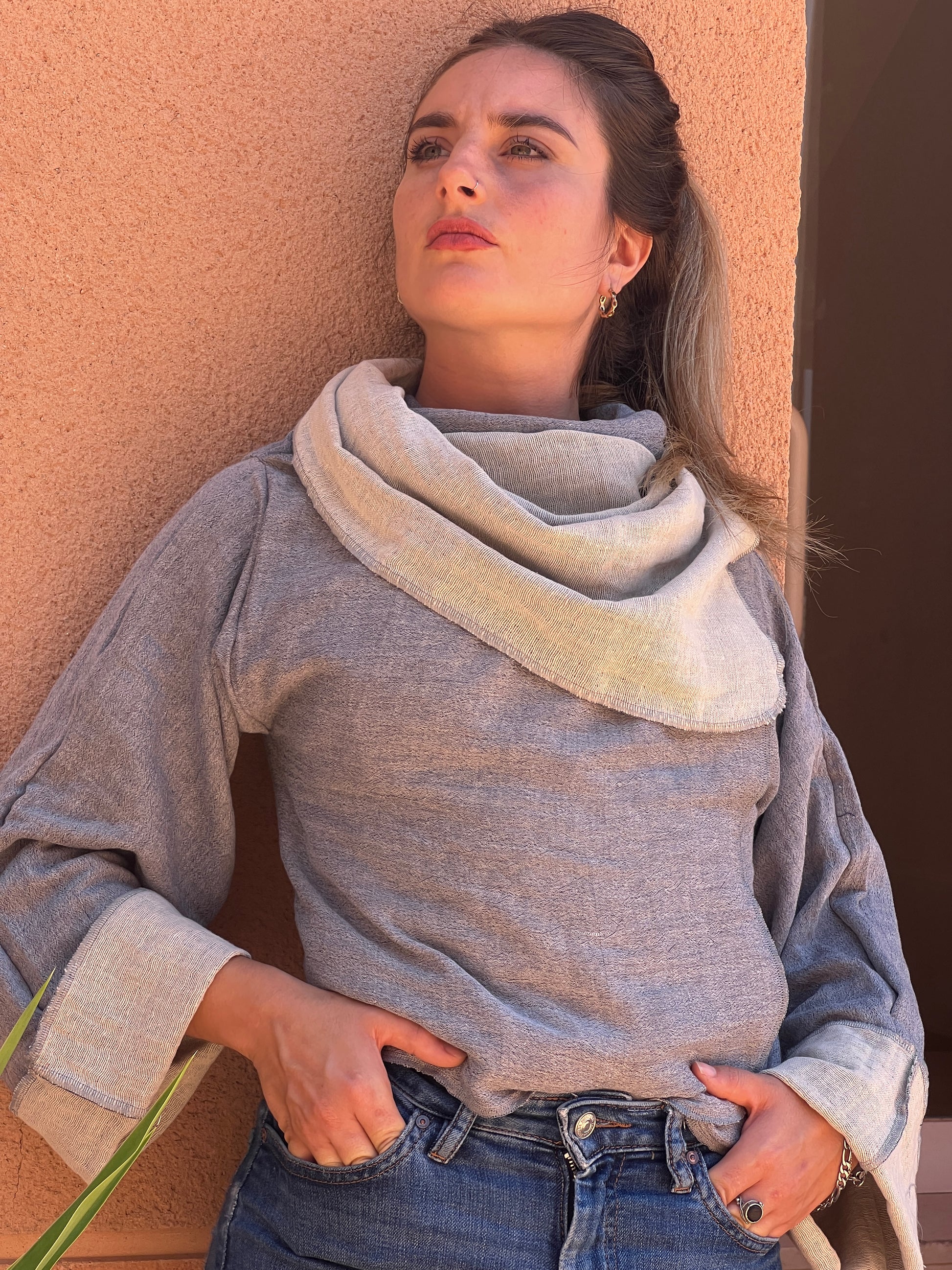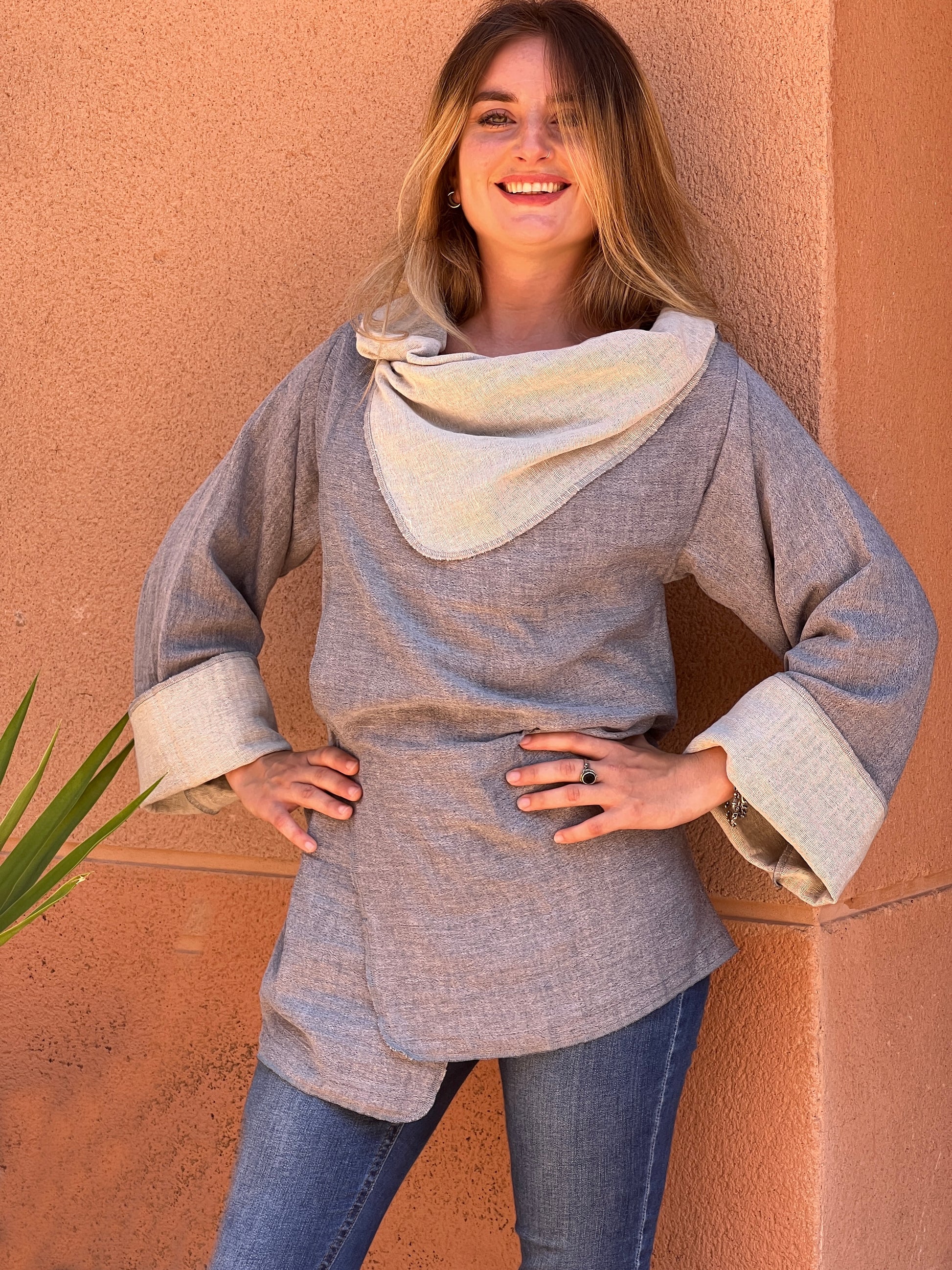 Confeccionado en un algodon suave y aspecto artesanal, combina un exterior en gris jaspeado. El interios es un blanco roto, aportando contraste, luz y sofisticación. Las mangas amplias y la caída ligera refuerzan la sensación de comodidad y libertad, mientras que su corte atemporal lo convierte en una pieza fácil de integrar en cualquier armario.