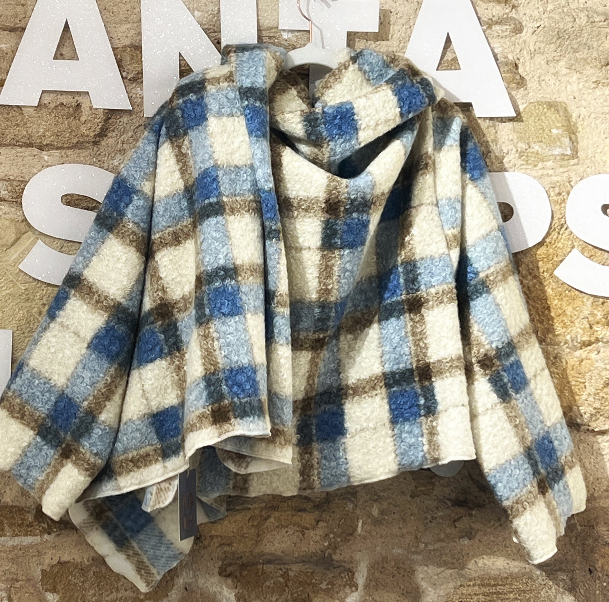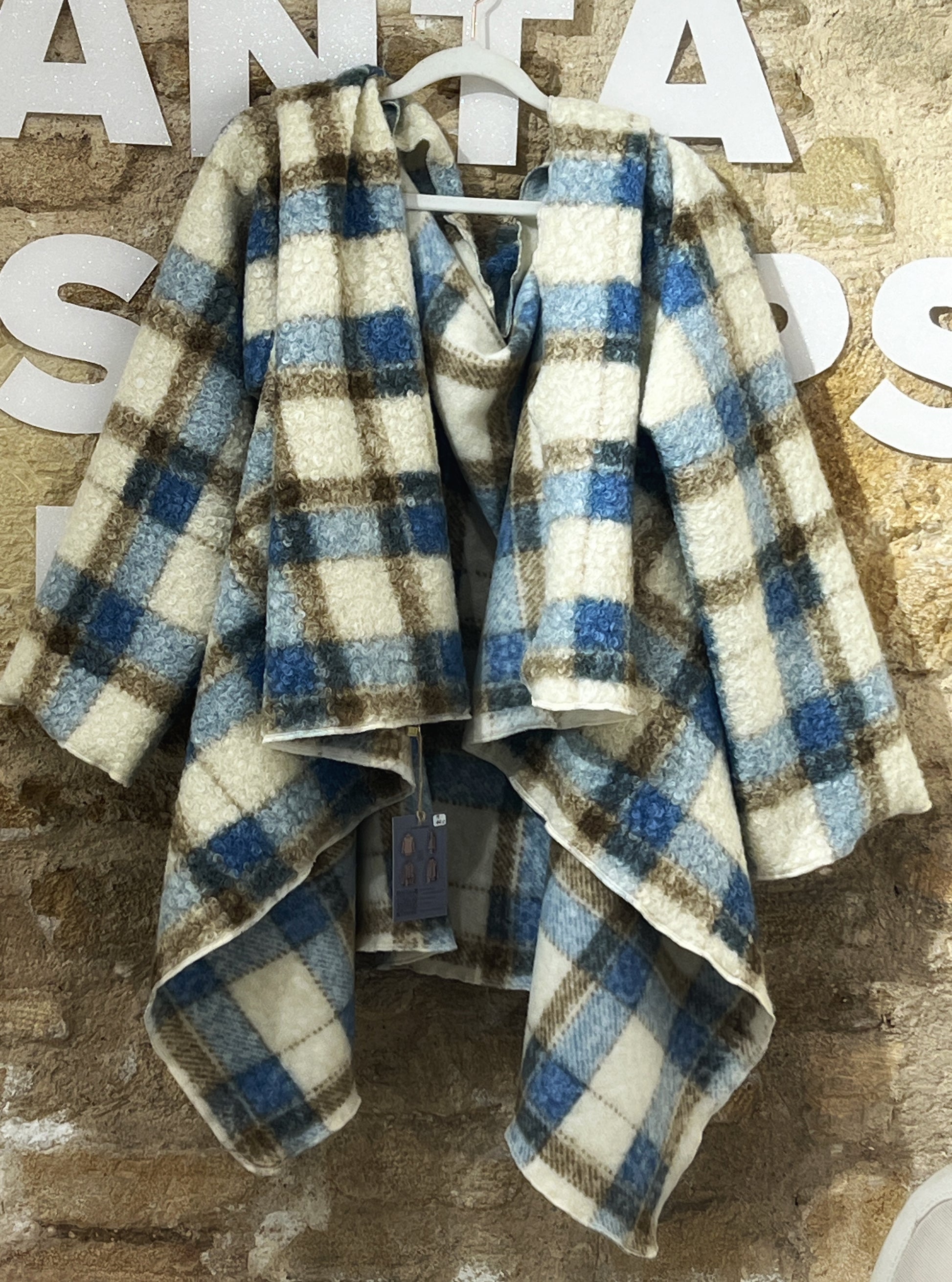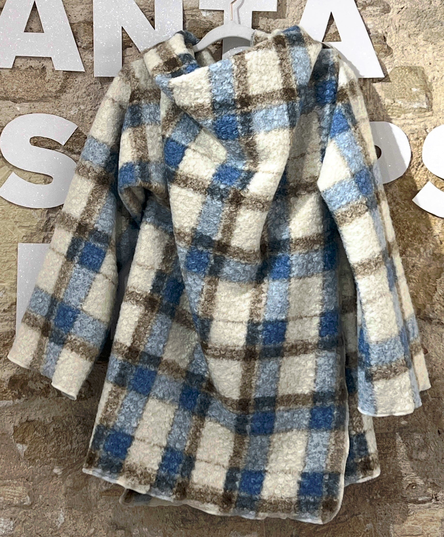 Abrigo de cuadros en tonos crema, azul y marrón, confeccionado en un tejido bouclé suave y muy agradable al tacto. Su textura mullida aporta calidez sin exceso de peso, creando una caída envolvente y relajada con un drapeado natural. Una pieza cómoda y elegante, perfecta para looks de invierno luminosos y actuales.