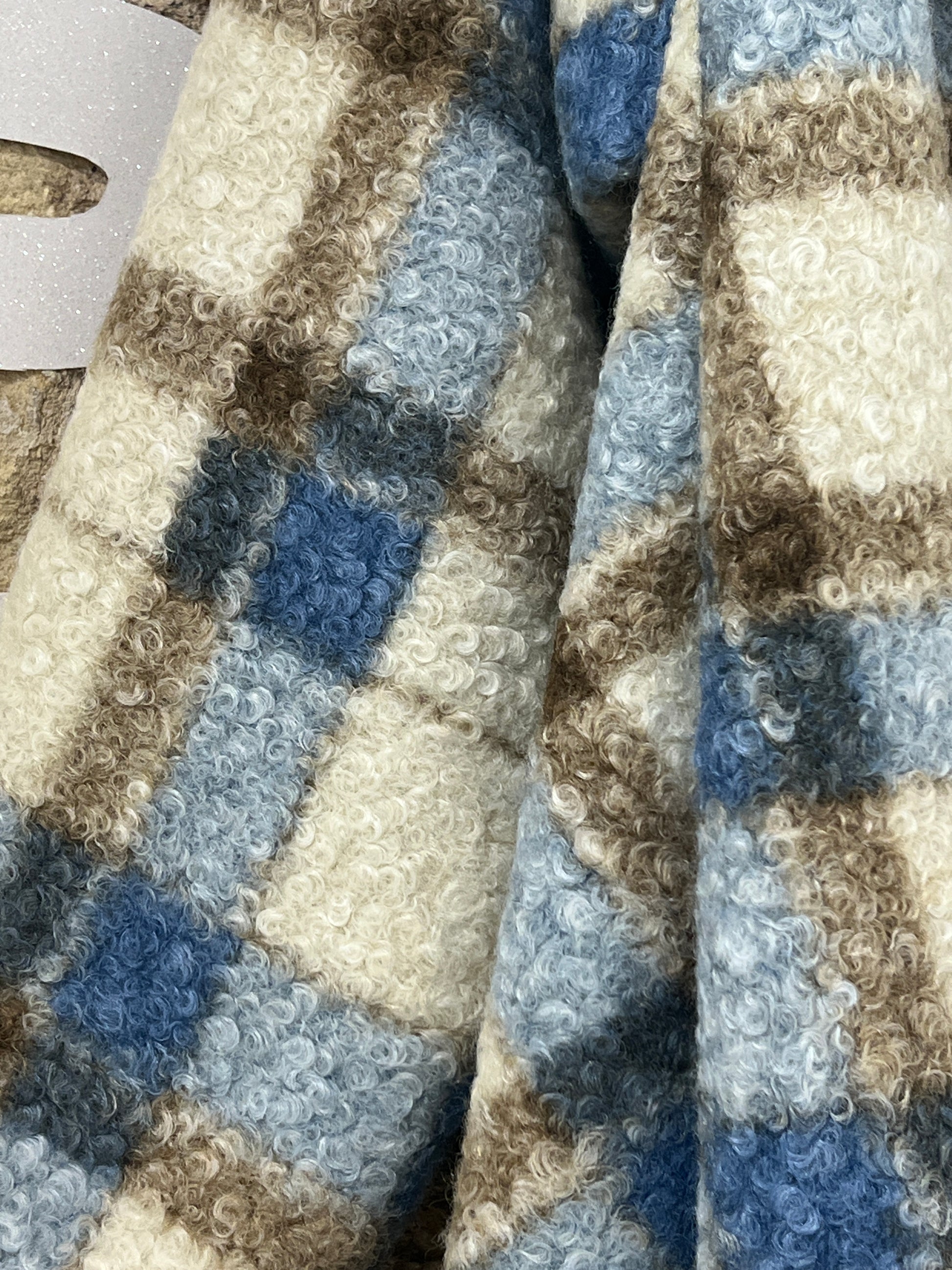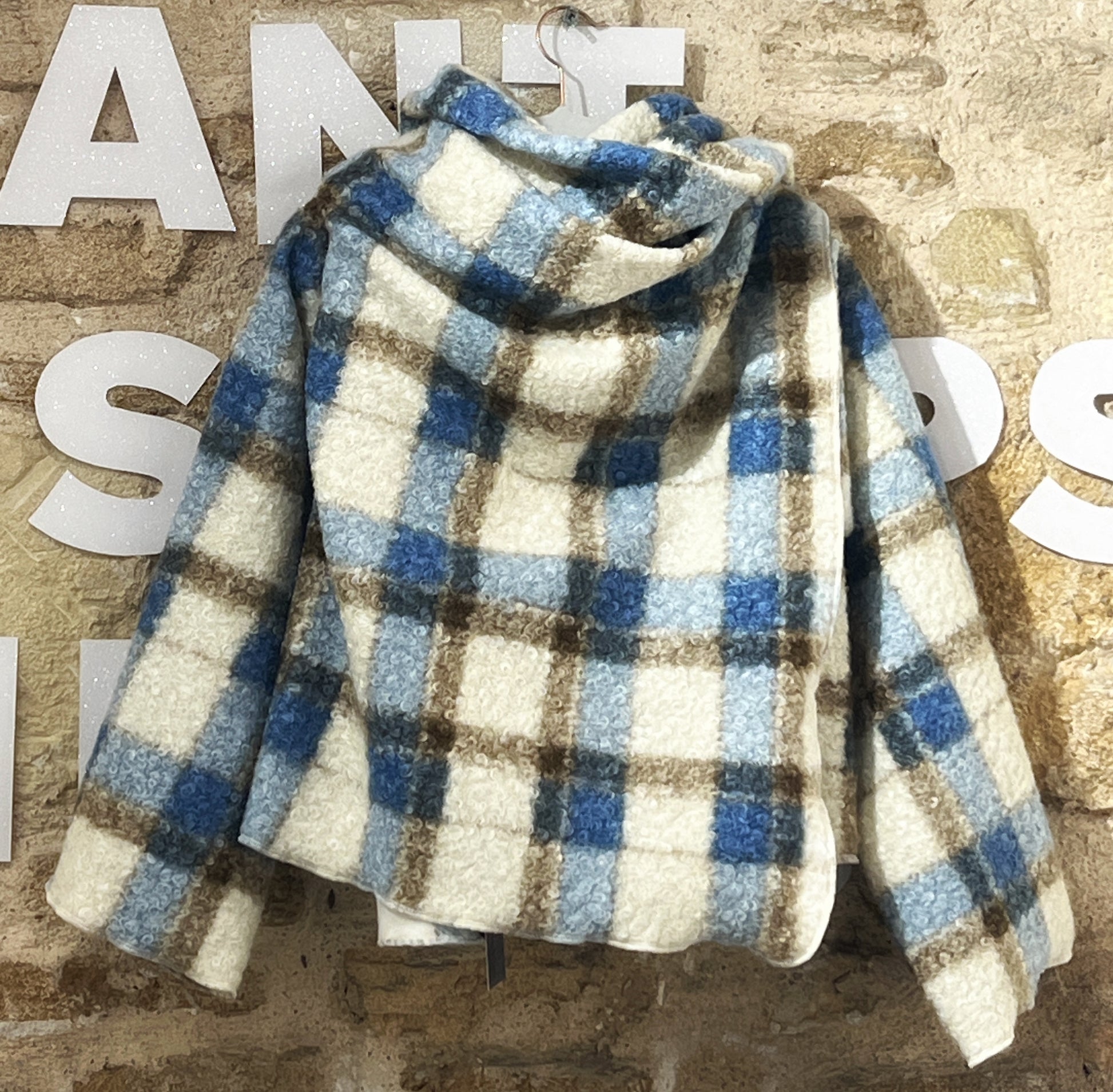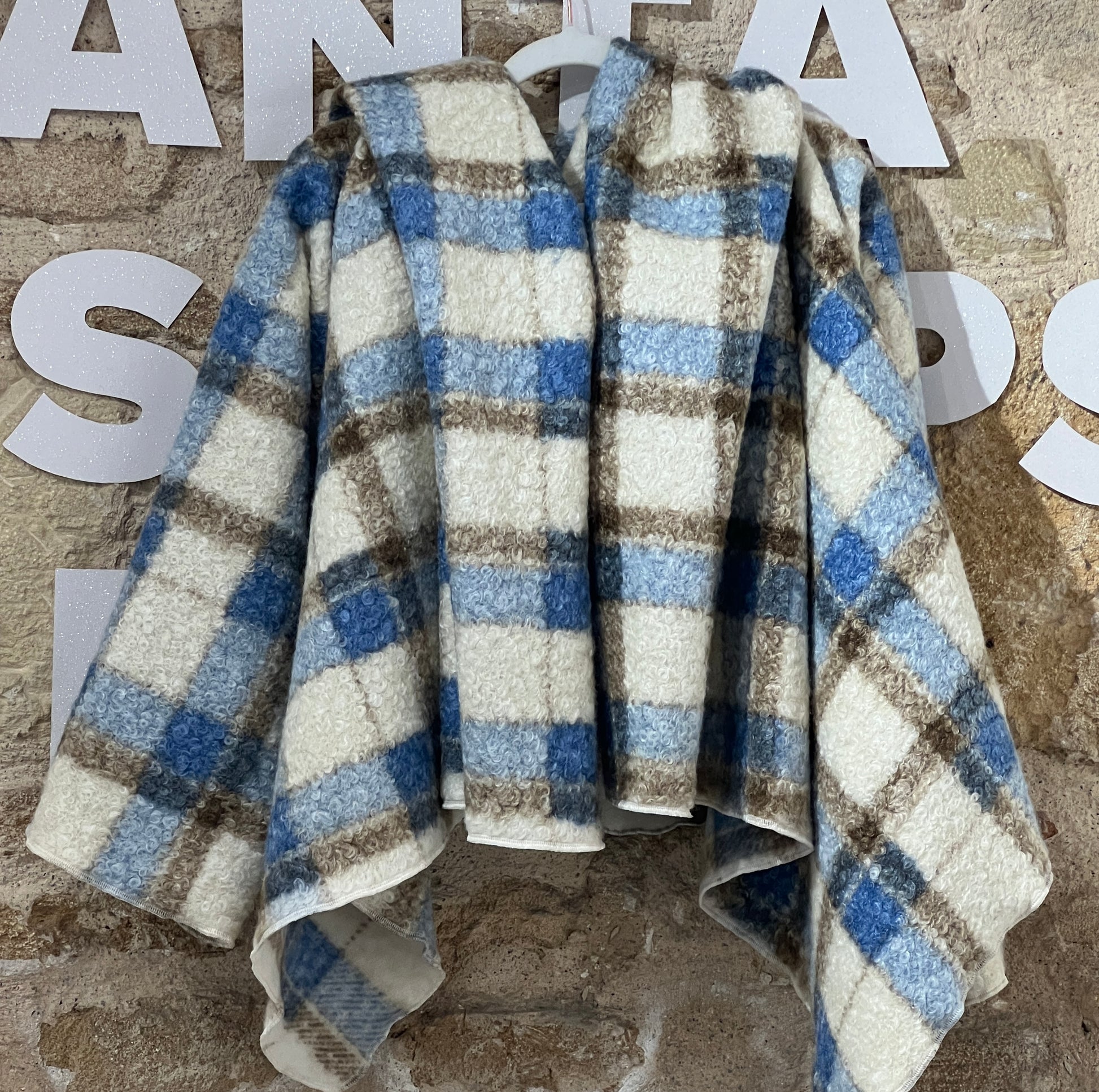 Abrigo de cuadros en tonos crema, azul y marrón, confeccionado en un tejido bouclé suave y muy agradable al tacto. Su textura mullida aporta calidez sin exceso de peso, creando una caída envolvente y relajada con un drapeado natural. Una pieza cómoda y elegante, perfecta para looks de invierno luminosos y actuales.