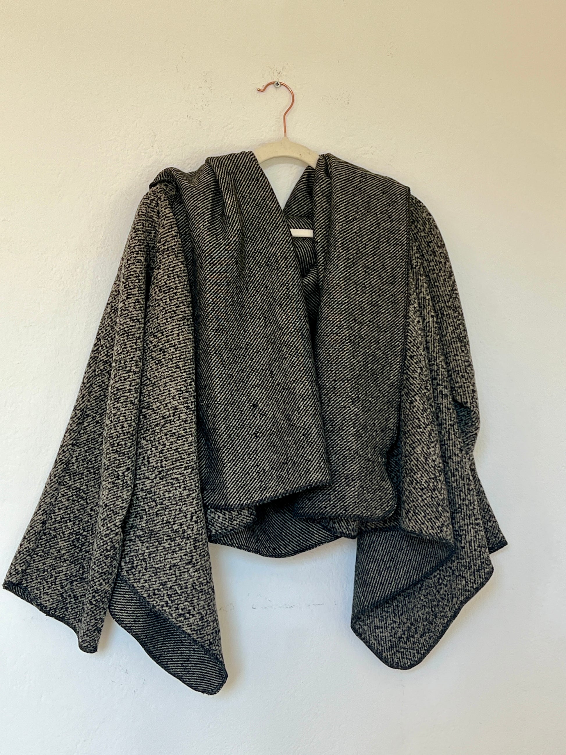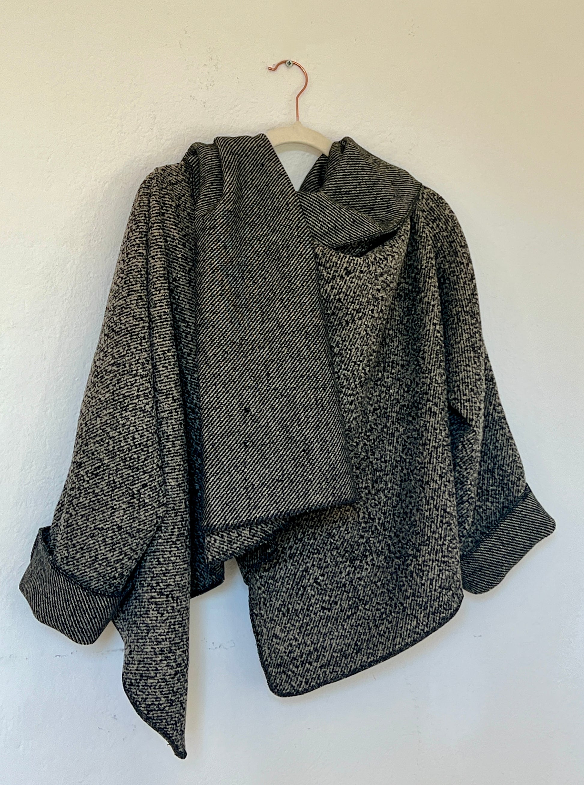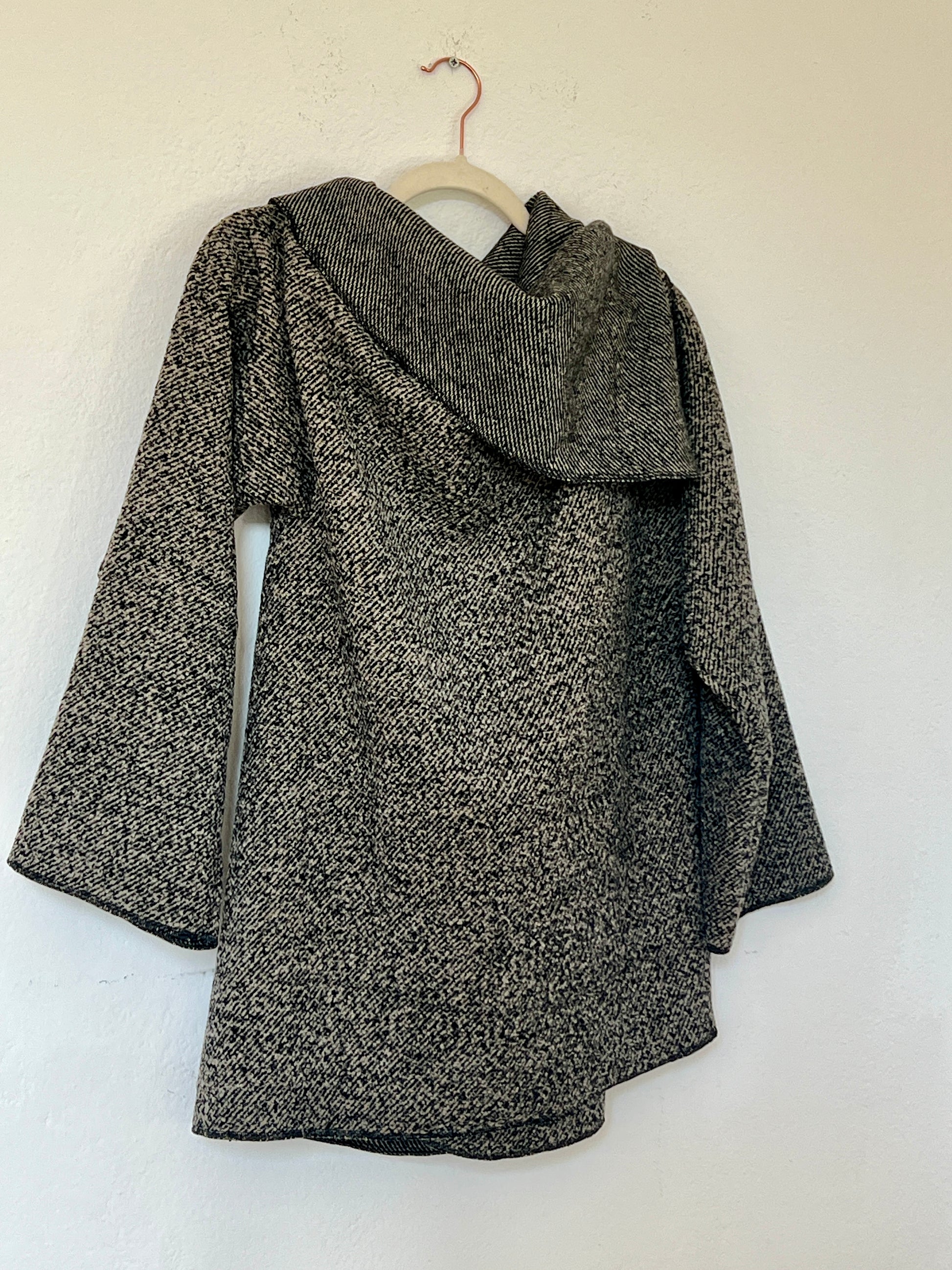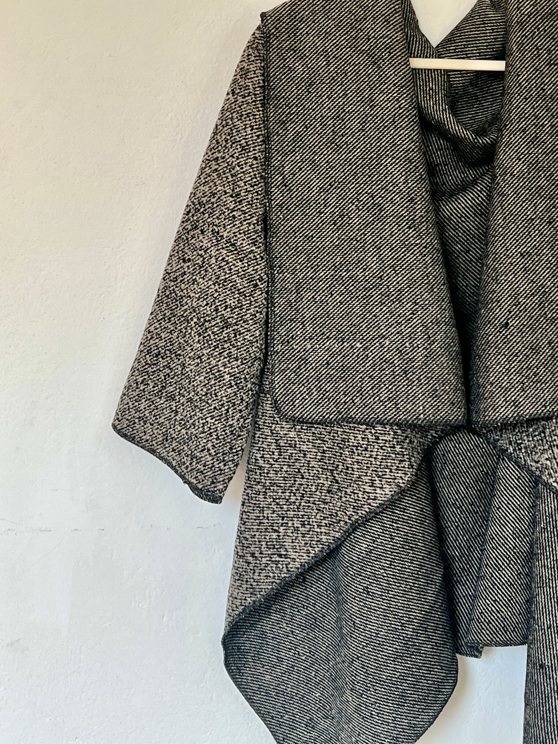 Este abrigo de doble textura se caracteriza por sus dos tejidos en tonos grises y negros, creando un juego sutil de contrastes que le da profundidad. En el exterior domina un estampado de espiga fina, sobrio y elegante, mientras que en el interior aparece un tejido de dibujo distinto y más texturizado, visible en la caída y los pliegues del diseño.