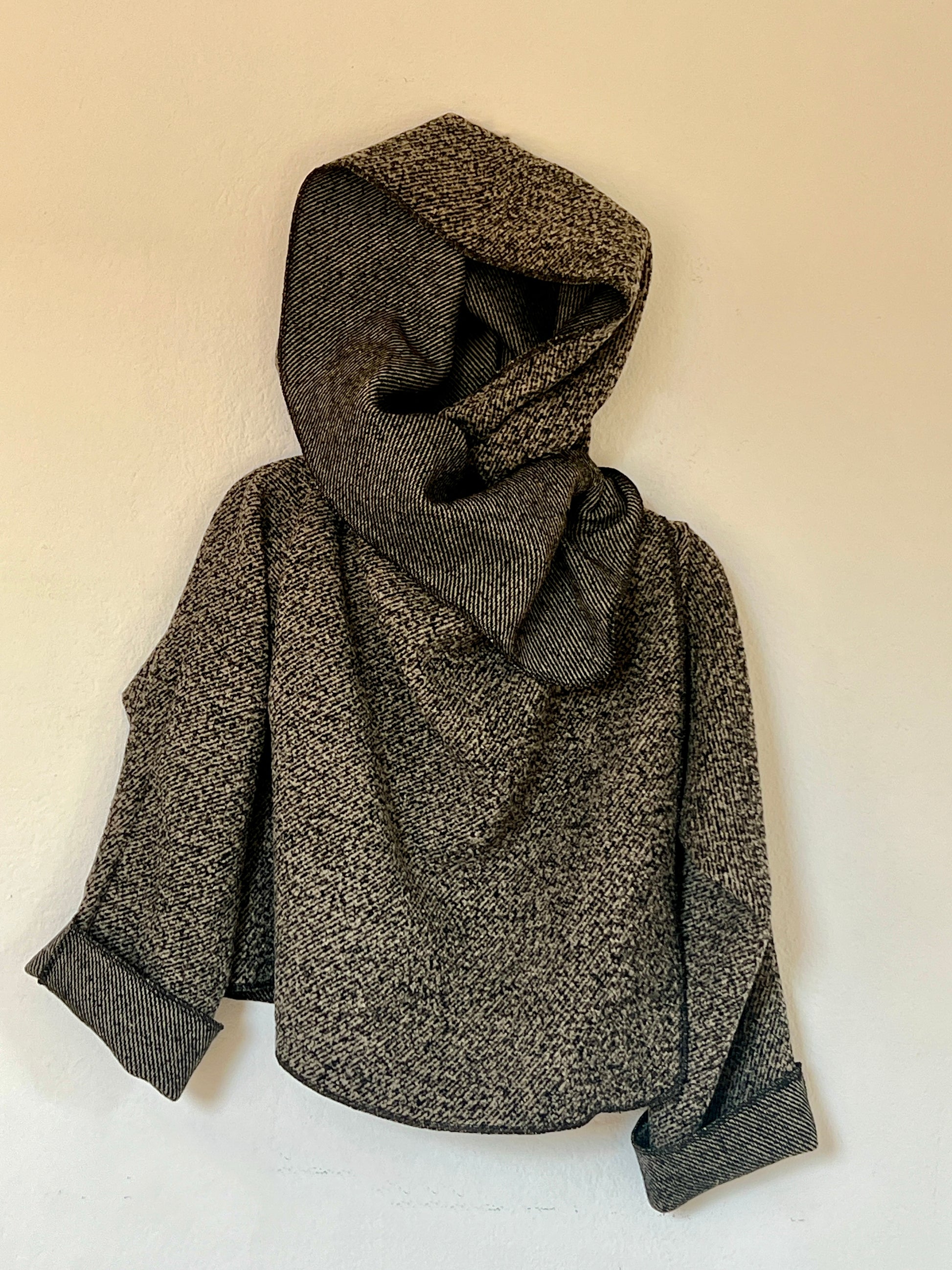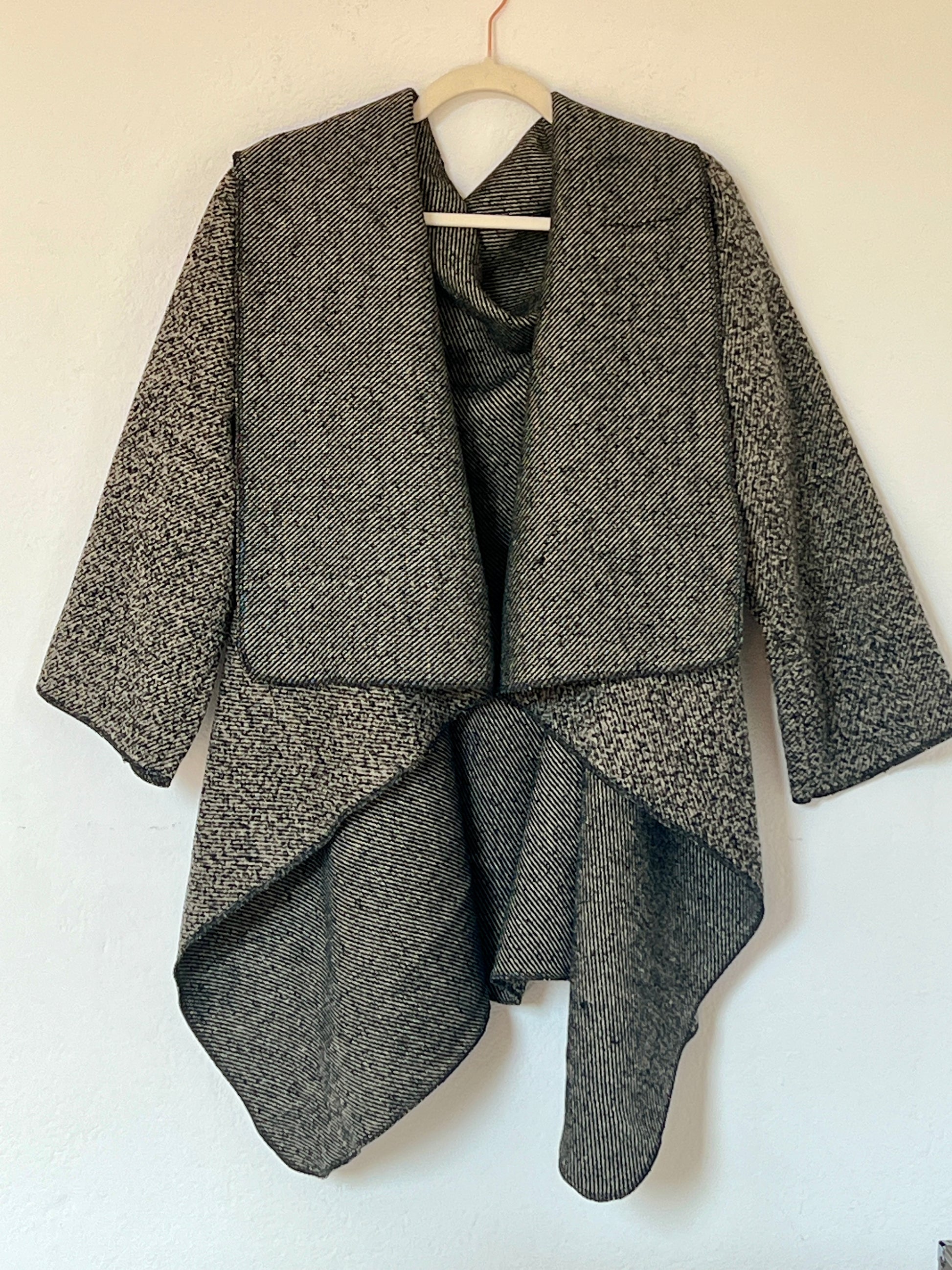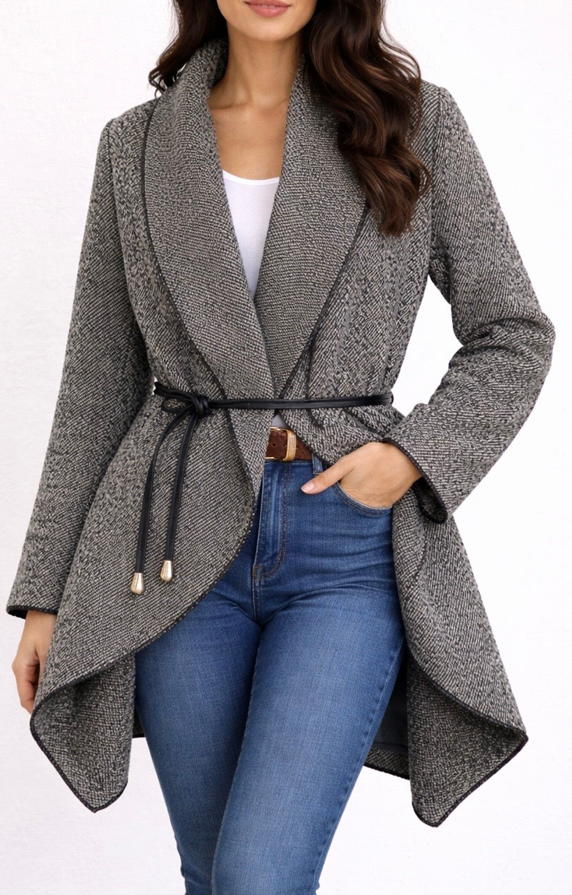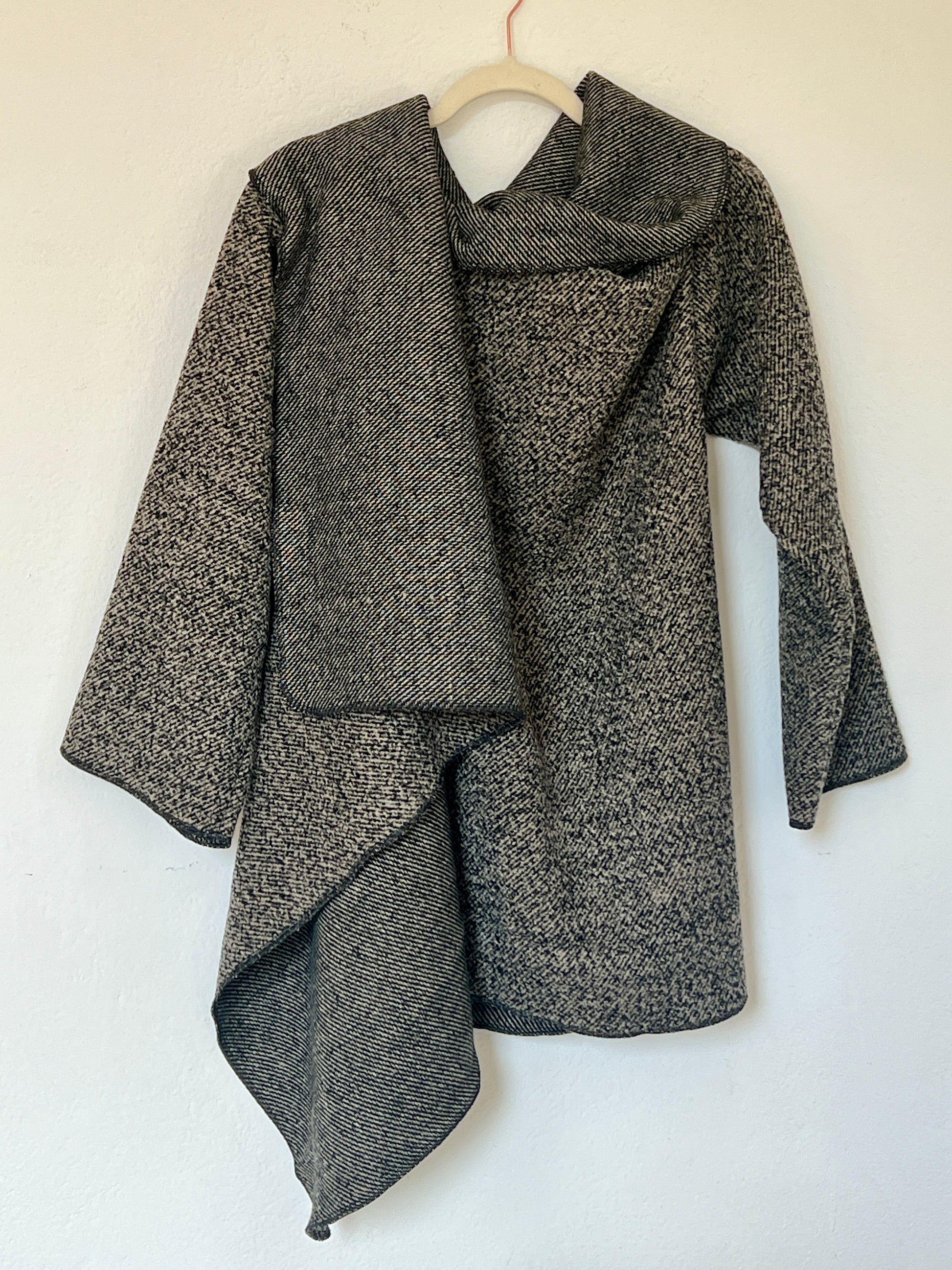 Este abrigo de doble textura se caracteriza por sus dos tejidos en tonos grises y negros, creando un juego sutil de contrastes que le da profundidad. En el exterior domina un estampado de espiga fina, sobrio y elegante, mientras que en el interior aparece un tejido de dibujo distinto y más texturizado, visible en la caída y los pliegues del diseño.