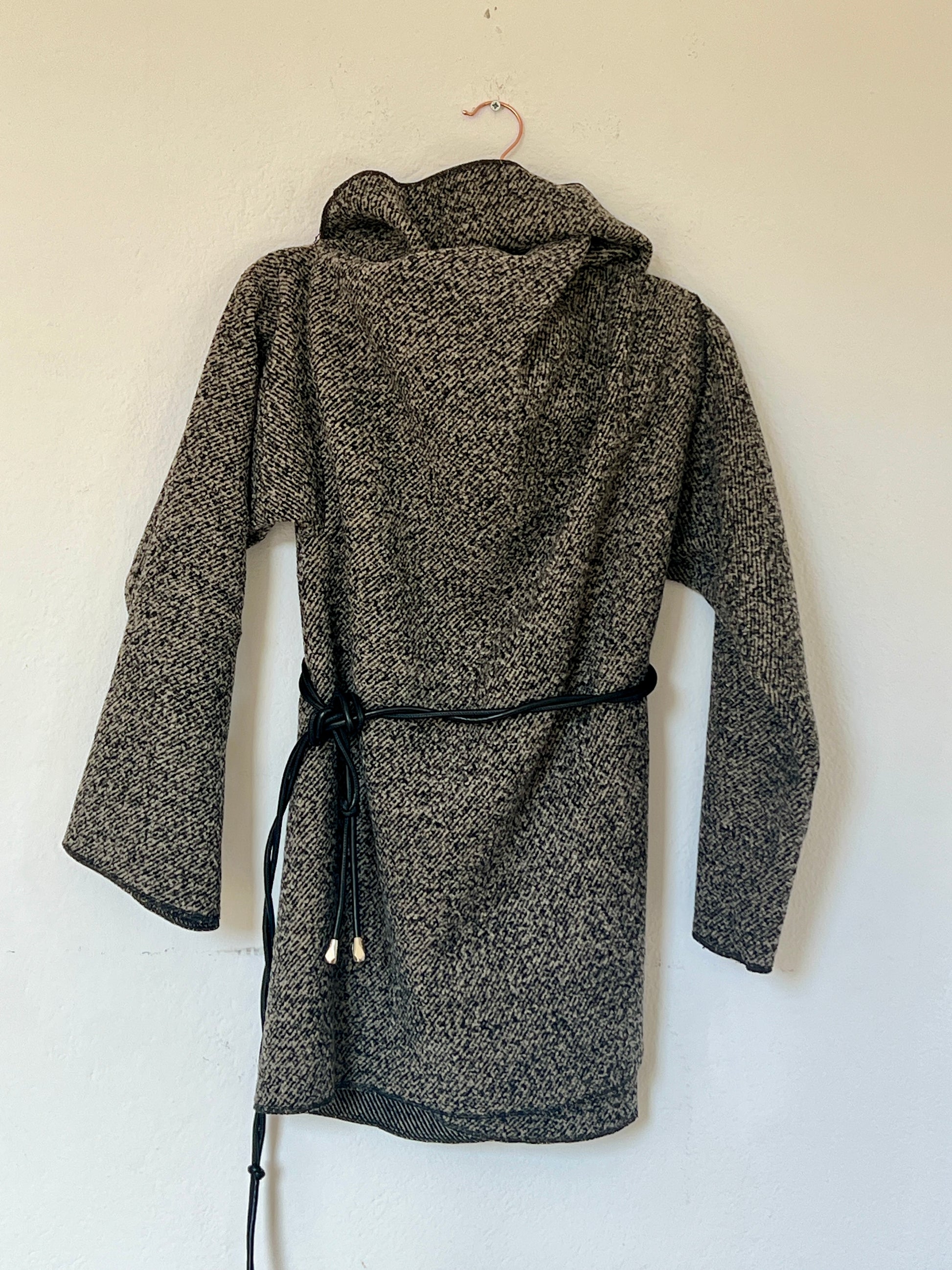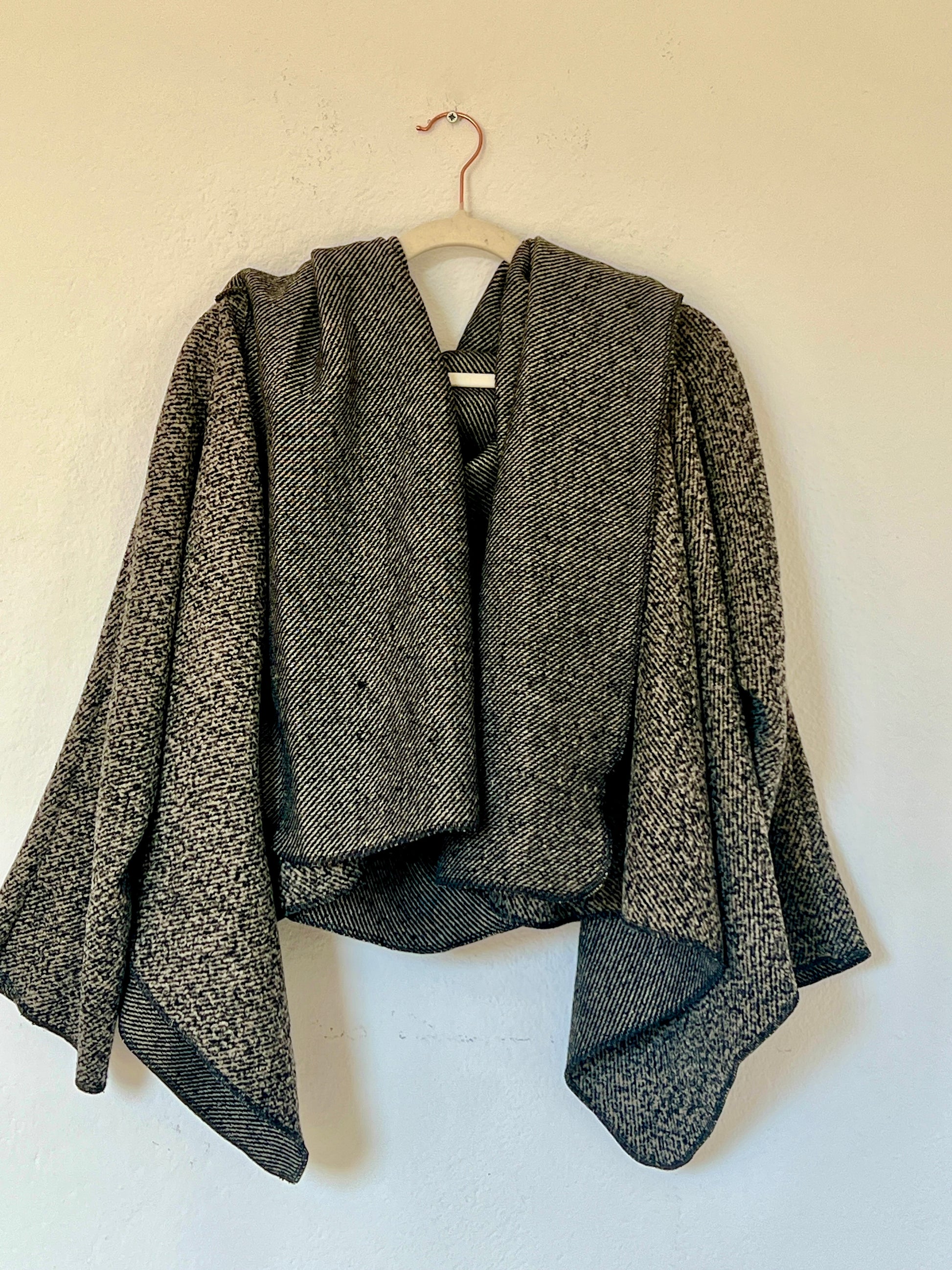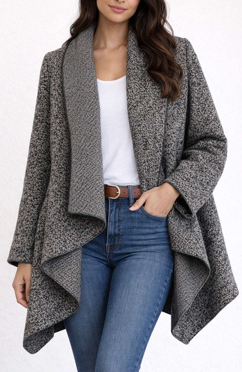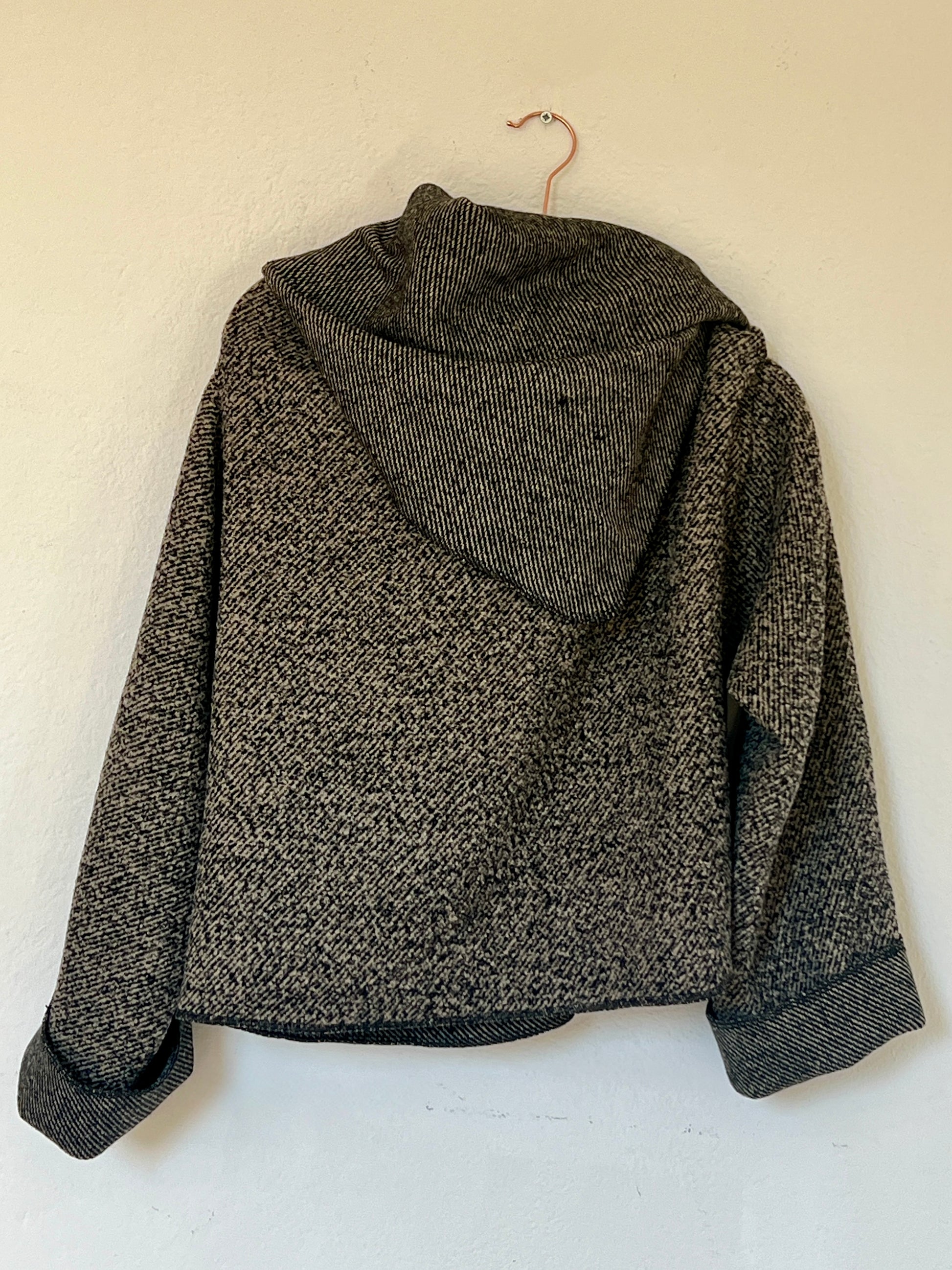Este abrigo de doble textura se caracteriza por sus dos tejidos en tonos grises y negros, creando un juego sutil de contrastes que le da profundidad. En el exterior domina un estampado de espiga fina, sobrio y elegante, mientras que en el interior aparece un tejido de dibujo distinto y más texturizado, visible en la caída y los pliegues del diseño.