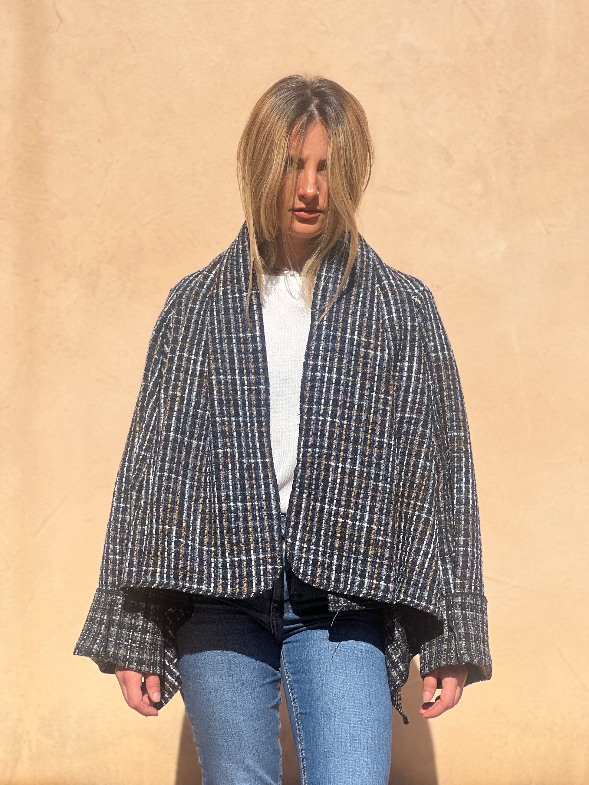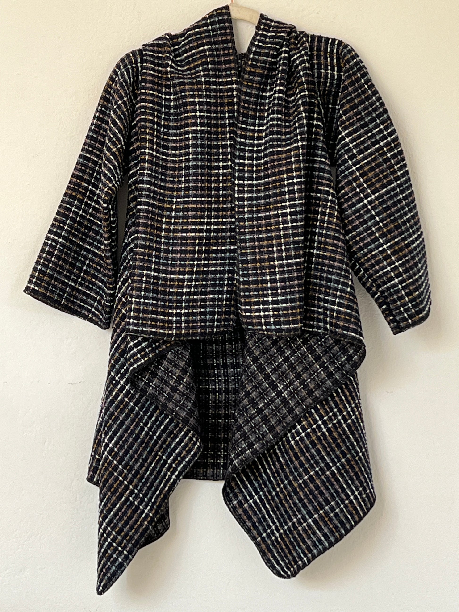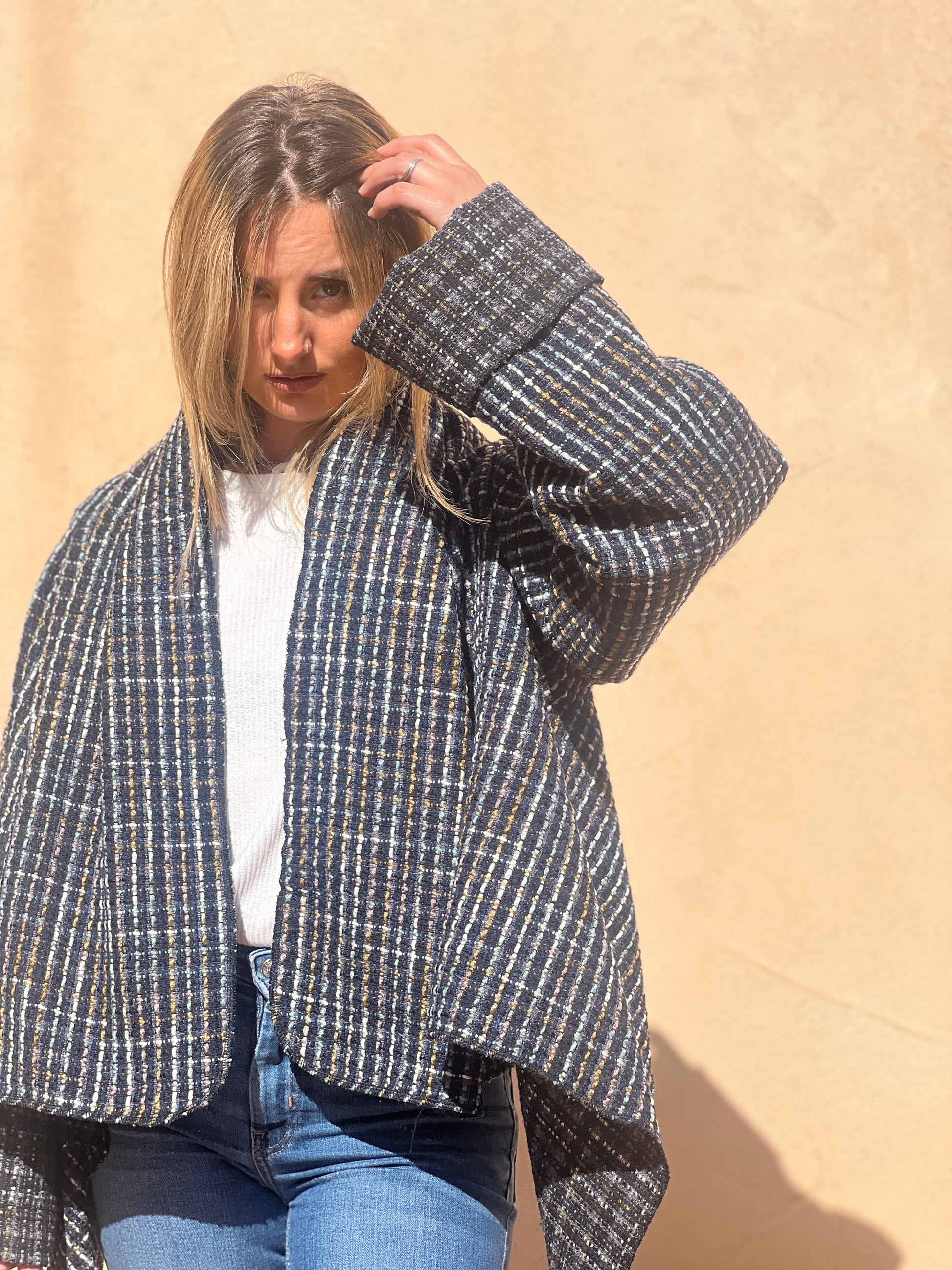 Abrigo con estampado de cuadros en tonos neutros, confeccionado en un tejido suave tipo lana mezcla. Su textura cálida y su caída estructurada pero flexible crean un drapeado elegante, perfecto para elevar cualquier look con un toque sofisticado.
