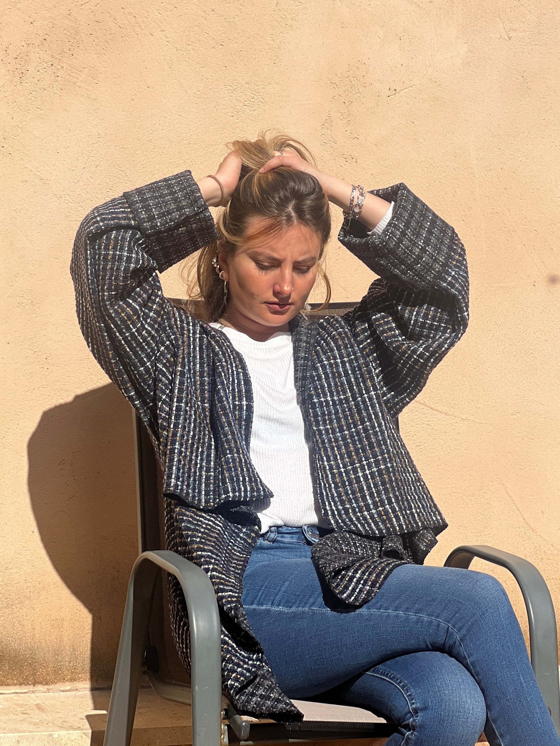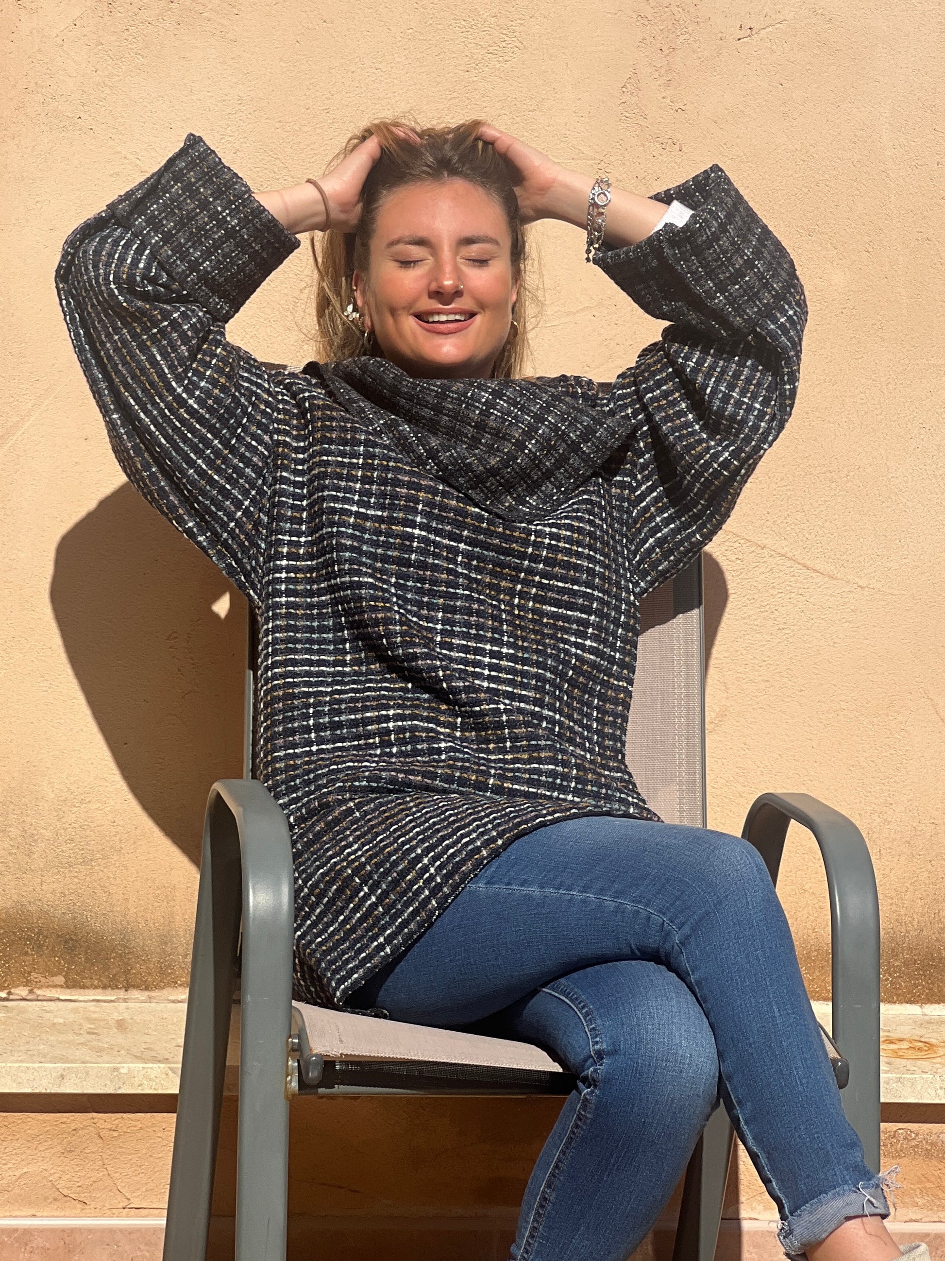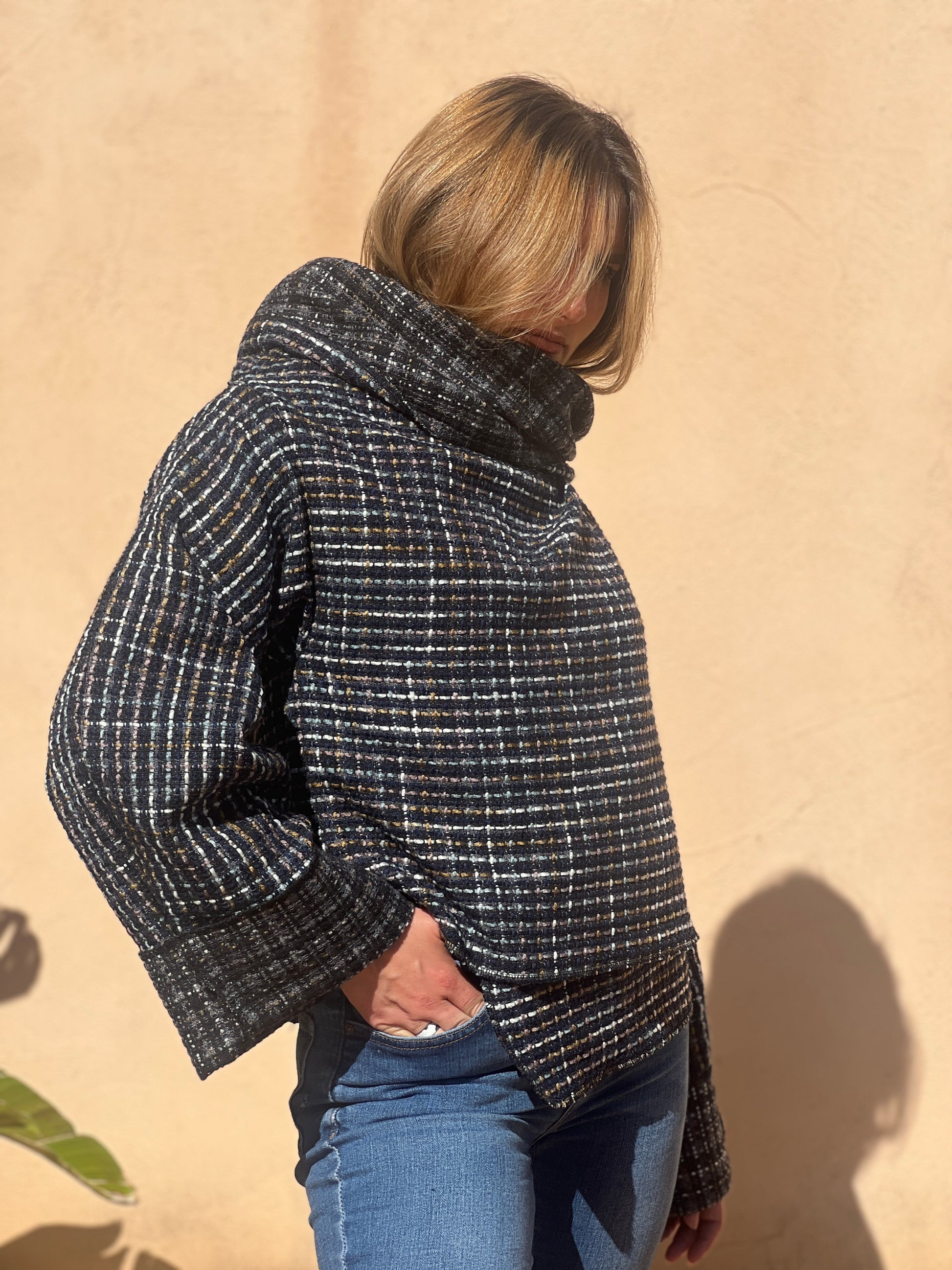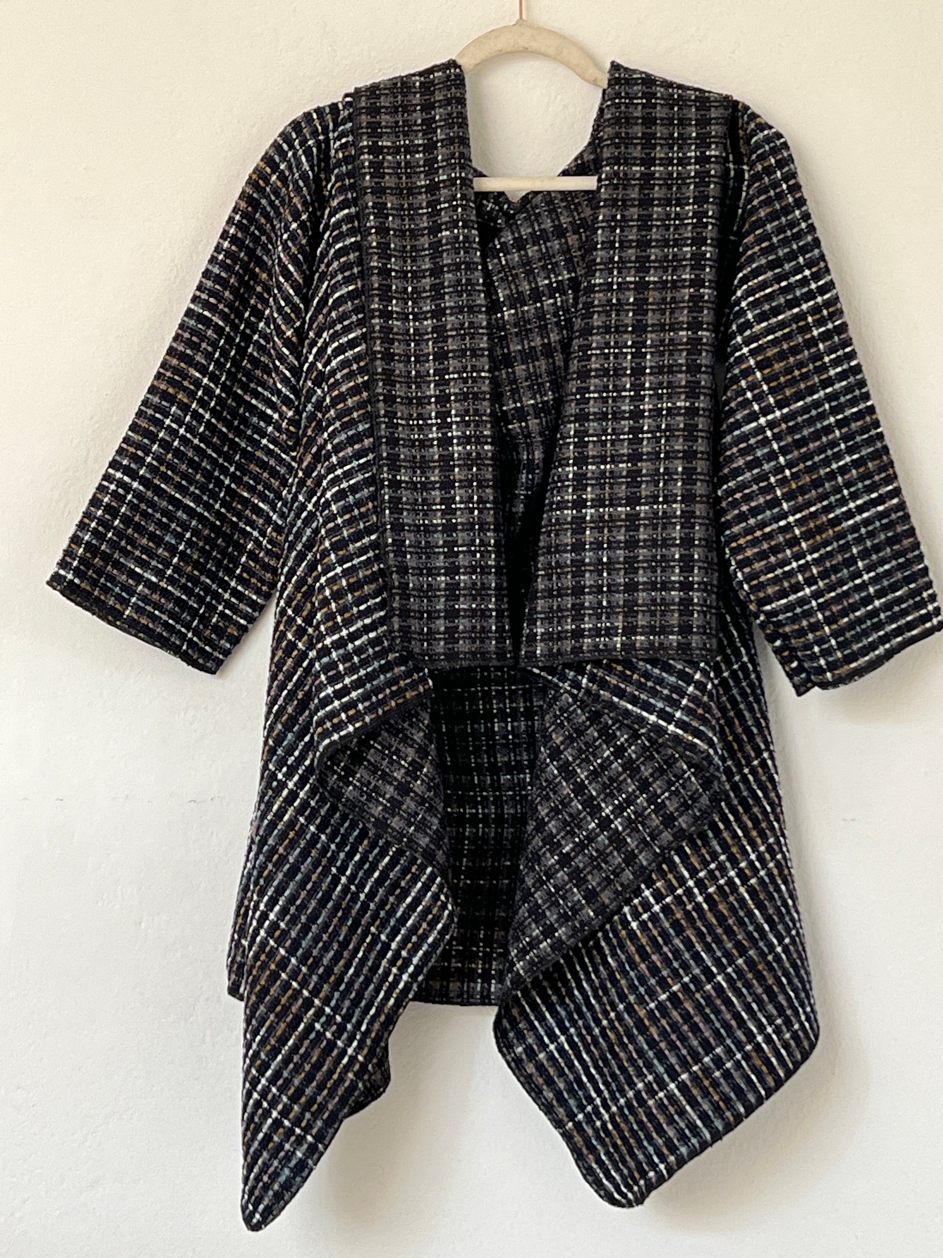 Abrigo con estampado de cuadros en tonos neutros, confeccionado en un tejido suave tipo lana mezcla. Su textura cálida y su caída estructurada pero flexible crean un drapeado elegante, perfecto para elevar cualquier look con un toque sofisticado.