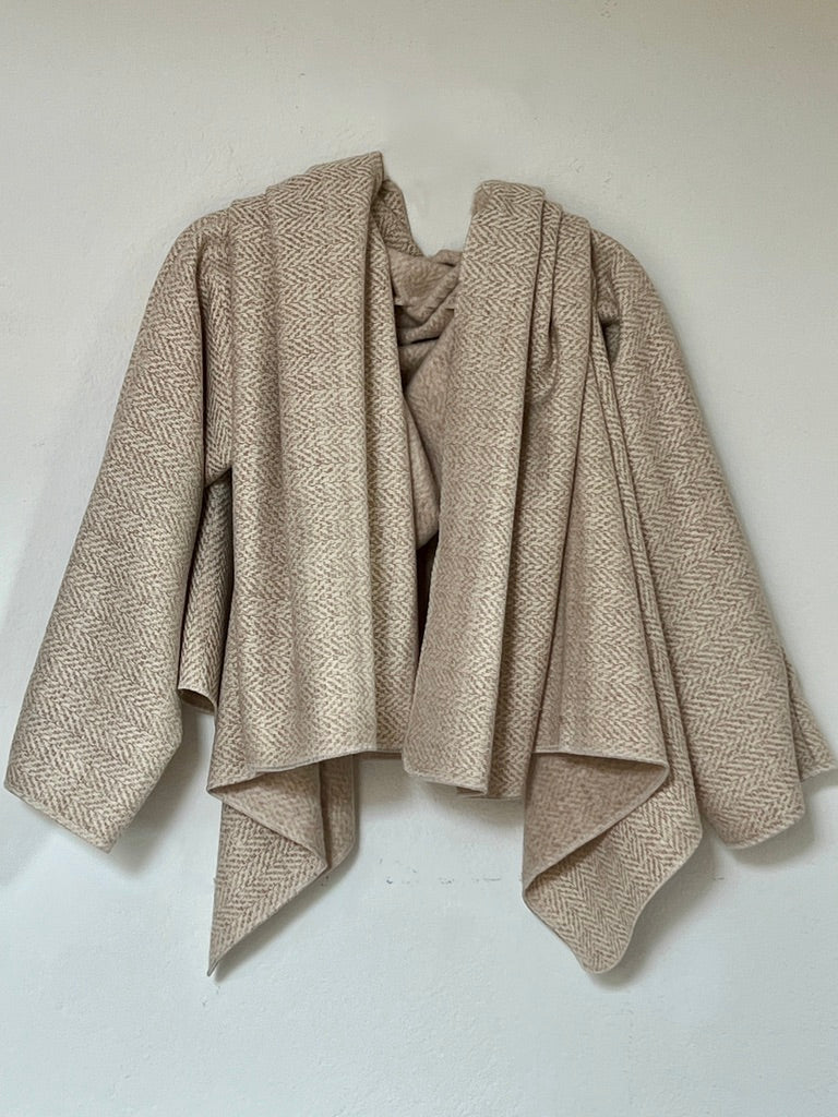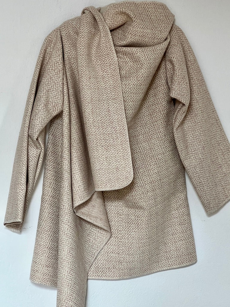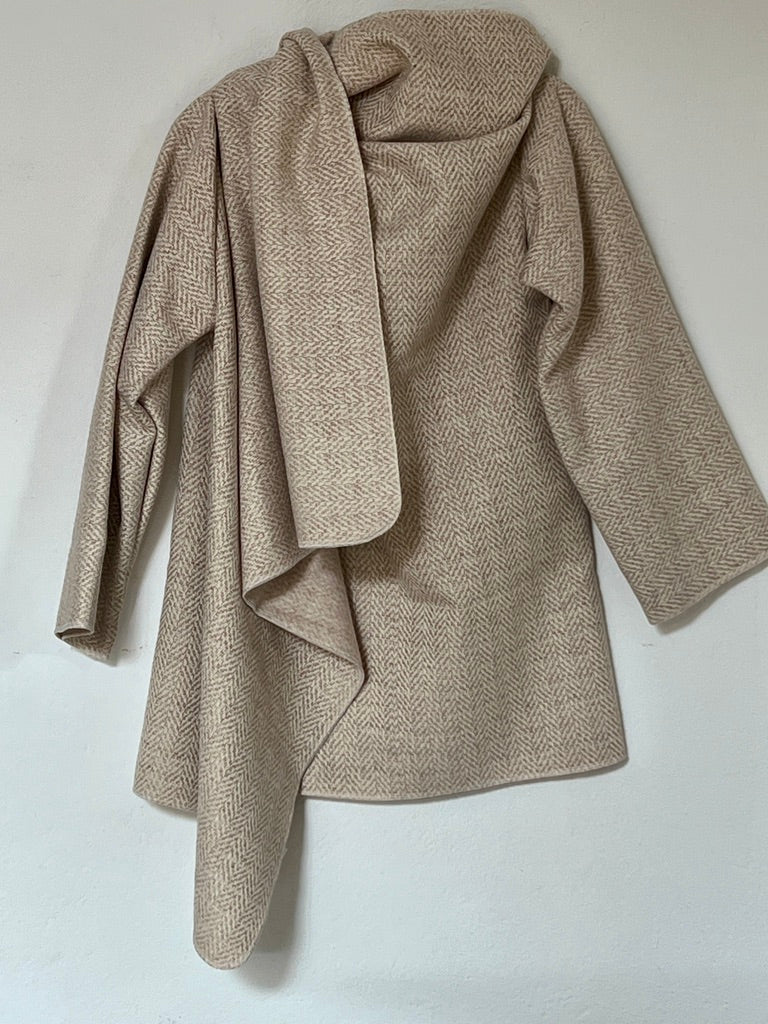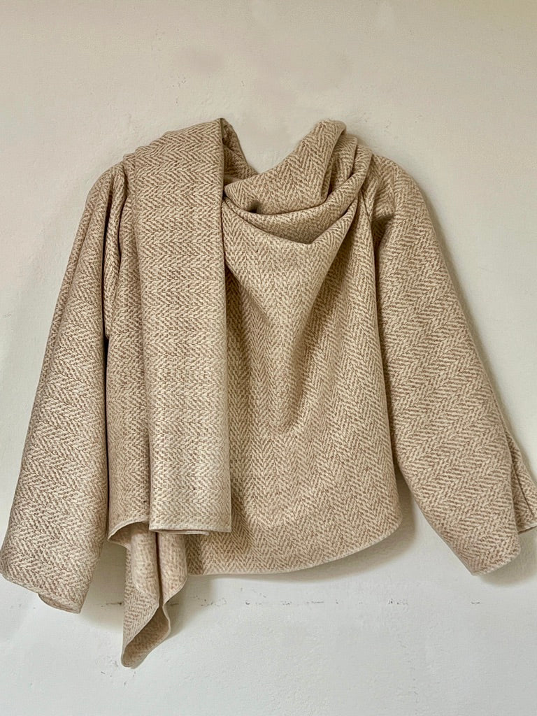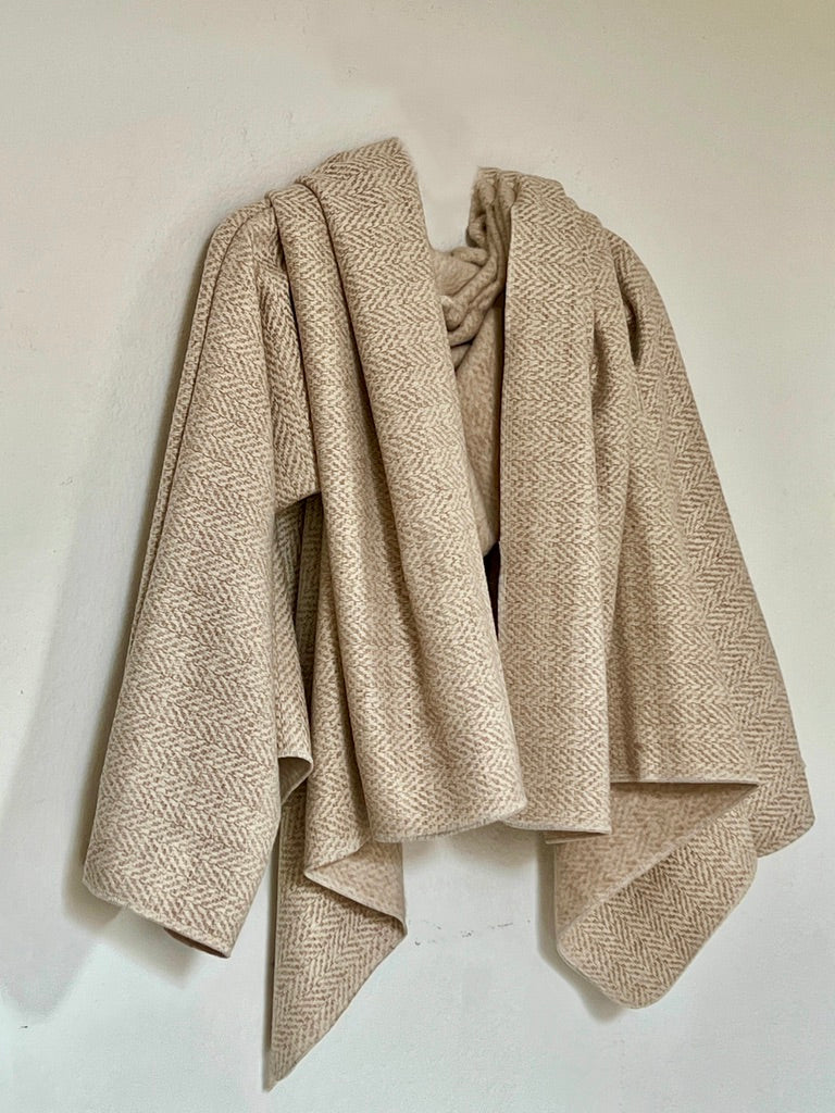 zabrigo en tonos suaves con dibujo espiga fino, cálido y súper elegante. uave al tacto y de estructura ligera. Su mezcla tipo lana aporta una caída fluida y envolvente, creando un drapeado elegante y atemporal que eleva cualquier look con naturalidad.
