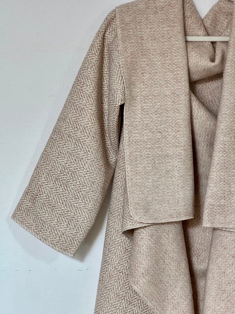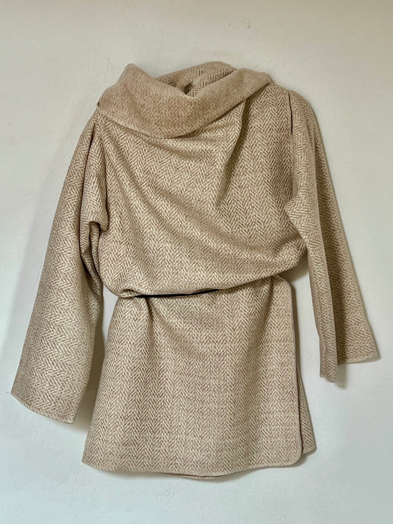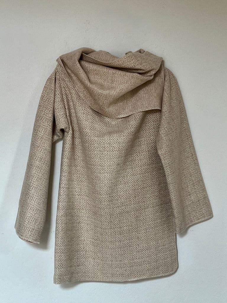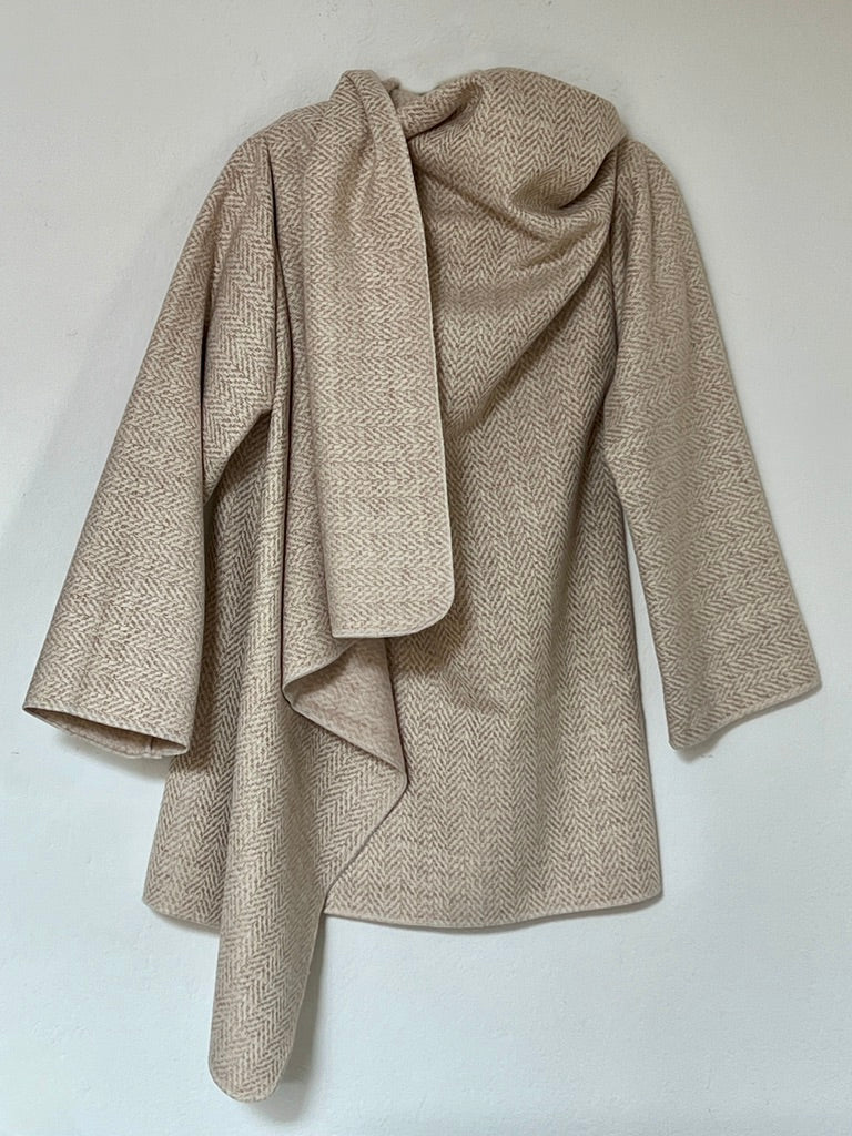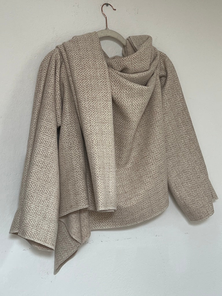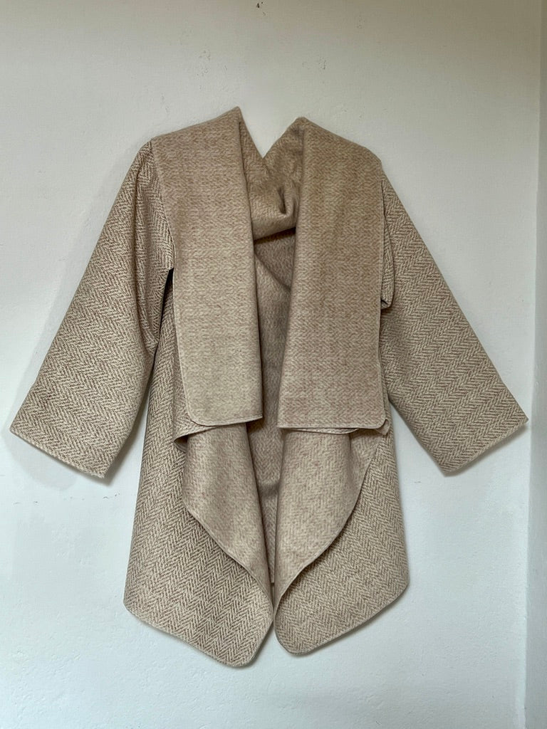 zabrigo en tonos suaves con dibujo espiga fino, cálido y súper elegante. uave al tacto y de estructura ligera. Su mezcla tipo lana aporta una caída fluida y envolvente, creando un drapeado elegante y atemporal que eleva cualquier look con naturalidad.