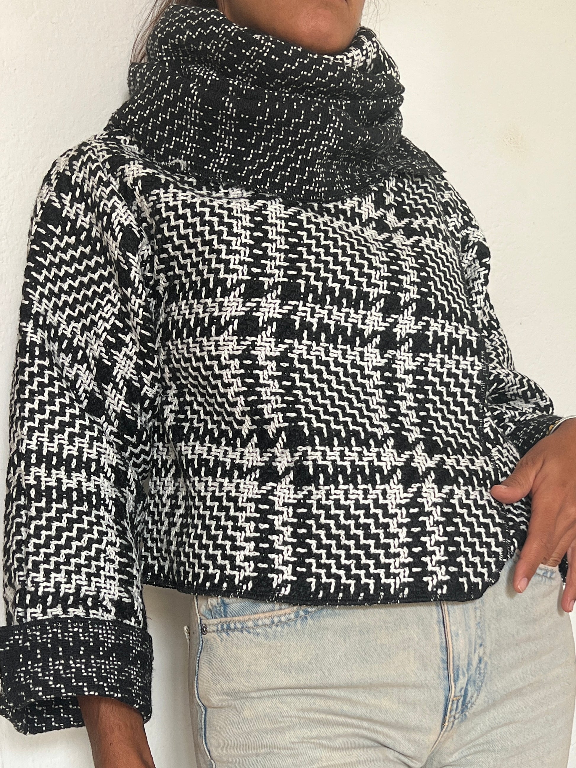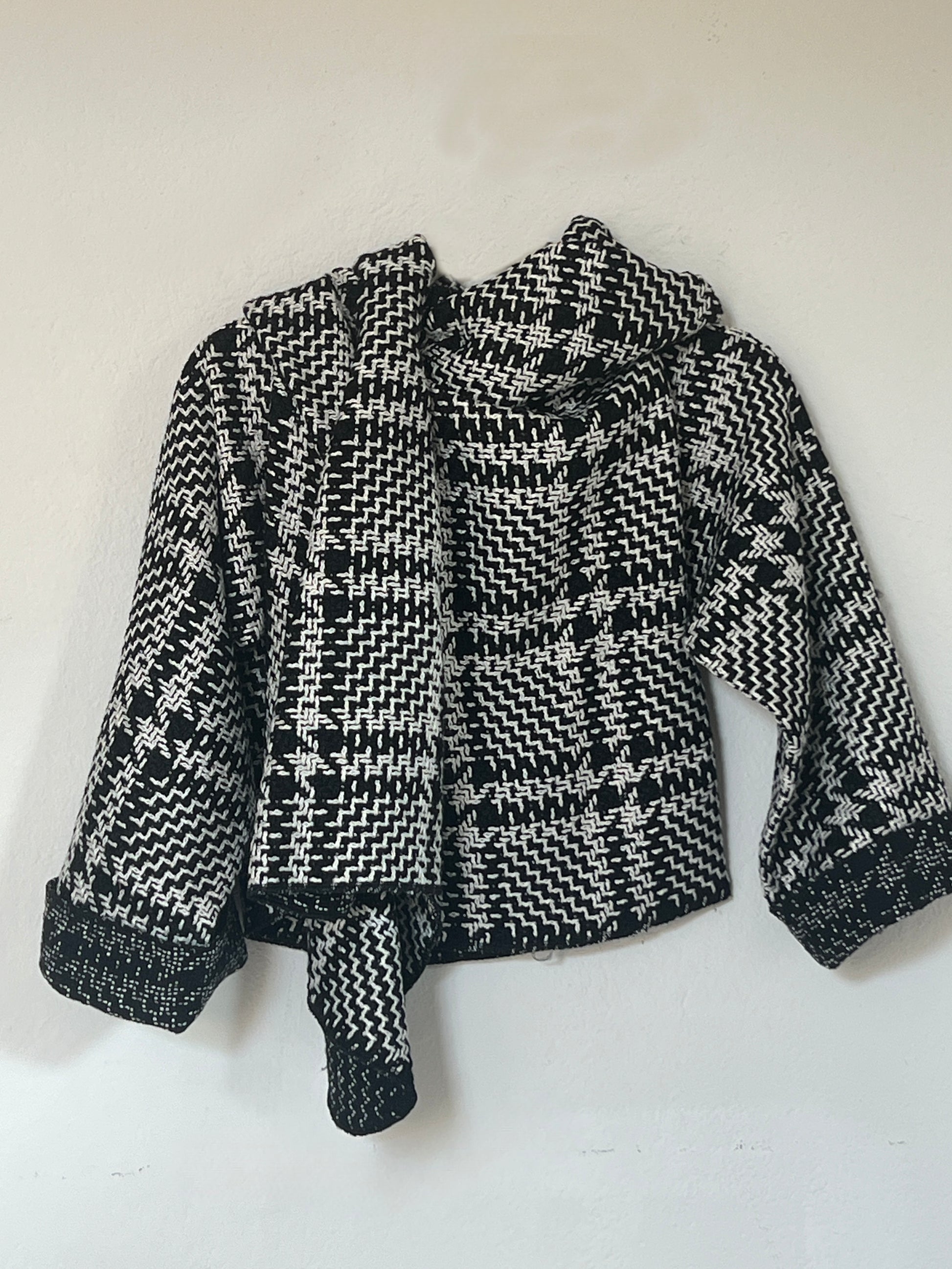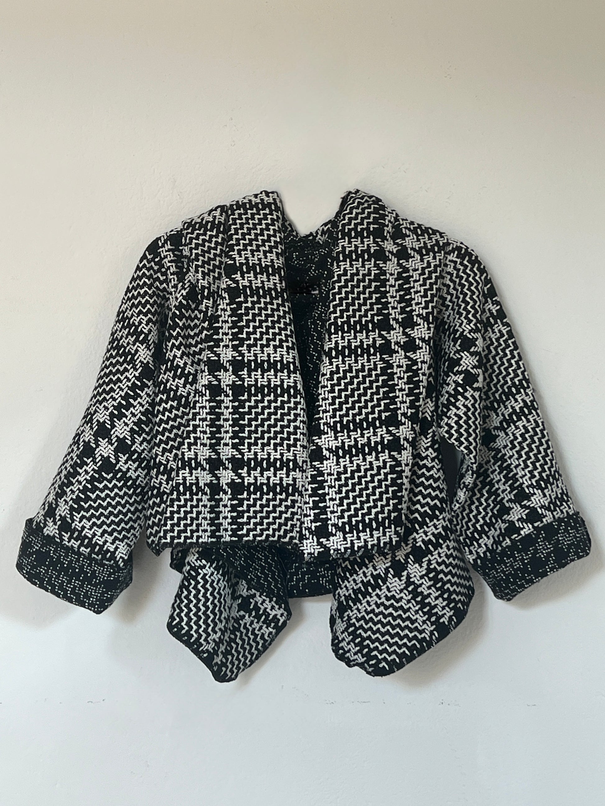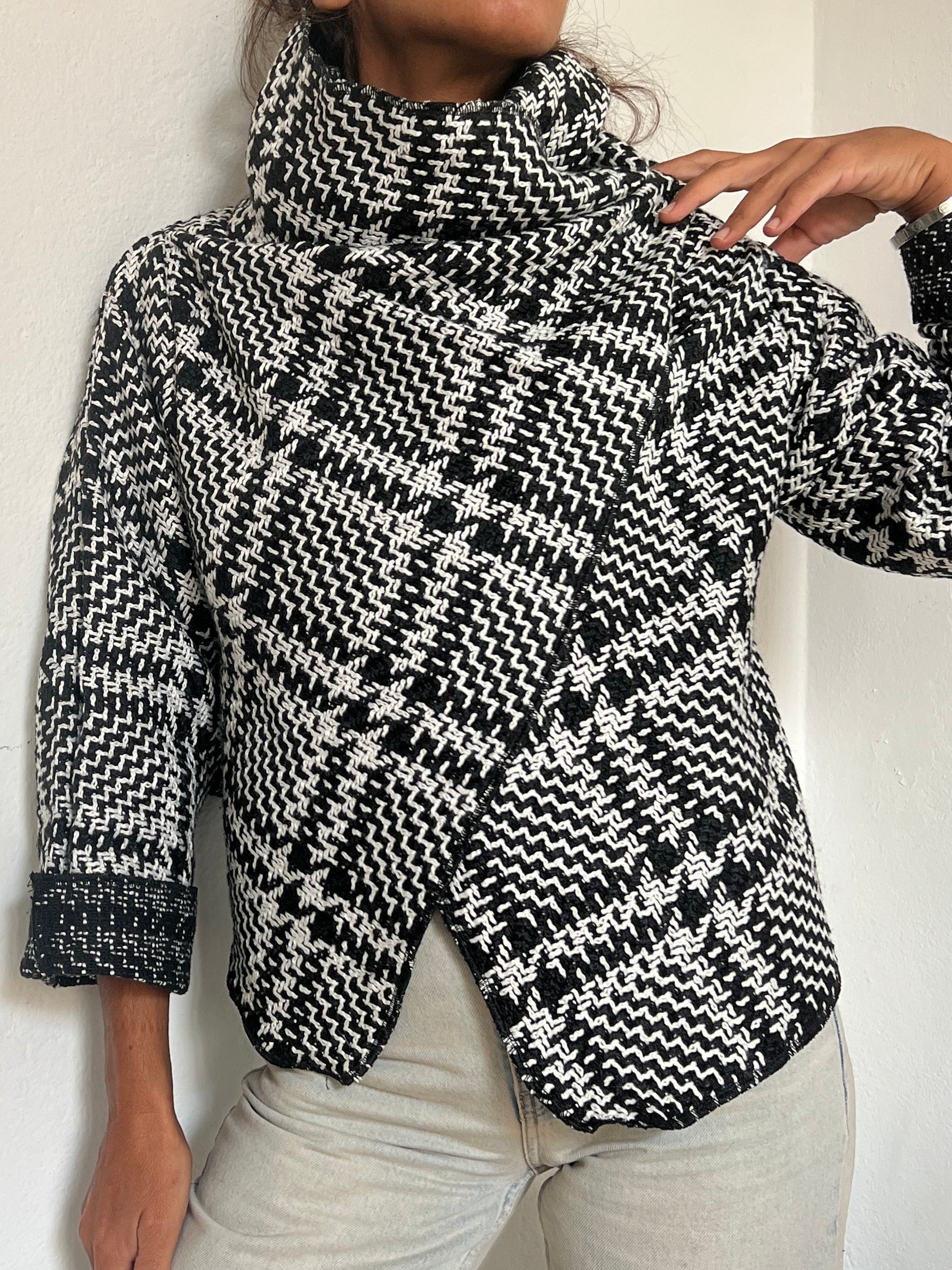 Chaqueta en tejido blanco y negro con dibujo tipo houndstooth, suave y con cuerpo ligero. El interior en un tono más oscuro aporta un contraste elegante. Su estructura flexible crea una caída moderna y envolvente, perfecta para un look sofisticado y diferente.