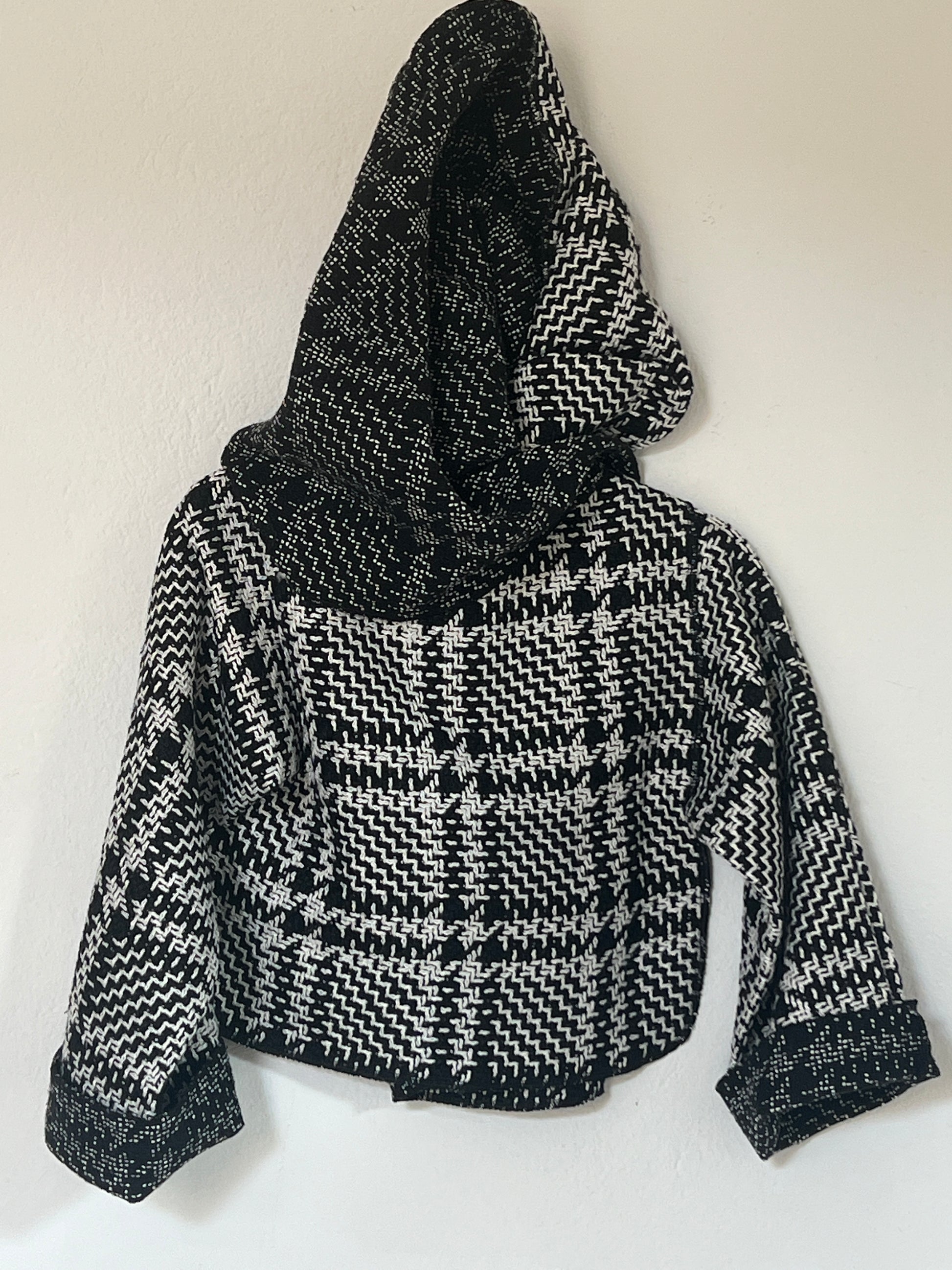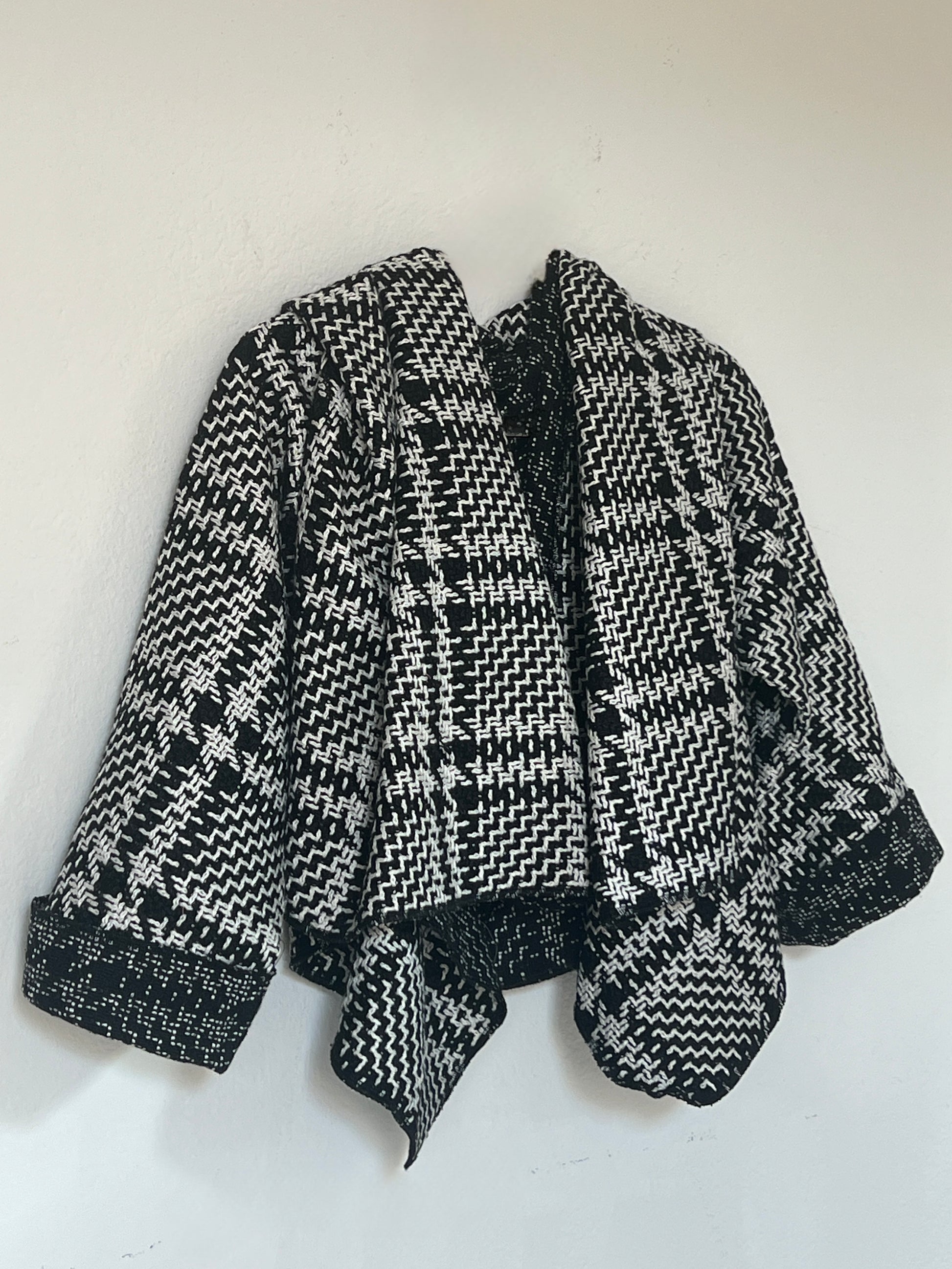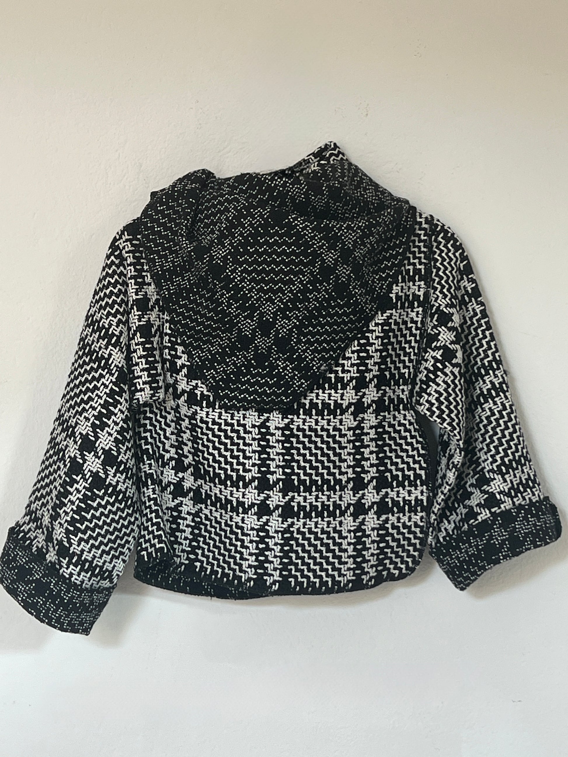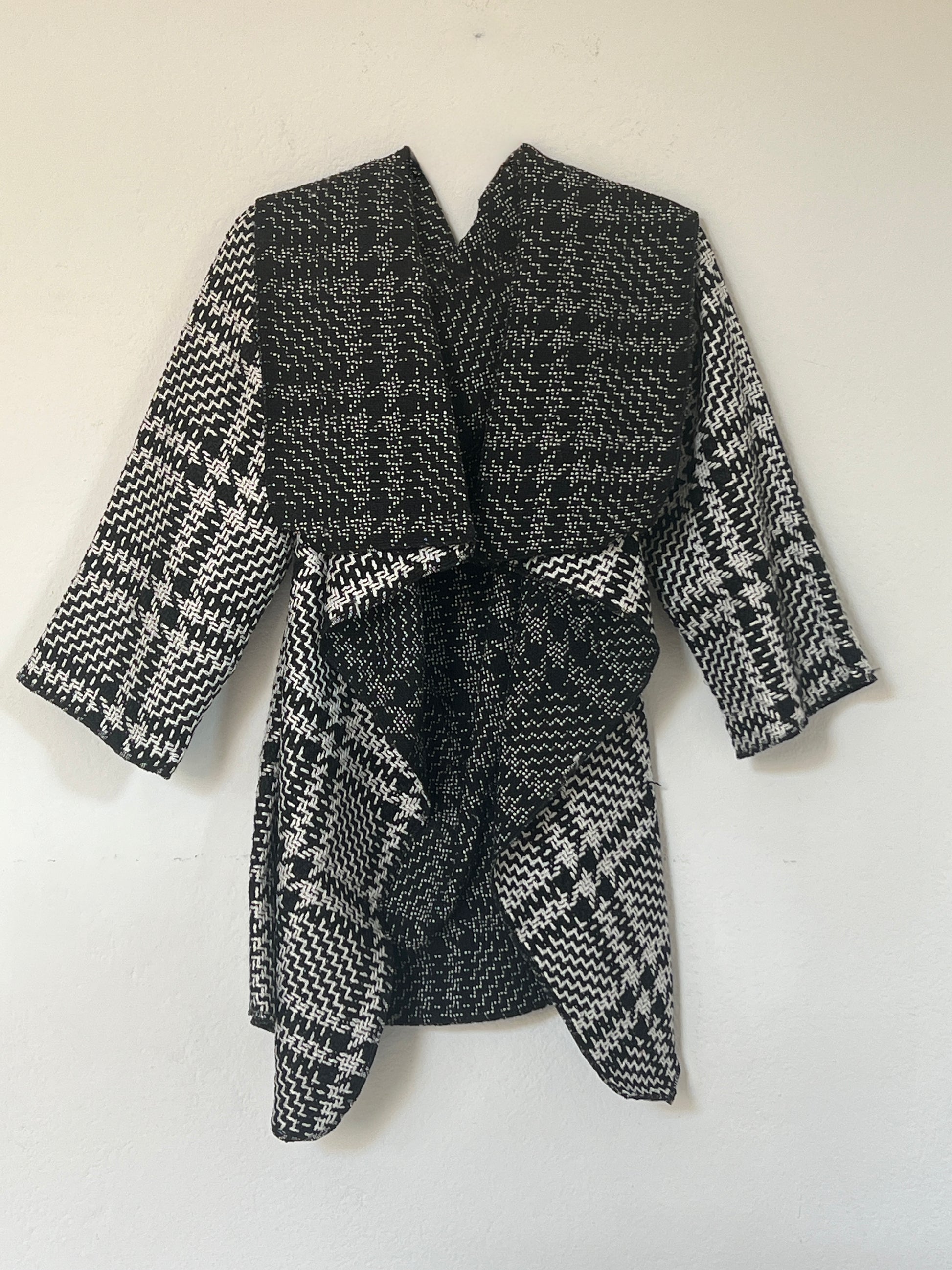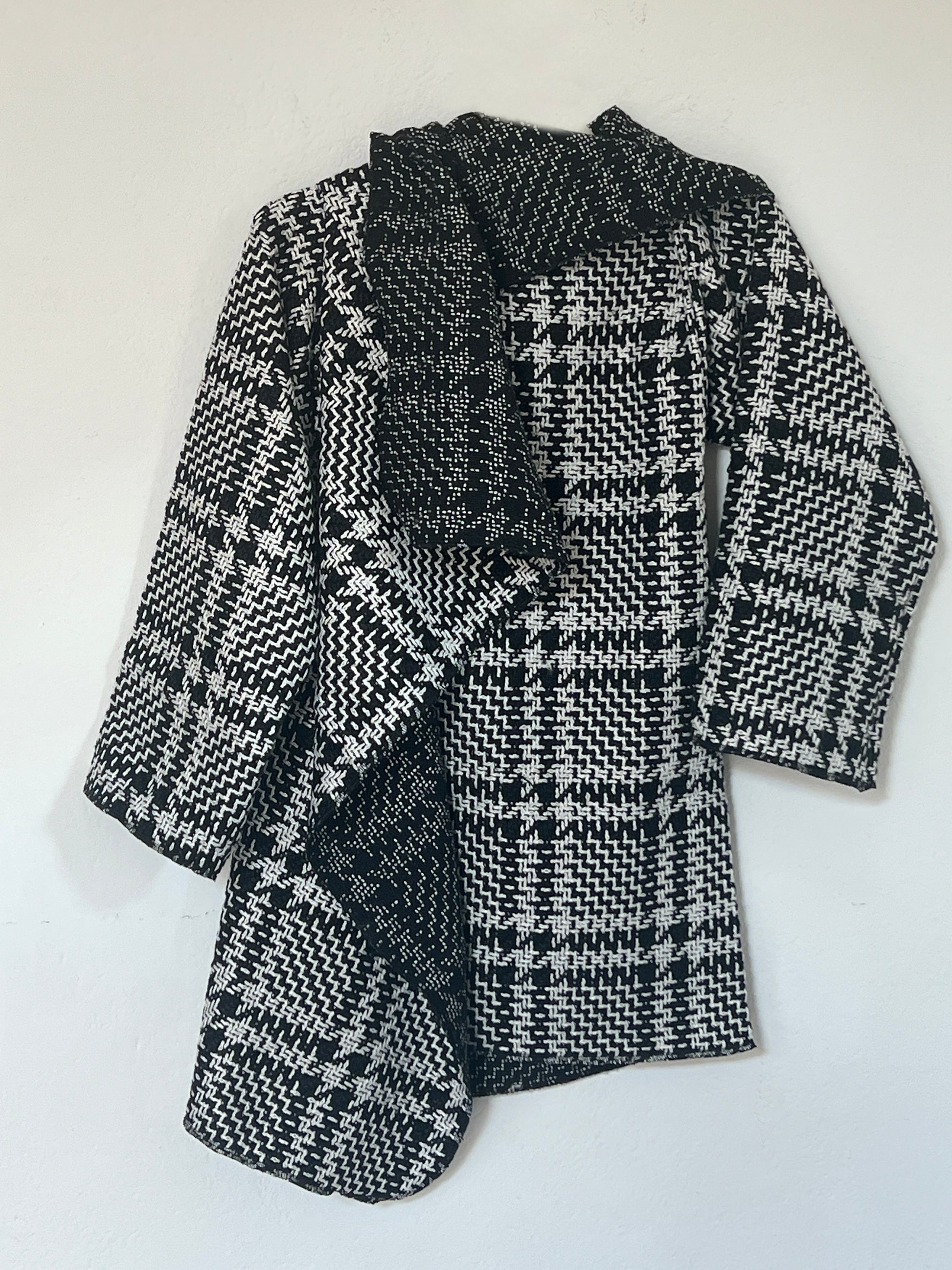 Chaqueta en tejido blanco y negro con dibujo tipo houndstooth, suave y con cuerpo ligero. El interior en un tono más oscuro aporta un contraste elegante. Su estructura flexible crea una caída moderna y envolvente, perfecta para un look sofisticado y diferente.