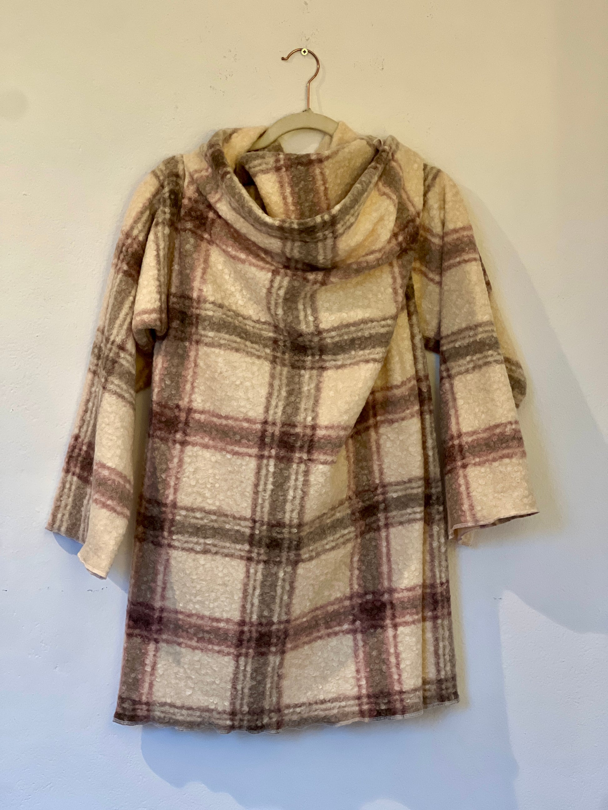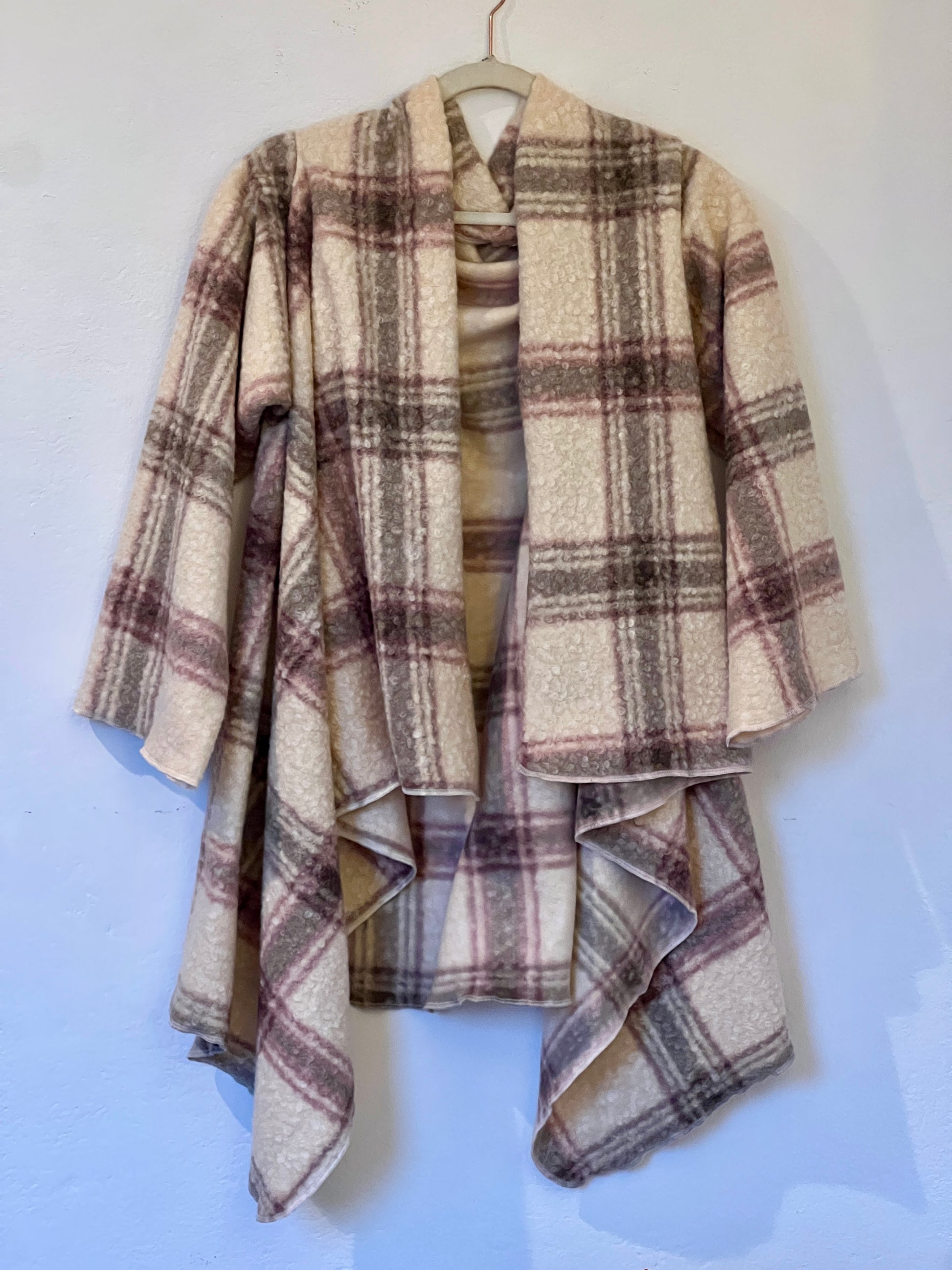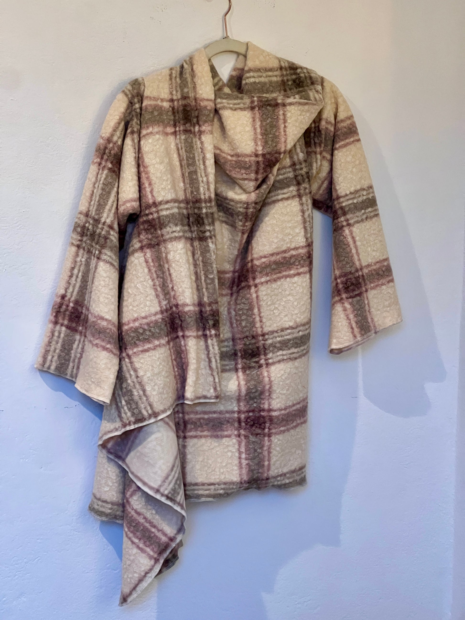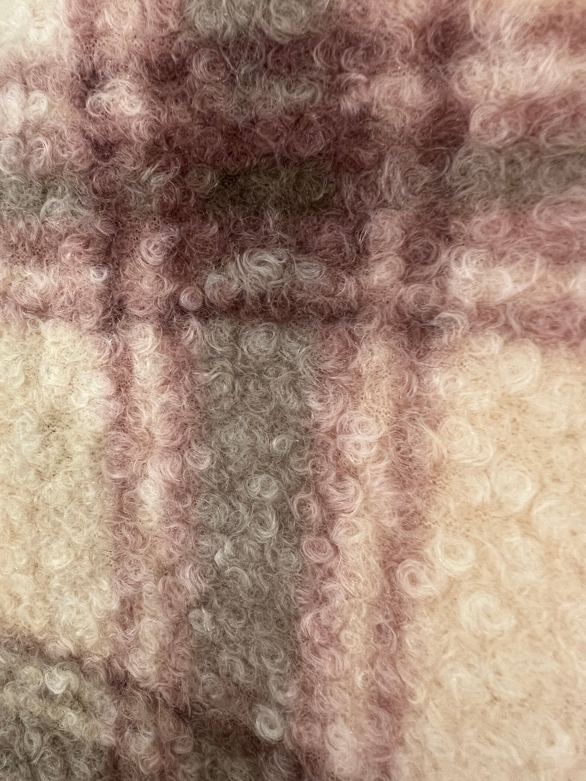 Abrigo de cuadros en tonos crema, malva y marrón, confeccionado en un tejido bouclé suave y muy agradable al tacto. Su textura mullida aporta calidez sin exceso de peso, creando una caída envolvente y relajada con un drapeado natural. Una pieza cómoda y elegante, perfecta para looks de invierno luminosos y actuales.