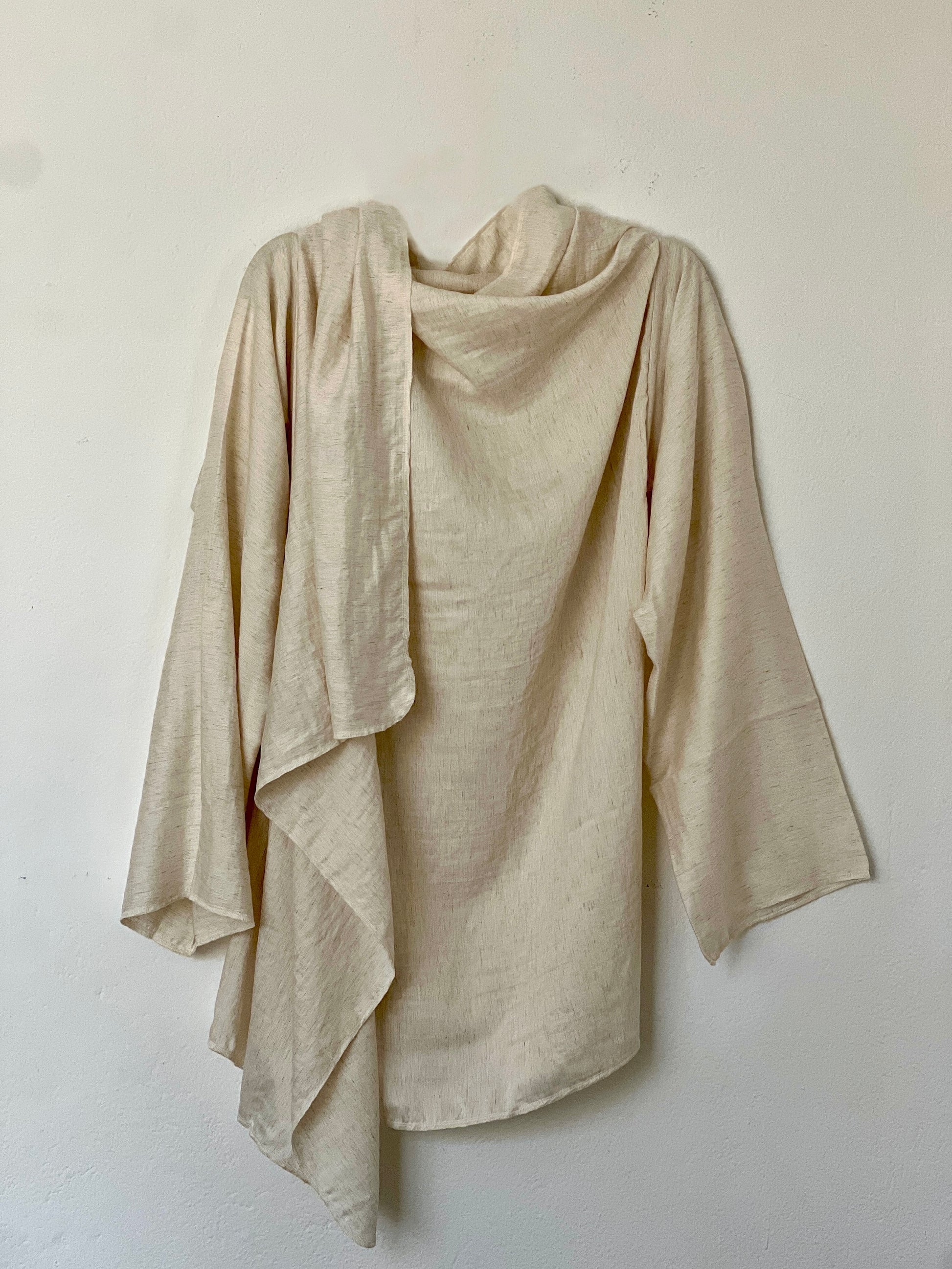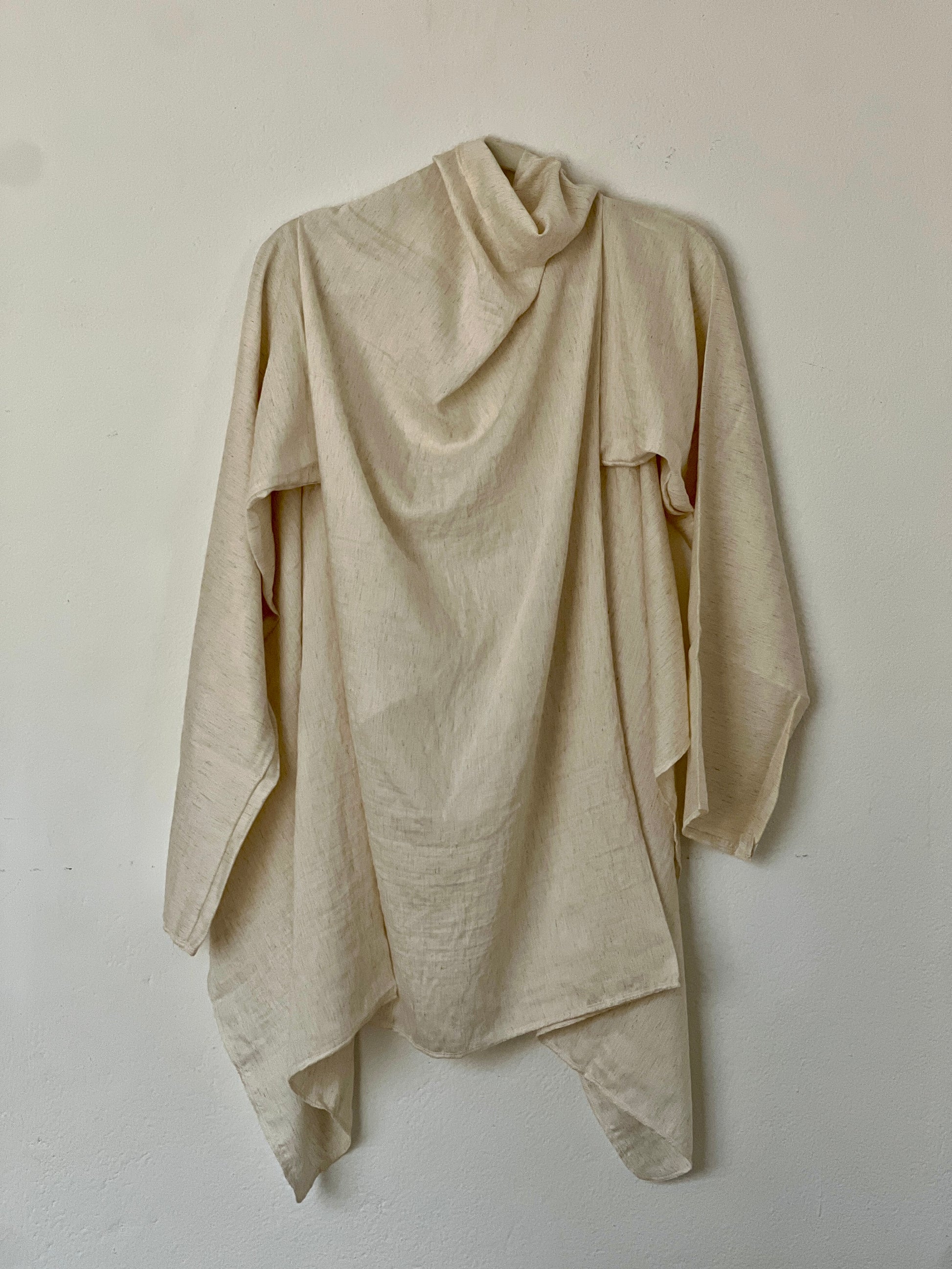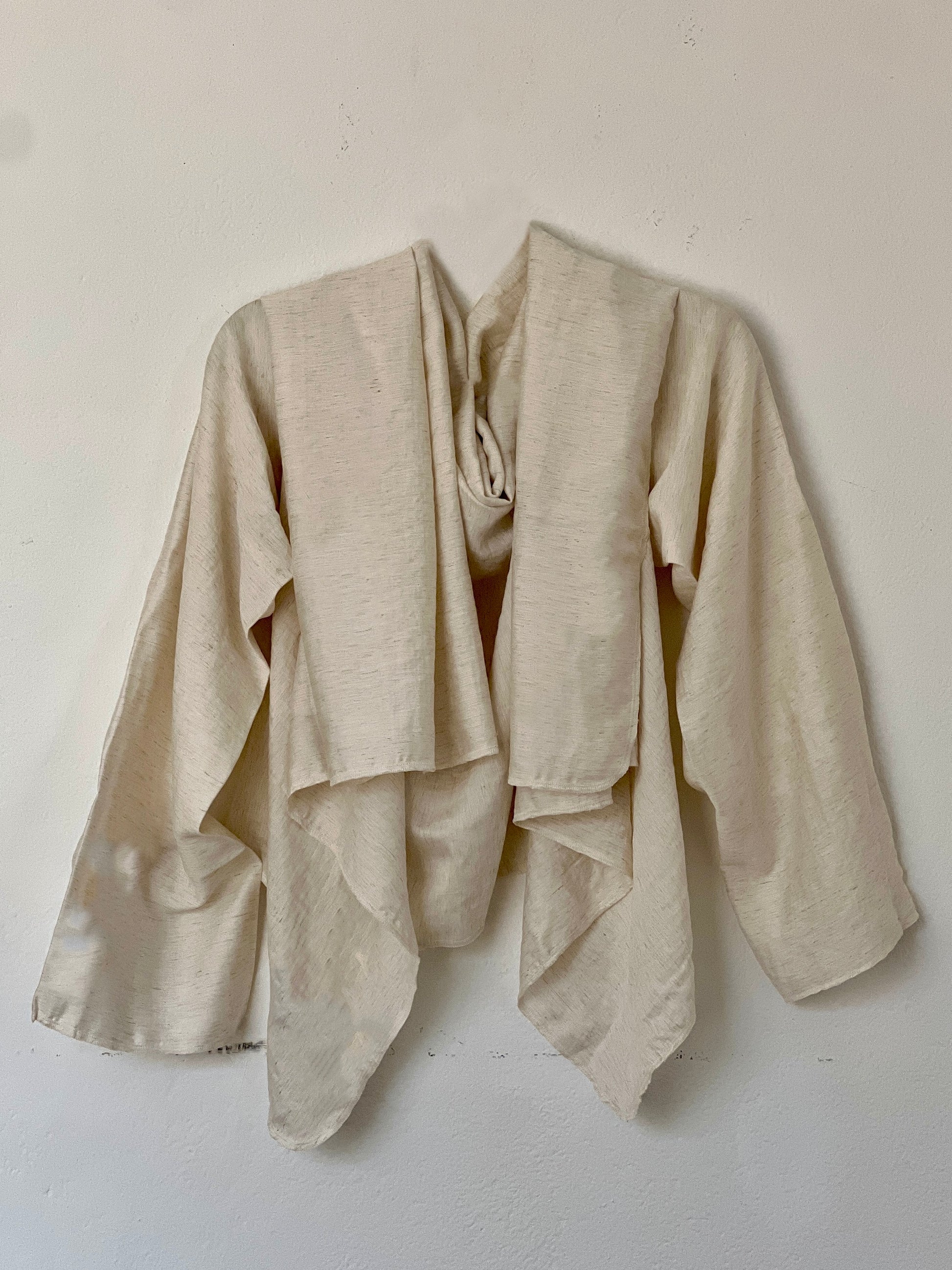 El color crudo, cálido y orgánico, deja ver la trama y refuerza su sensación de naturalidad y atemporalidad. Es una prenda siempre abierta, adaptándose asi a distintas siluetas.