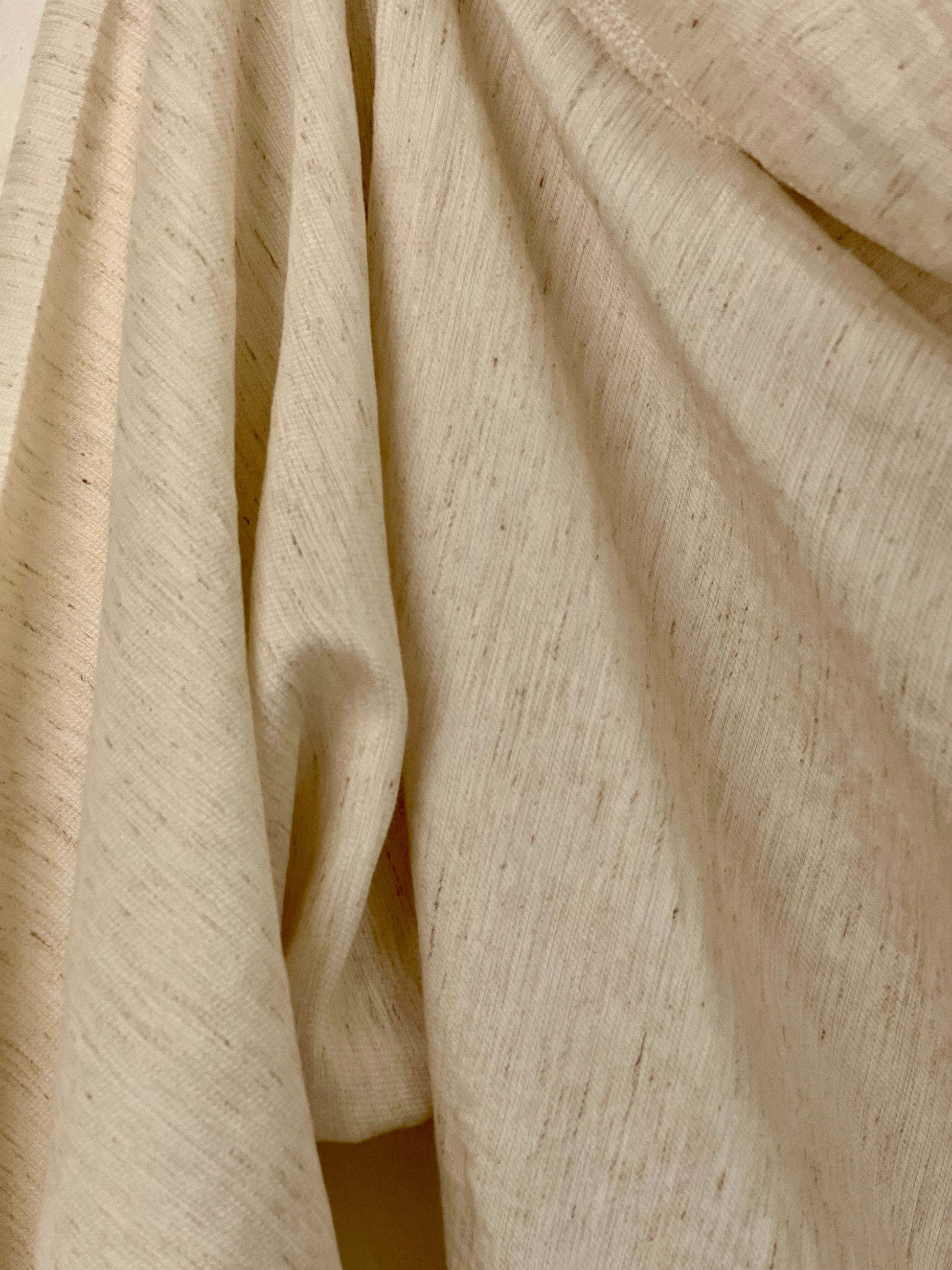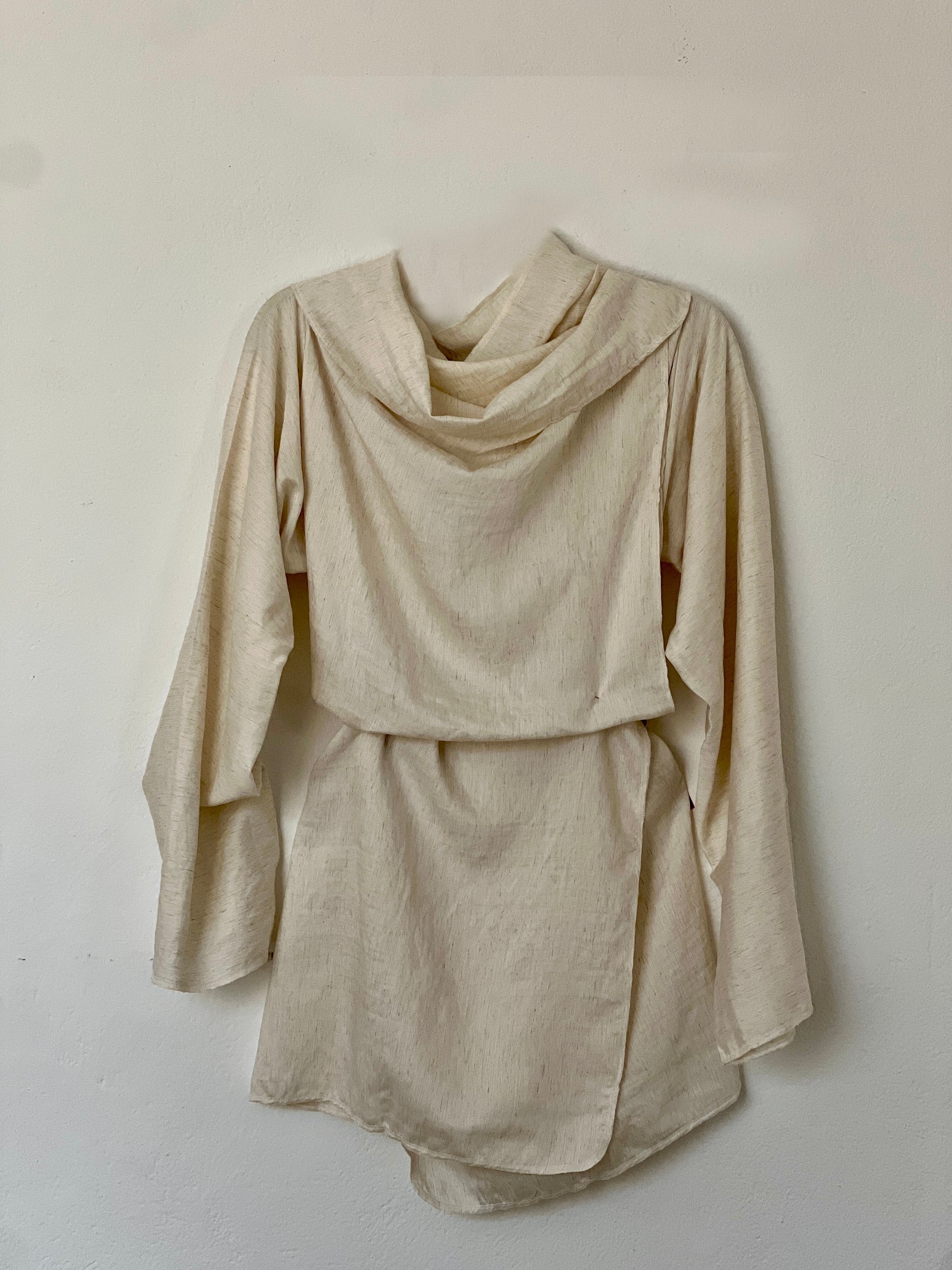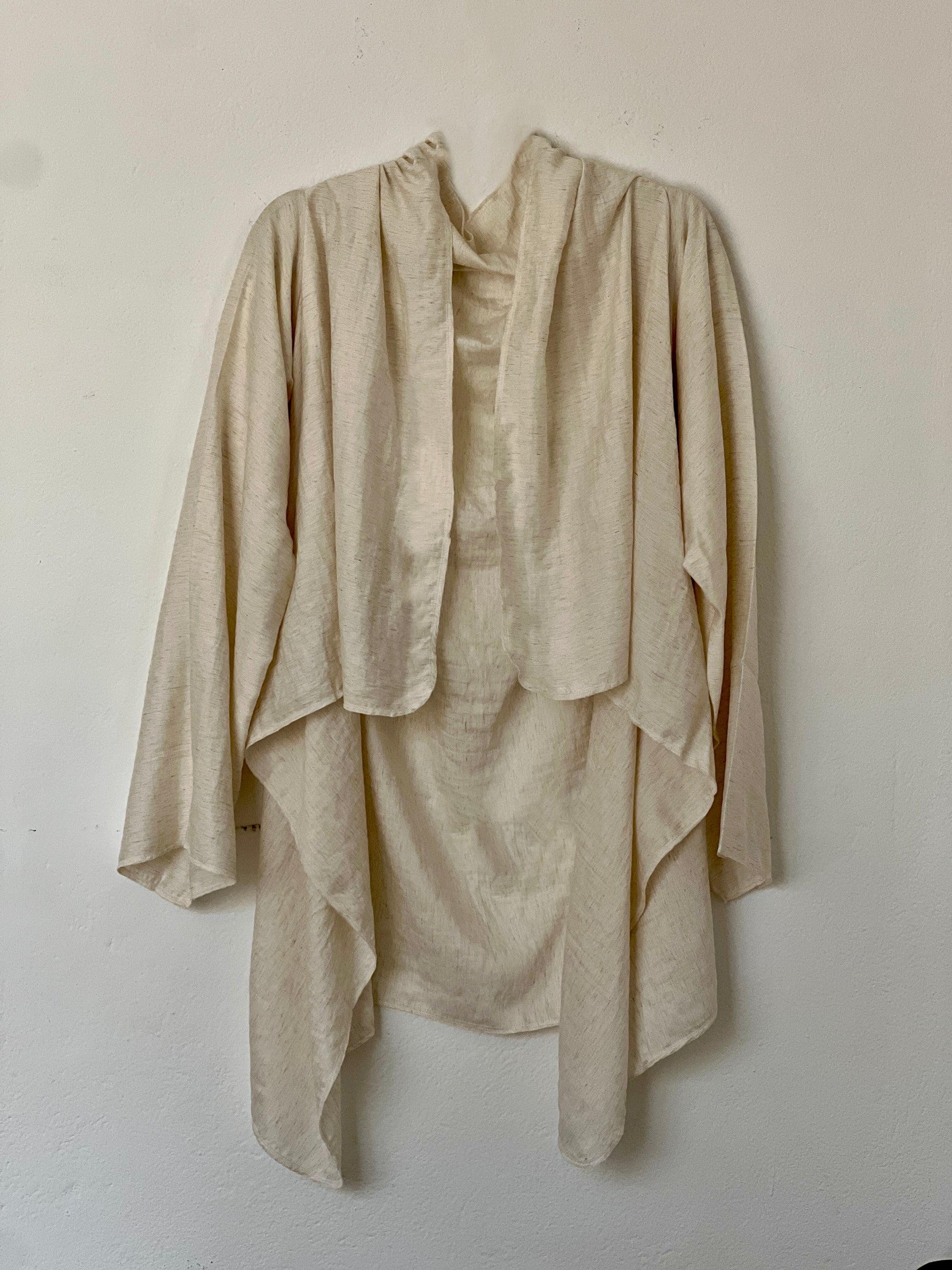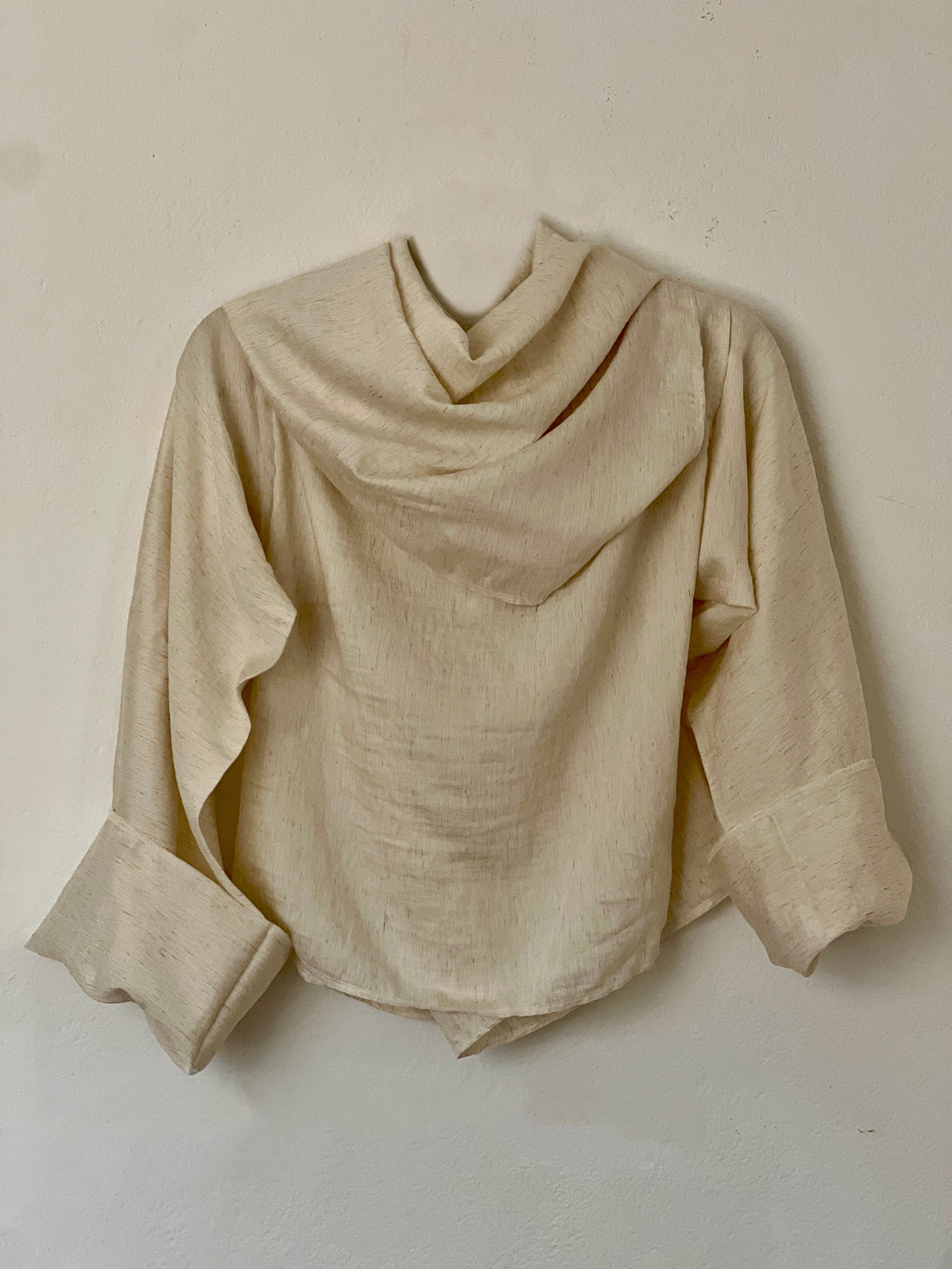 El color crudo, cálido y orgánico, deja ver la trama y refuerza su sensación de naturalidad y atemporalidad. Es una prenda siempre abierta, adaptándose asi a distintas siluetas.