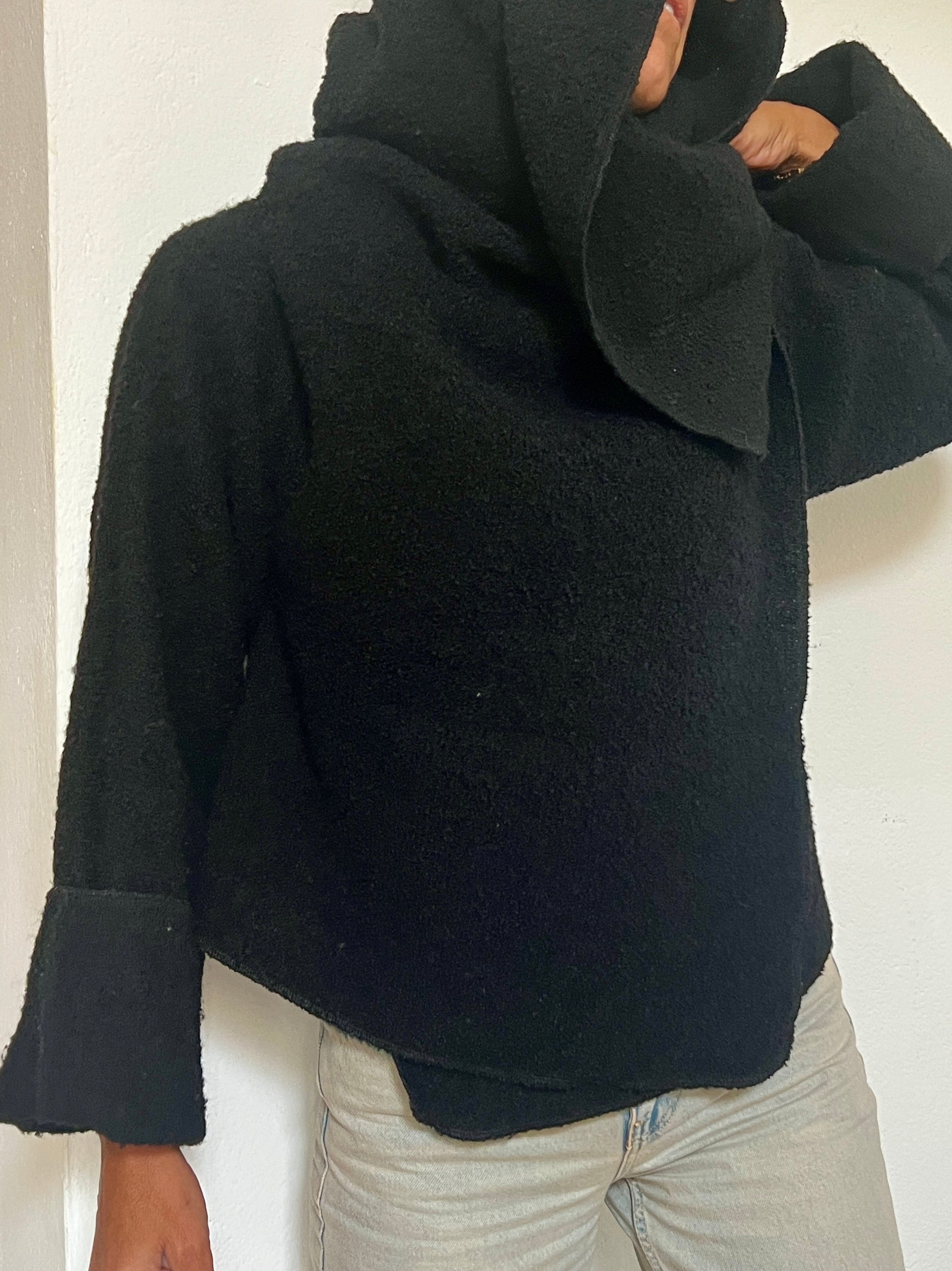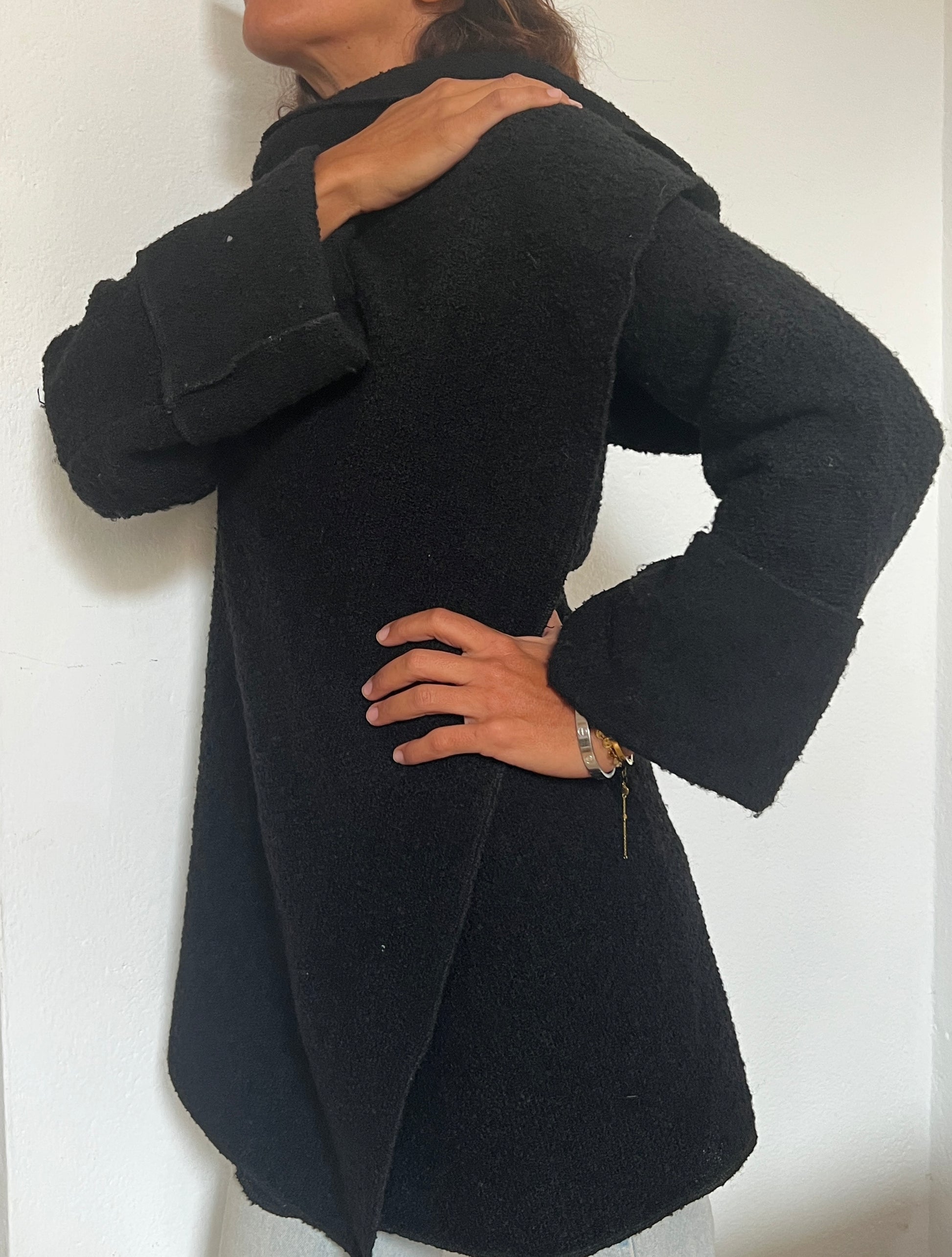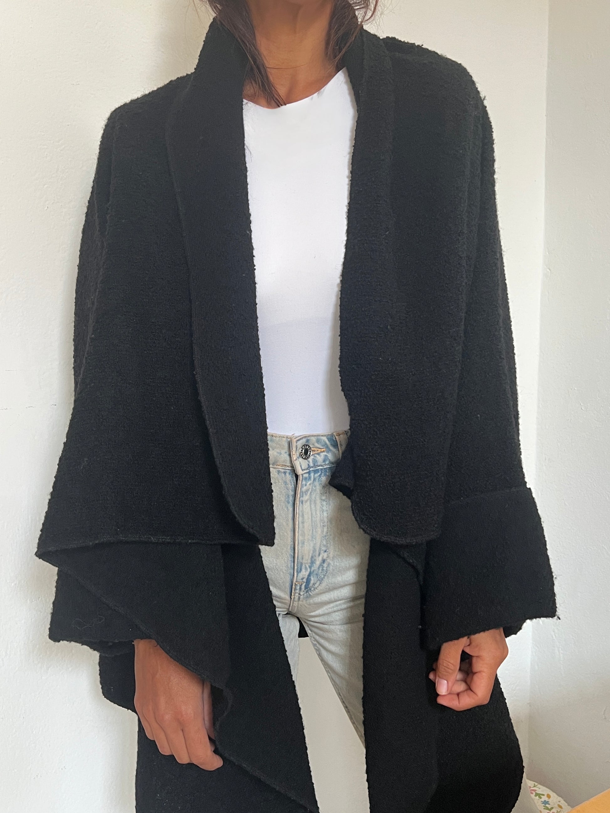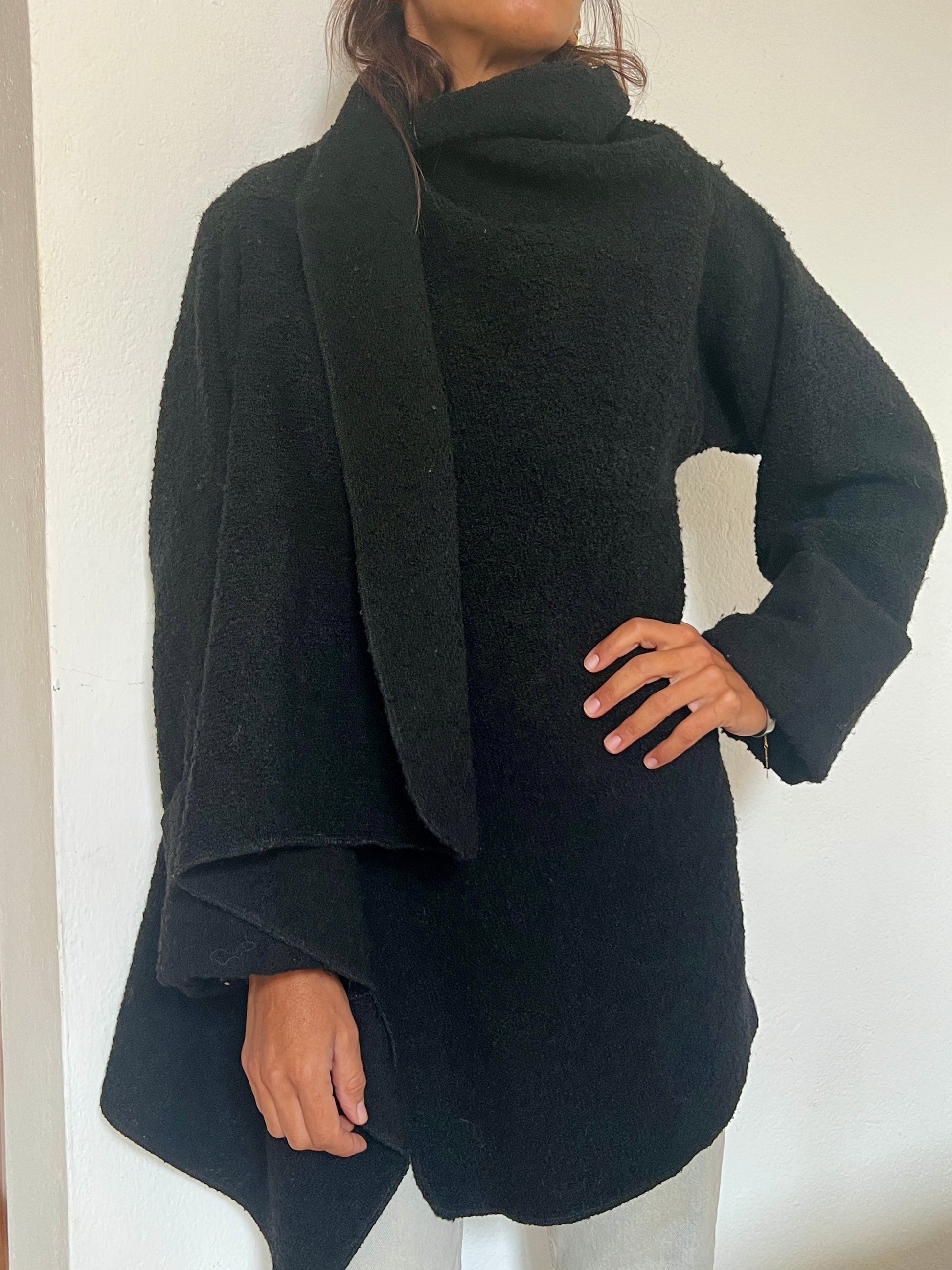 La caída es más contenida que en telas ligeras, pero sigue siendo flexible: el tejido sostiene la forma y crea volúmenes amplios y envolventes, especialmente en mangas y delantero. No es rígido, sino acogedor, con una presencia sólida y confortable, casi como un abrigo-manta, que transmite calidez, refugio y comodidad.