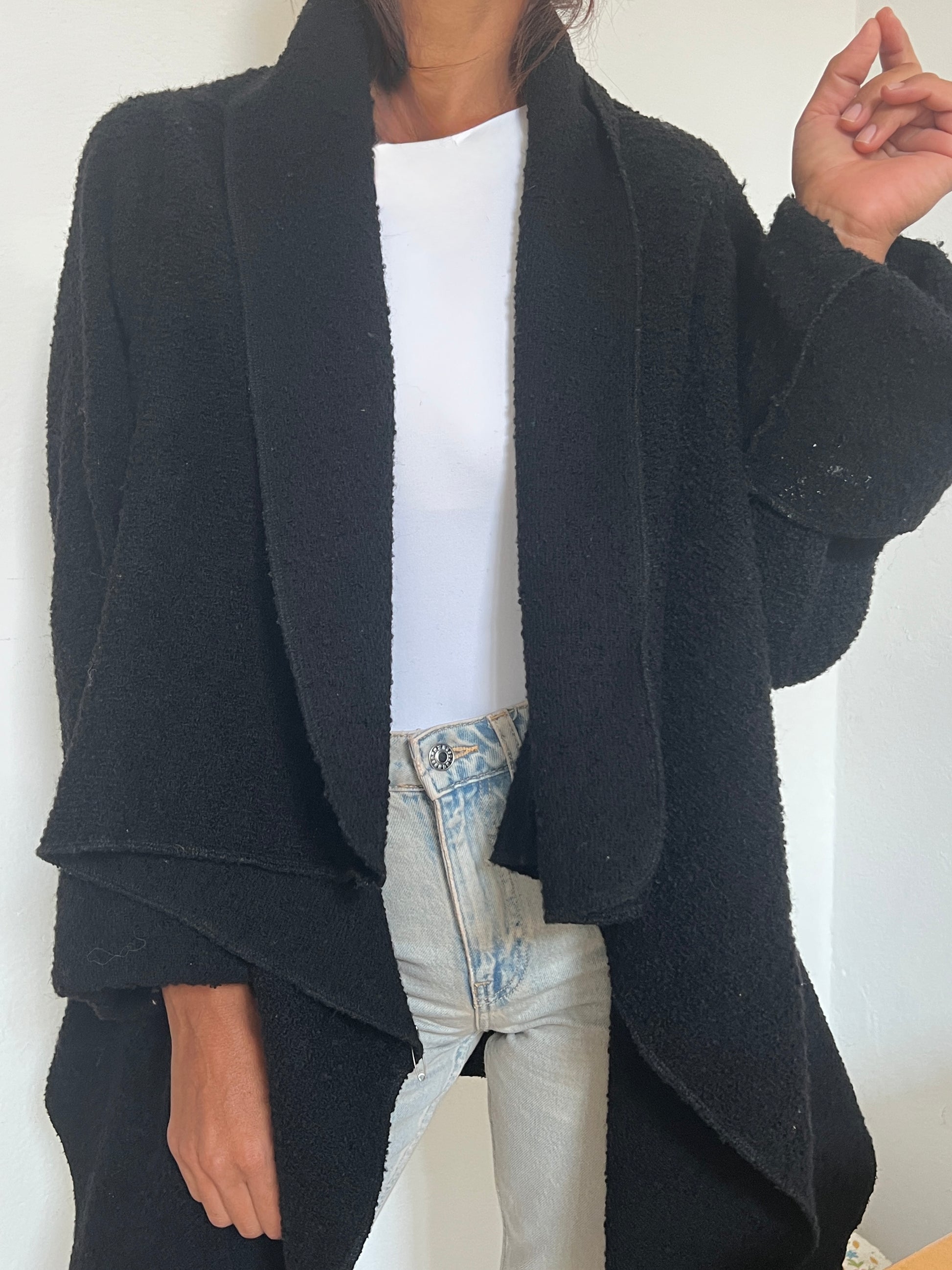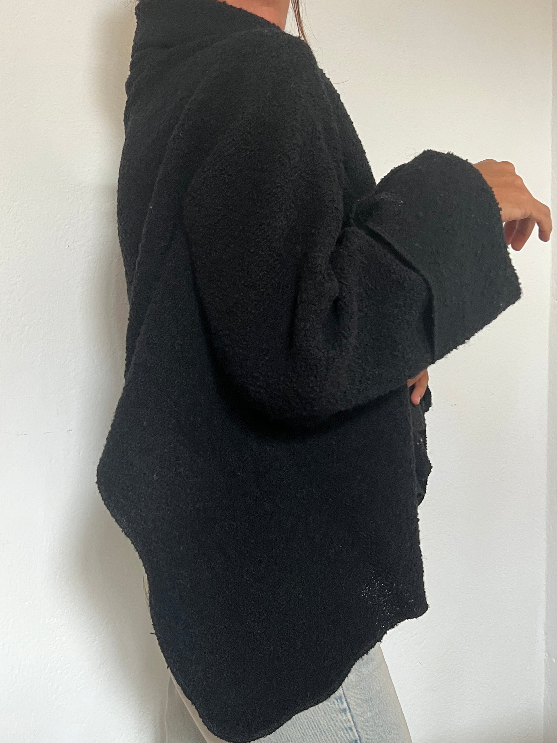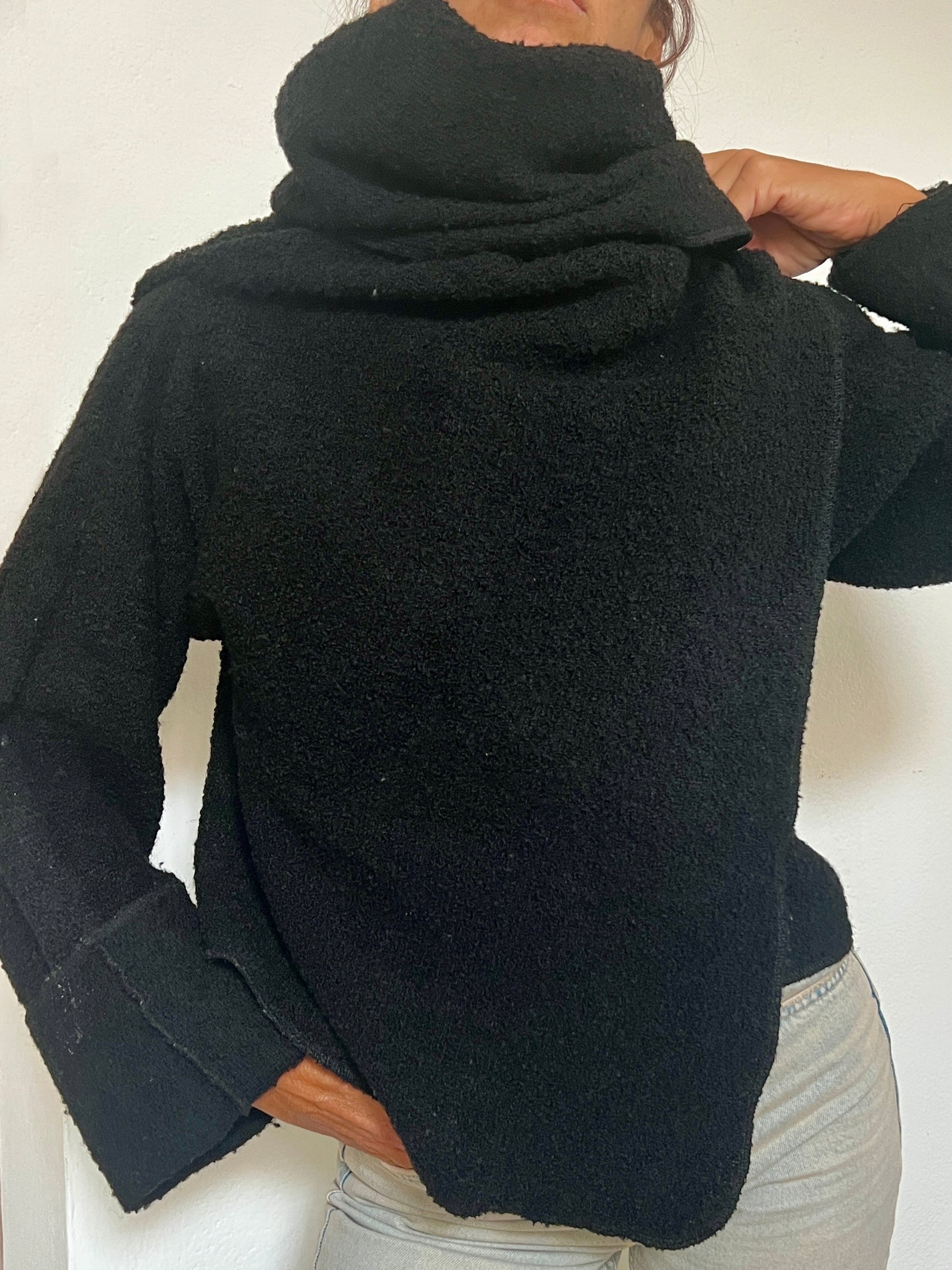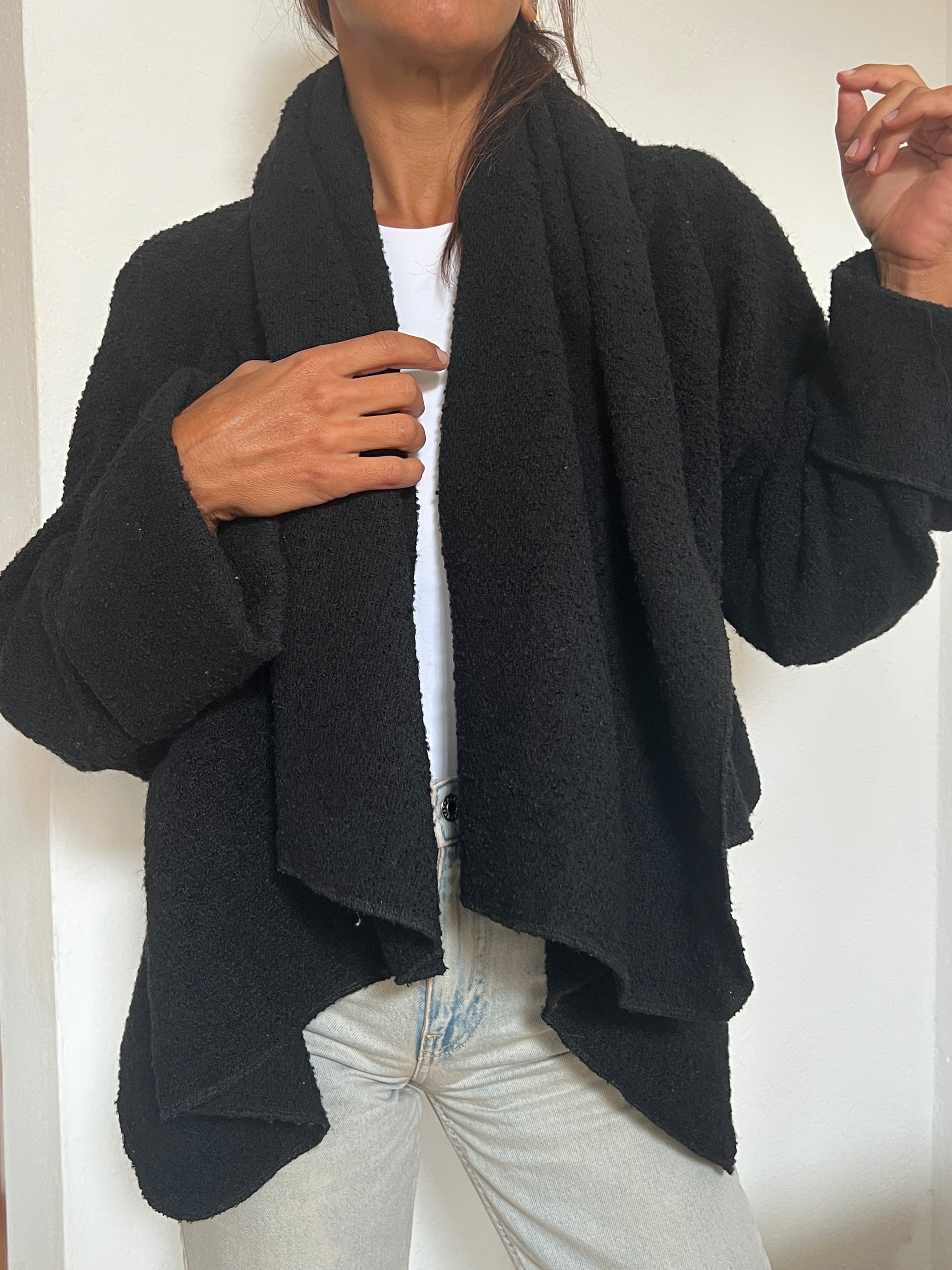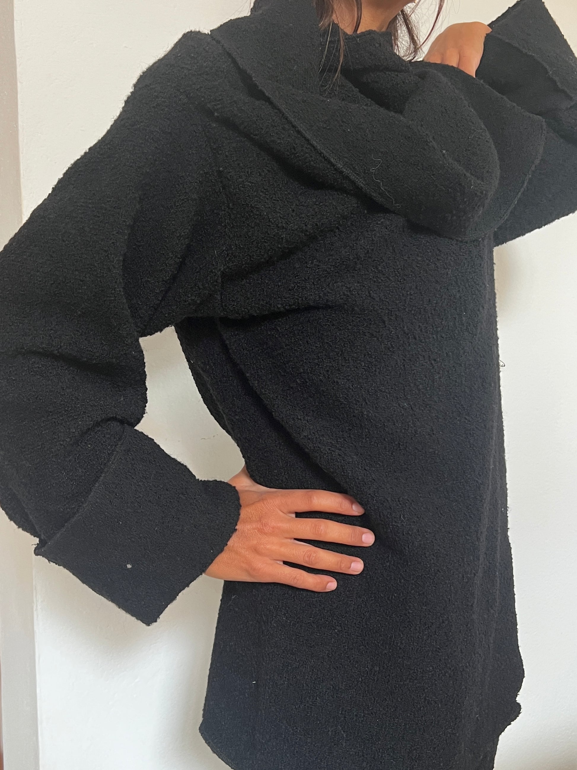La caída es más contenida que en telas ligeras, pero sigue siendo flexible: el tejido sostiene la forma y crea volúmenes amplios y envolventes, especialmente en mangas y delantero. No es rígido, sino acogedor, con una presencia sólida y confortable, casi como un abrigo-manta, que transmite calidez, refugio y comodidad.