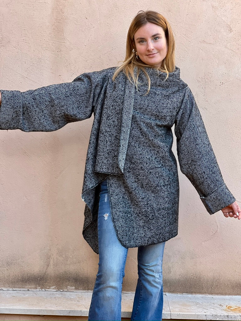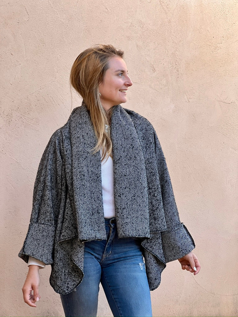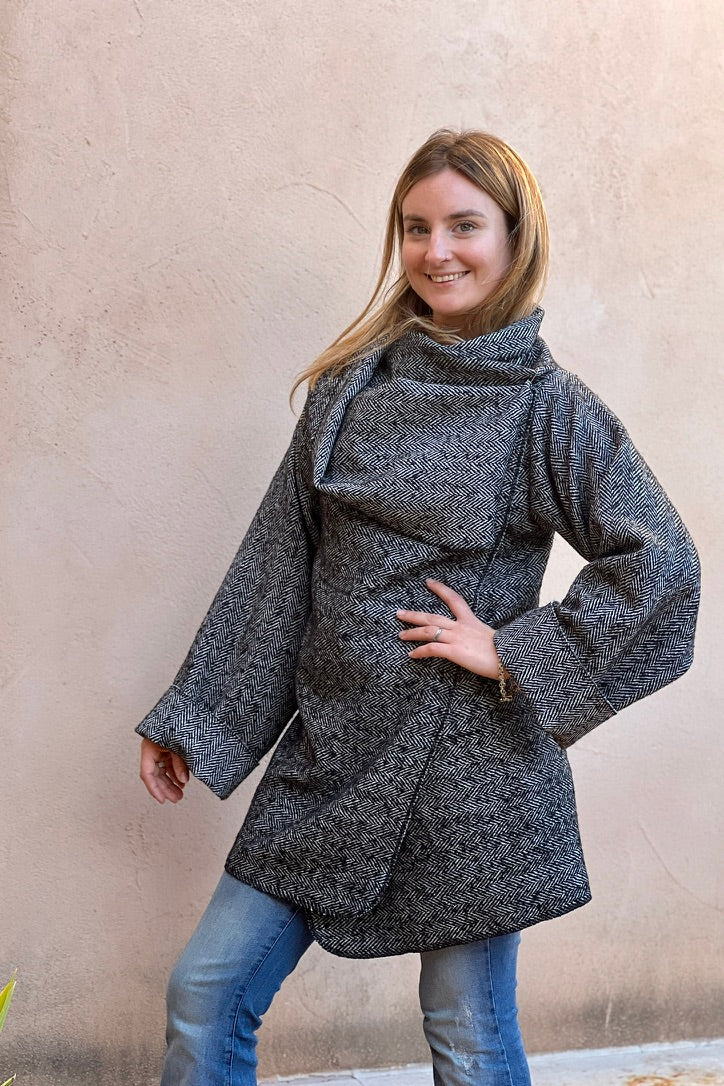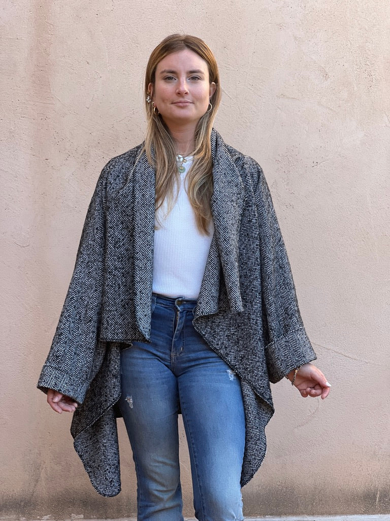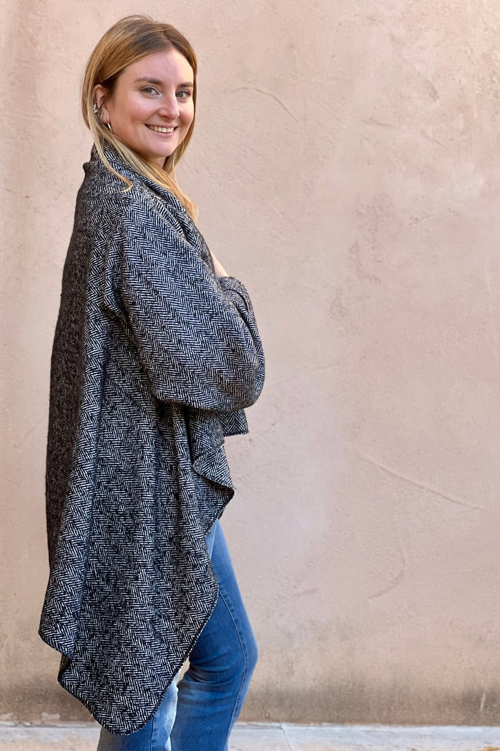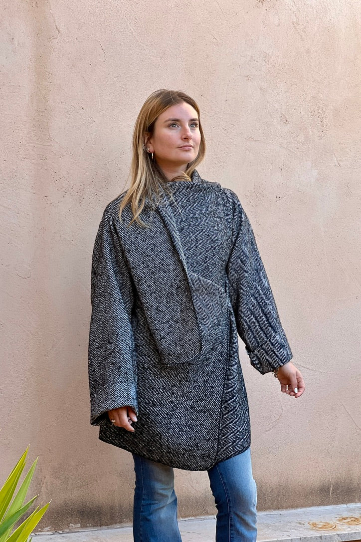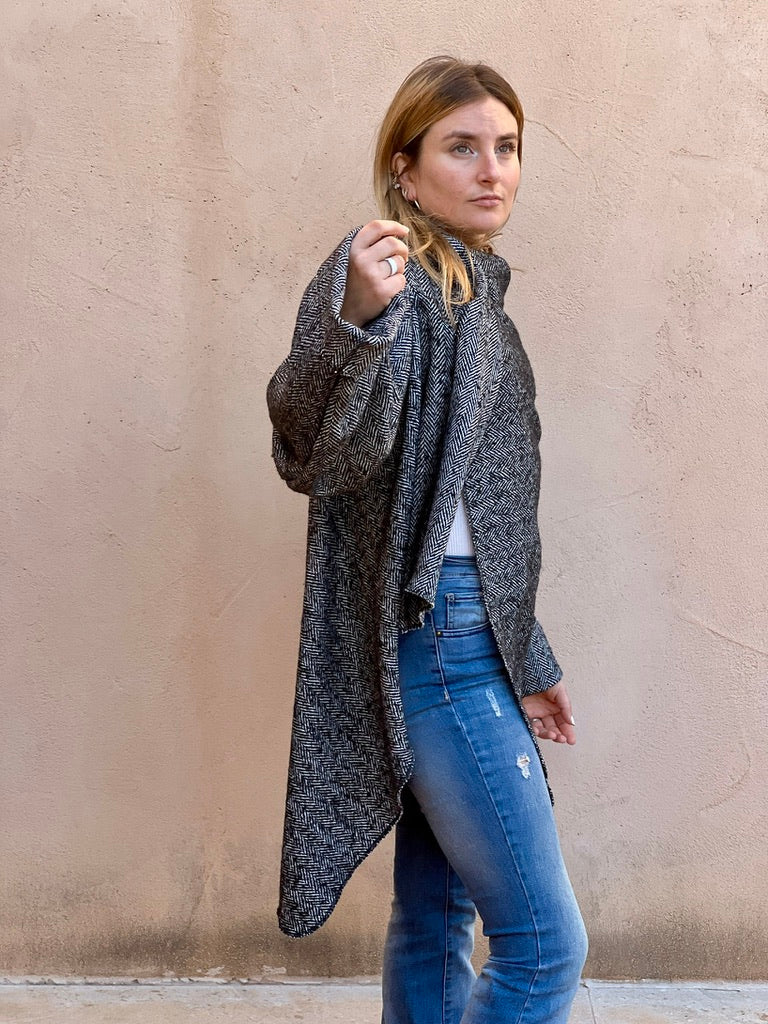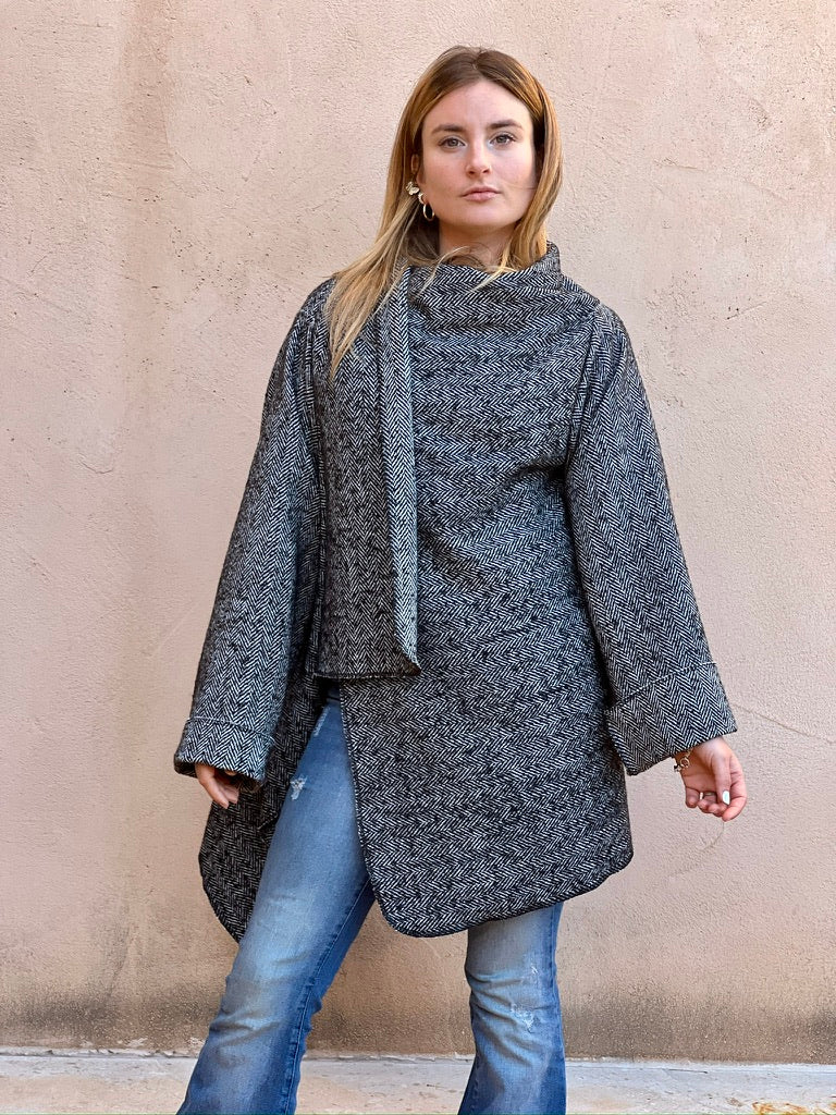 Abrigo en espiga natural, negro y gris, confeccionado en un tejido ligeramente pesado que aporta estructura y presencia. La textura es suave, pero con un dibujo espiga marcado y definido, creando una caída fluida pero con más cuerpo. Perfecto para un look elegante y con carácter.