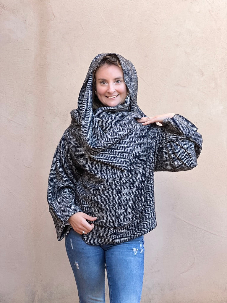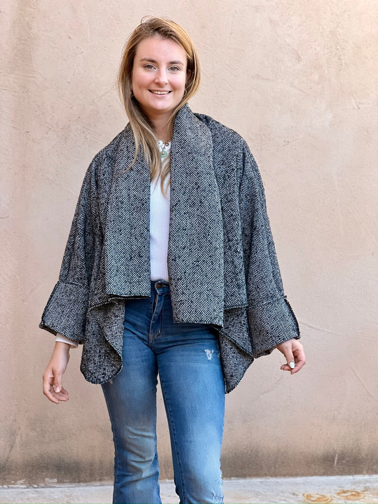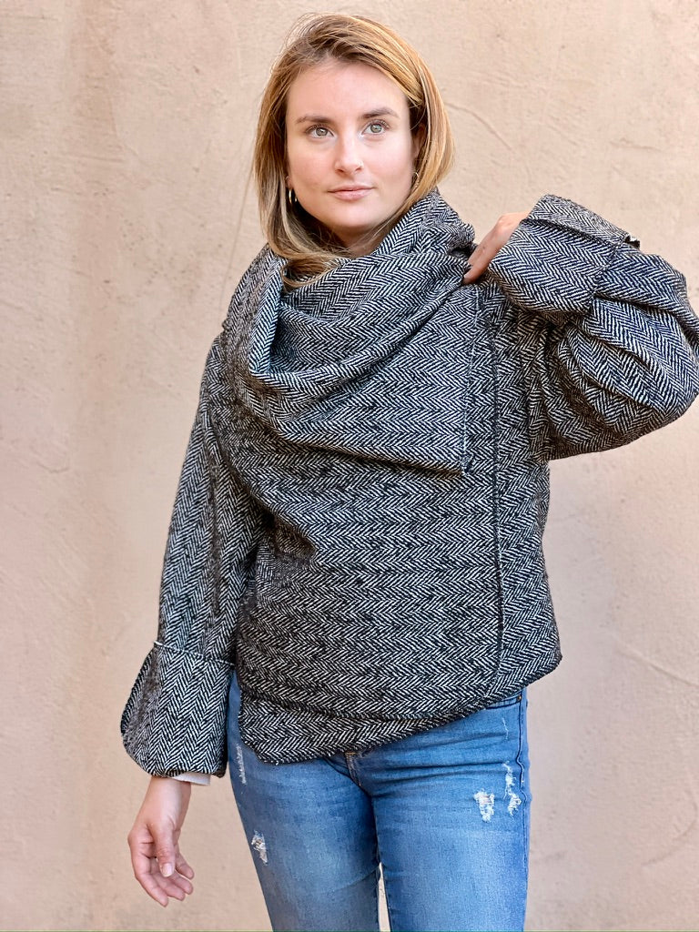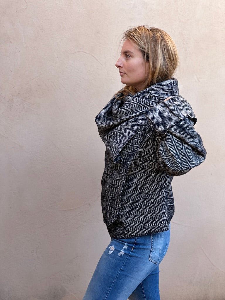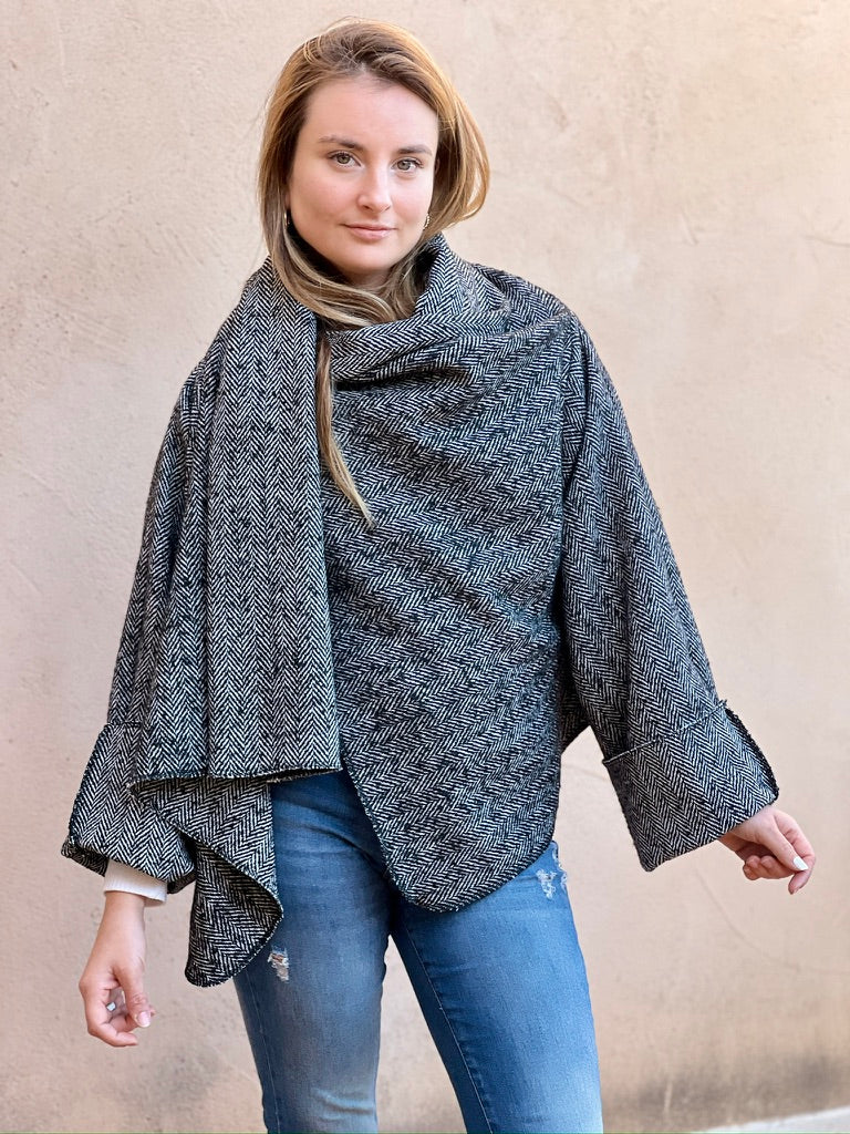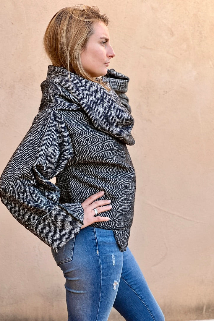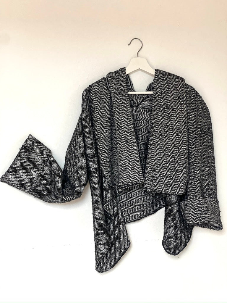 Abrigo en espiga natural, negro y gris, confeccionado en un tejido ligeramente pesado que aporta estructura y presencia. La textura es suave, pero con un dibujo espiga marcado y definido, creando una caída fluida pero con más cuerpo. Perfecto para un look elegante y con carácter.