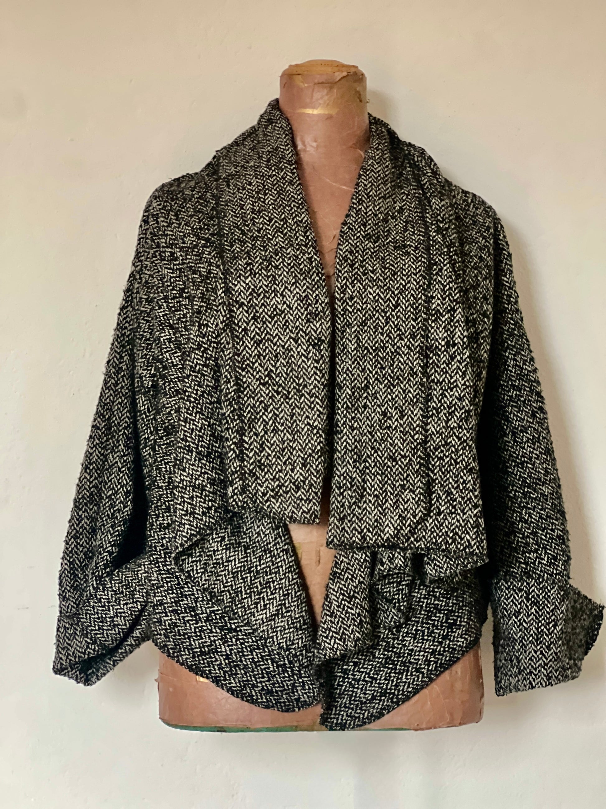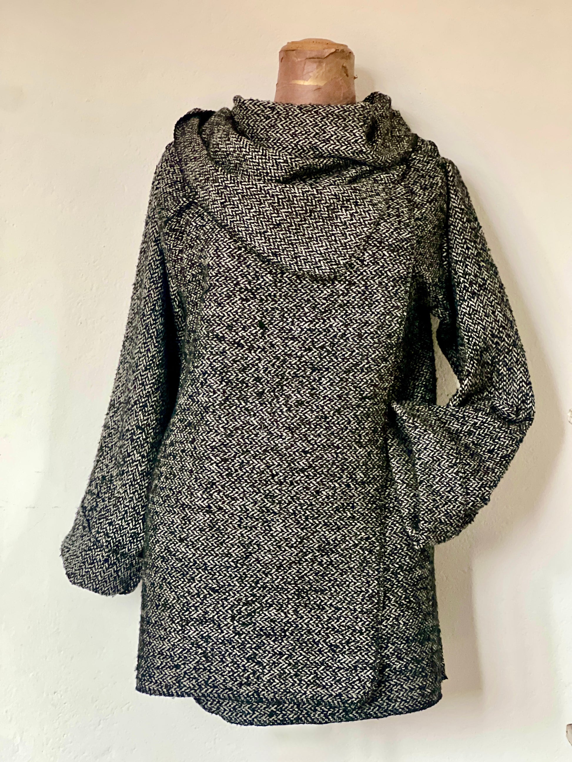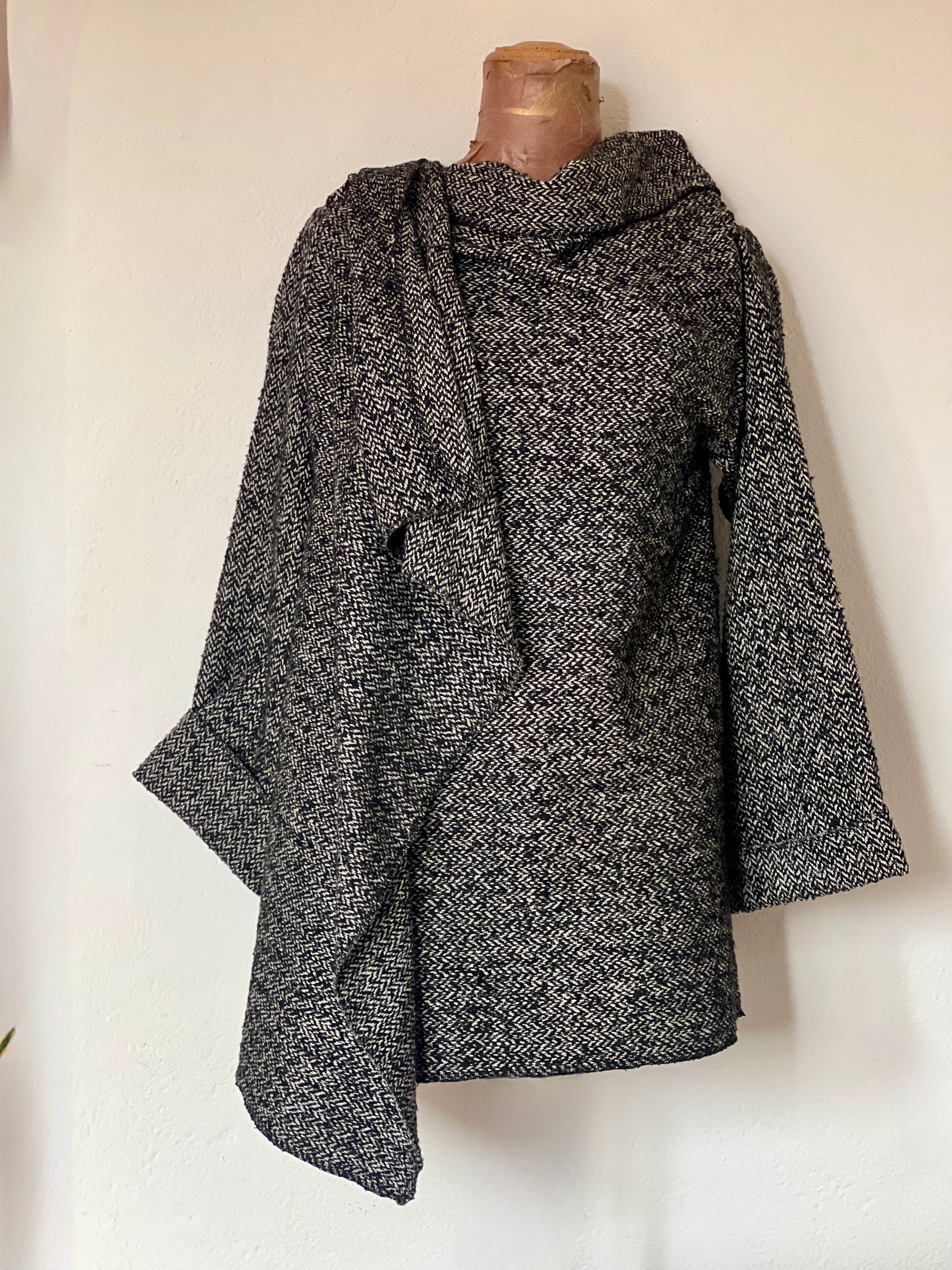 Abrigo en tejido espiga en blanco, negro y gris, con textura suave y estructura ligera. Su caída fluida pero con carácter crea un drapeado elegante que aporta un toque clásico y sofisticado a cualquier look.