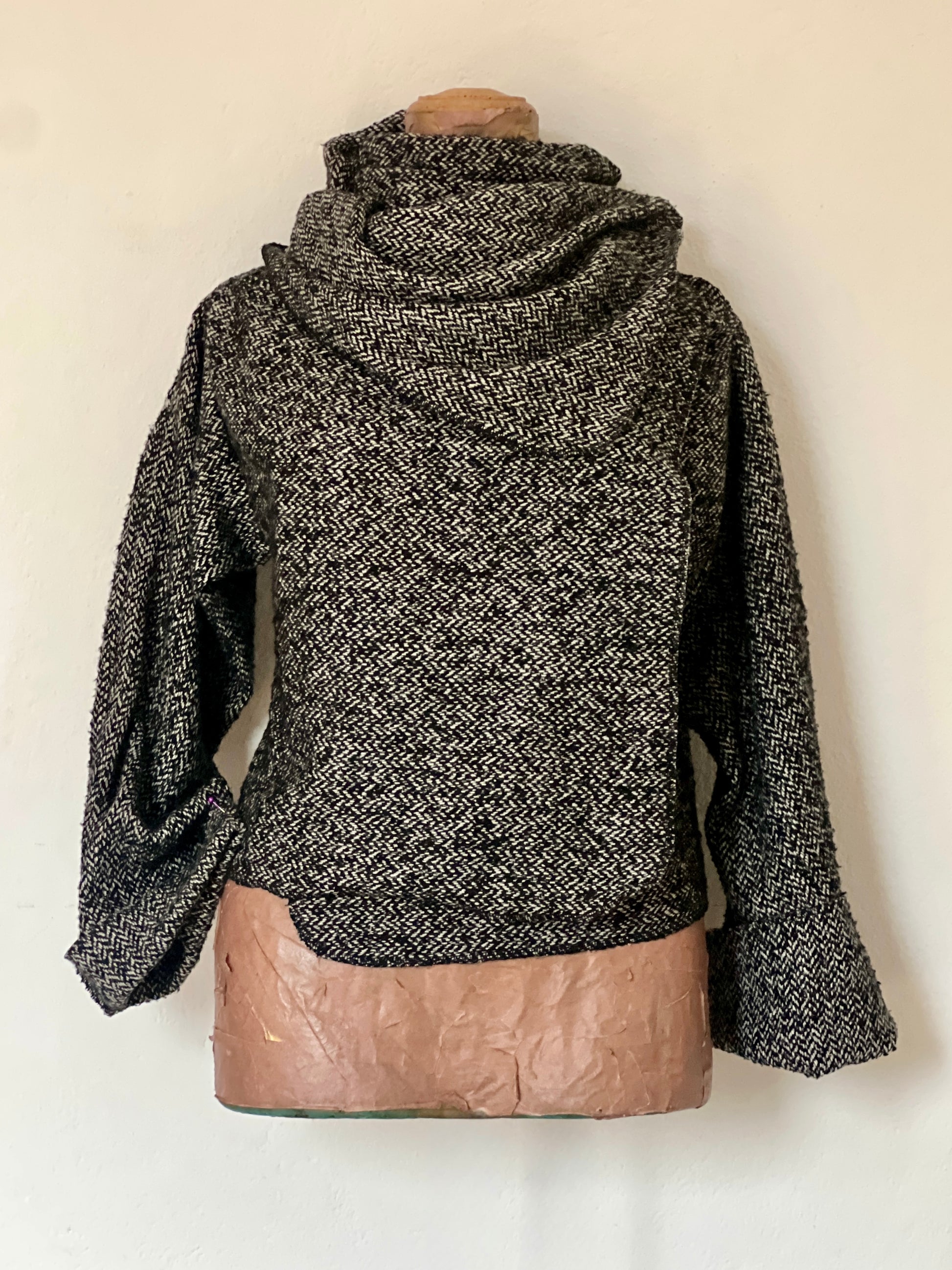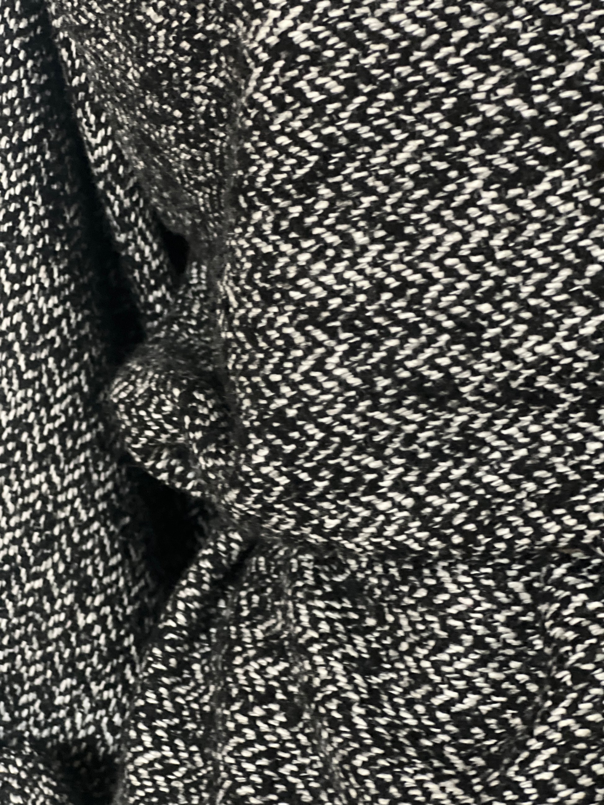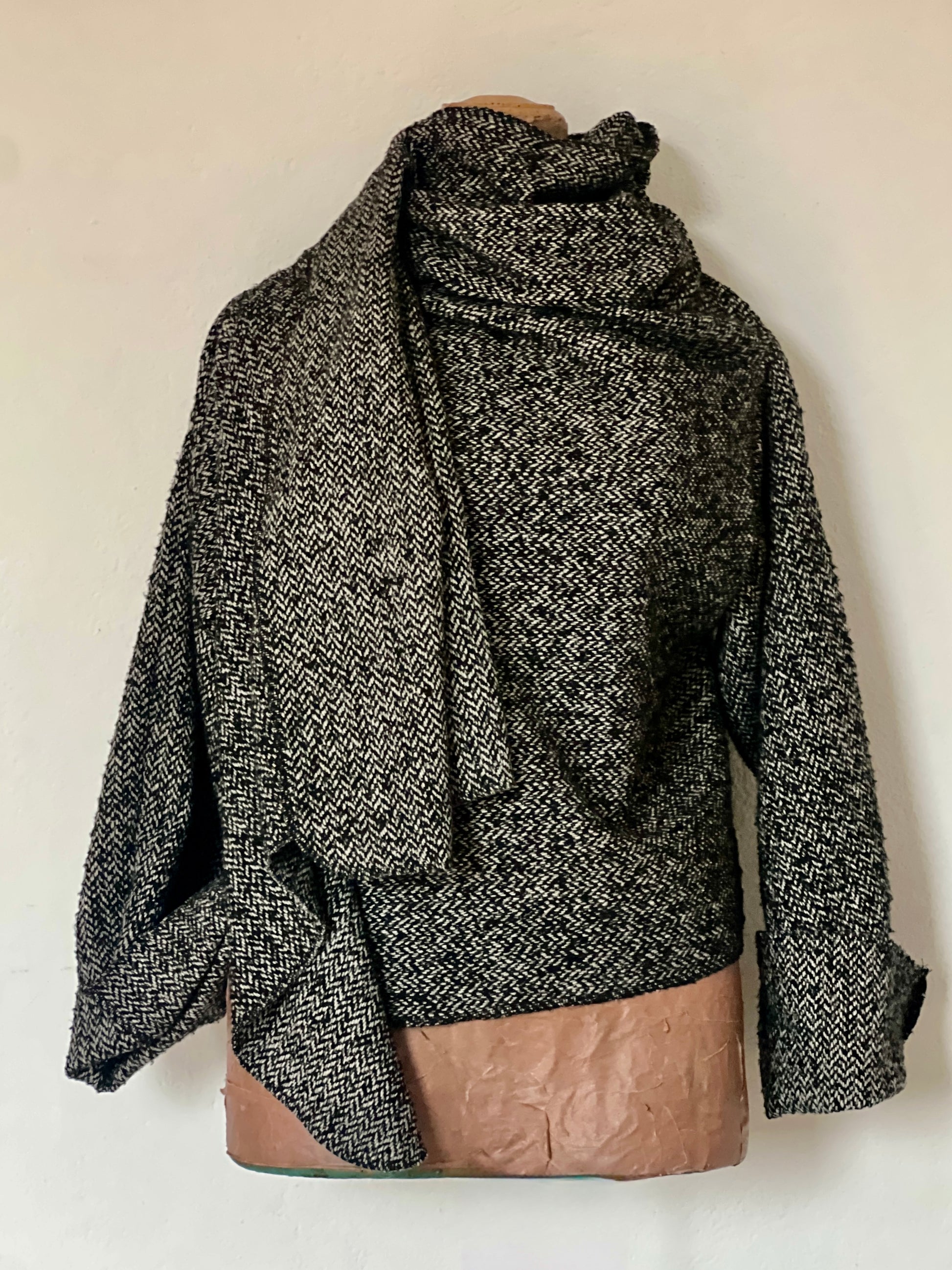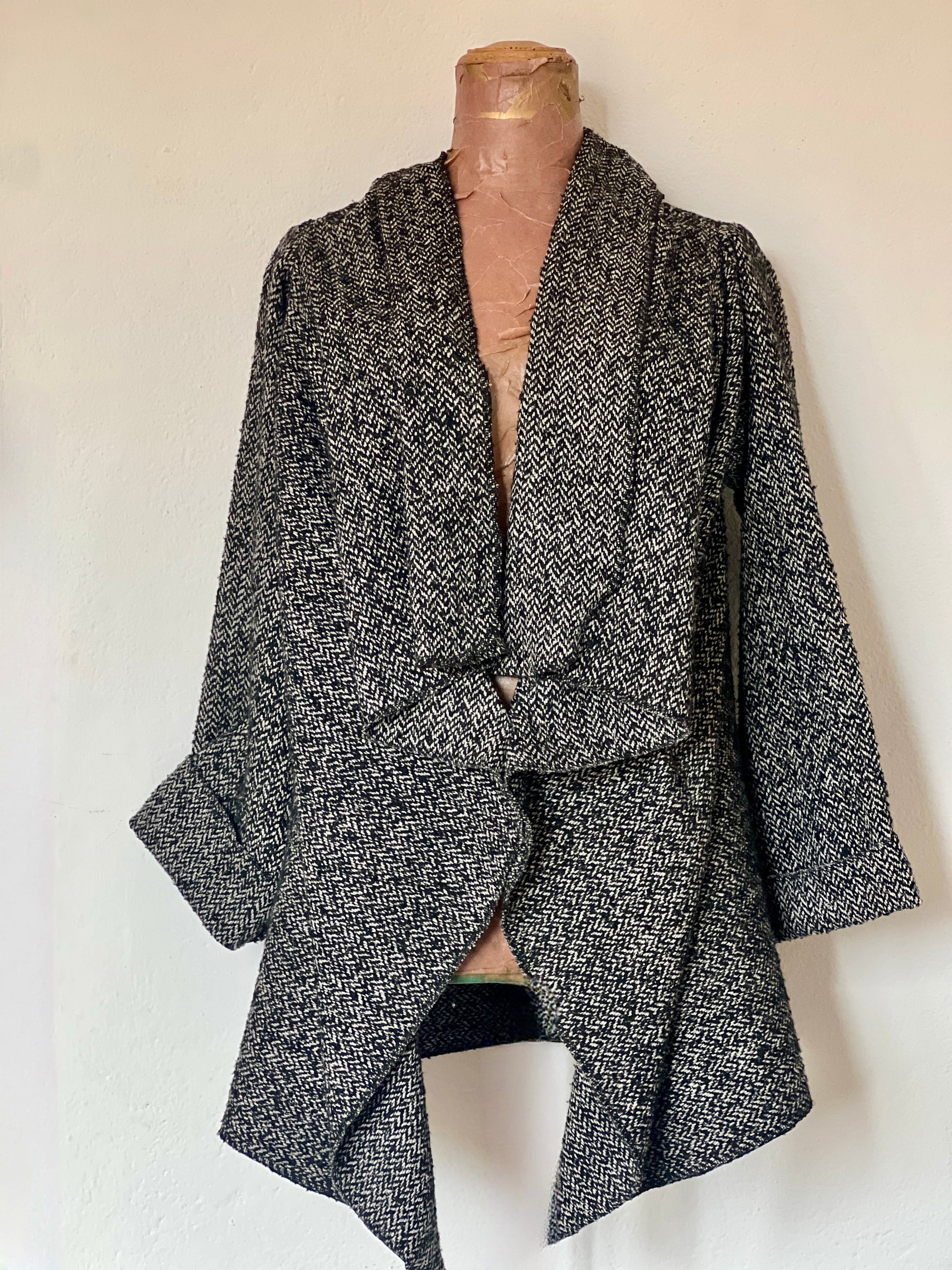 Abrigo en tejido espiga en blanco, negro y gris, con textura suave y estructura ligera. Su caída fluida pero con carácter crea un drapeado elegante que aporta un toque clásico y sofisticado a cualquier look.