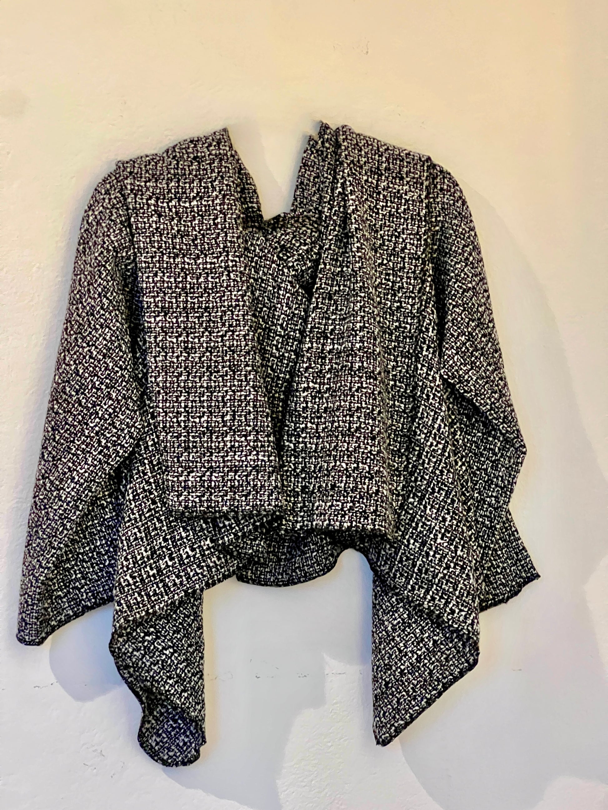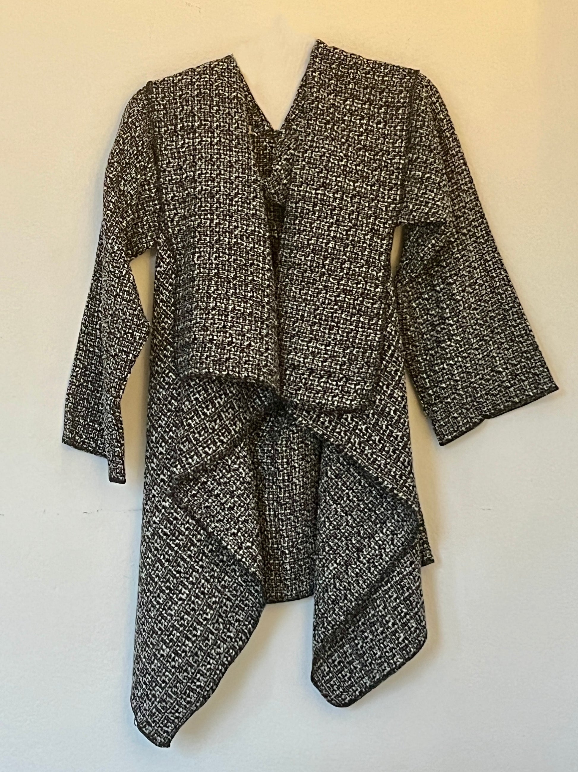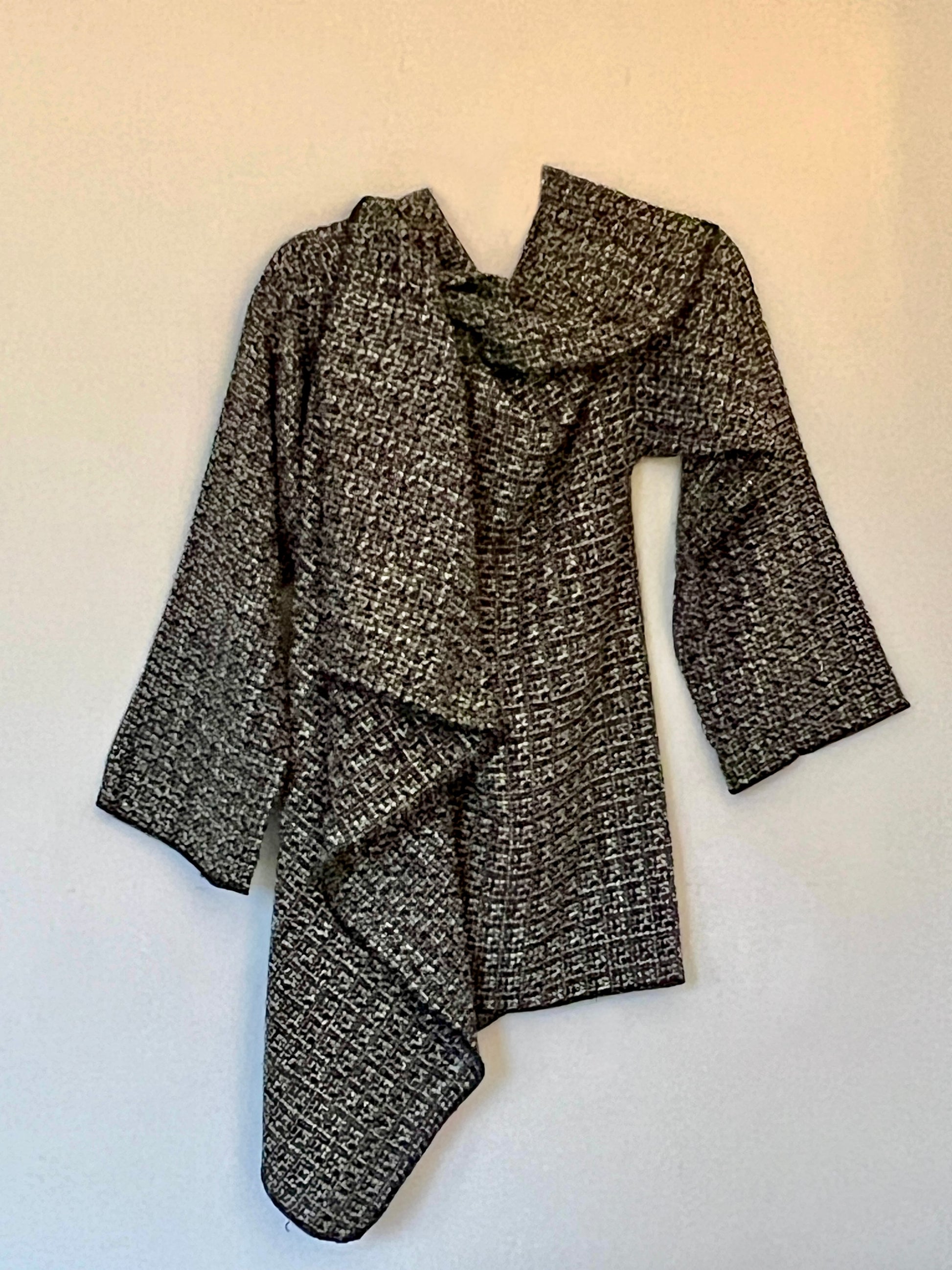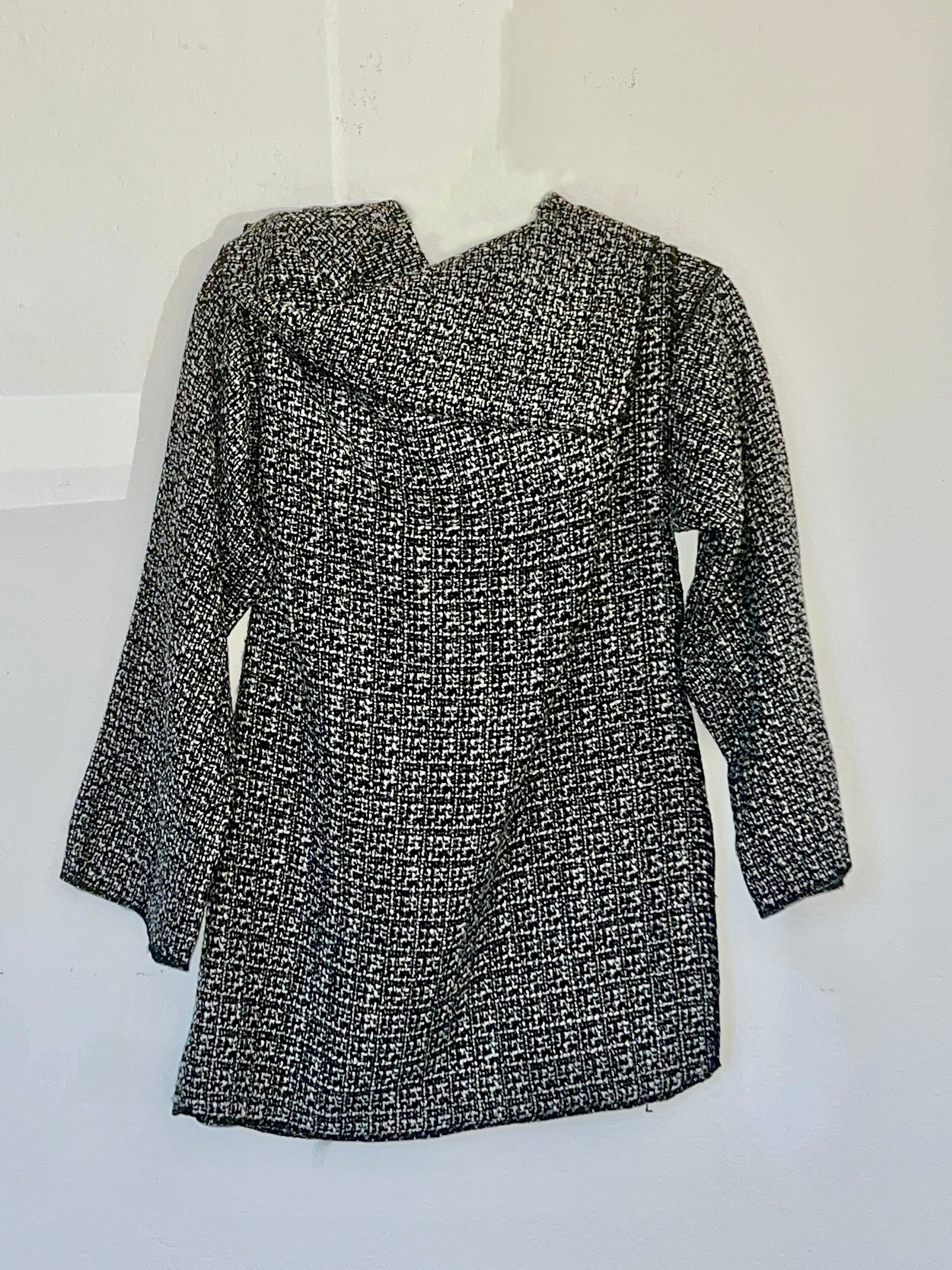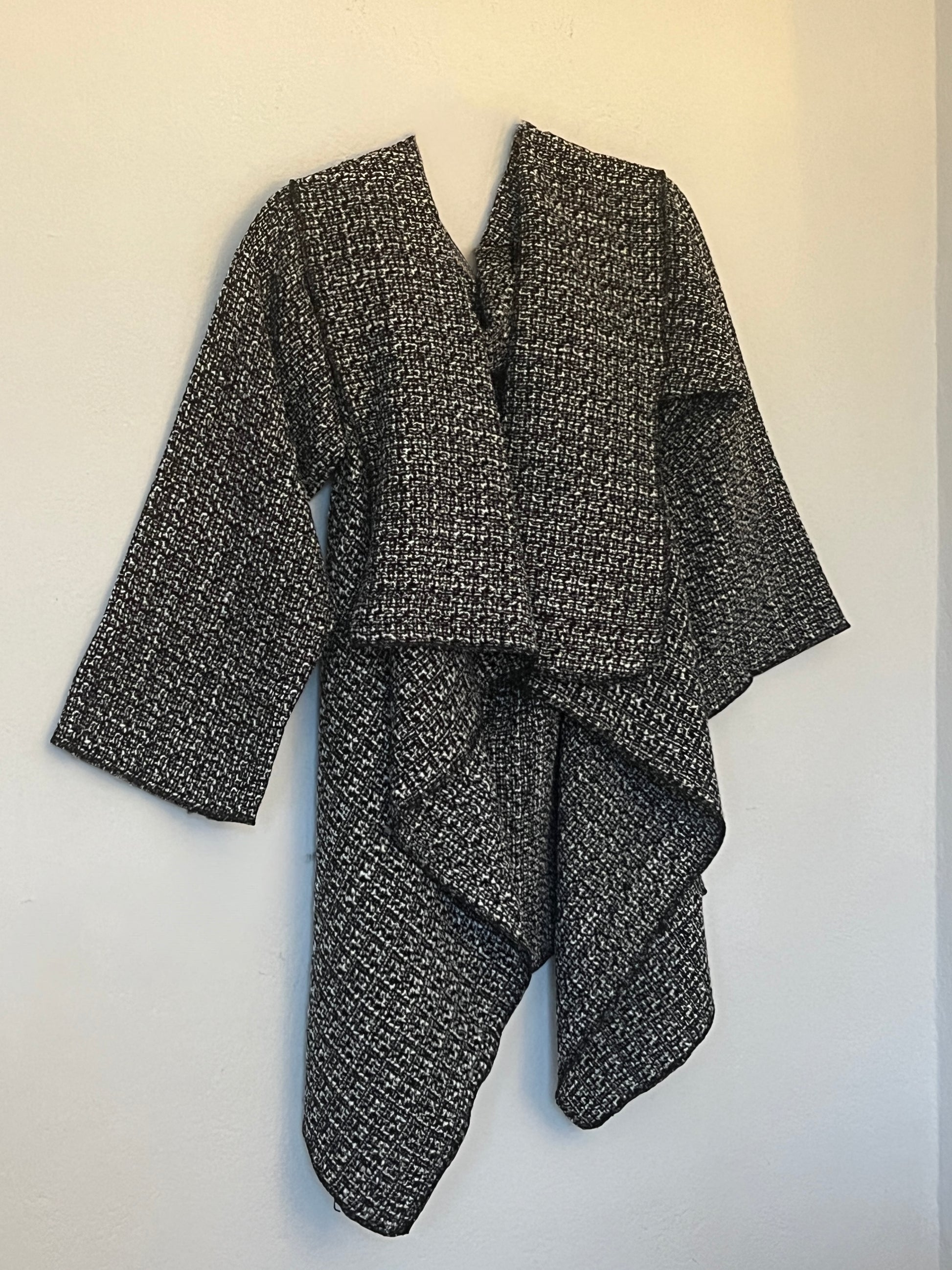 Abrigo en tweed gris oscuro jaspeado, con una textura rica y consistente. El tejido tiene más peso y estructura, lo que aporta presencia y un drapeado firme pero fluido, realzando las líneas del diseño. Una pieza elegante y atemporal, ideal para looks urbanos y comodos. Si buscas un aliado que te acompañe todo el dia en un clima otoño/primavera este es tu abrigo.
