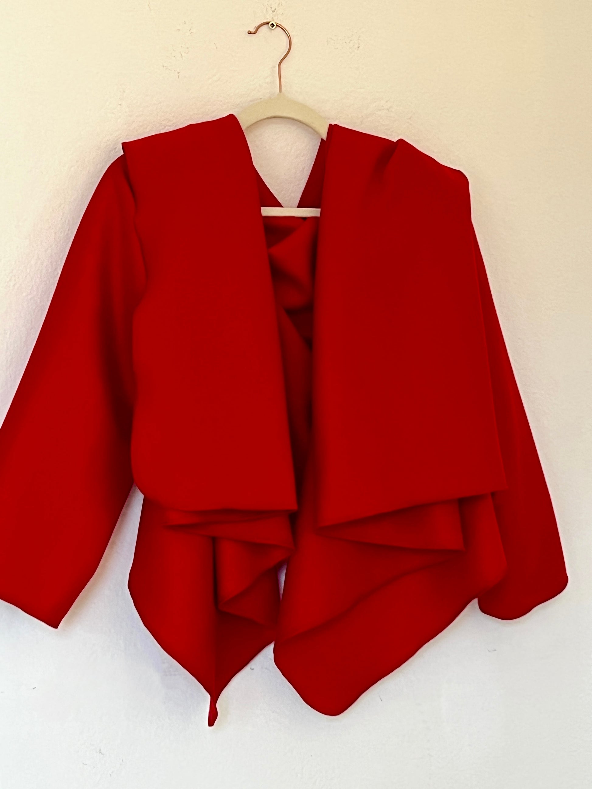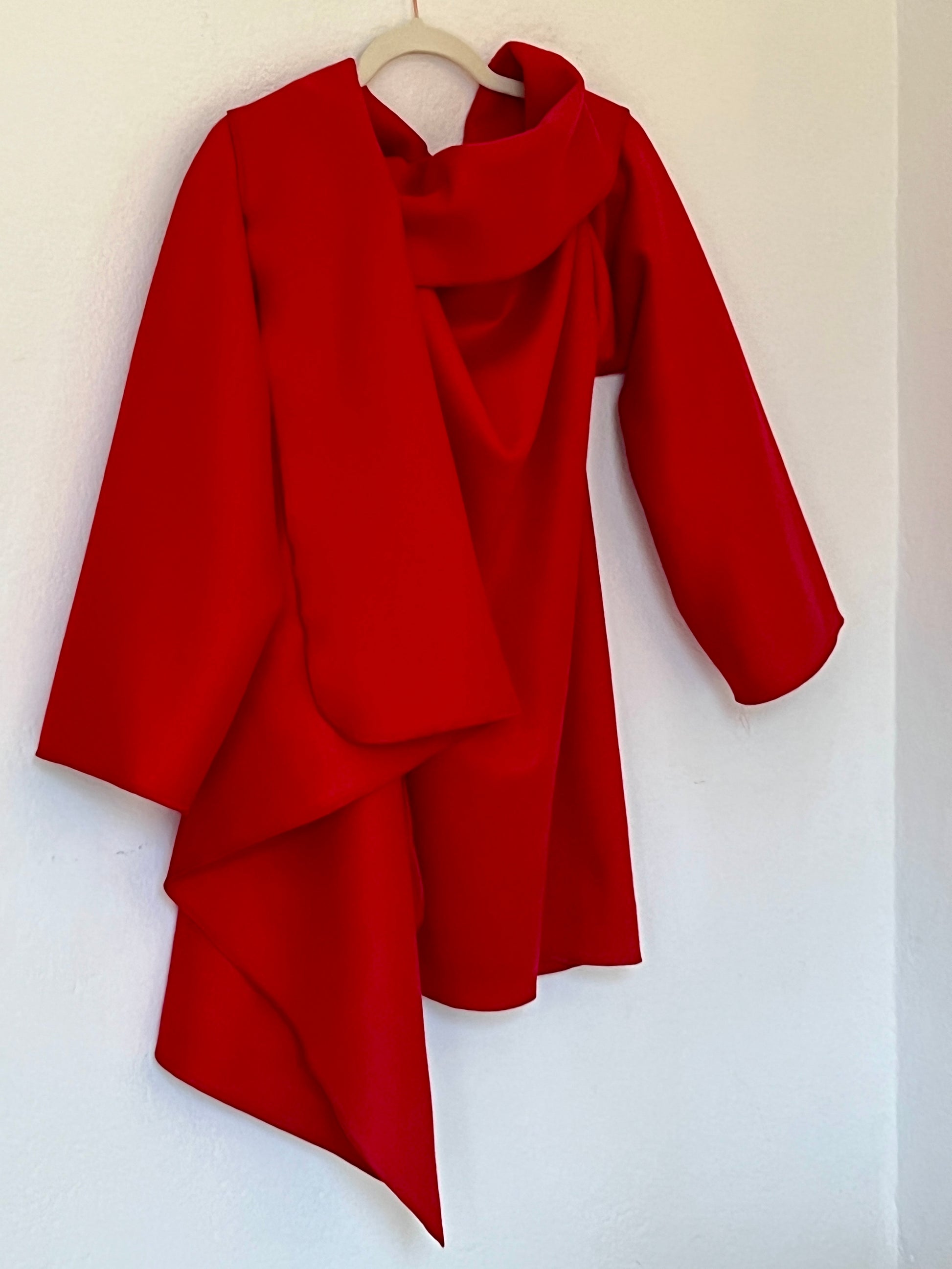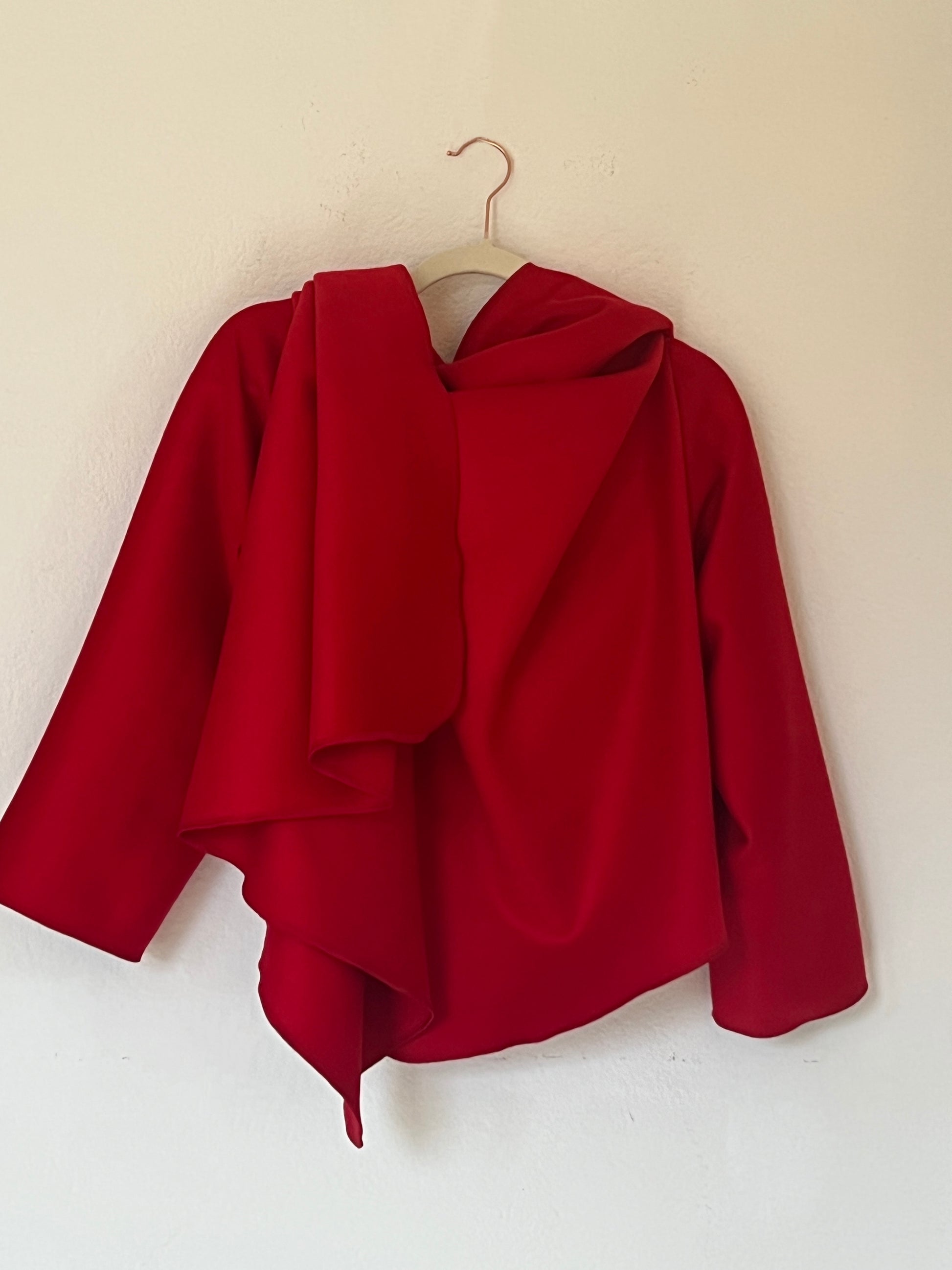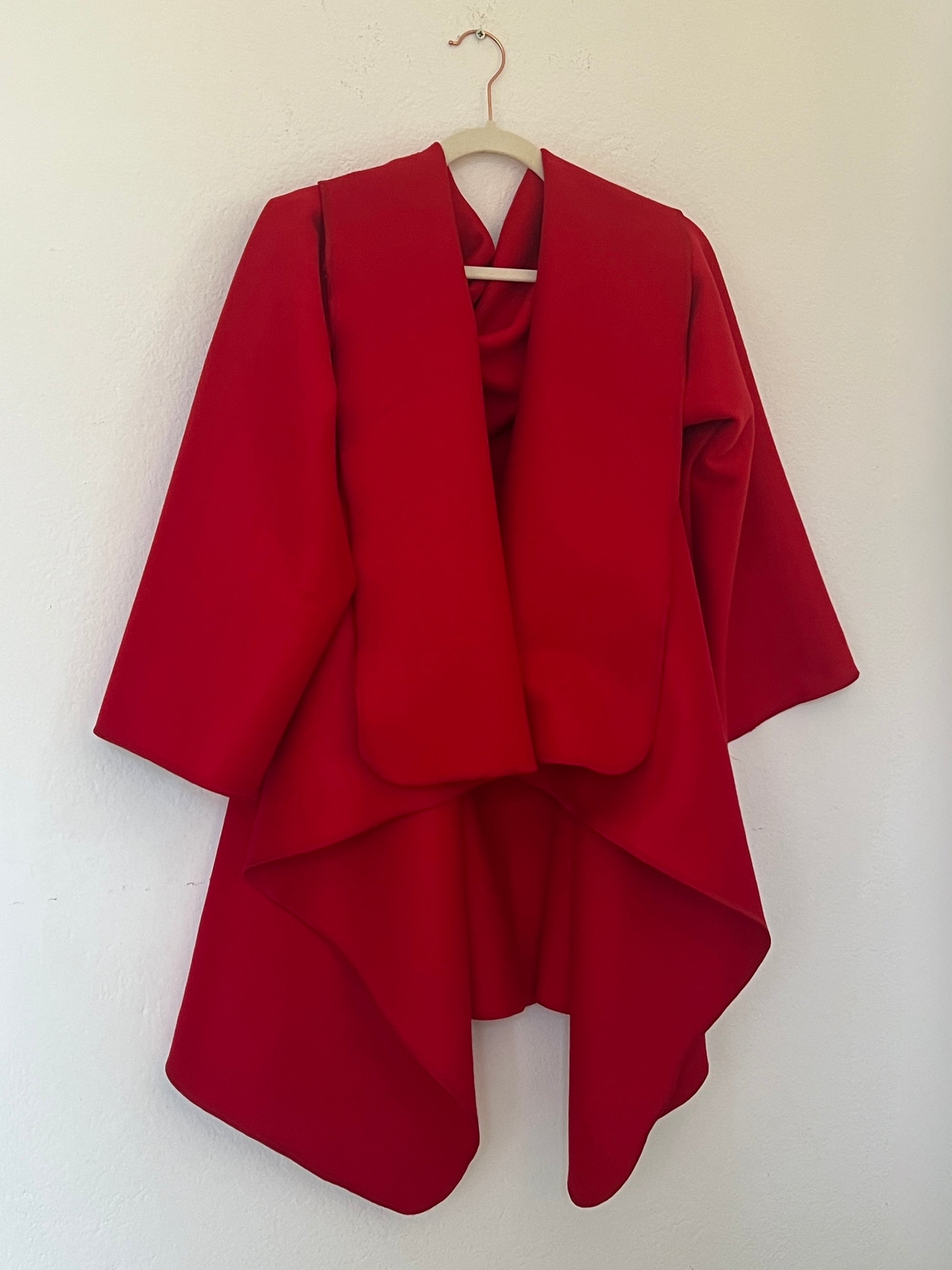 Abrigo en rojo intenso, con un diseño envolvente y una silueta que cae con elegancia. Su corte abierto y asimétrico crea un juego de volúmenes muy favorecedor, aportando movimiento y presencia sin sentirse rígido. Es una pieza protagonista: levanta cualquier look con solo ponerlo encima, tanto con vaqueros como con prendas más formales. Ideal para días frescos, cuando querés color, estilo y comodidad en una sola prenda.