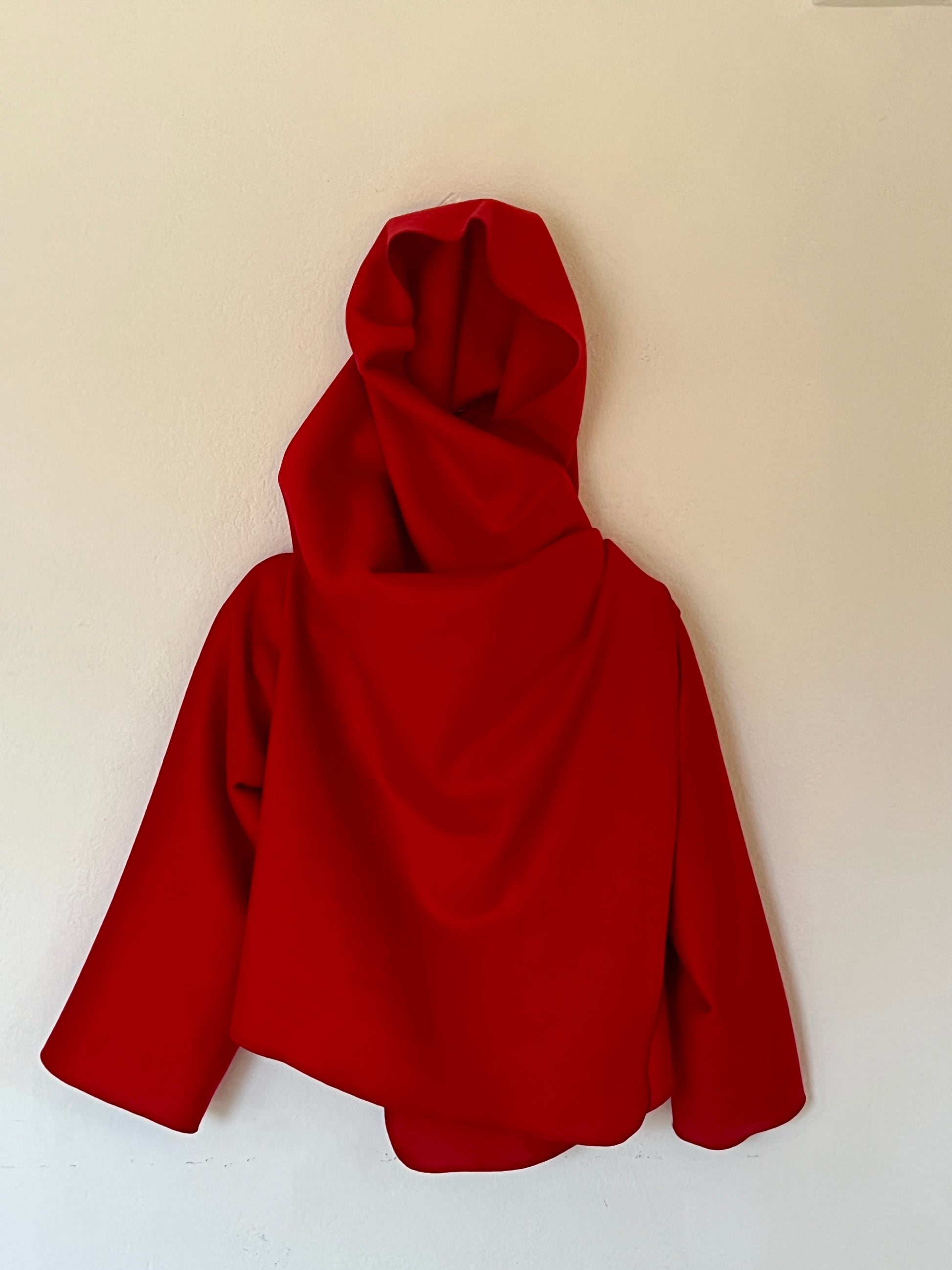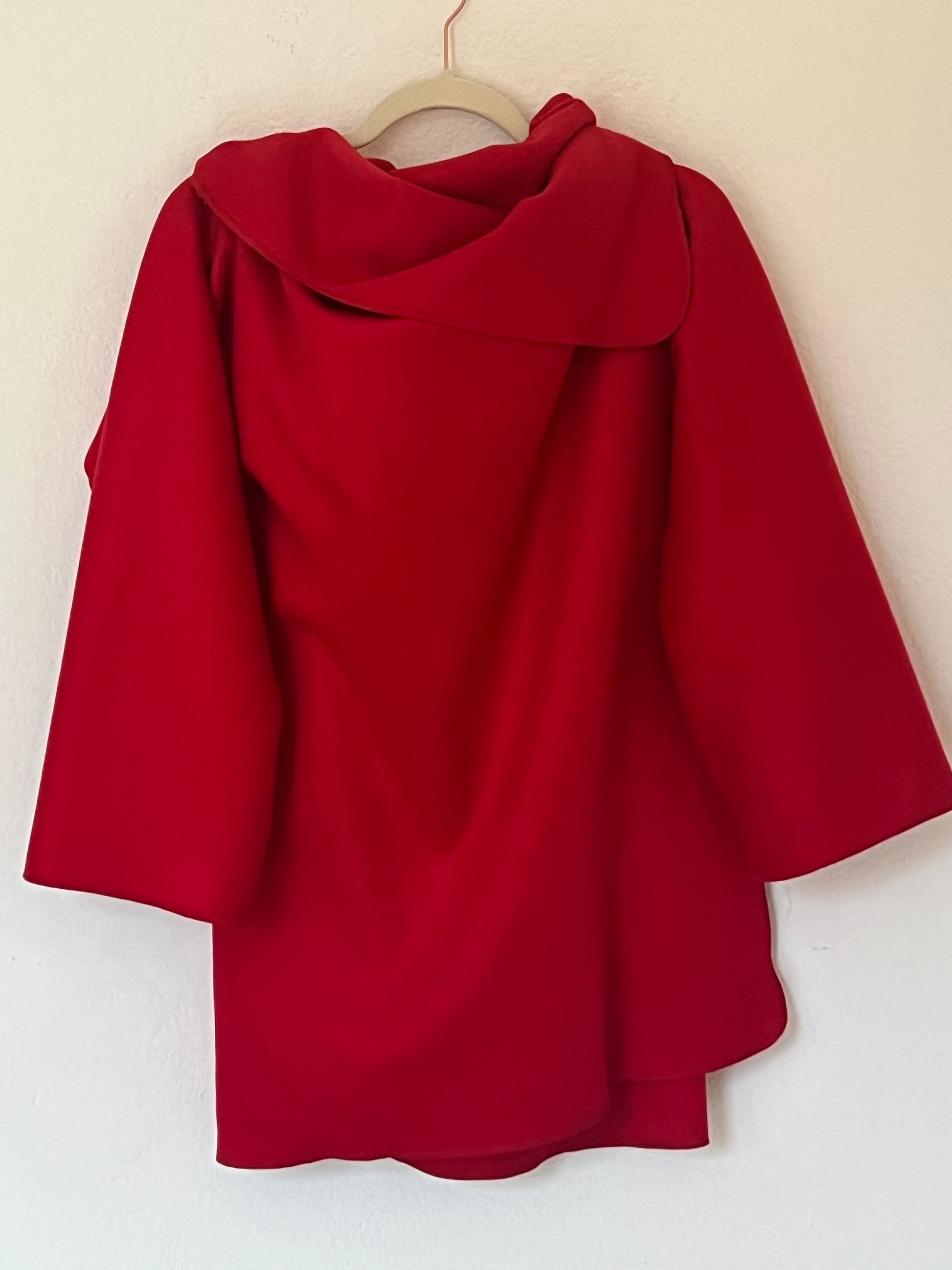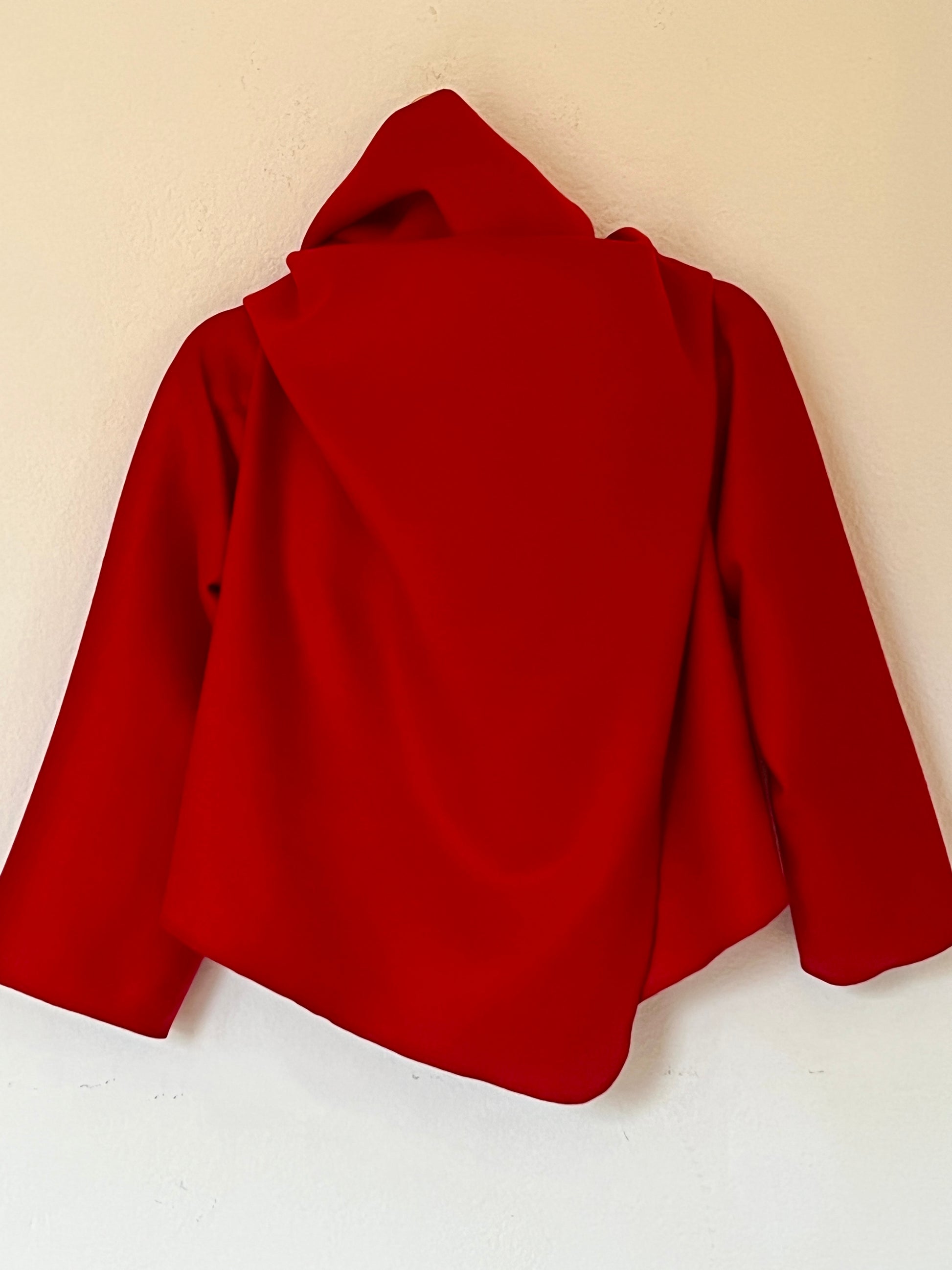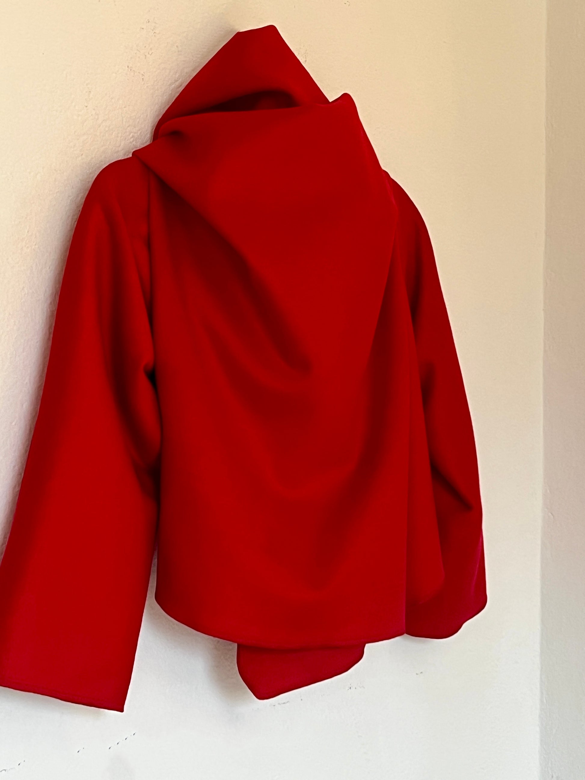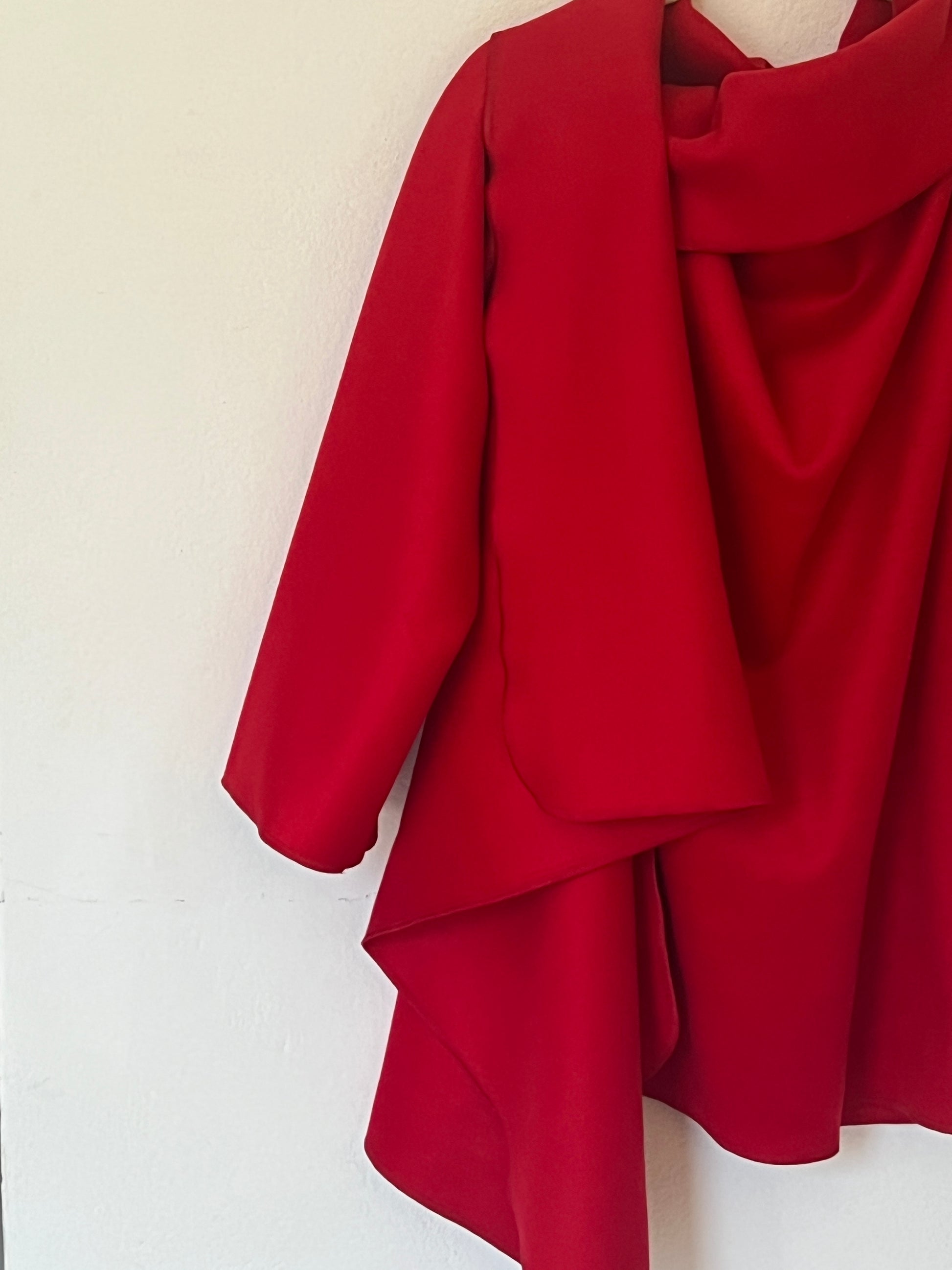Abrigo en rojo intenso, con un diseño envolvente y una silueta que cae con elegancia. Su corte abierto y asimétrico crea un juego de volúmenes muy favorecedor, aportando movimiento y presencia sin sentirse rígido. Es una pieza protagonista: levanta cualquier look con solo ponerlo encima, tanto con vaqueros como con prendas más formales. Ideal para días frescos, cuando querés color, estilo y comodidad en una sola prenda.