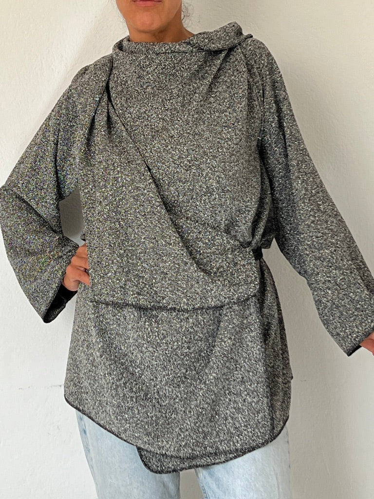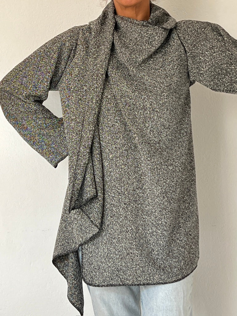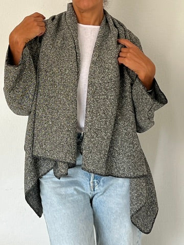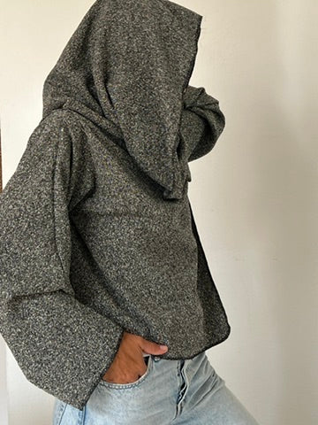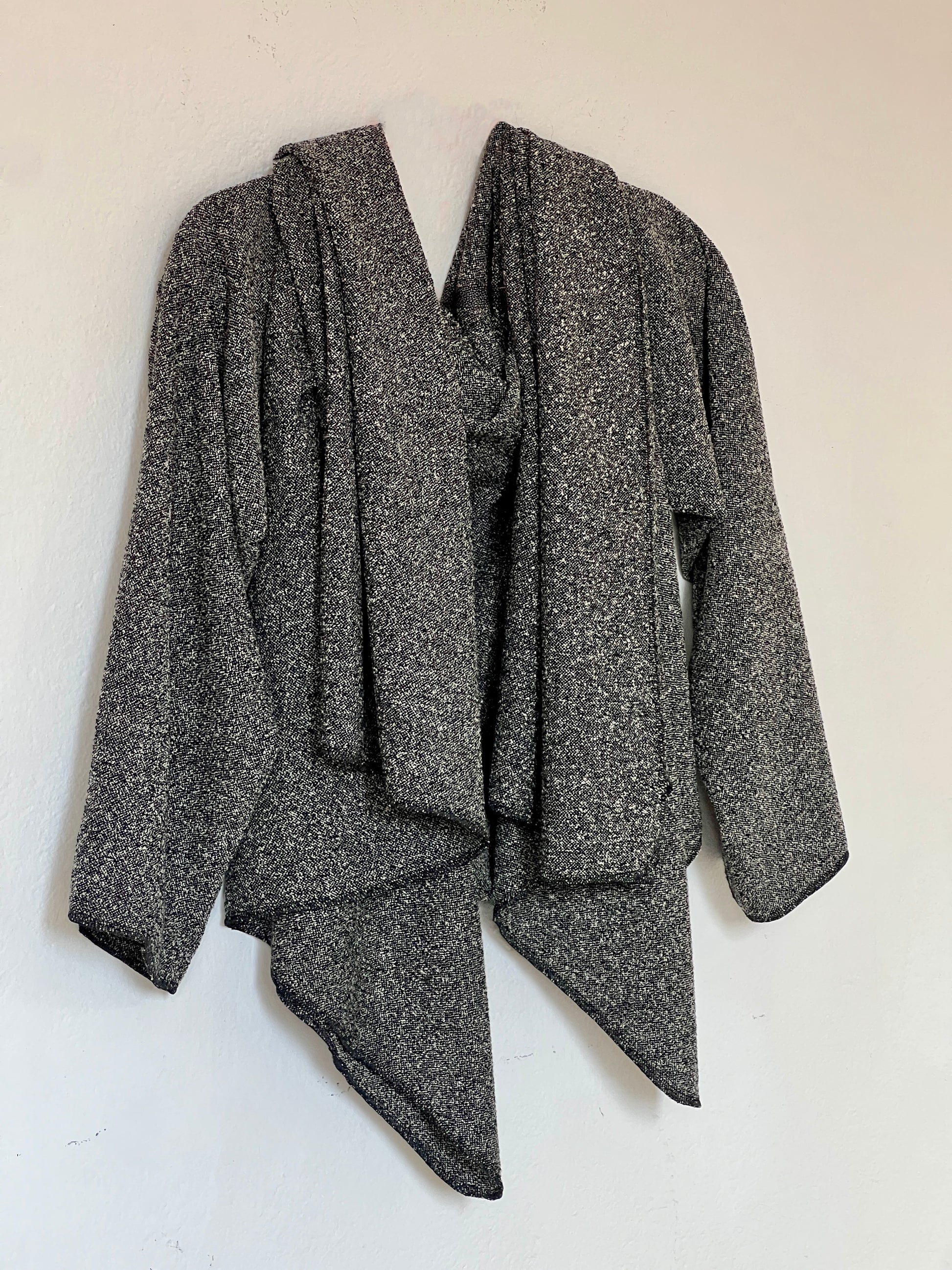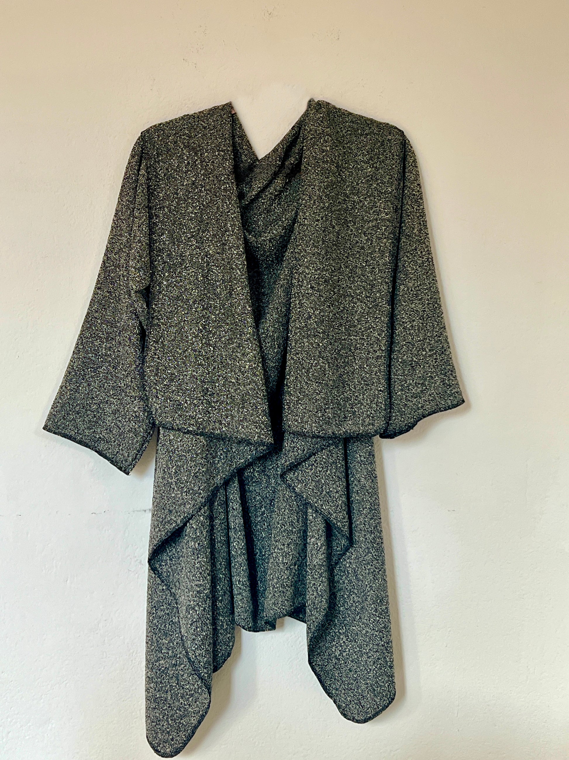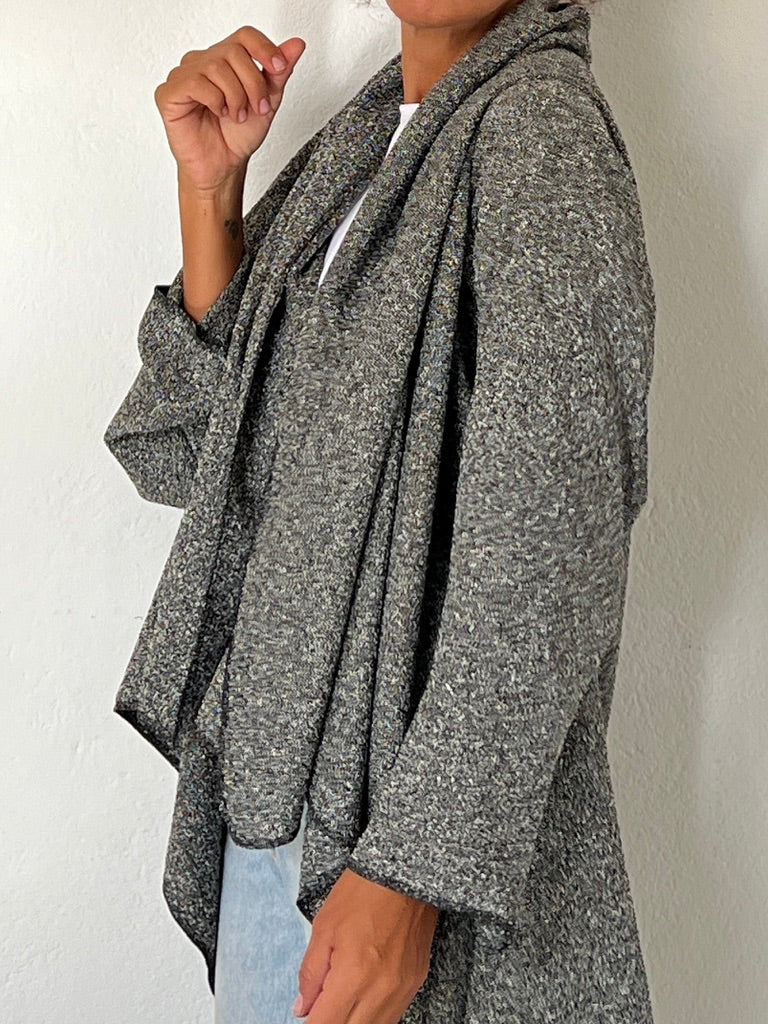 Abrigo en gris jaspeado con microtextura moteada, suave y con cuerpo ligero. El tejido tiene un efecto tipo tweed que aporta profundidad sin peso. Su caída flexible y natural crea un drapeado relajado y muy favorecedor, ideal para un look moderno y casual-chic.