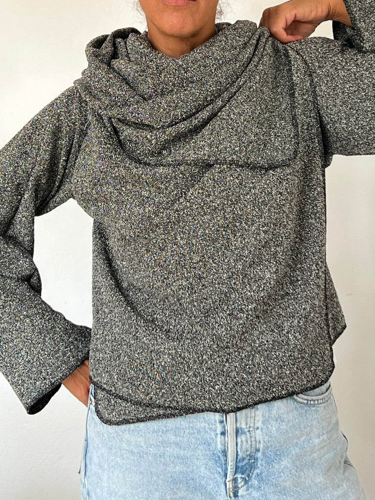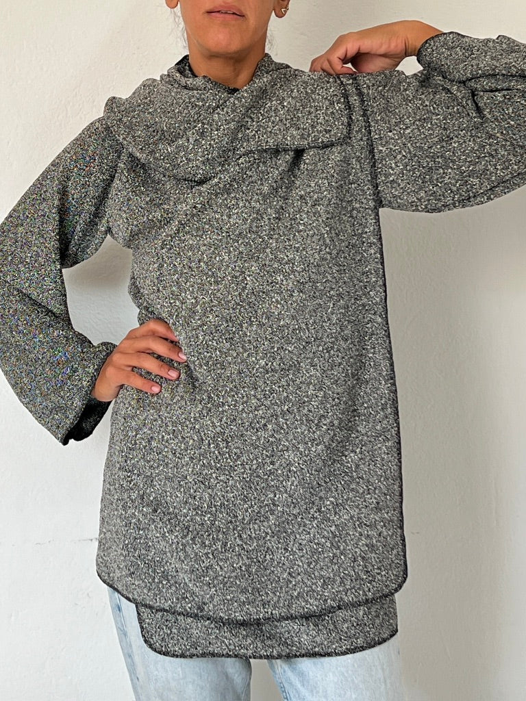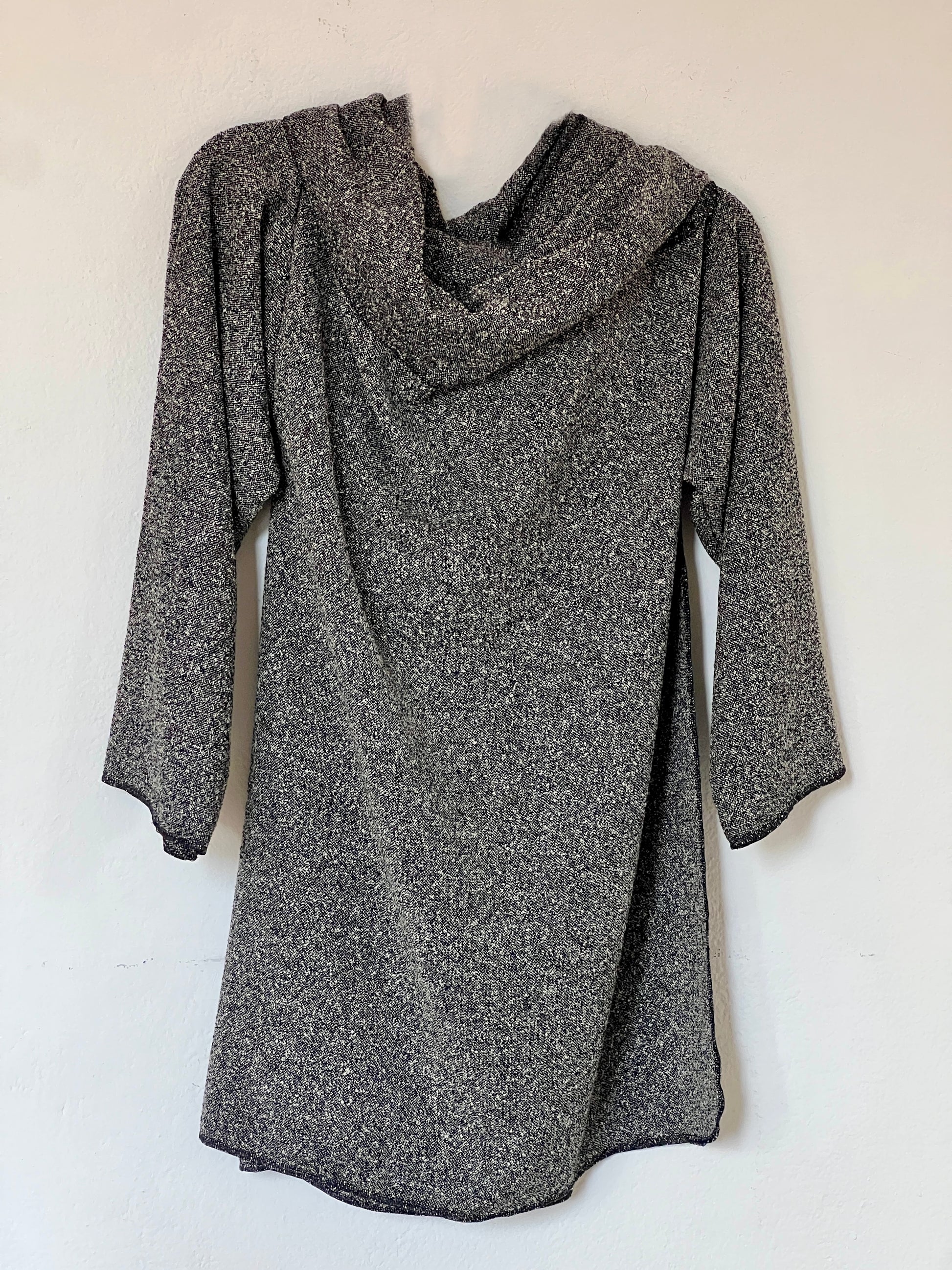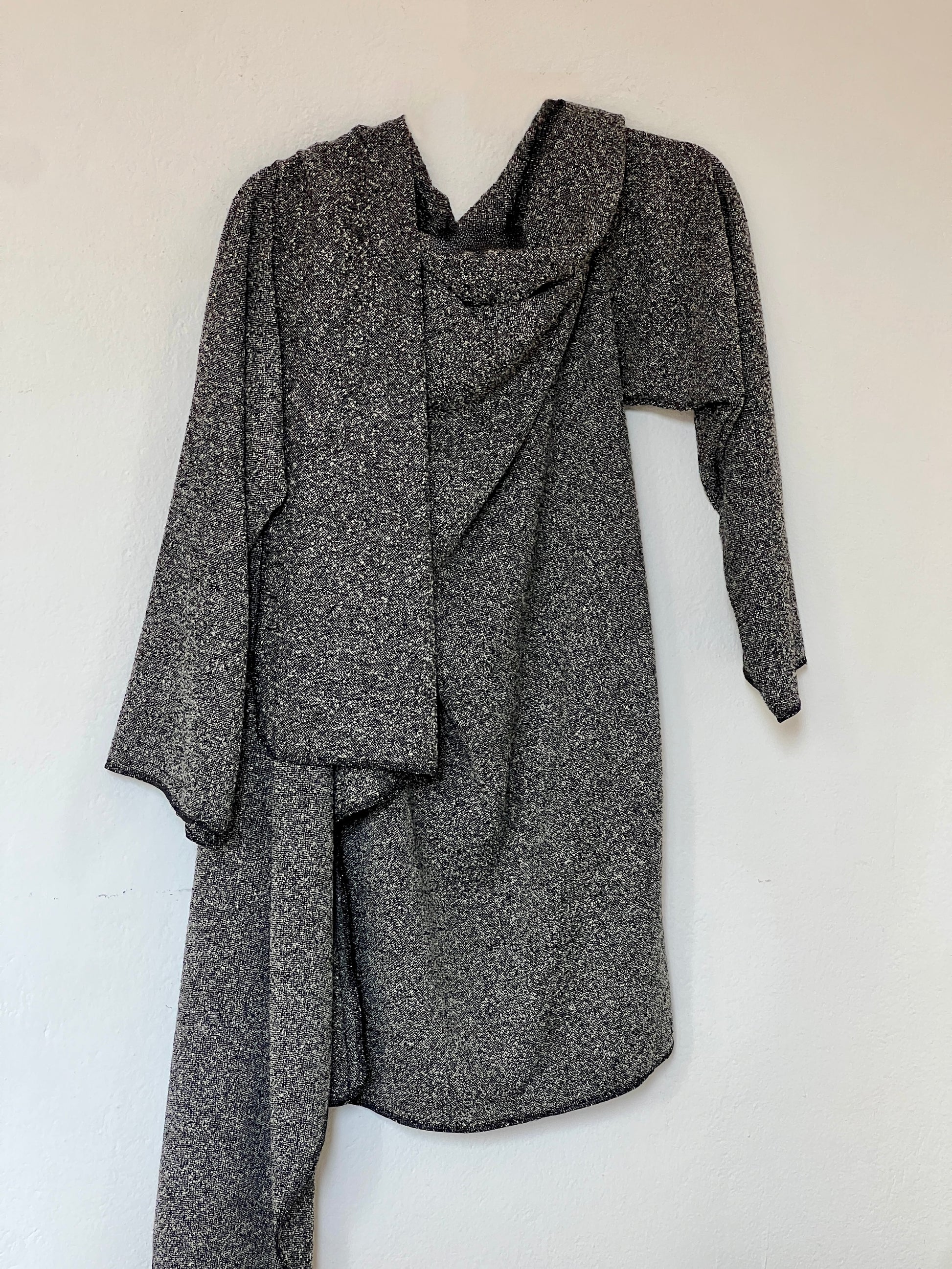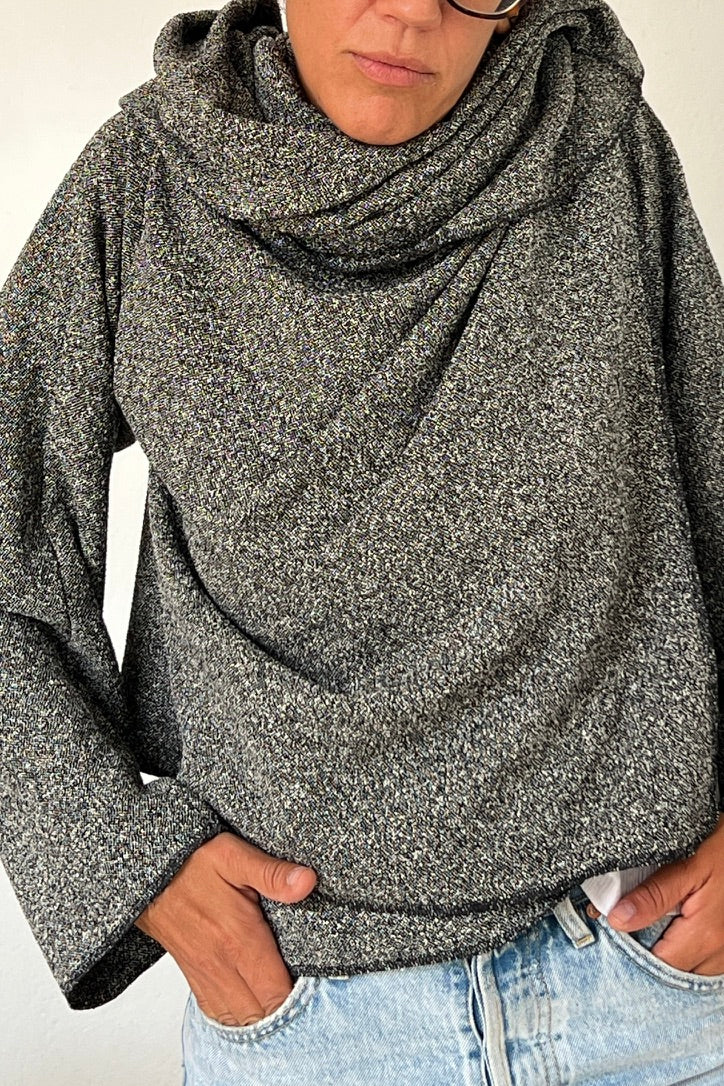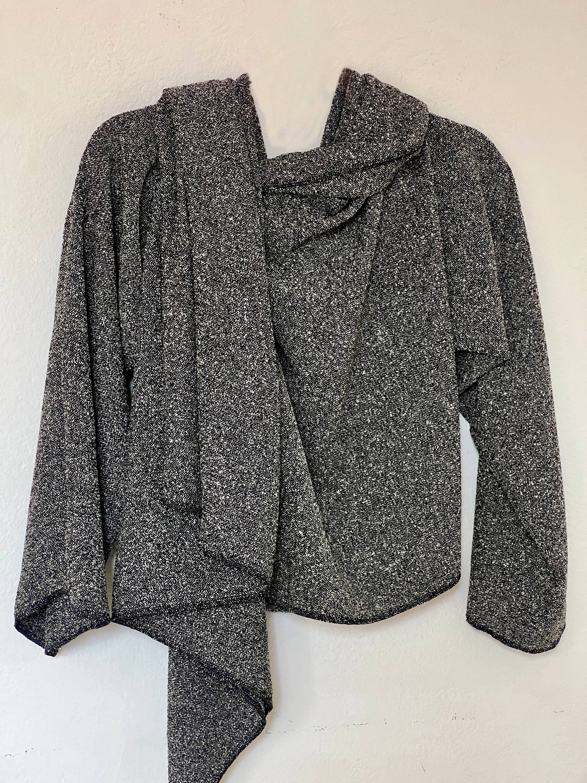 Abrigo en gris jaspeado con microtextura moteada, suave y con cuerpo ligero. El tejido tiene un efecto tipo tweed que aporta profundidad sin peso. Su caída flexible y natural crea un drapeado relajado y muy favorecedor, ideal para un look moderno y casual-chic.