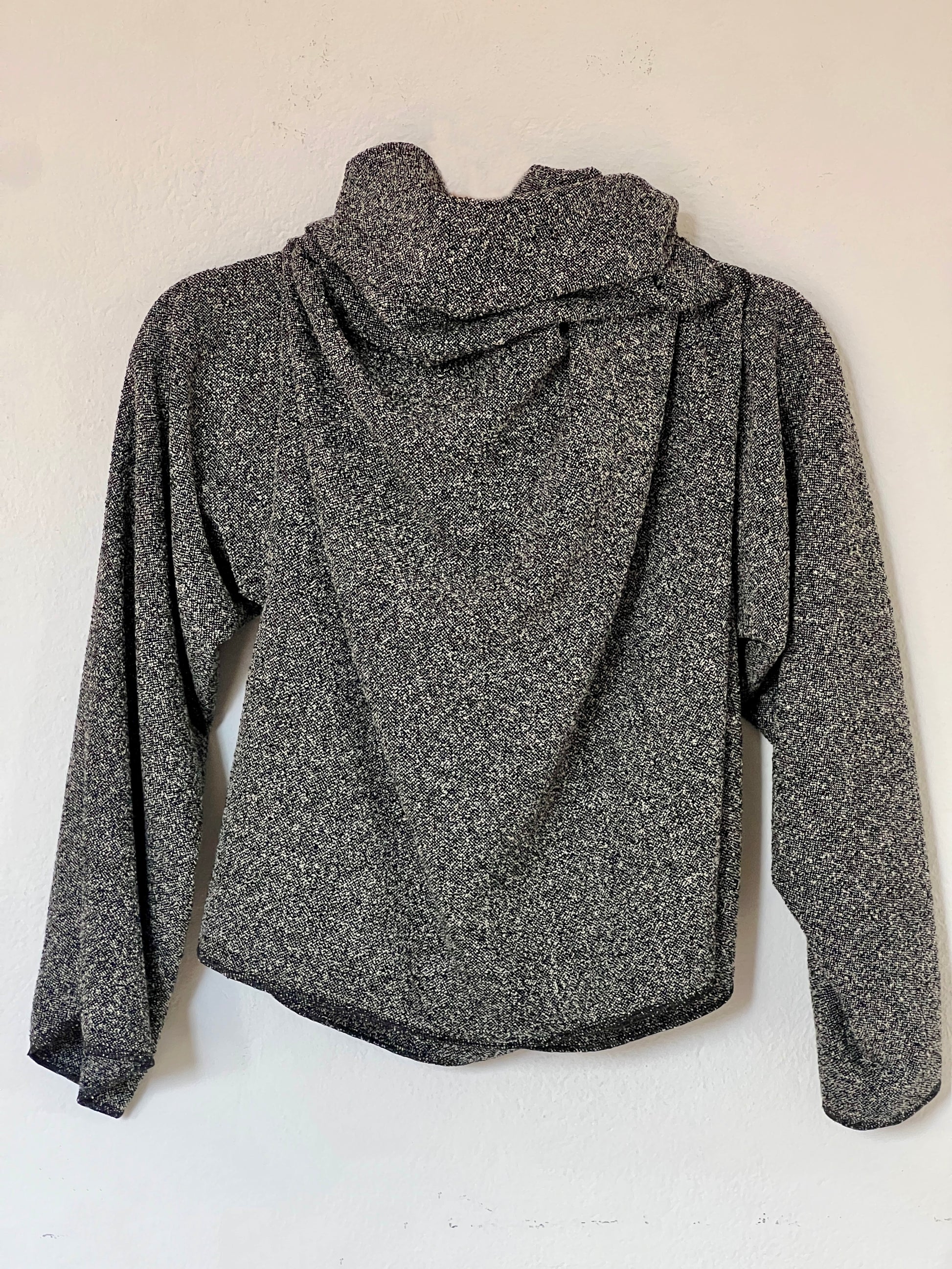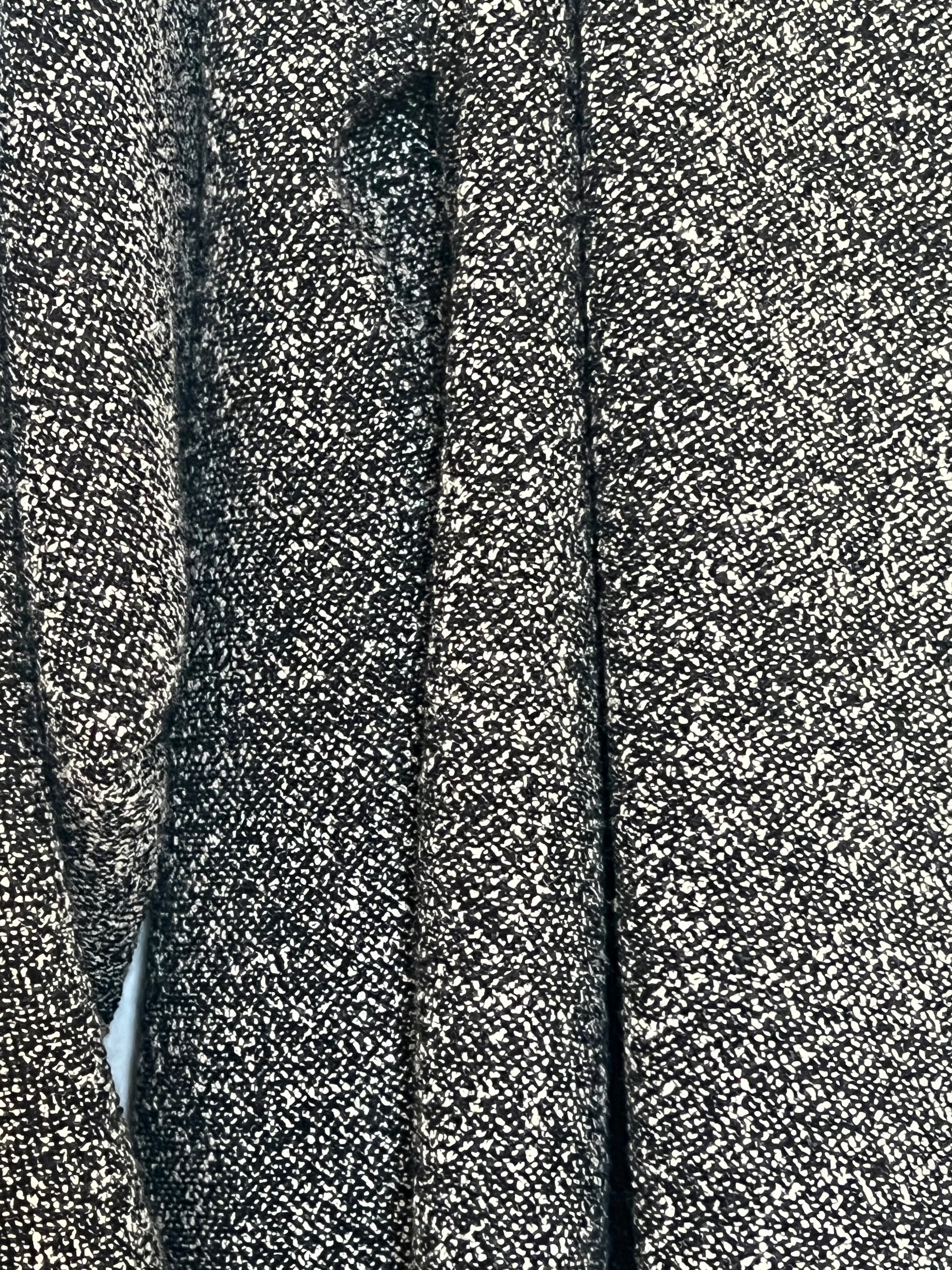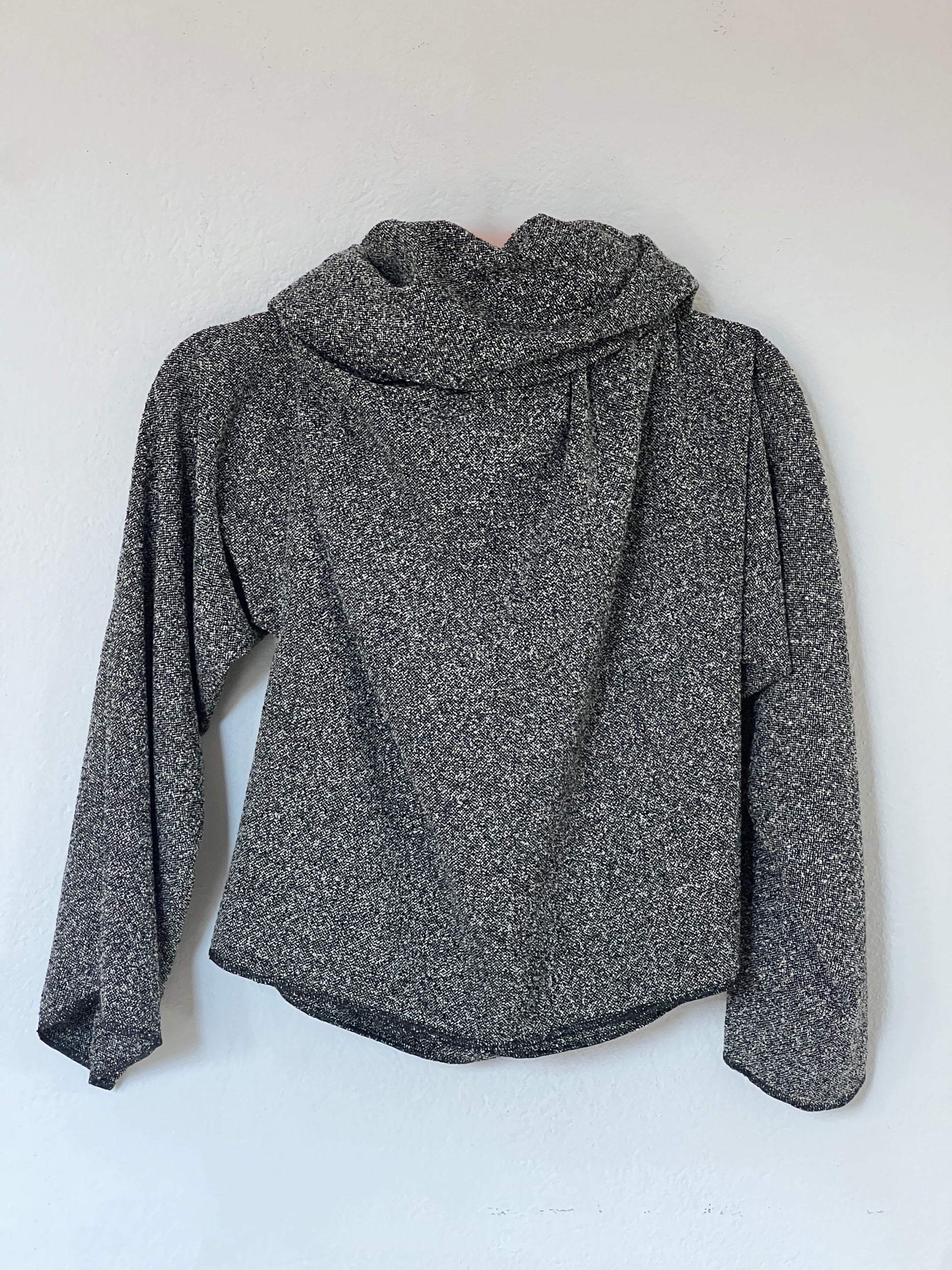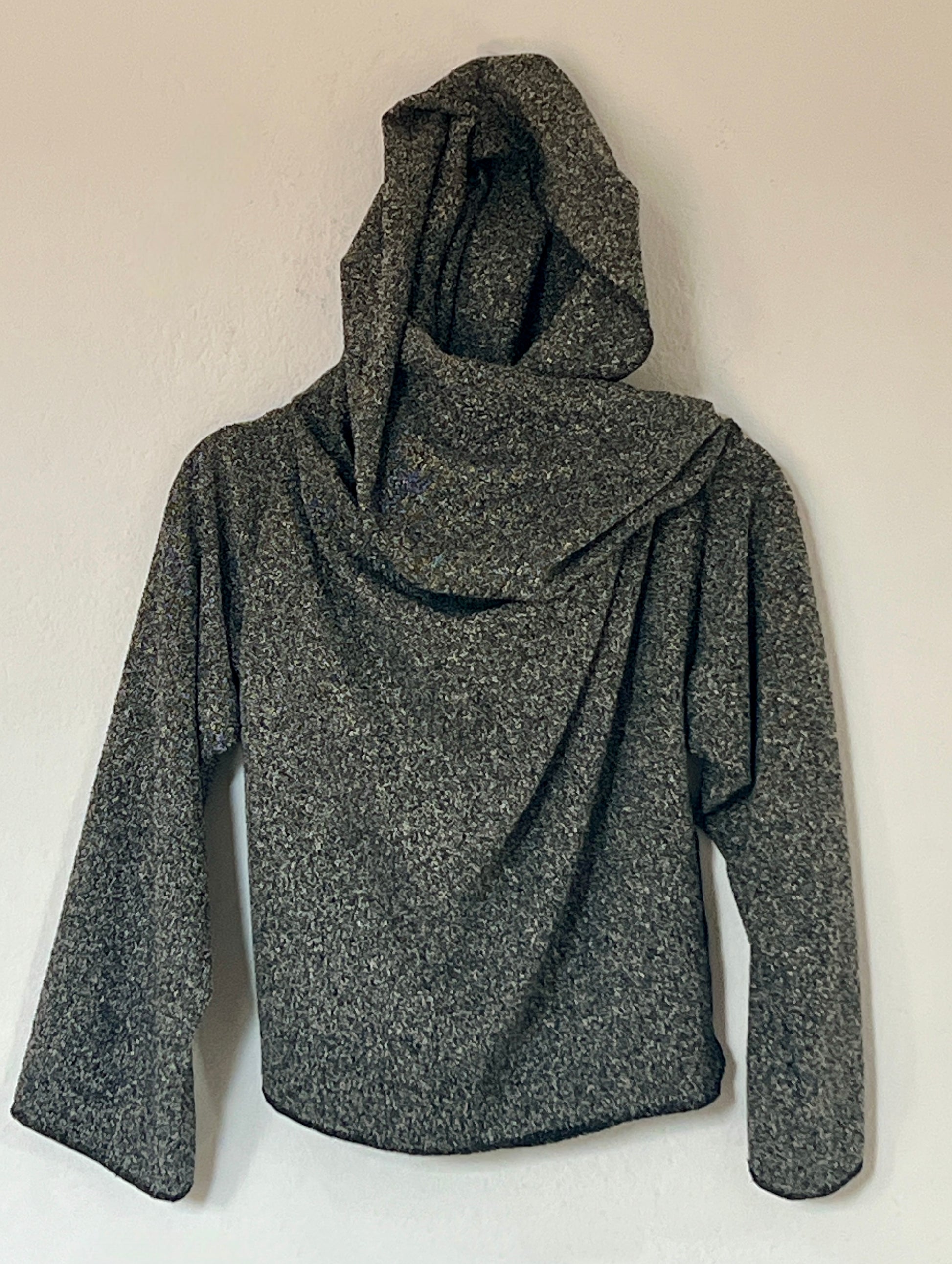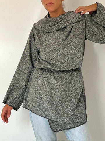 Abrigo en gris jaspeado con microtextura moteada, suave y con cuerpo ligero. El tejido tiene un efecto tipo tweed que aporta profundidad sin peso. Su caída flexible y natural crea un drapeado relajado y muy favorecedor, ideal para un look moderno y casual-chic.