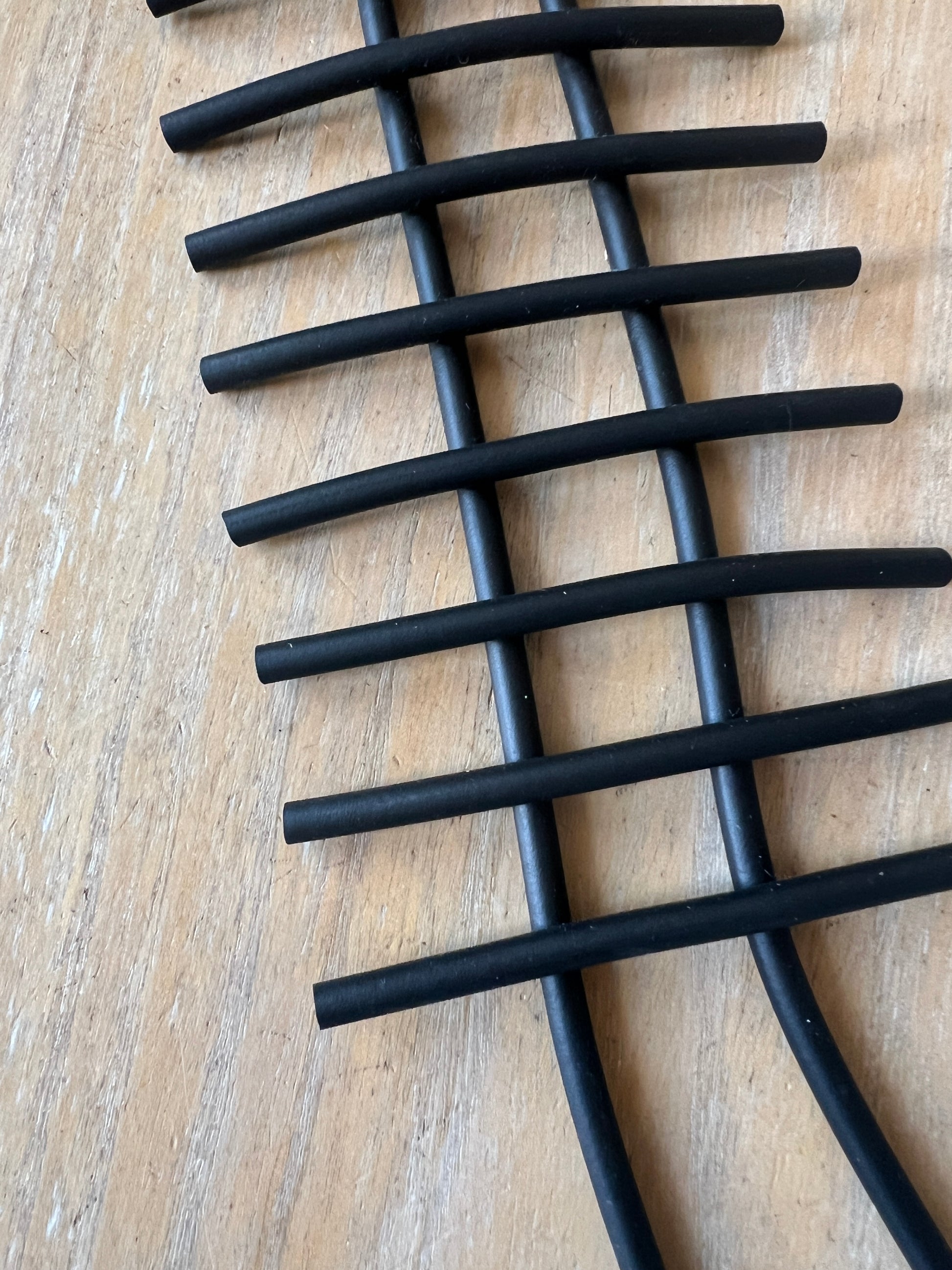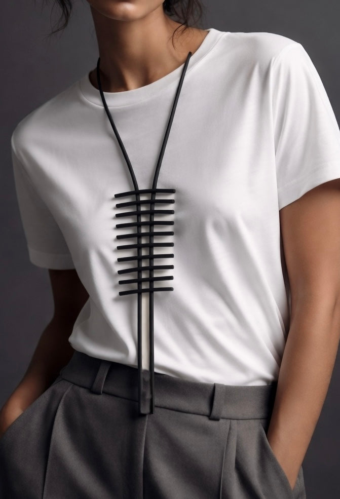 Collar minimalista de goma negra, de estética gráfica, con un diseño muy limpio y contemporáneo.