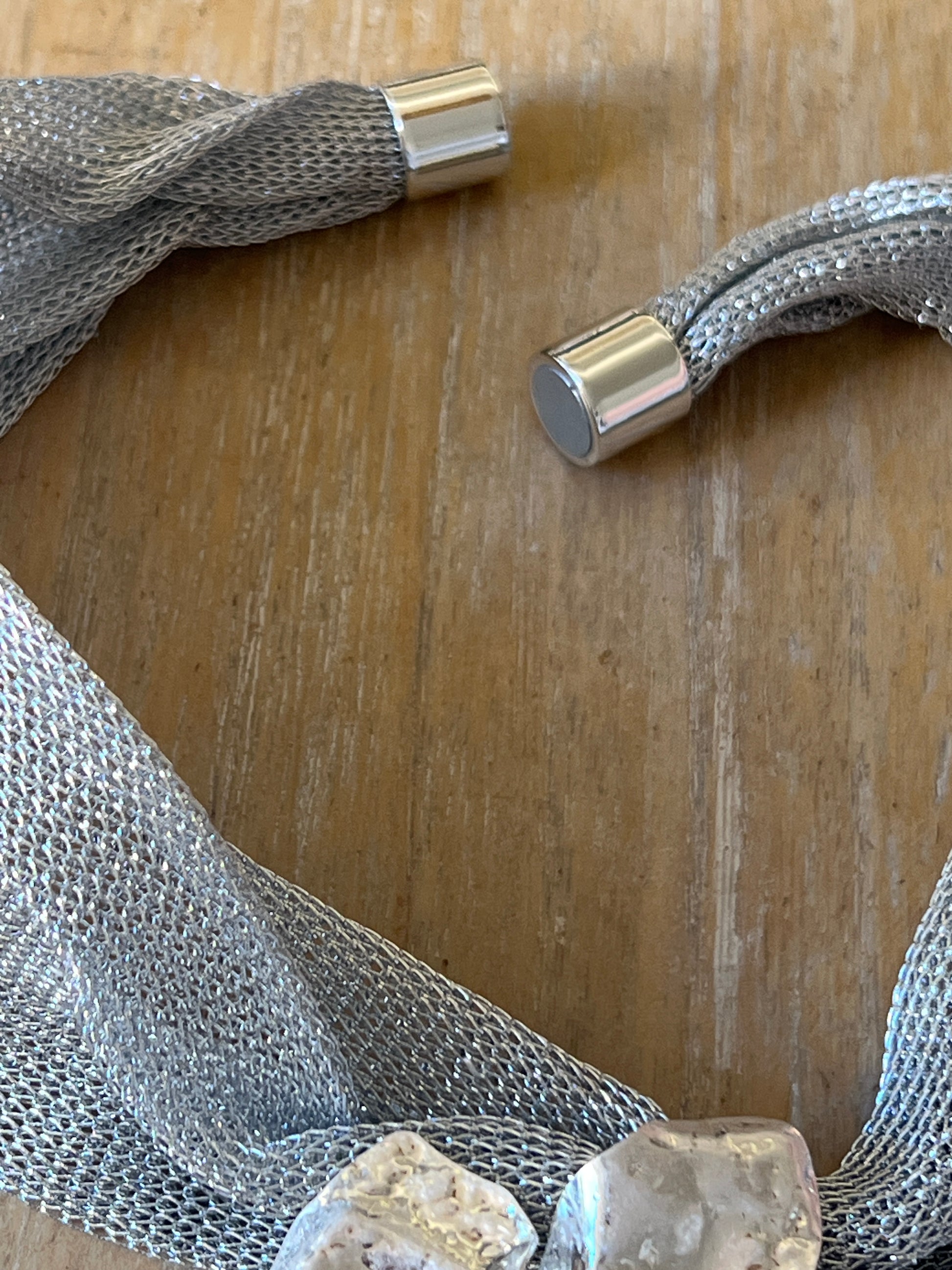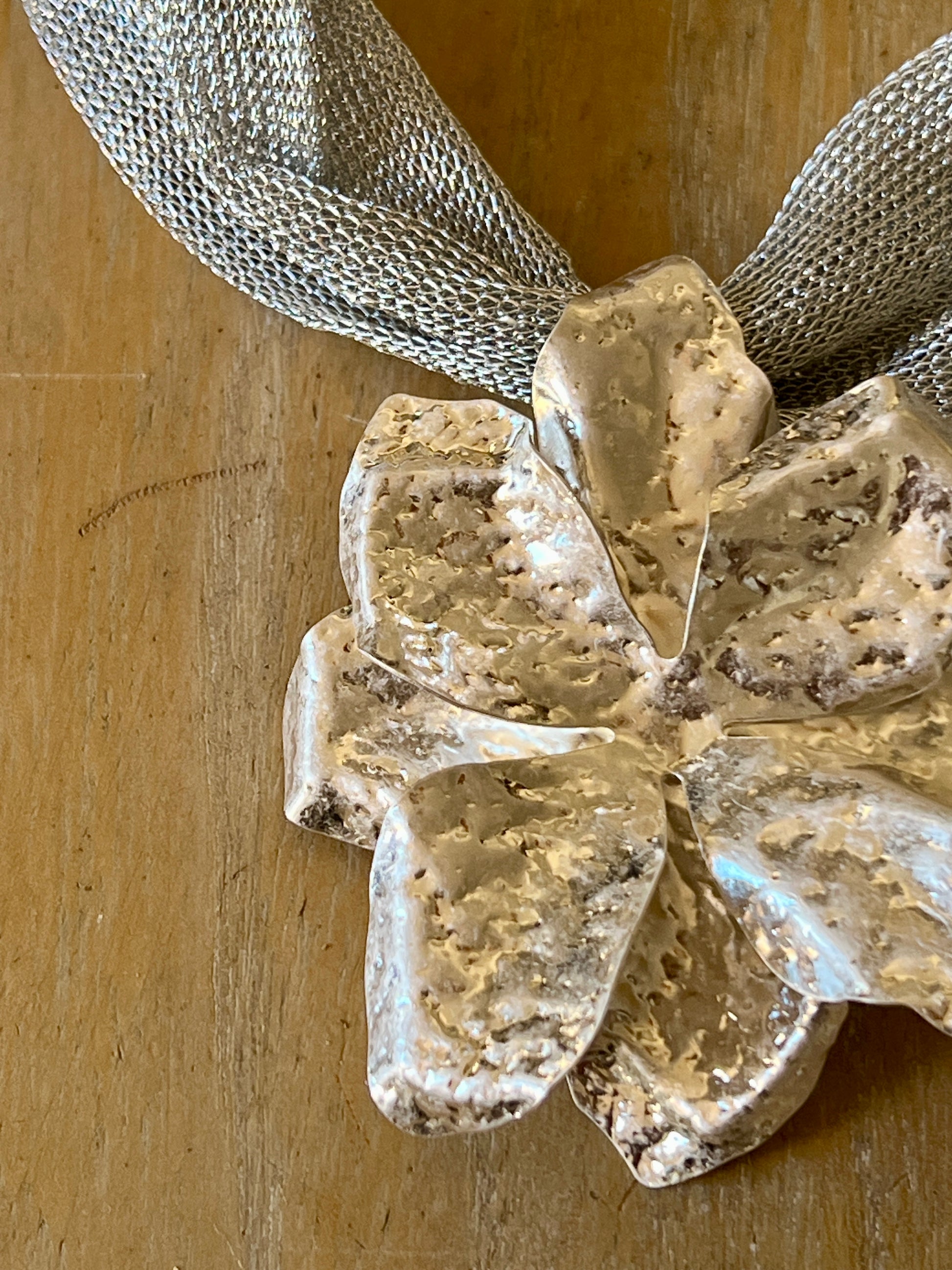 Collar elegante y luminoso, con una gran flor plateada como protagonista. La cinta que lo sostiene le da ese toque delicado. De aire femenino, delicado y sofisticado, pero a la vez actual y con carácter.