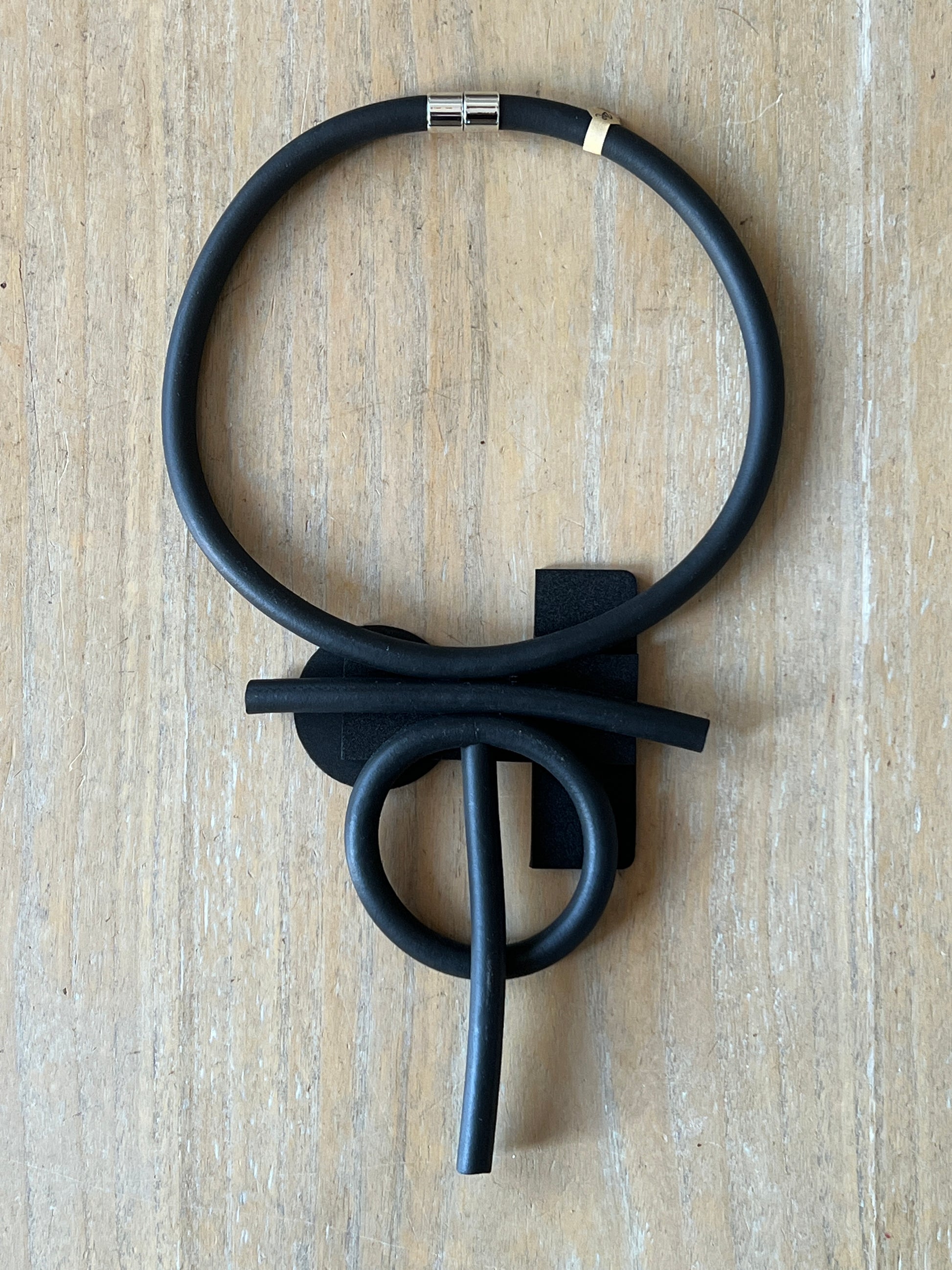 Collar de diseño contemporáneo y carácter escultórico, realizado en goma negra mate, de líneas limpias y volumen marcado.