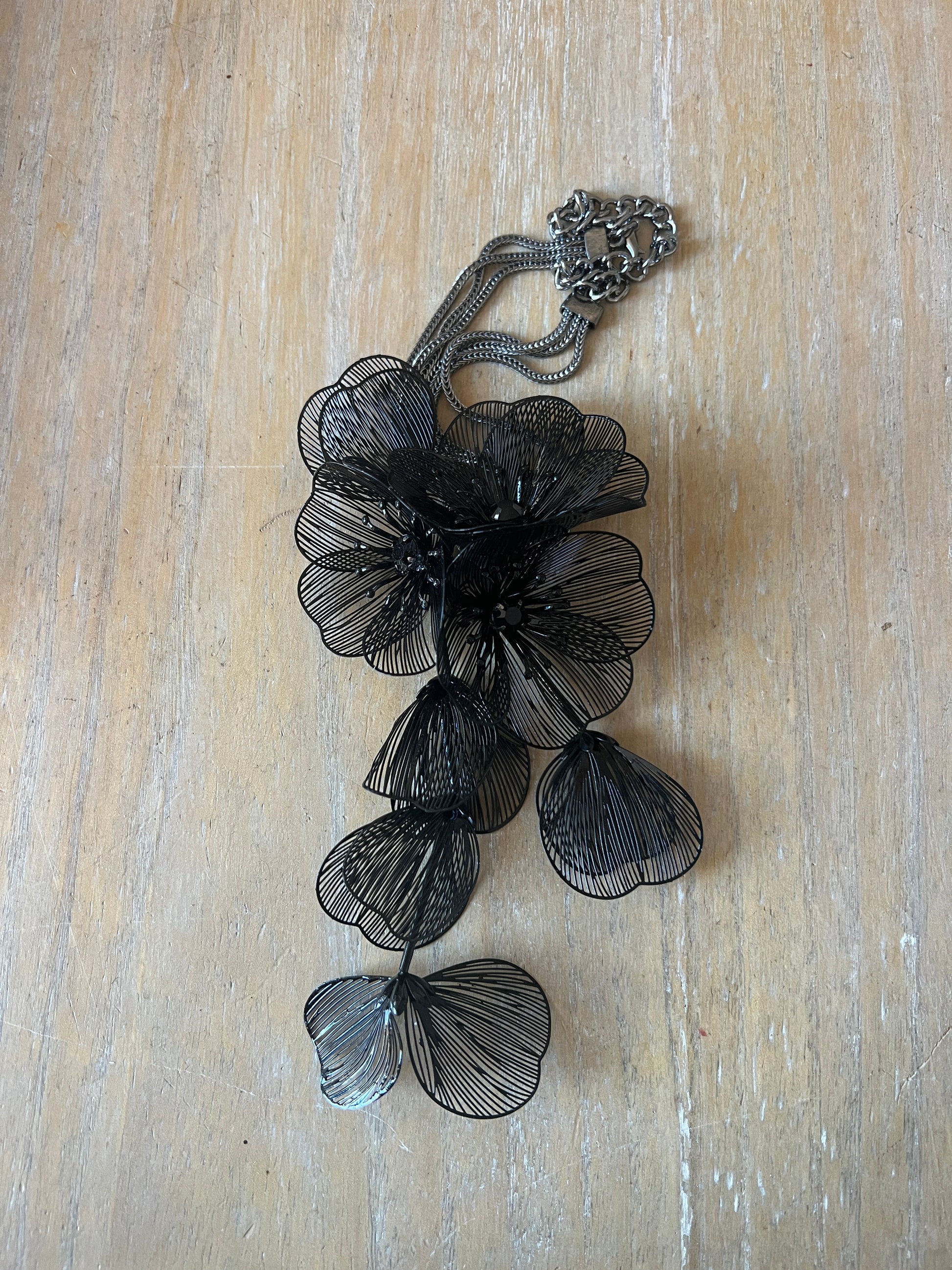 Collar de diseño floral , femenino y expresivo. Formado por una flor central de la que caen pétalos delicados y translúcidos, creando un efecto ligero y en cascada. El trabajo de líneas finas aporta textura y profundidad, gracias al efecto de las filigranas, mientras que el acabado oscuro le da un aire sofisticado y moderno.