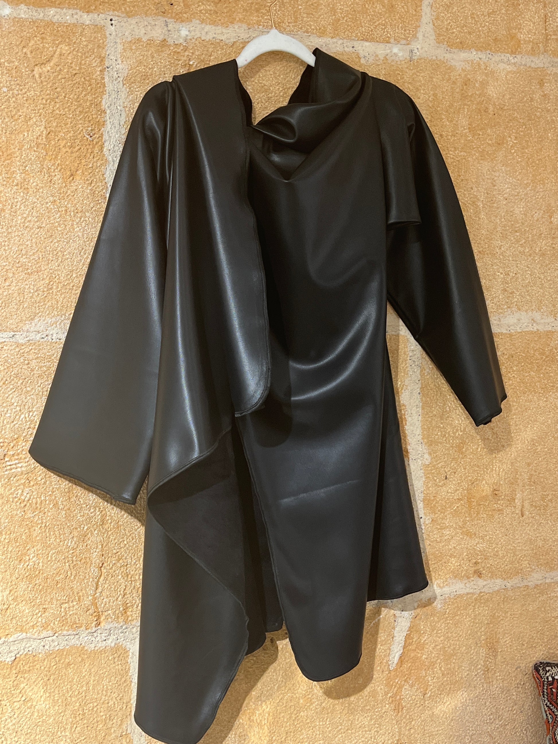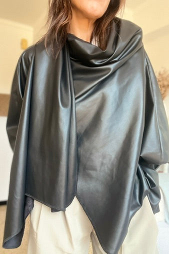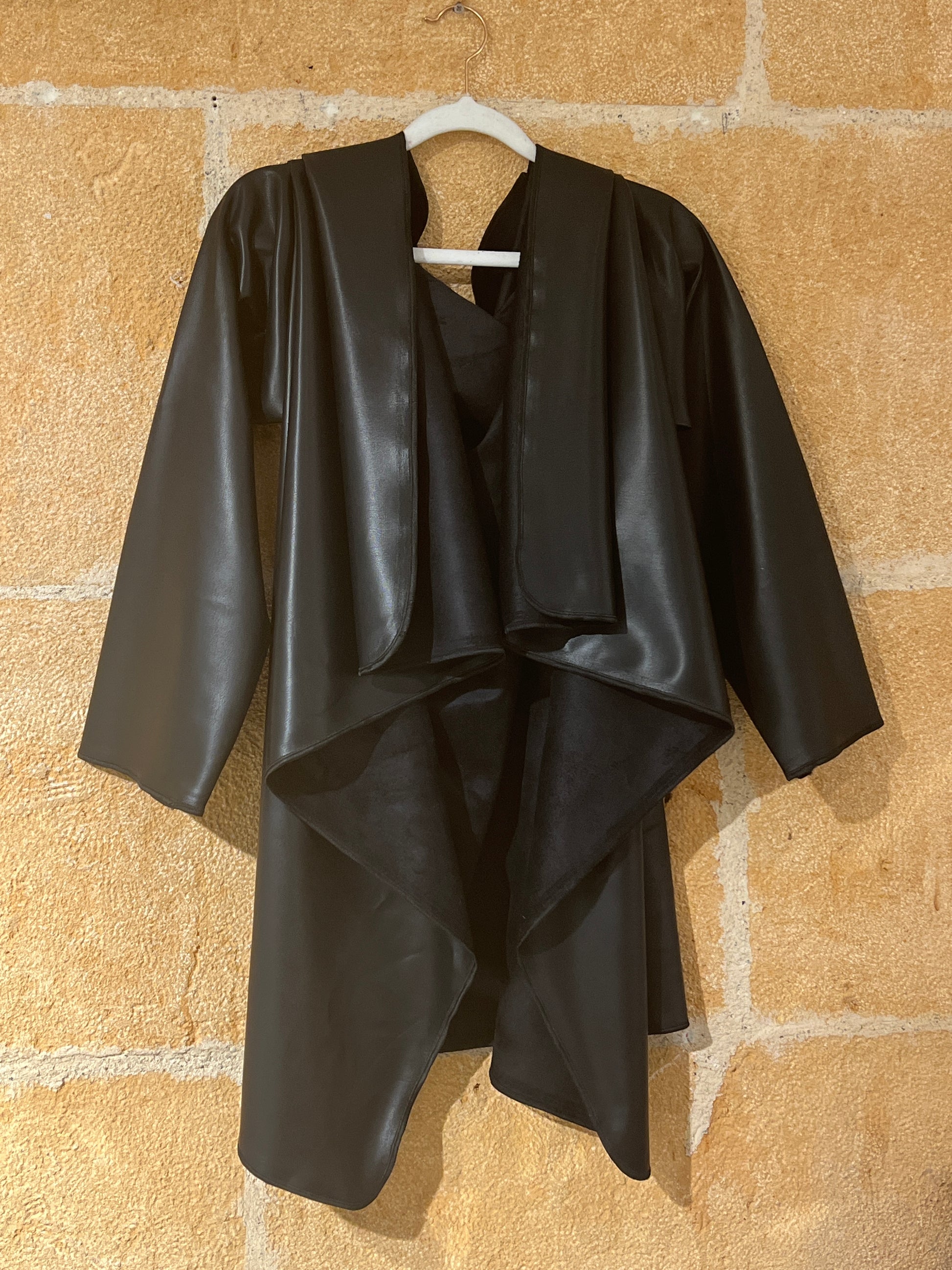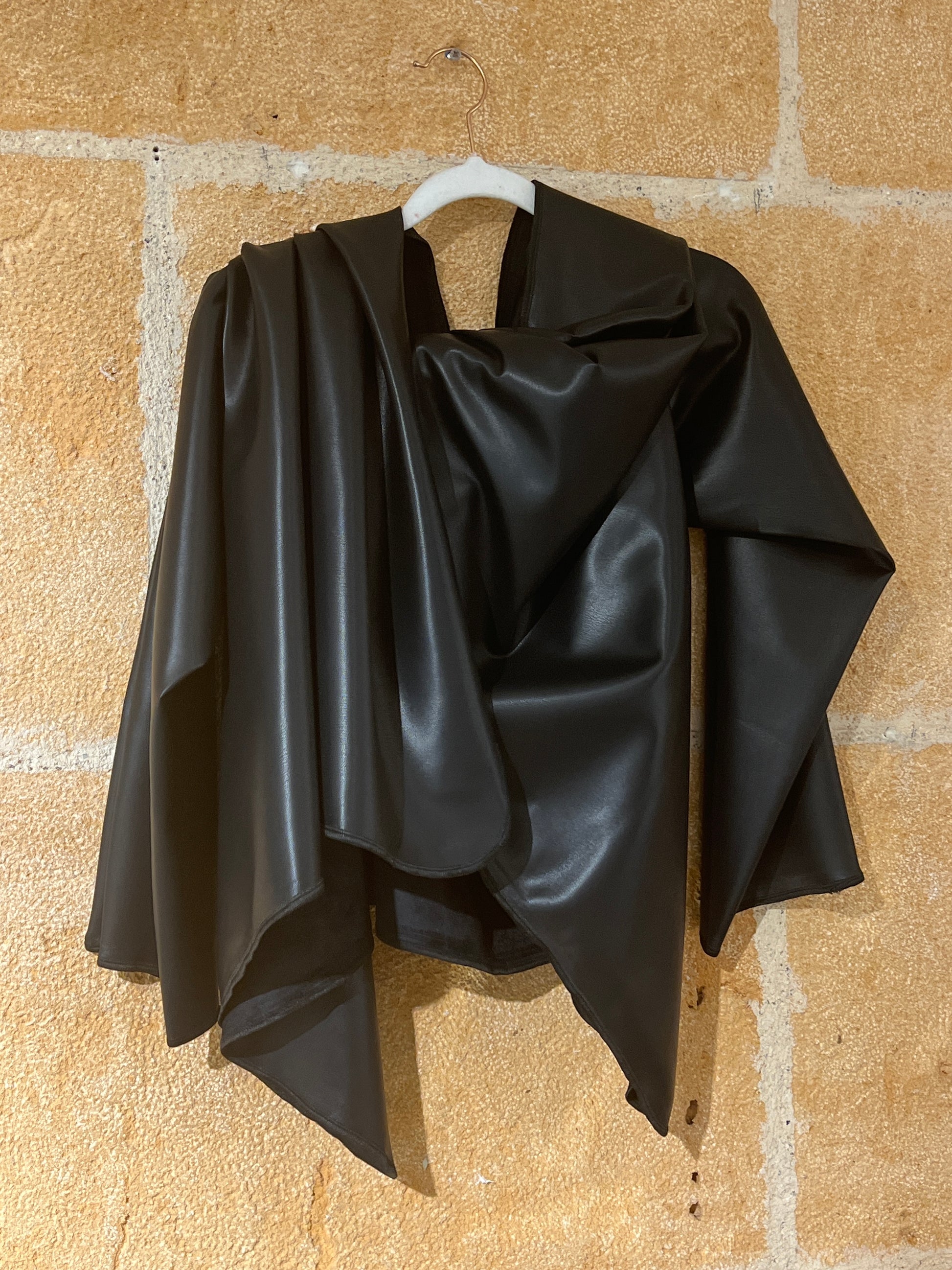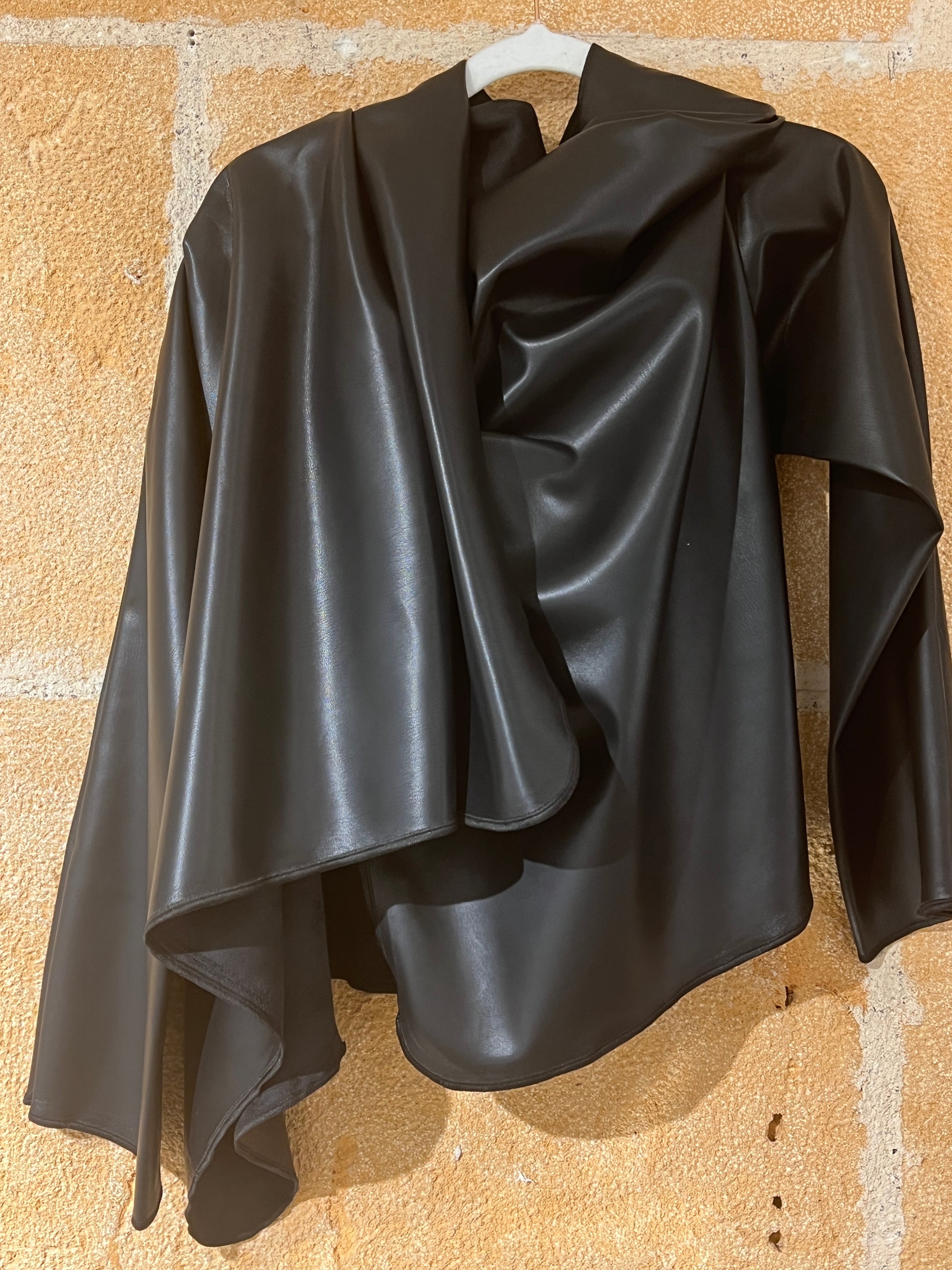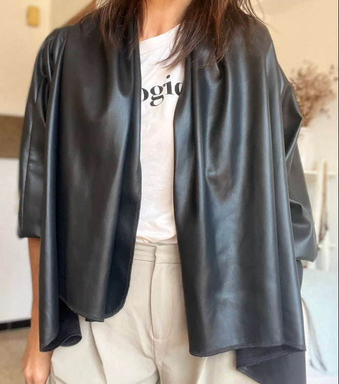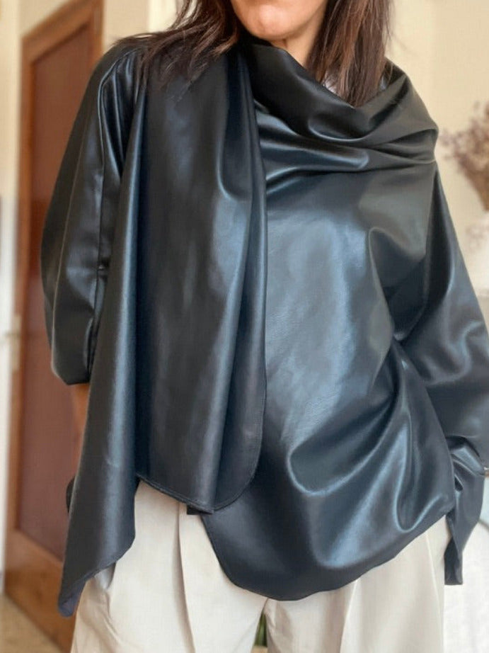 Chaqueta en piel sintética negra, con un acabado suave y ligeramente satinado que imita la piel auténtica pero con una caída mucho más fluida y ligera. El tejido envuelve el cuerpo con un drapeado elegante y moderno, creando un look sofisticado sin rigidez. Una pieza atrevida, versátil y con presencia, perfecta para elevar cualquier outfit.