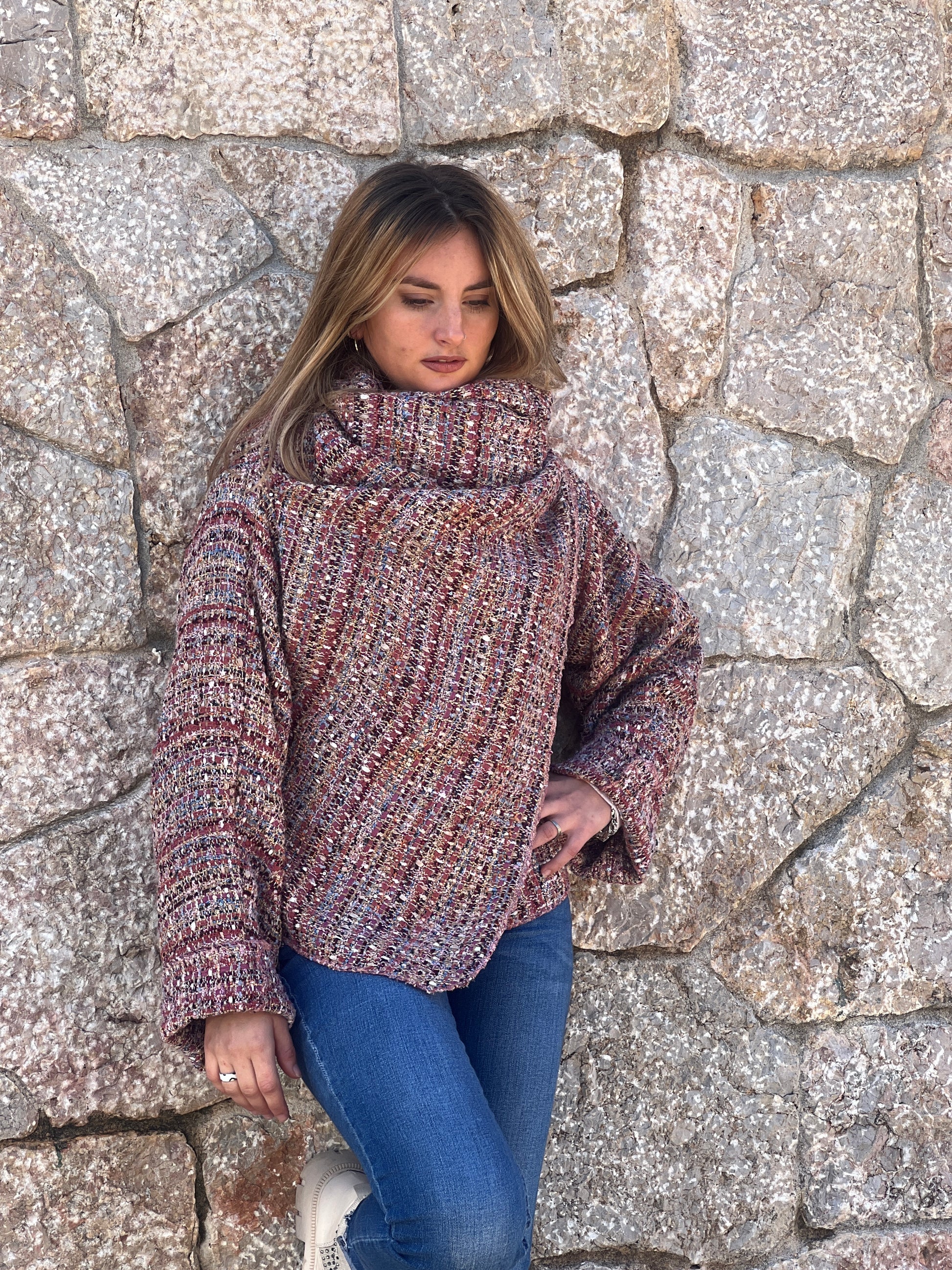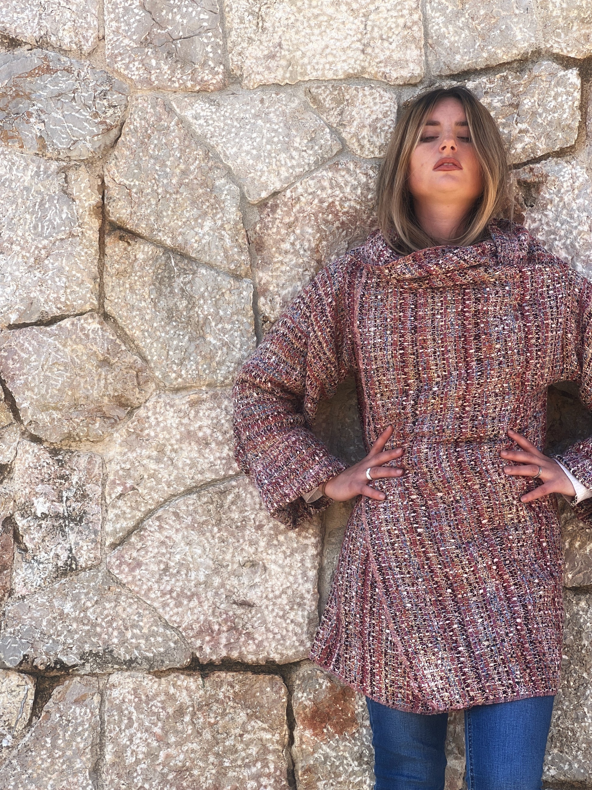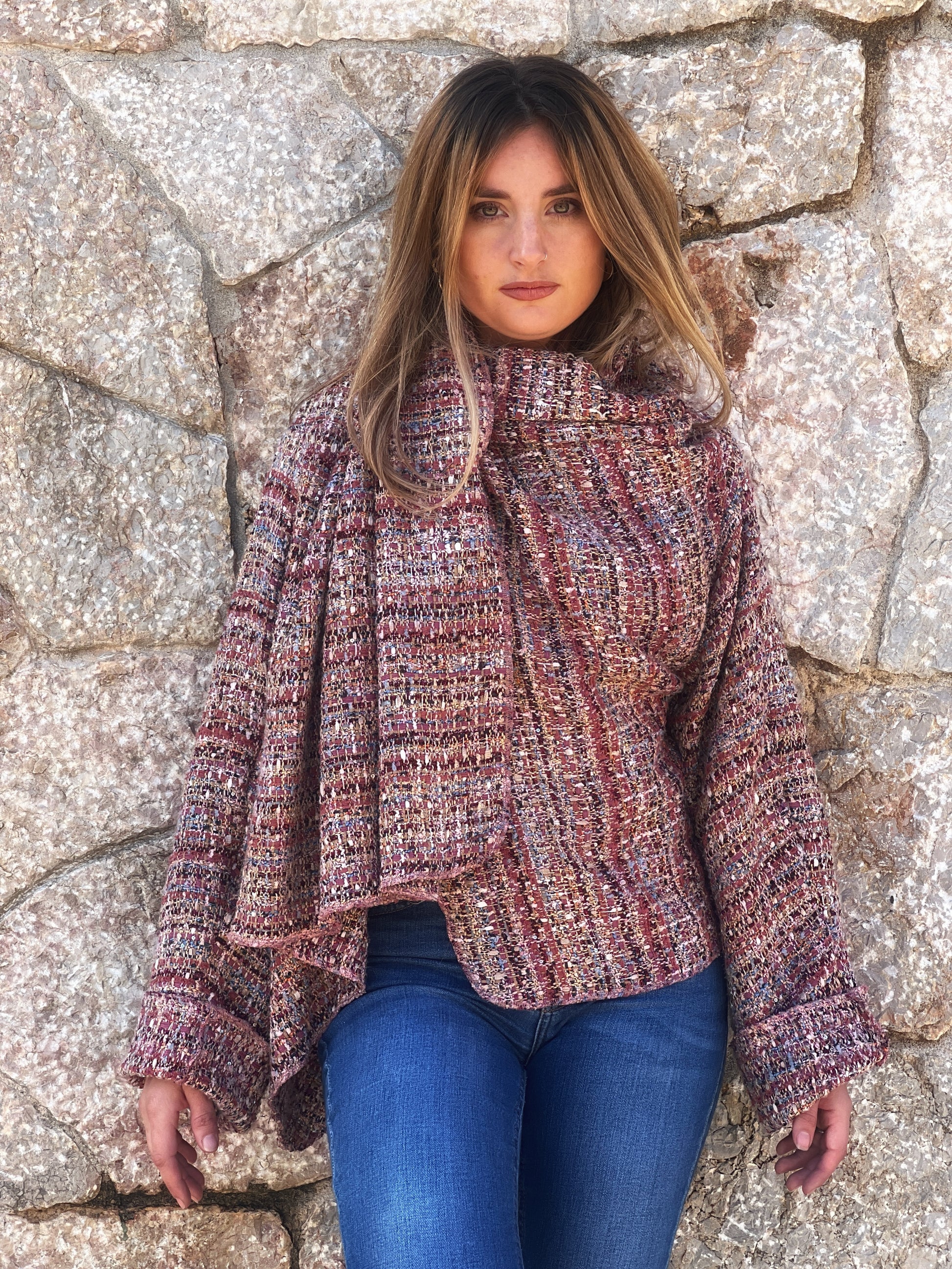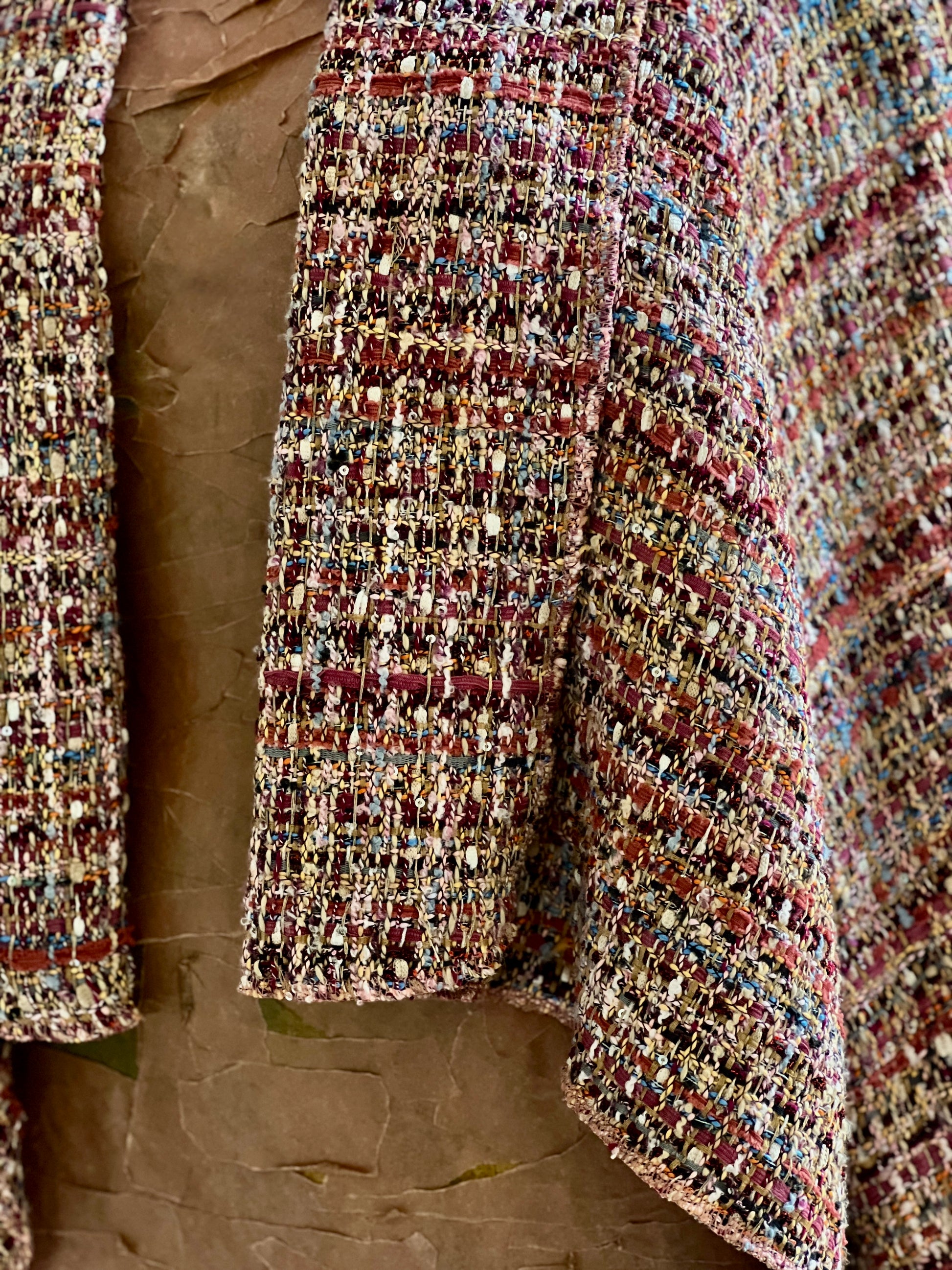 Textura tipo tweed multicolor, con tonos rosa empolvado, burdeos, mostaza, crema y toques azulados, mezclando tonos cálidos y fríos, creando una textura rica y muy especial. Su tejido suave y con cuerpo ligero ofrece una caída fluida pero con presencia, dando un drapeado elegante y único. Una pieza con personalidad, perfecta para un look chic y lleno de estilo.