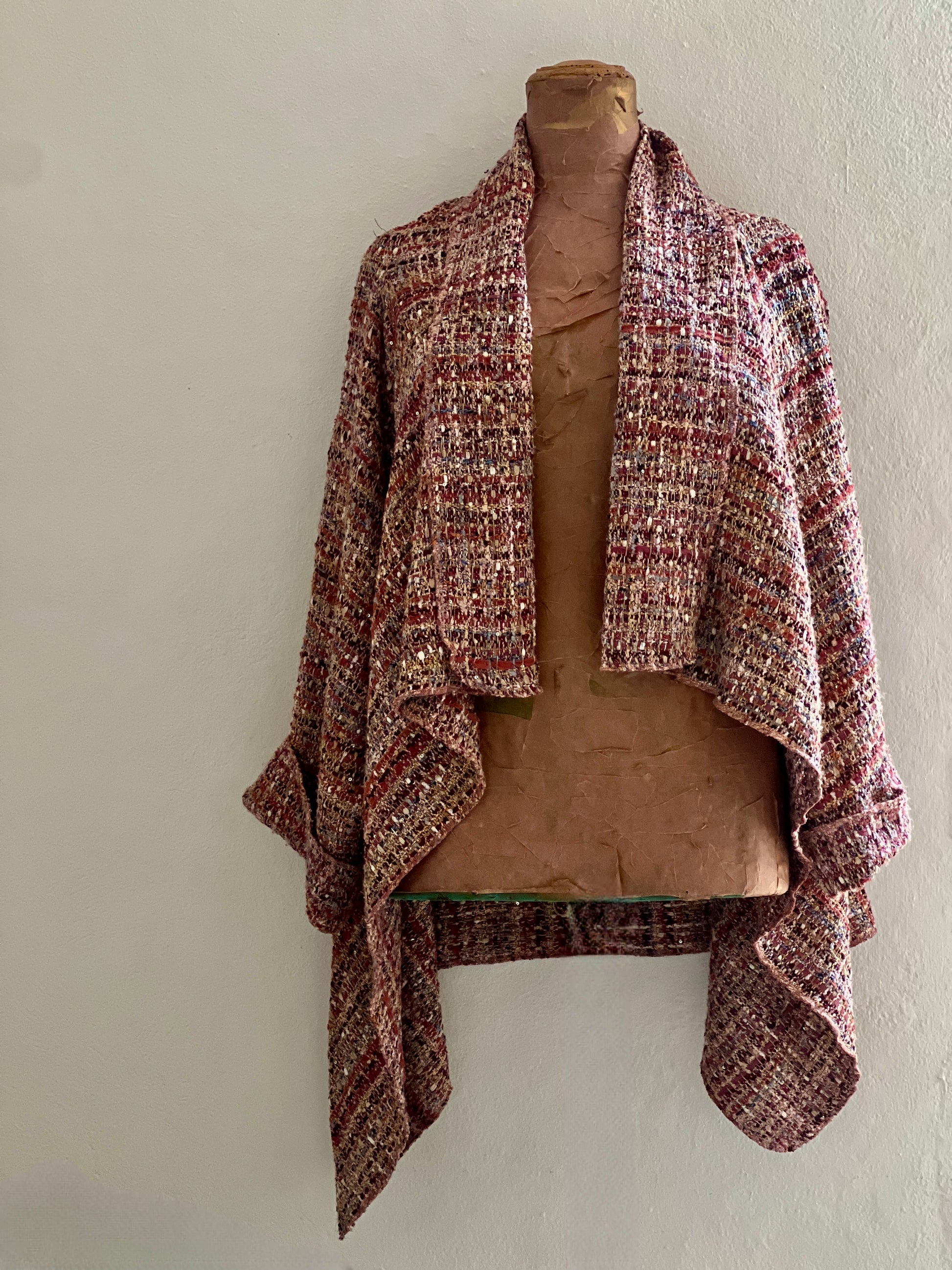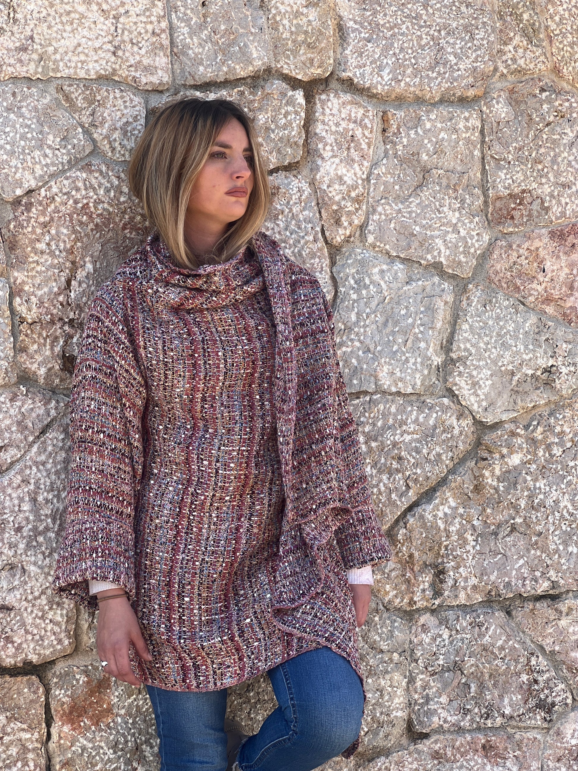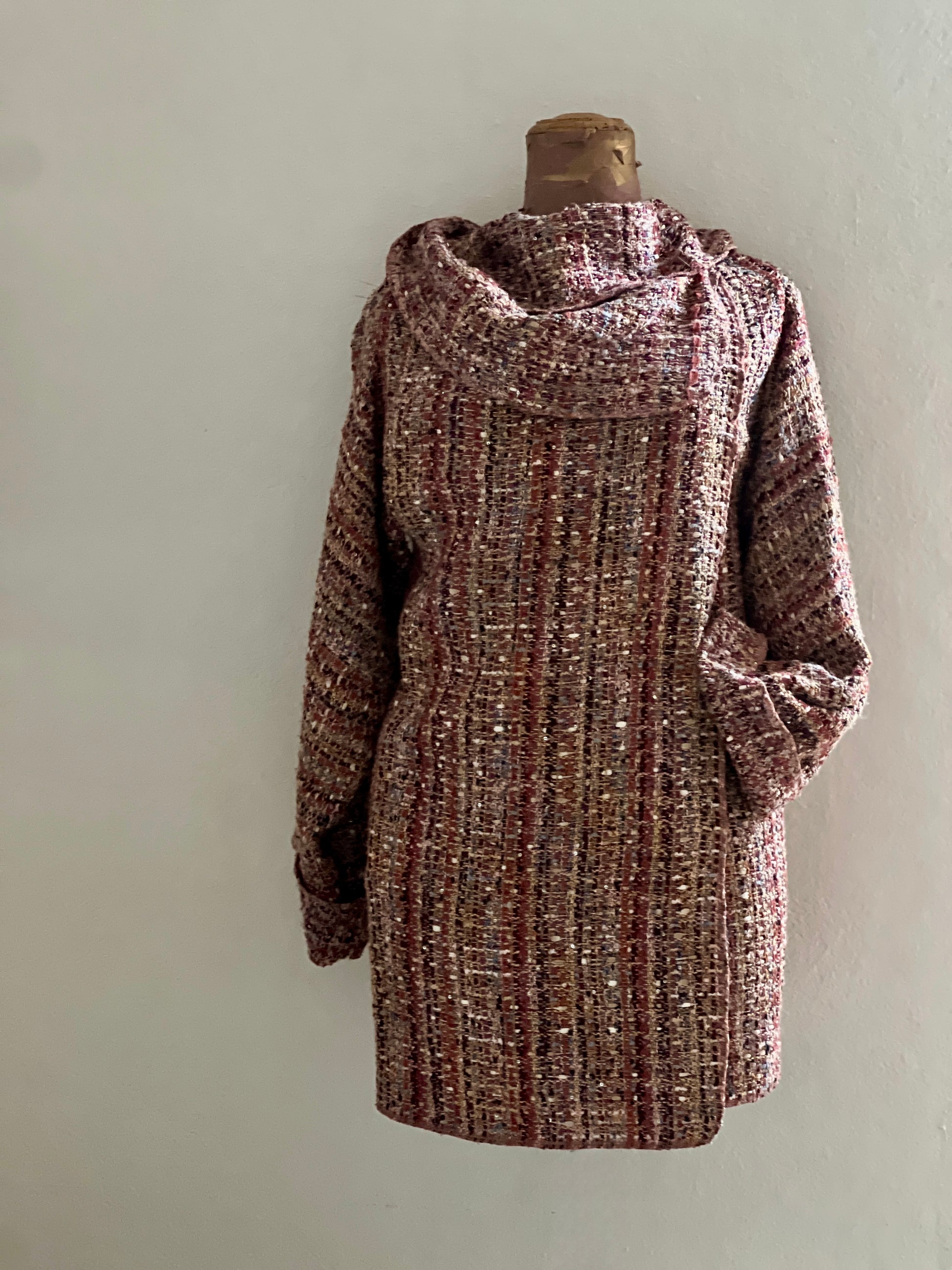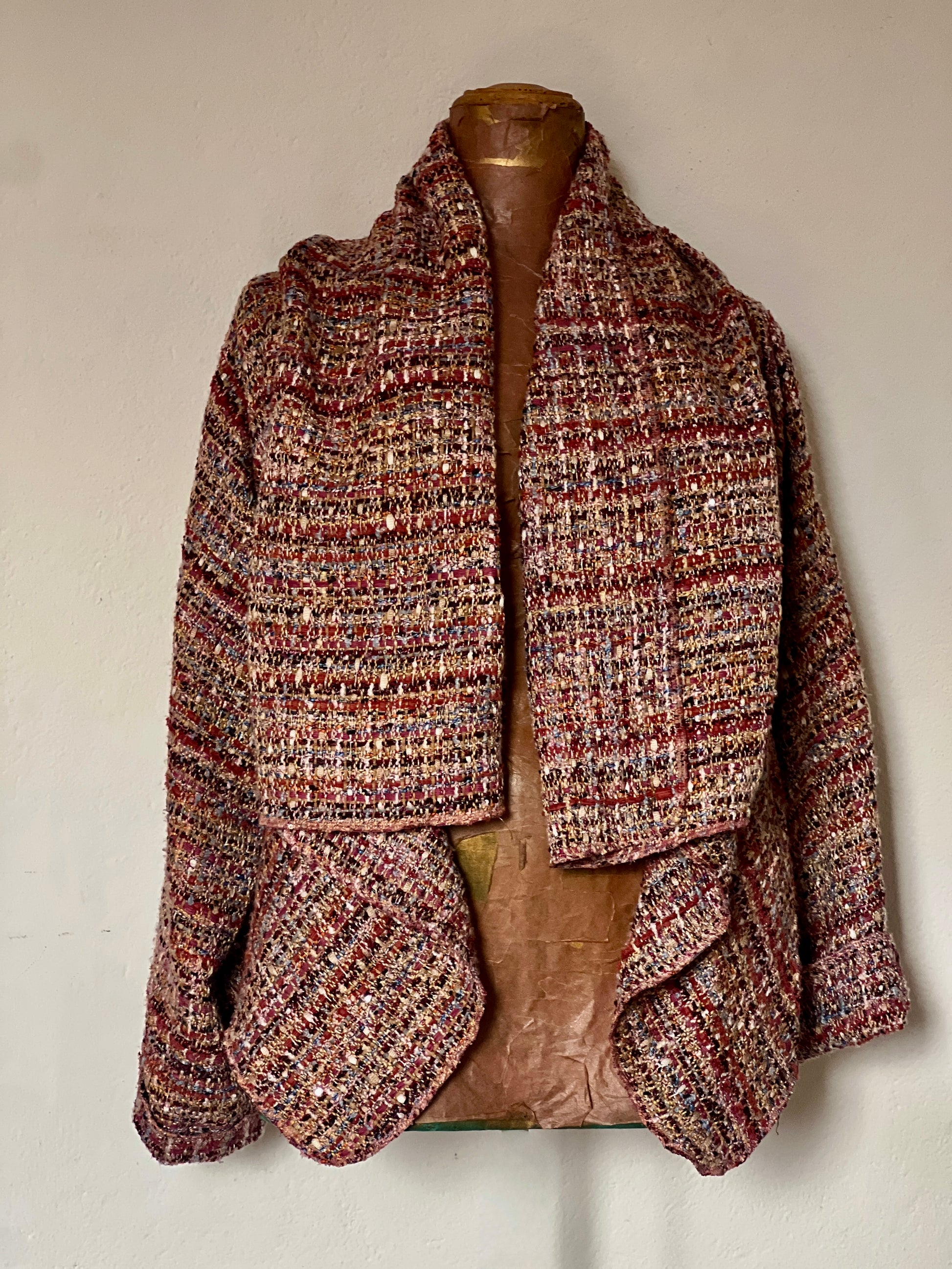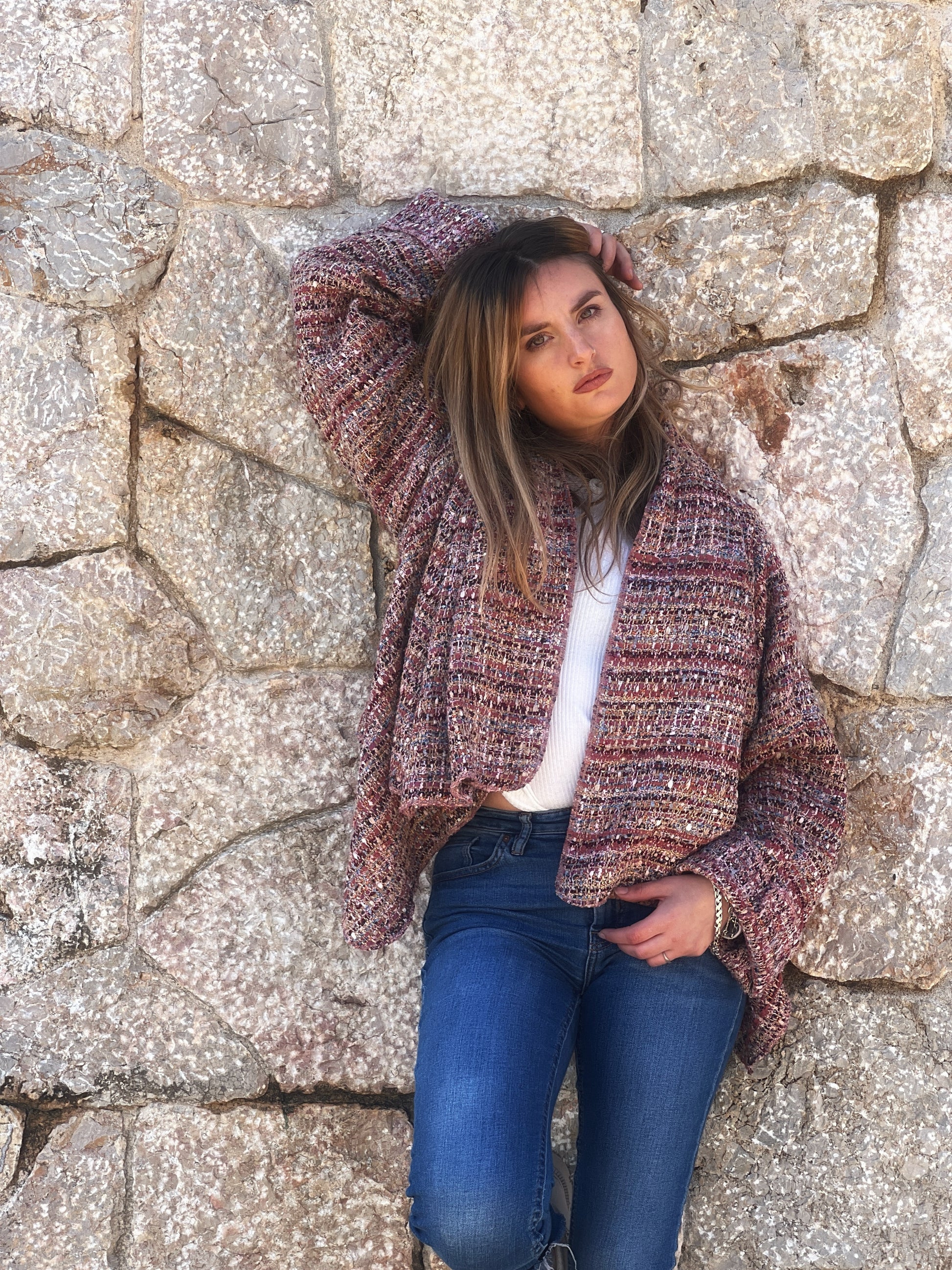 Textura tipo tweed multicolor, con tonos rosa empolvado, burdeos, mostaza, crema y toques azulados, mezclando tonos cálidos y fríos, creando una textura rica y muy especial. Su tejido suave y con cuerpo ligero ofrece una caída fluida pero con presencia, dando un drapeado elegante y único. Una pieza con personalidad, perfecta para un look chic y lleno de estilo.