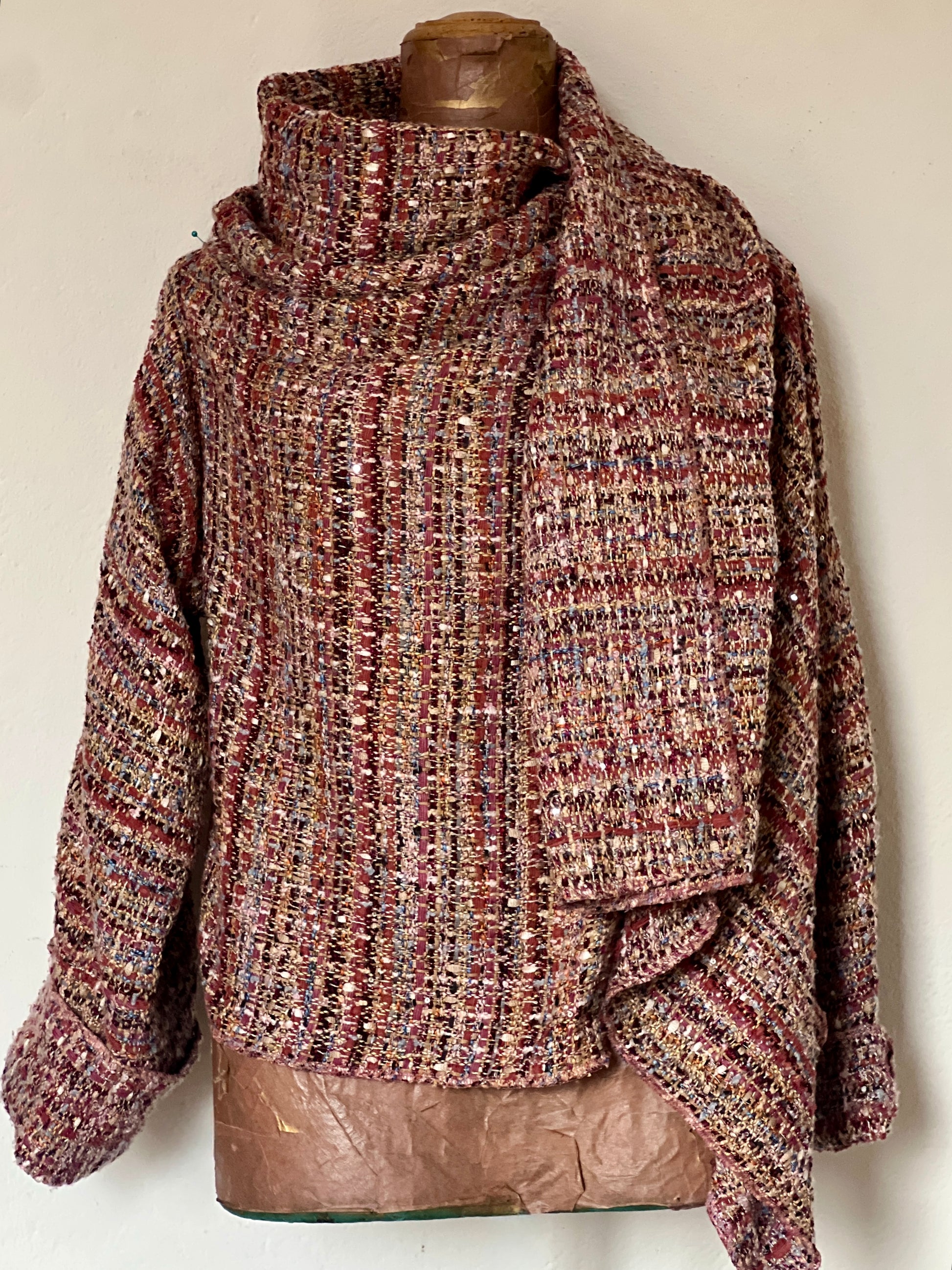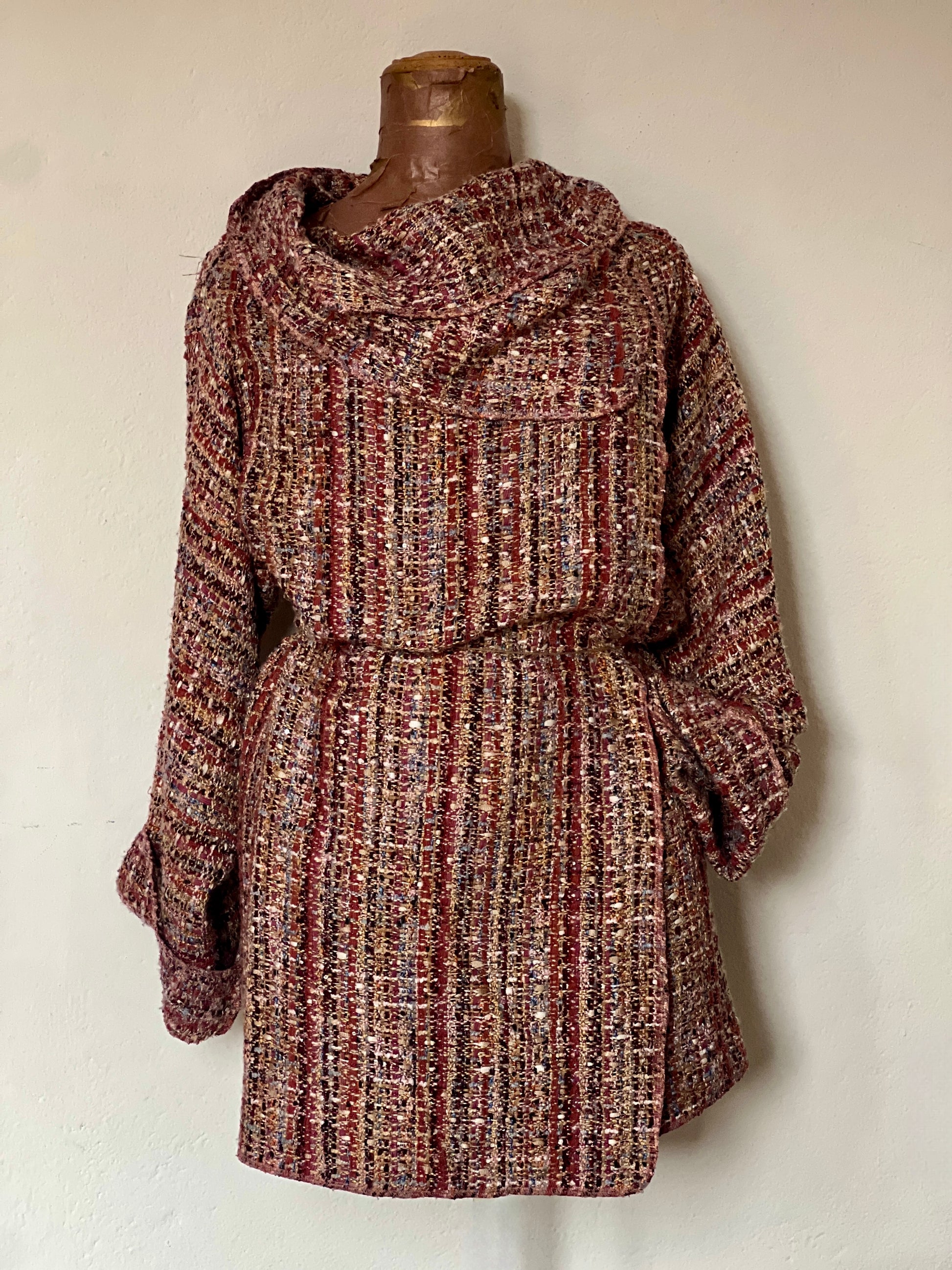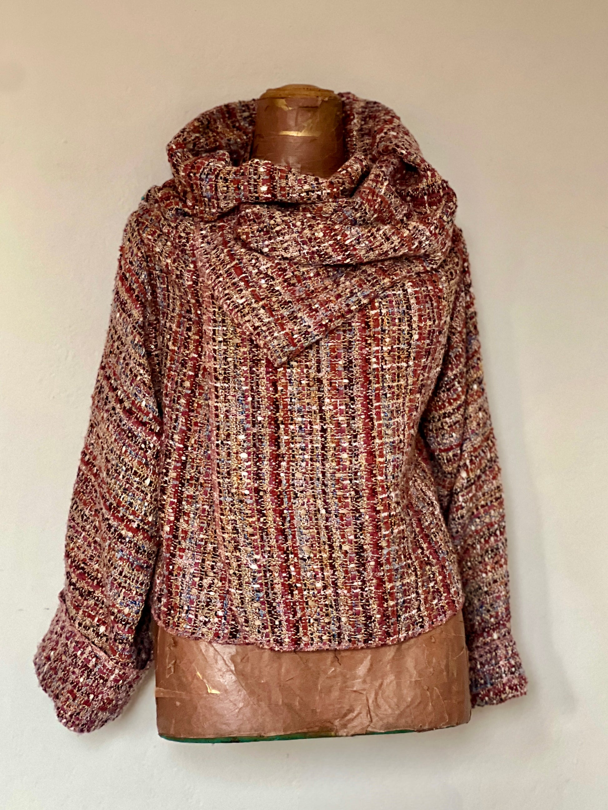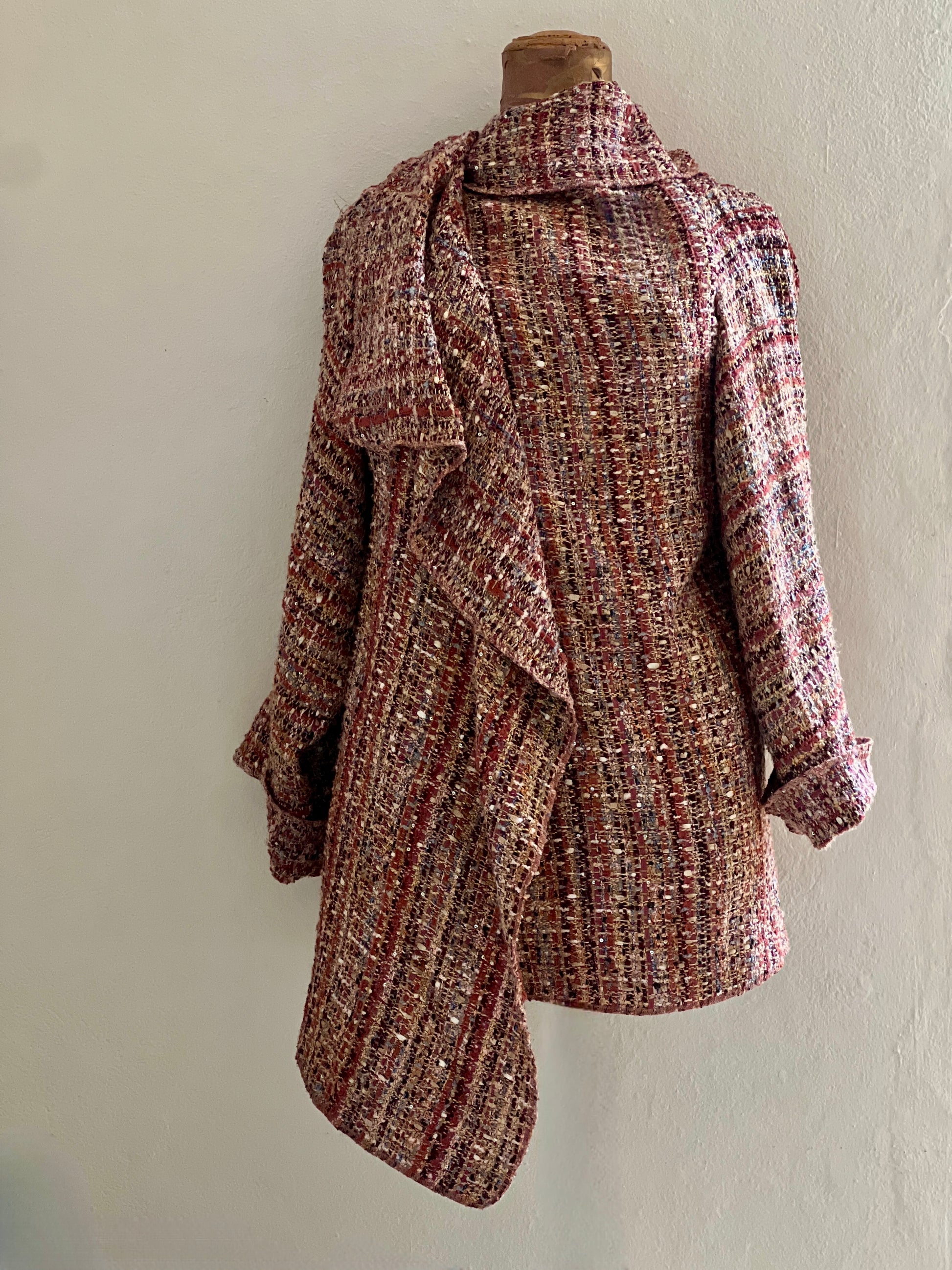 Textura tipo tweed multicolor, con tonos rosa empolvado, burdeos, mostaza, crema y toques azulados, mezclando tonos cálidos y fríos, creando una textura rica y muy especial. Su tejido suave y con cuerpo ligero ofrece una caída fluida pero con presencia, dando un drapeado elegante y único. Una pieza con personalidad, perfecta para un look chic y lleno de estilo.