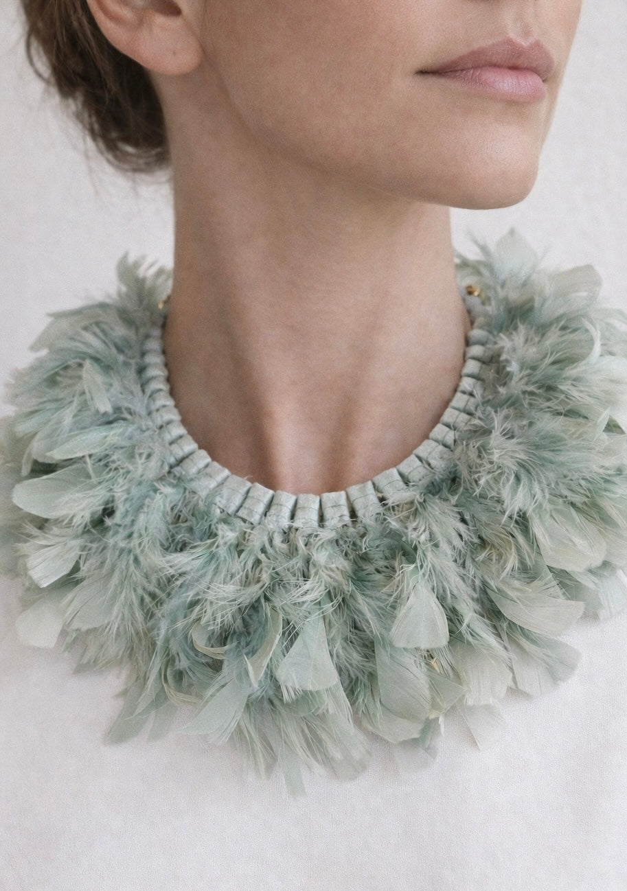 Collar de estilo etéreo y muy expresivo, elaborado con plumas naturales en tonos verde agua y marfil, combinadas con una base de piezas textiles y cuentas suaves que se adaptan al cuello.