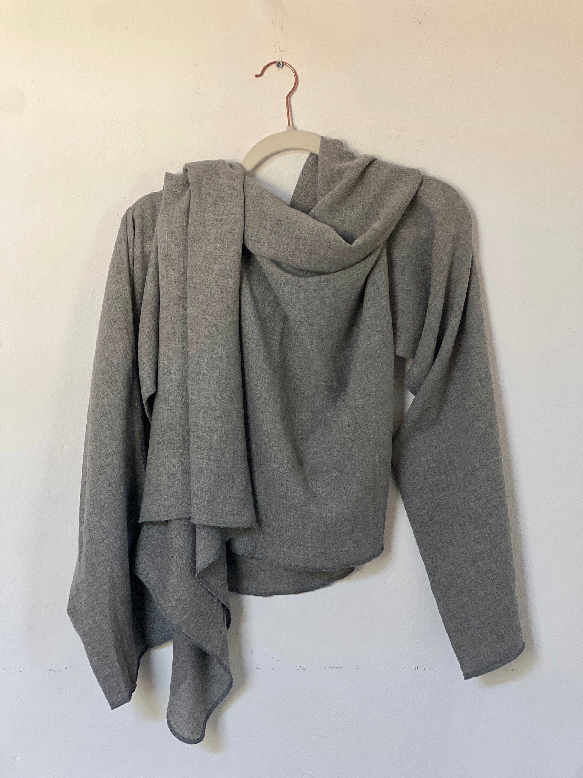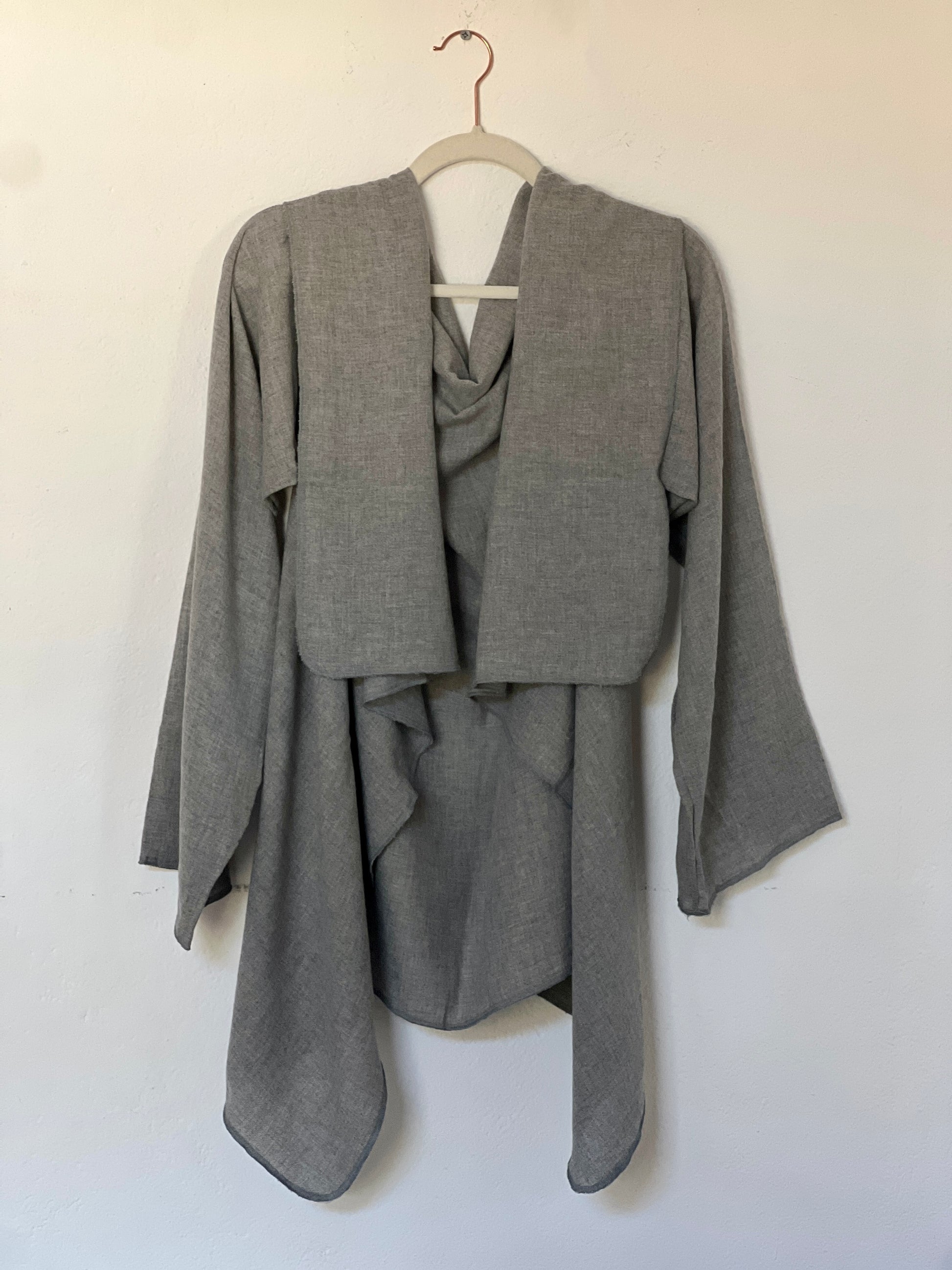 Abrigo confeccionado en una tela ligera de textura natural, suave al tacto y con una caída fluida que aporta movimiento sin rigidez. Es un tejido que envuelve el cuerpo de manera orgánica, permitiendo que el abrigo se adapte con naturalidad a distintas formas de llevarlo.