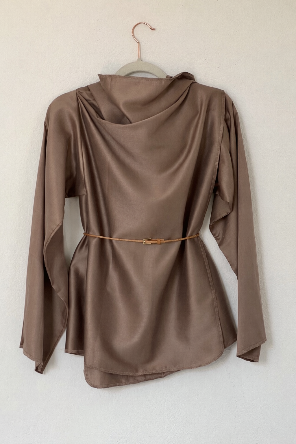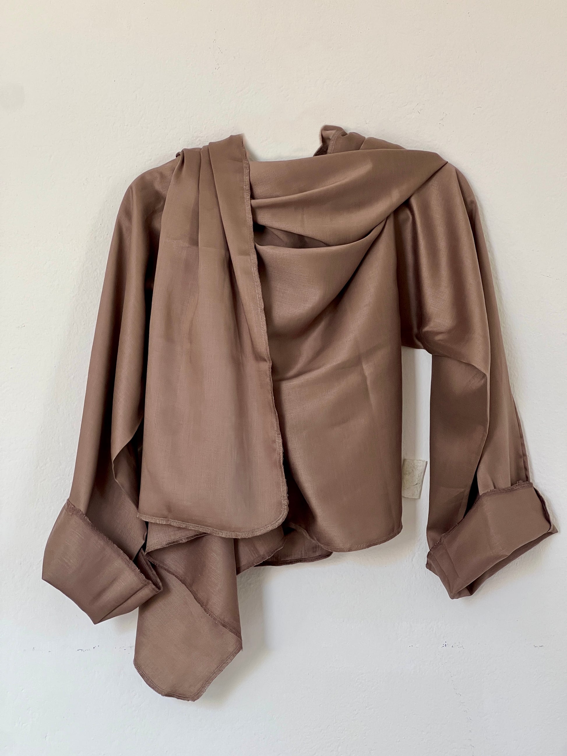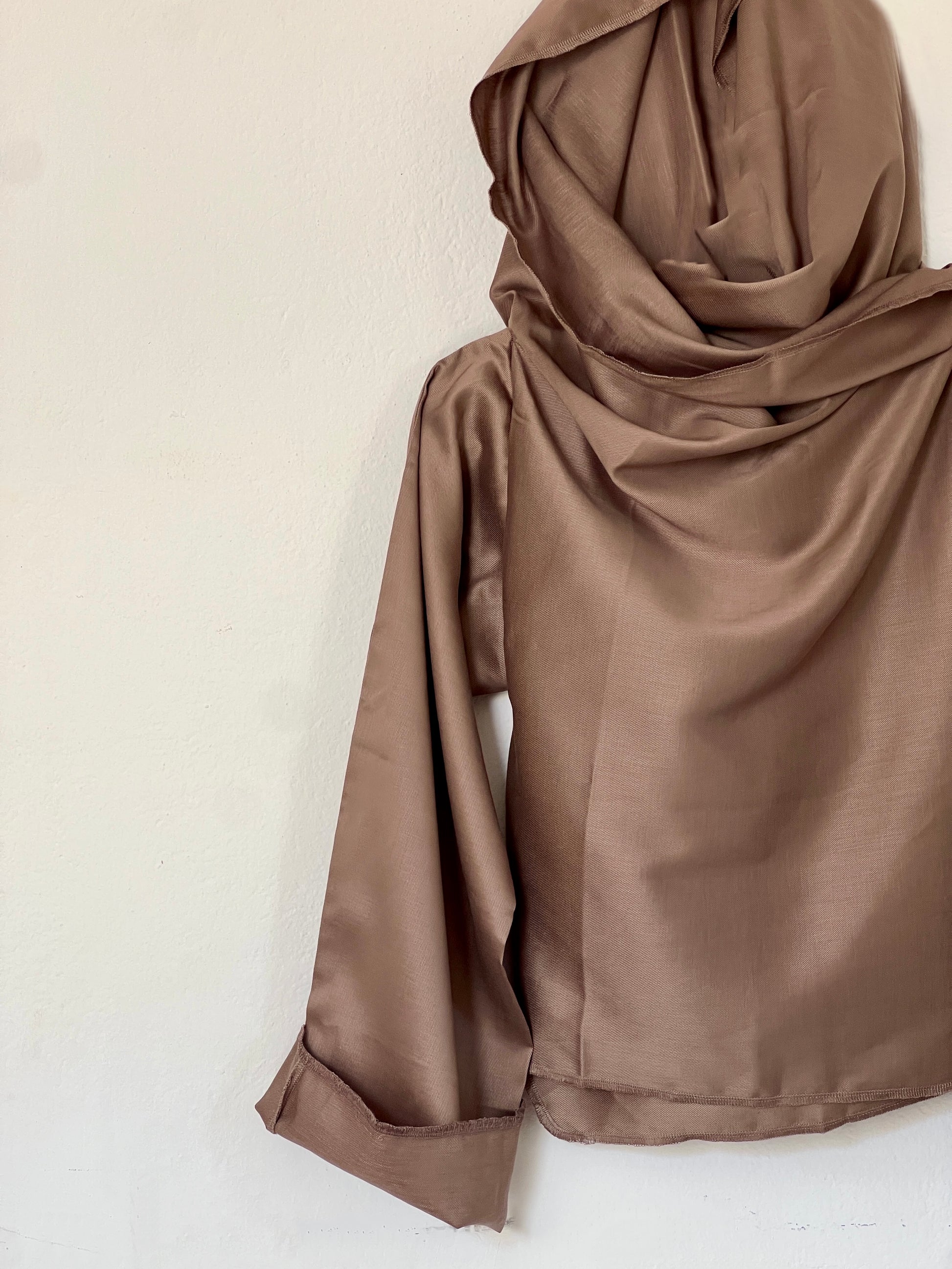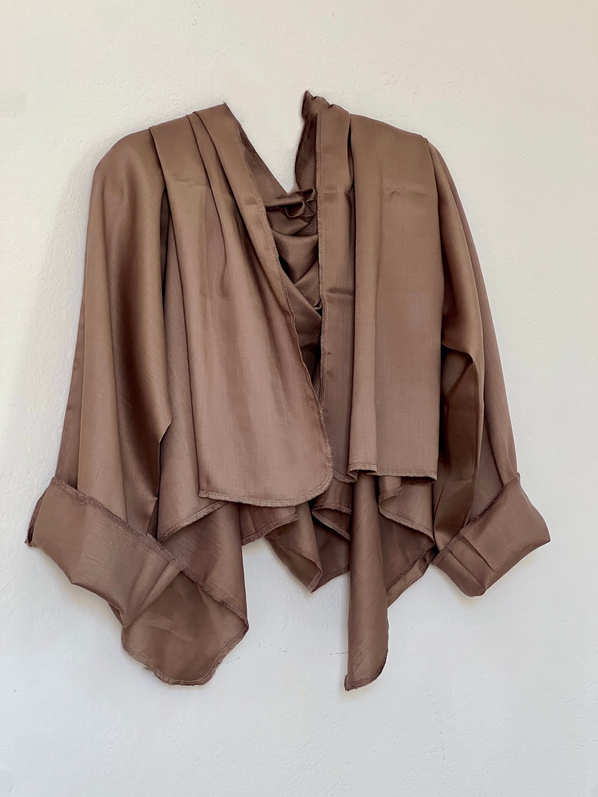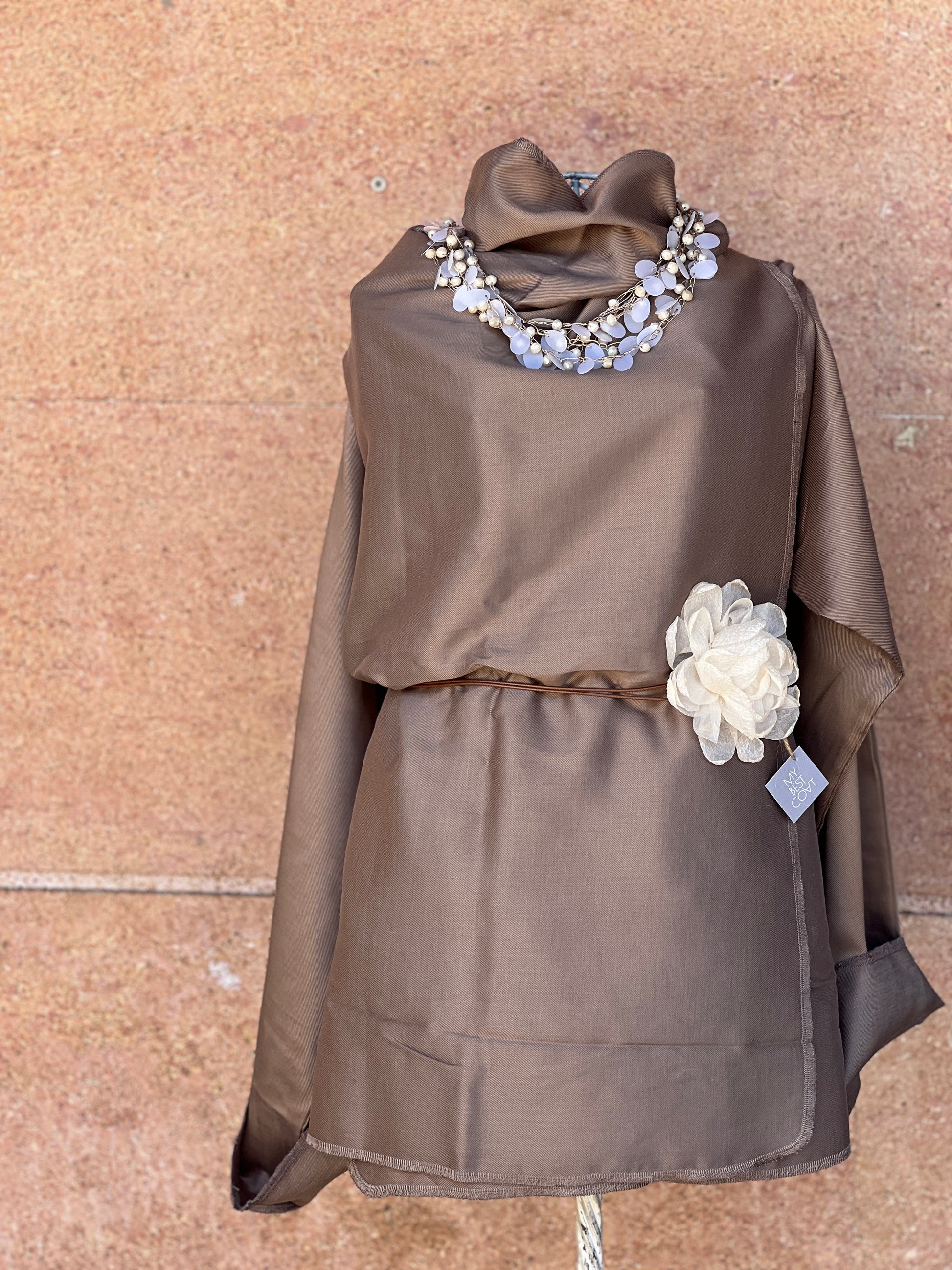 El color juega entre los marrones y grises, se define como un taupe ya que tiene tonos tierra y cacao, pero tambien el gris se asoma segun el movimiento aportando profundidad y una elegancia discreta. No es un tono plano: la luz revela matices sutiles que refuerzan la riqueza del tejido.