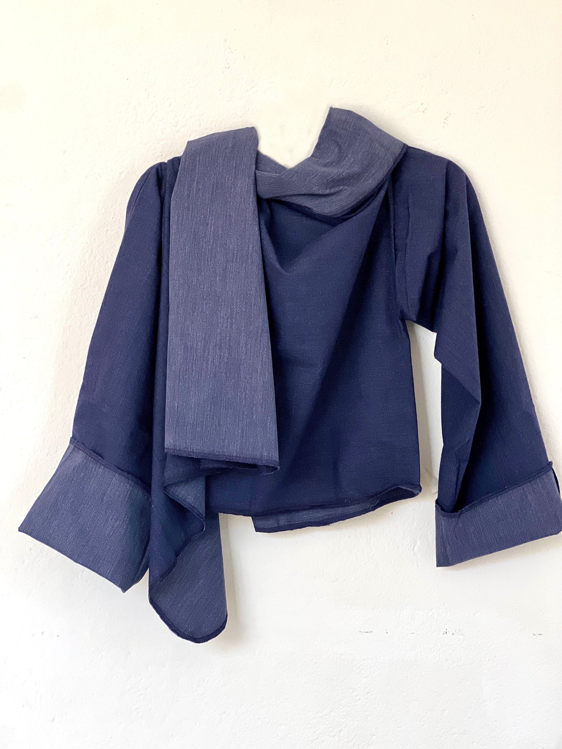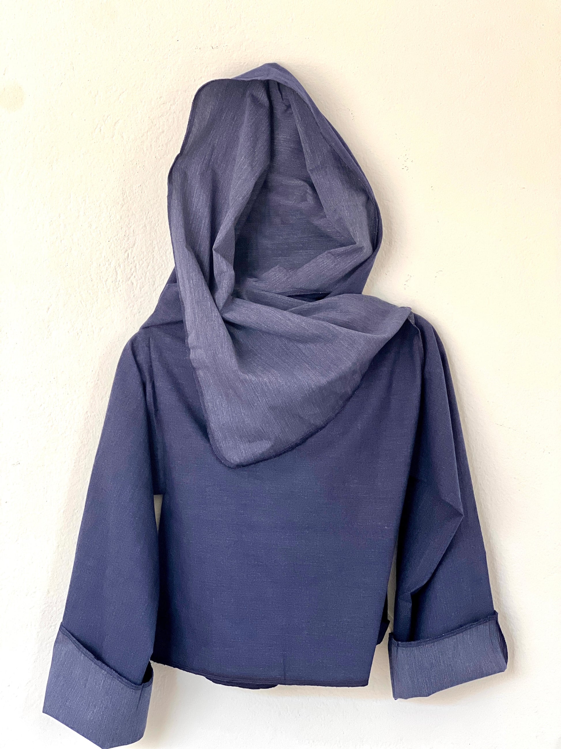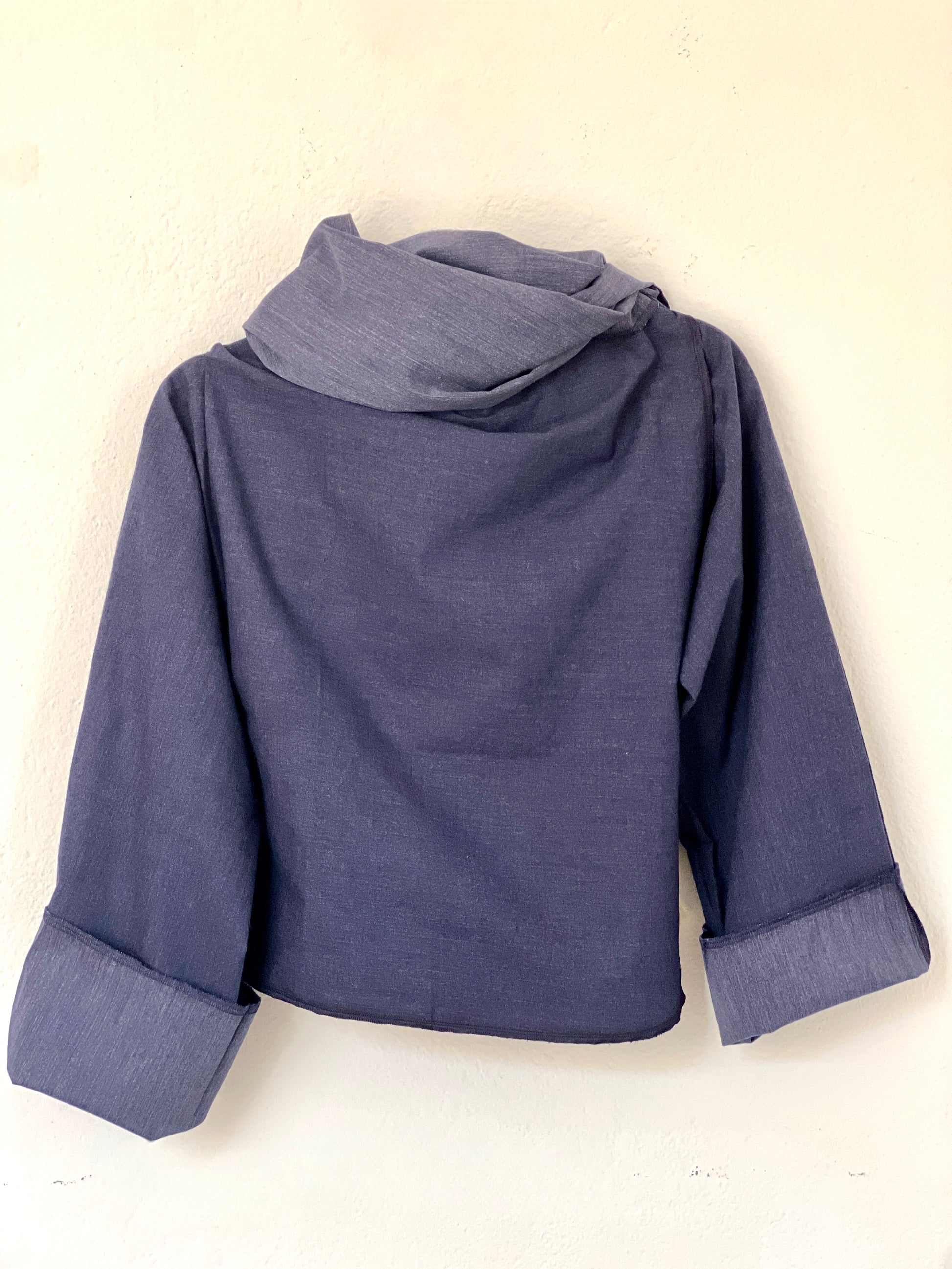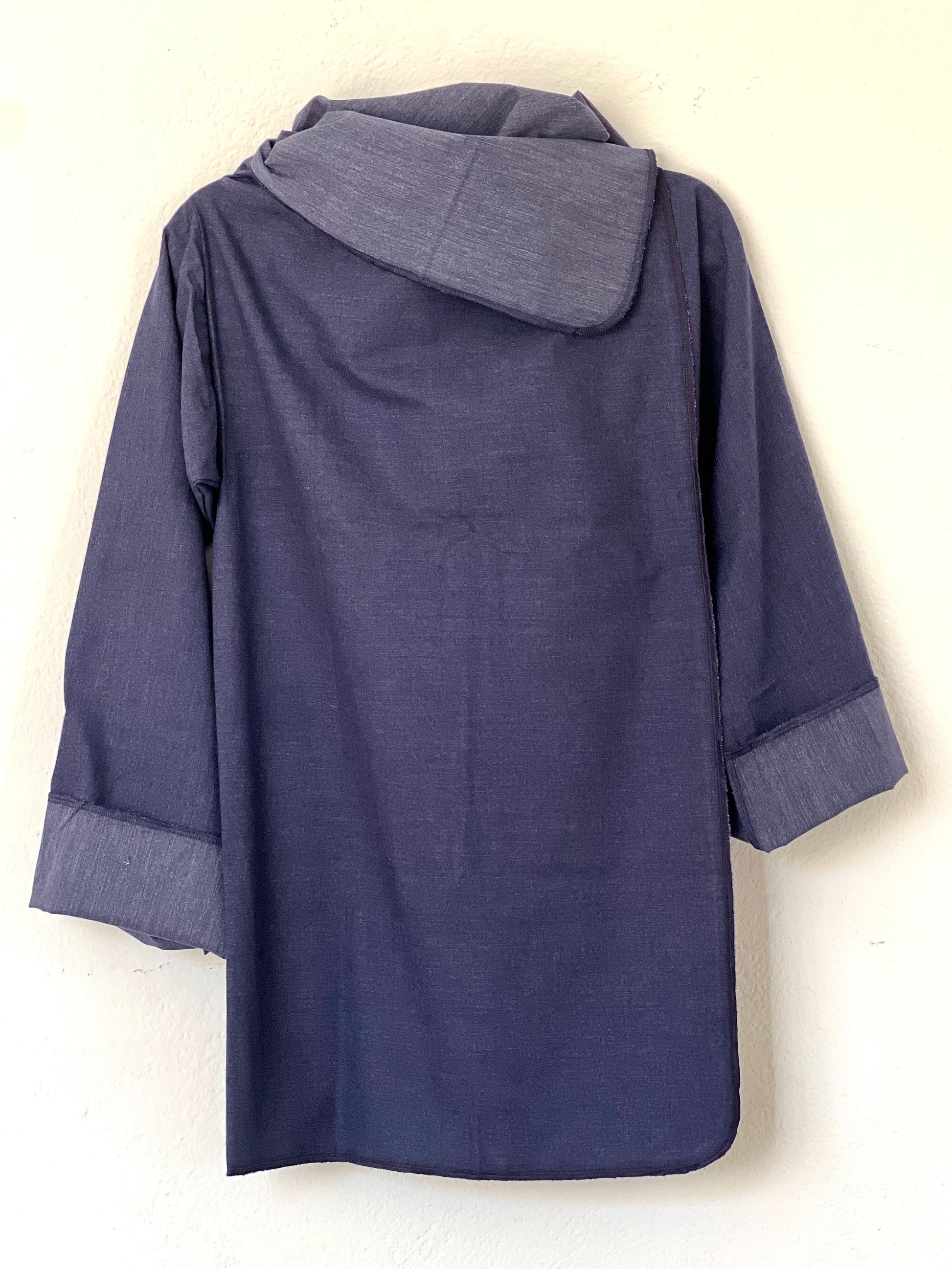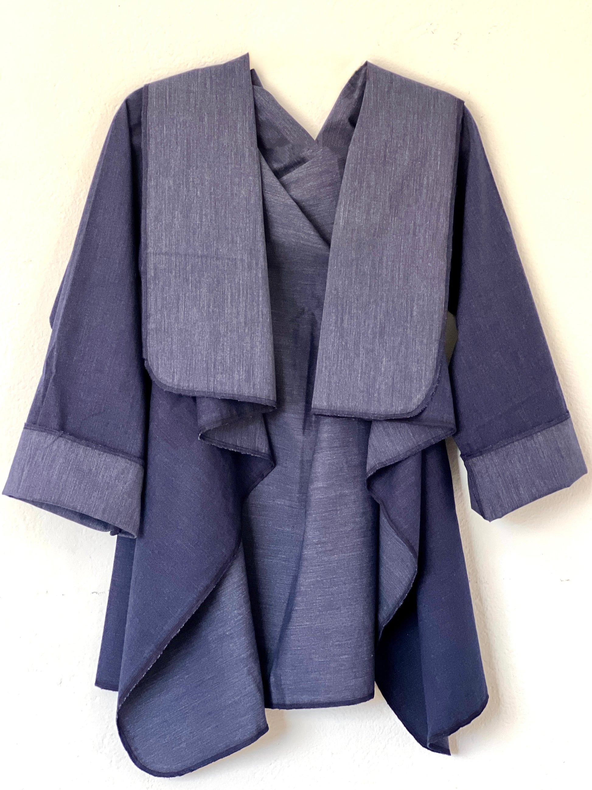 Abrigo en azul índigo suave, confeccionado en un tejido denim liviano y fresco con un sutil efecto jaspeado. Perfecto para clima medio–cálido, ofrece una caída fluida y relajada, con un drapeado limpio que aporta un look moderno y minimalista. Una pieza versátil y cómoda, ideal para el entretiempo.