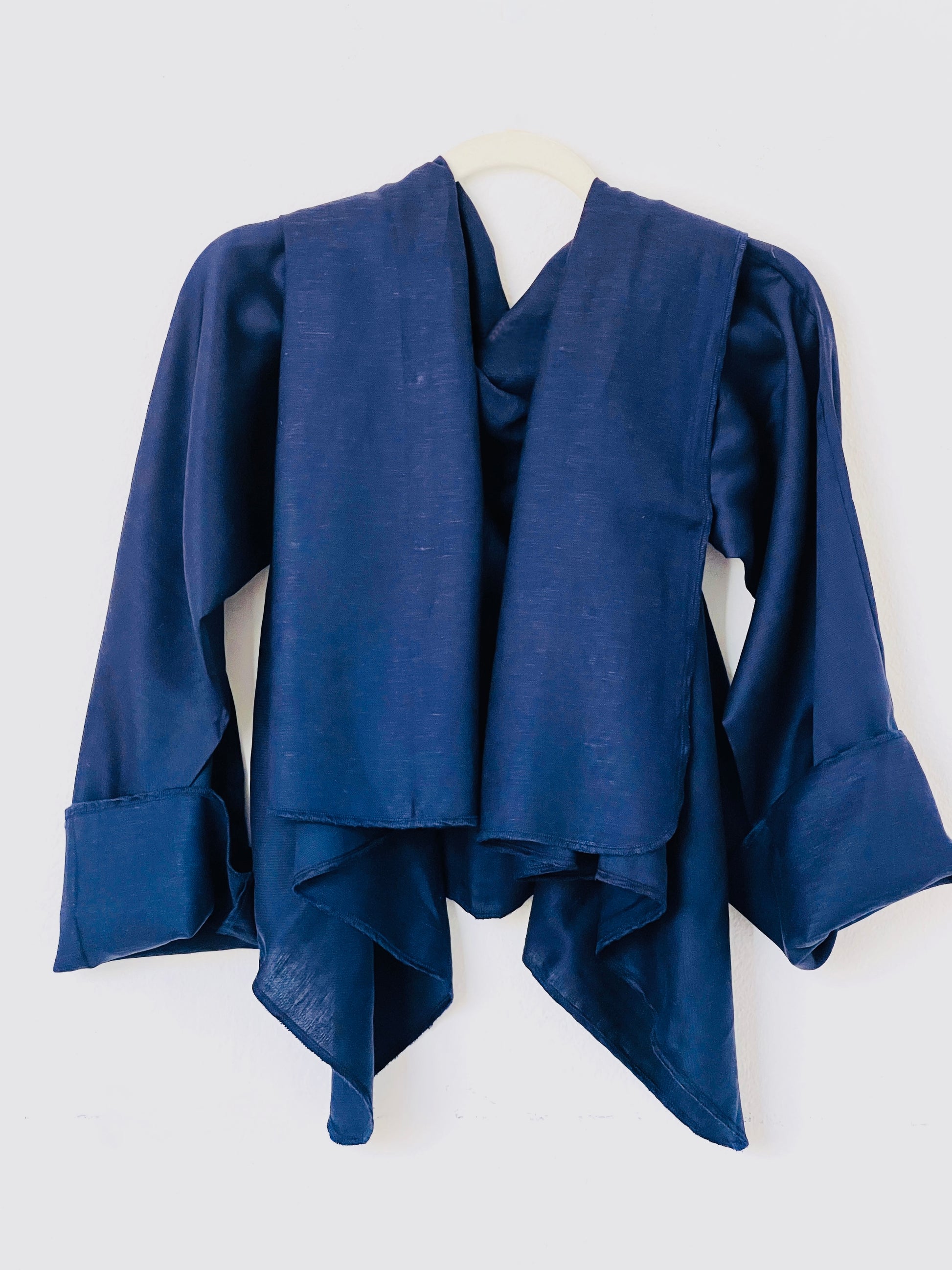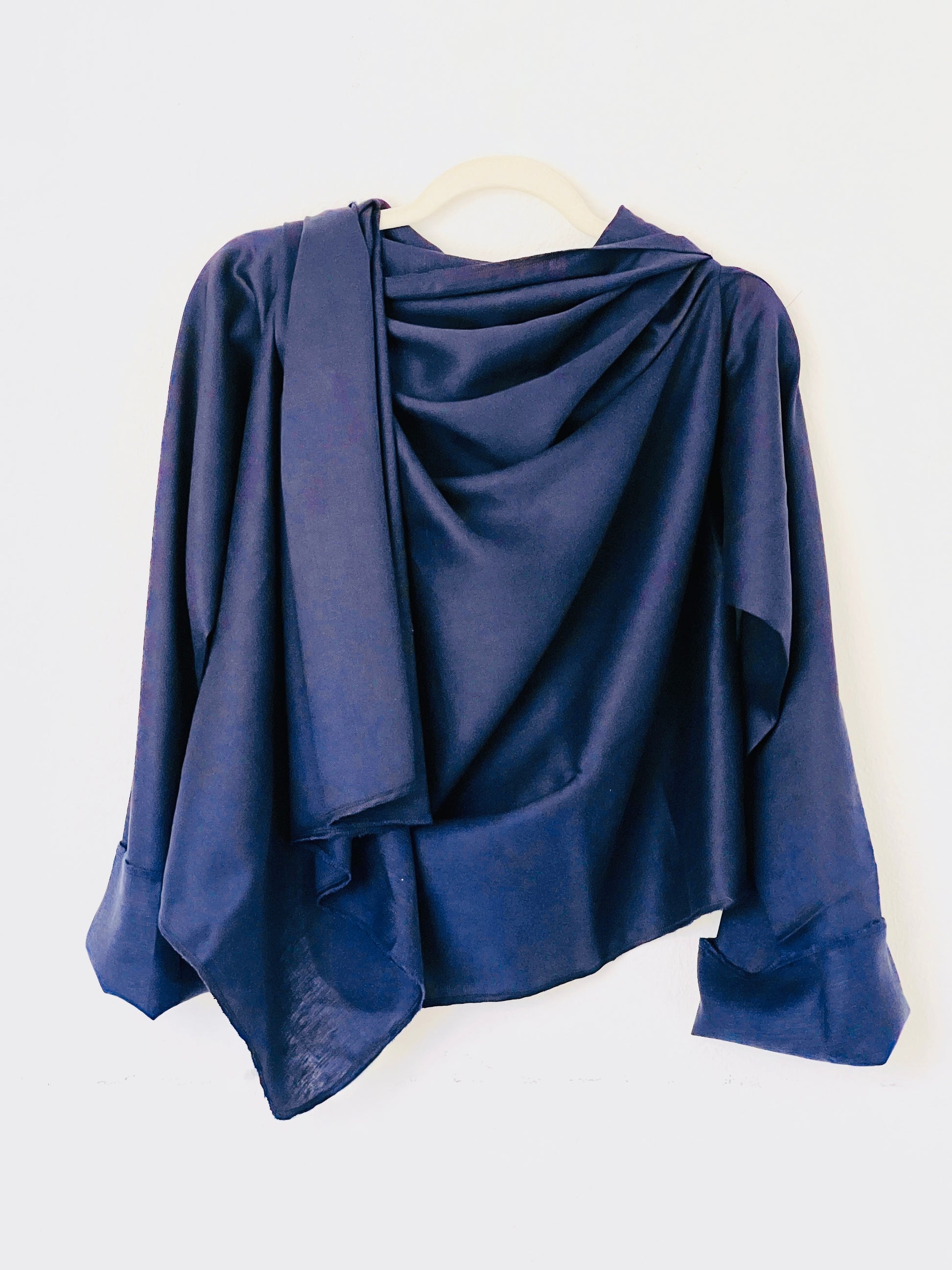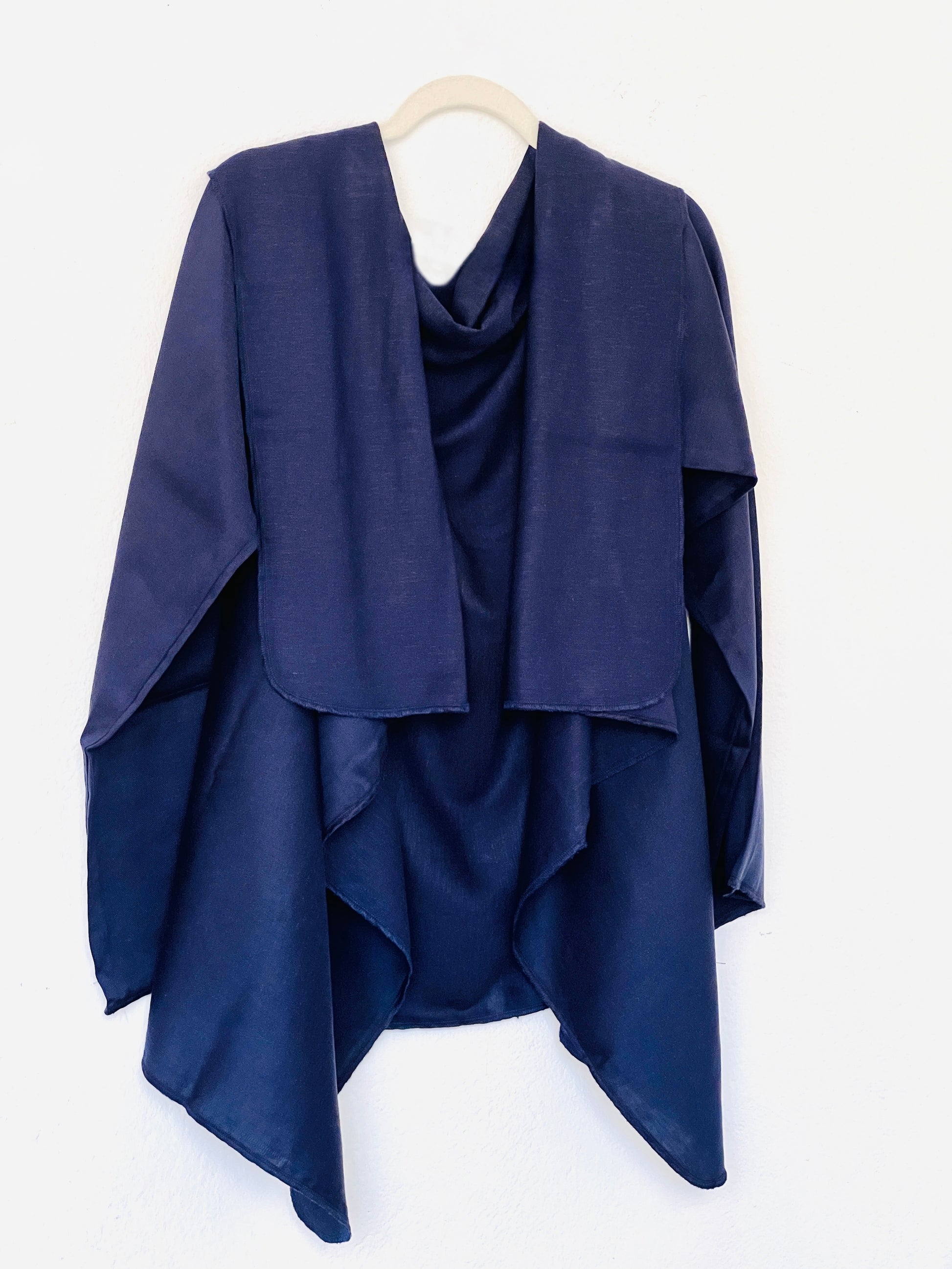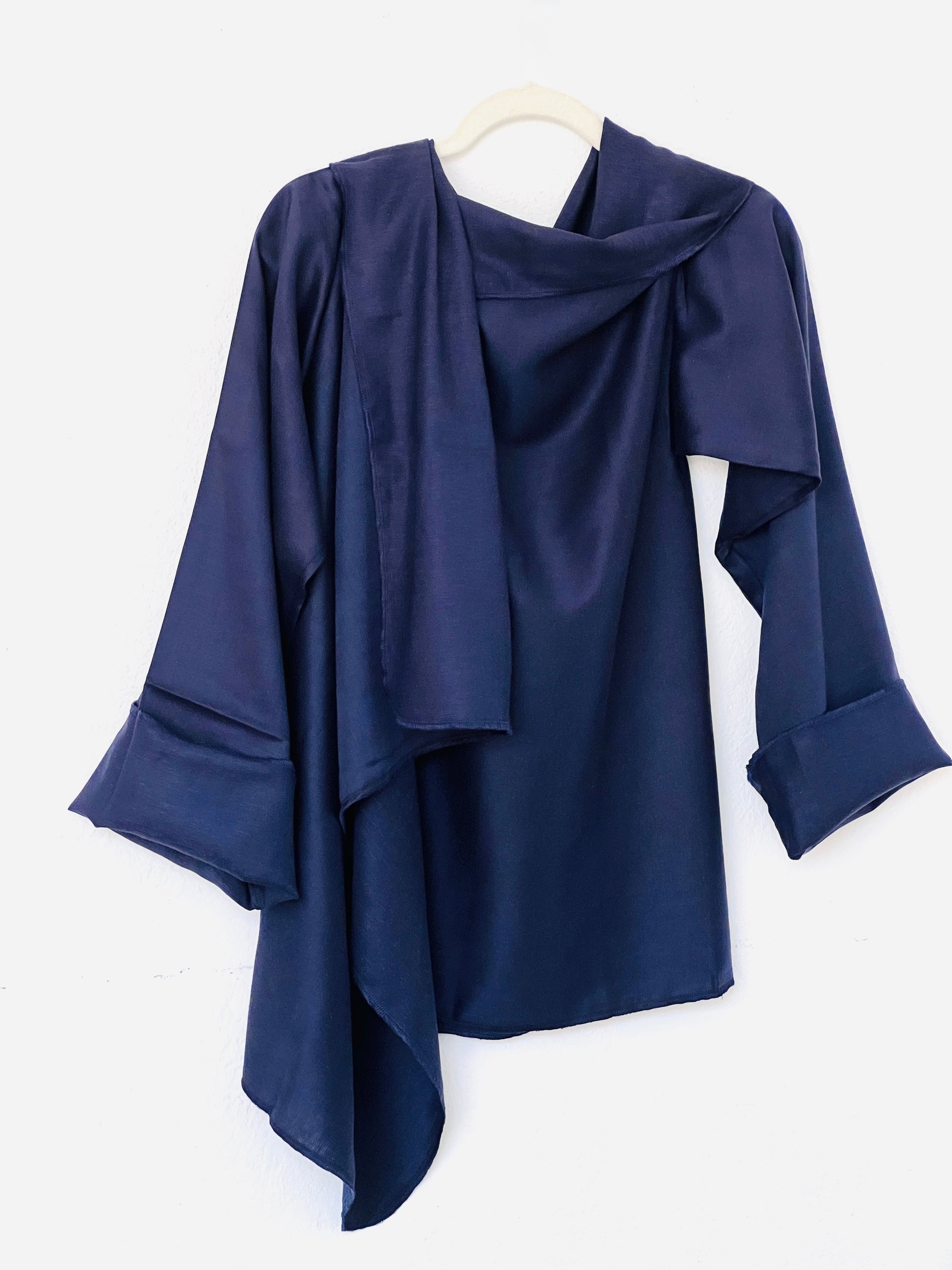 Abrigo en azul marino profundo, confeccionado en un tejido liviano y suave, ideal para clima medio–cálido. Su acabado ligeramente sedoso aporta un toque elegante sin añadir peso. La caída es muy fluida y aérea, creando un drapeado delicado y sofisticado. Una pieza fresca, versátil y perfecta para entretiempo.