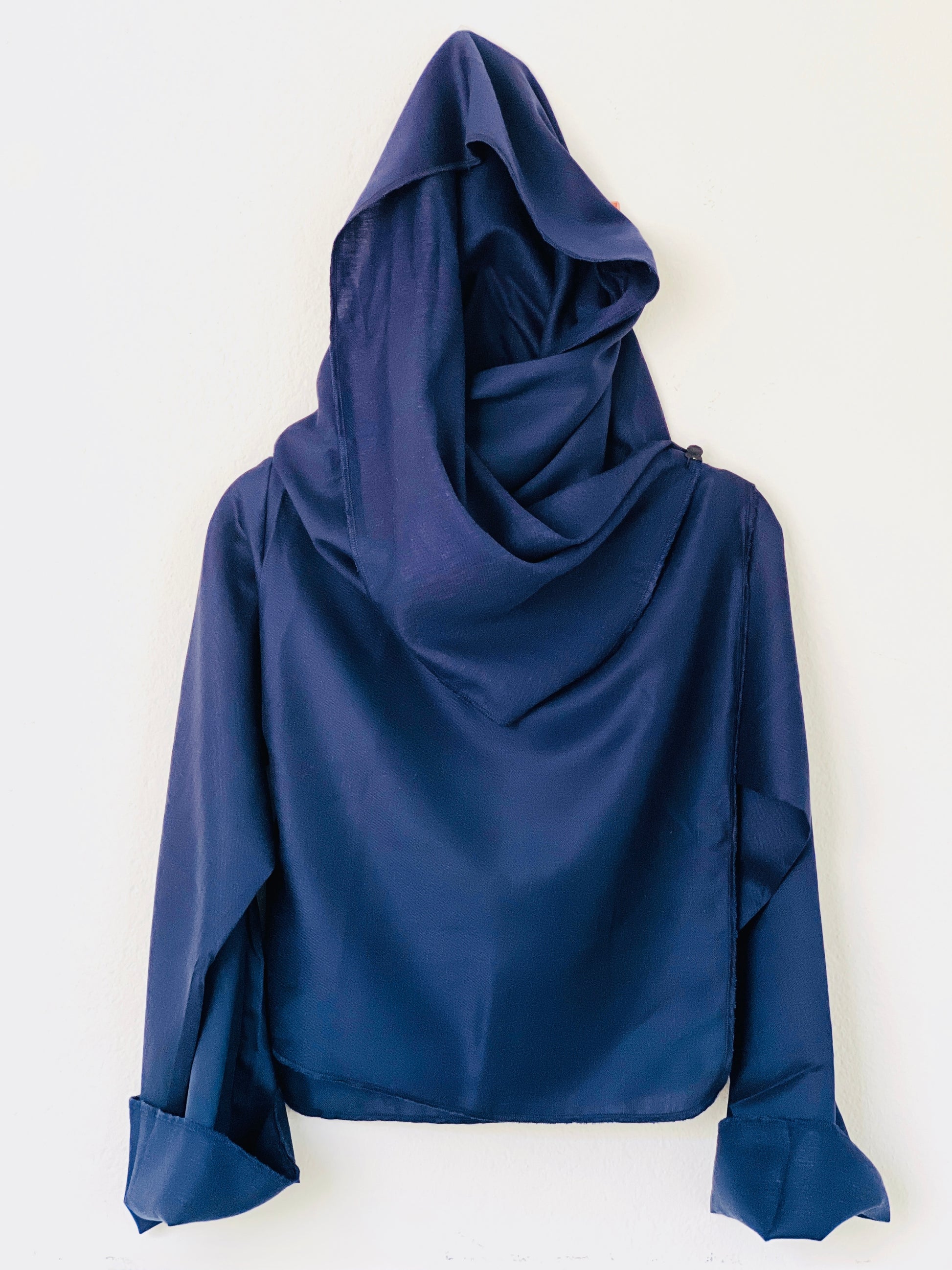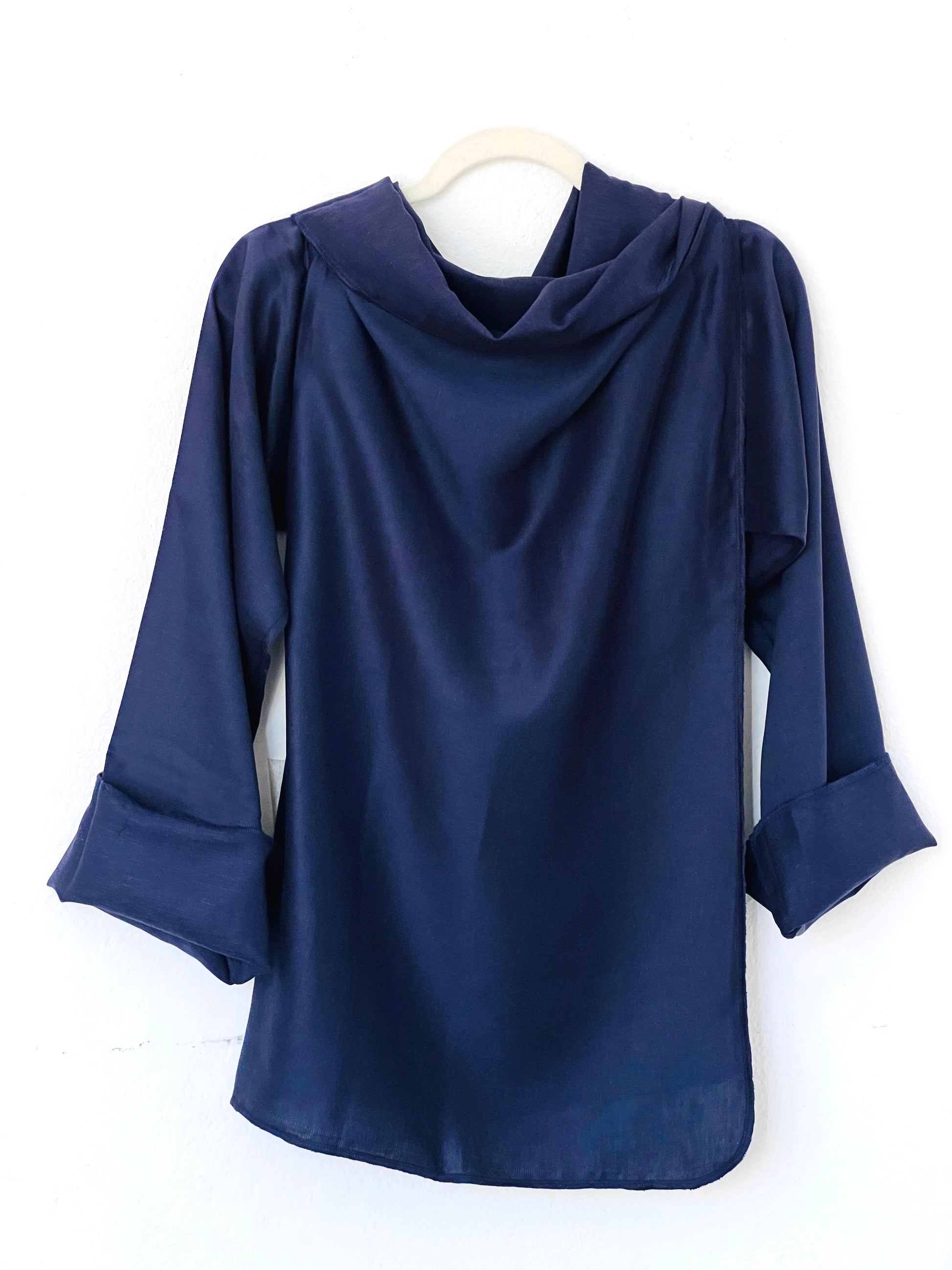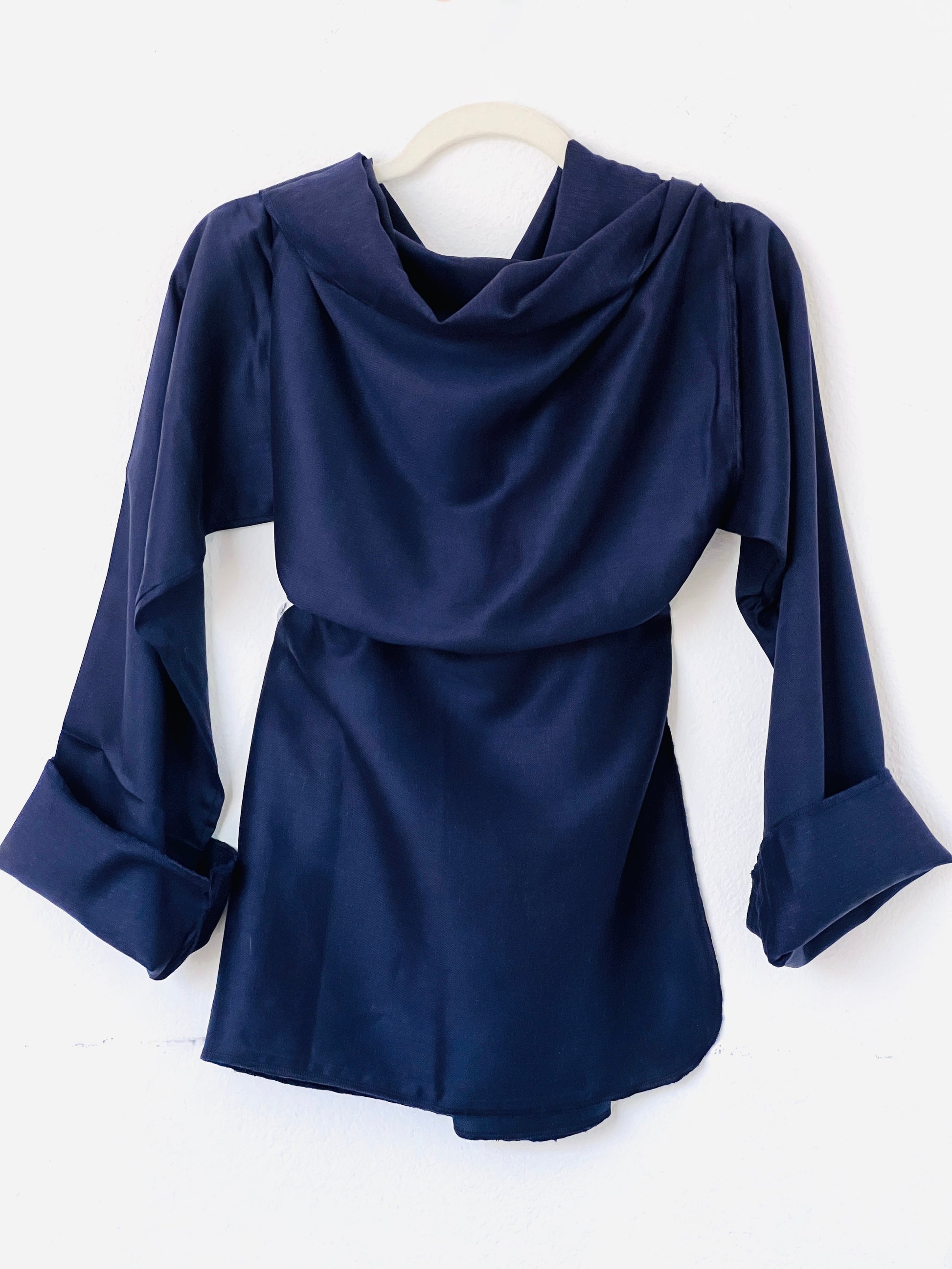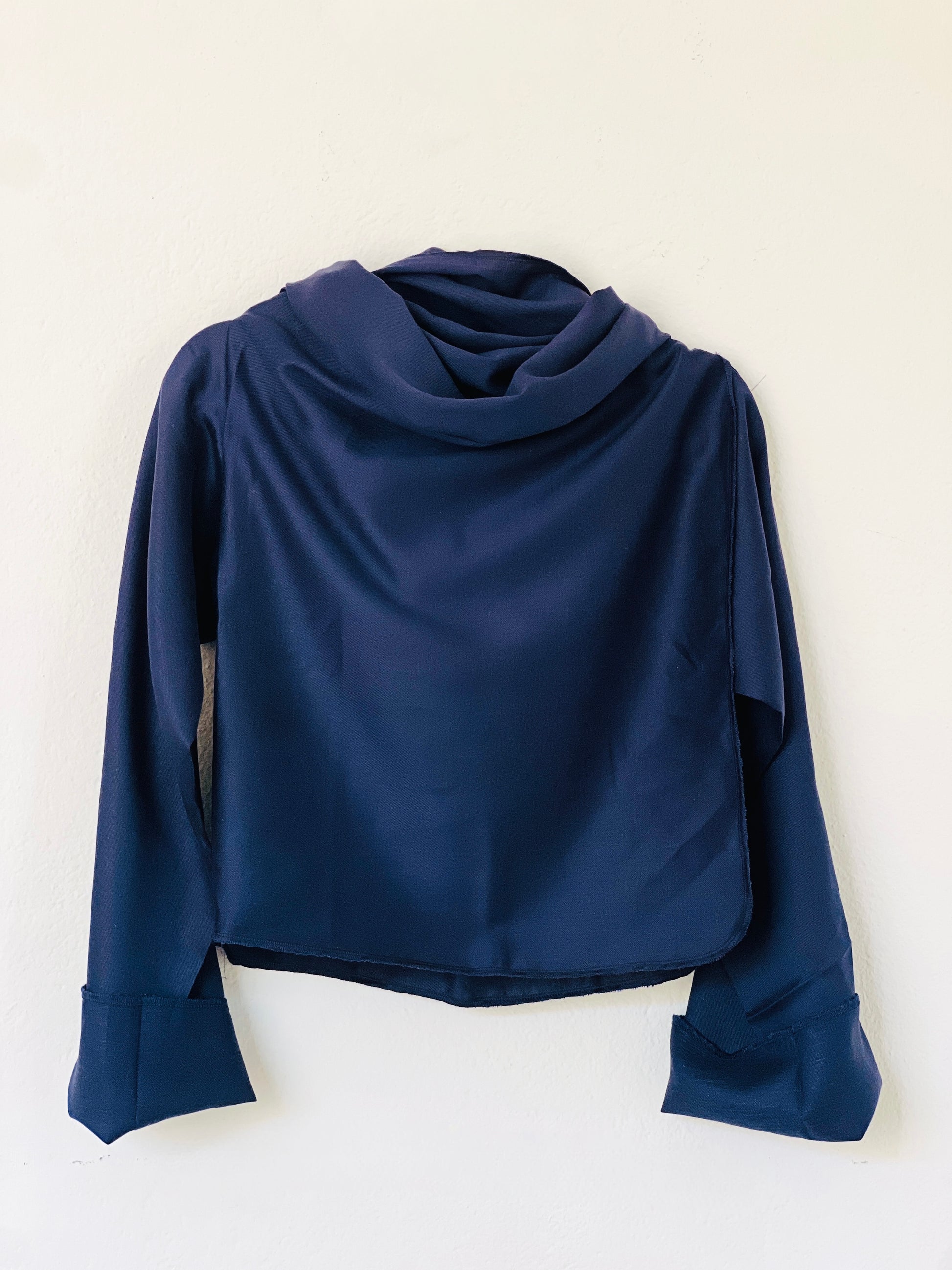 Abrigo en azul marino profundo, confeccionado en un tejido liviano y suave, ideal para clima medio–cálido. Su acabado ligeramente sedoso aporta un toque elegante sin añadir peso. La caída es muy fluida y aérea, creando un drapeado delicado y sofisticado. Una pieza fresca, versátil y perfecta para entretiempo.