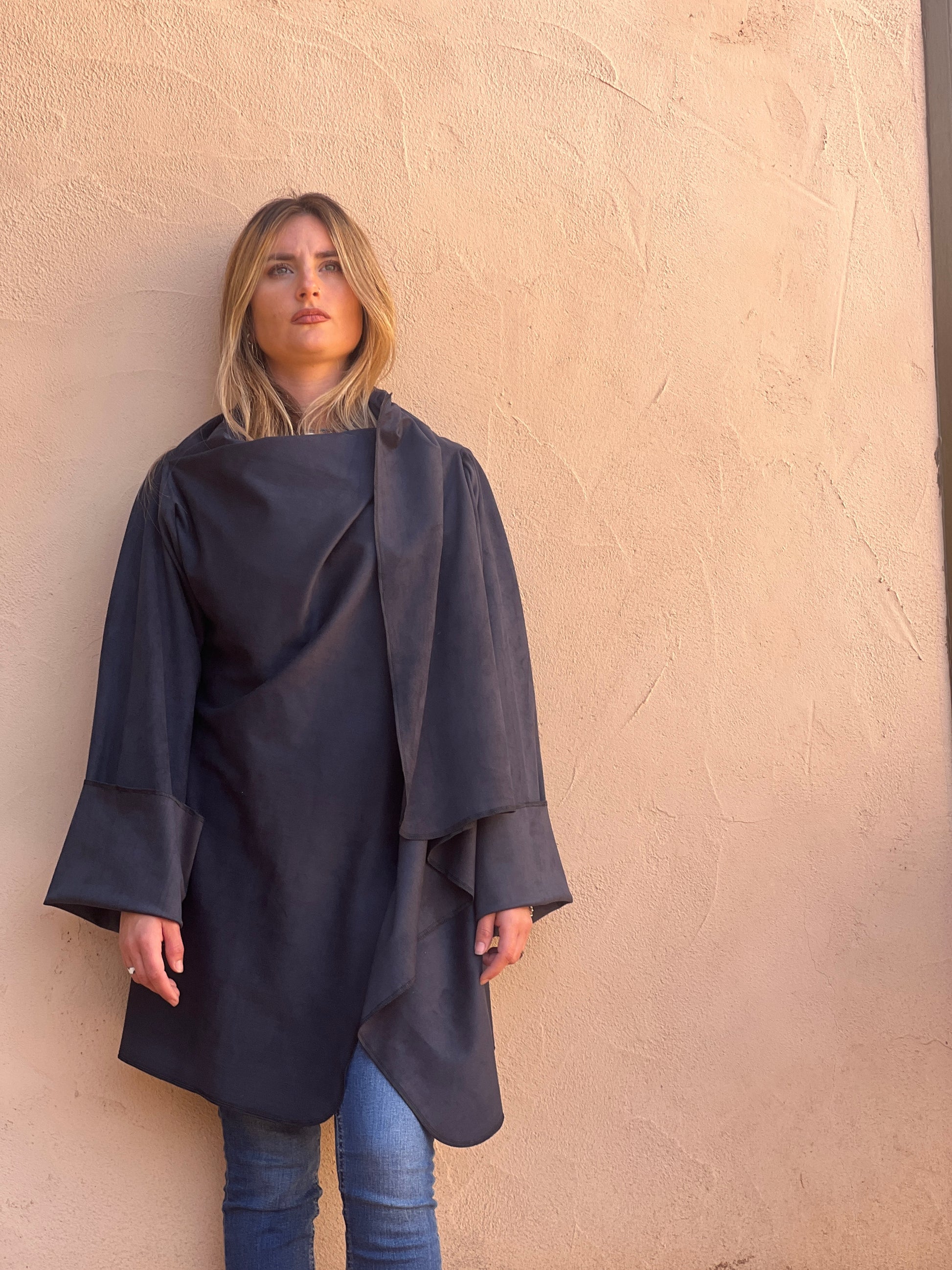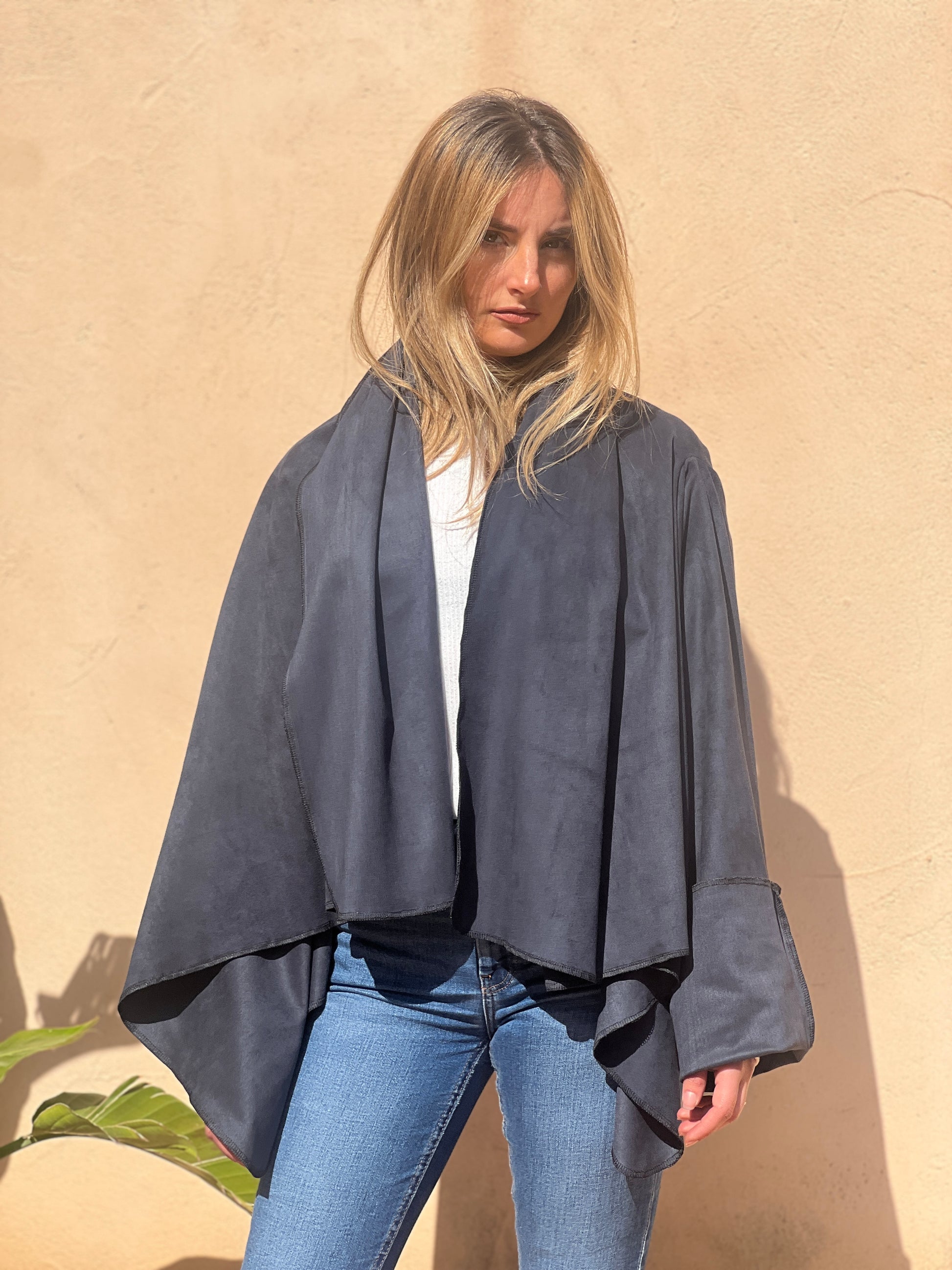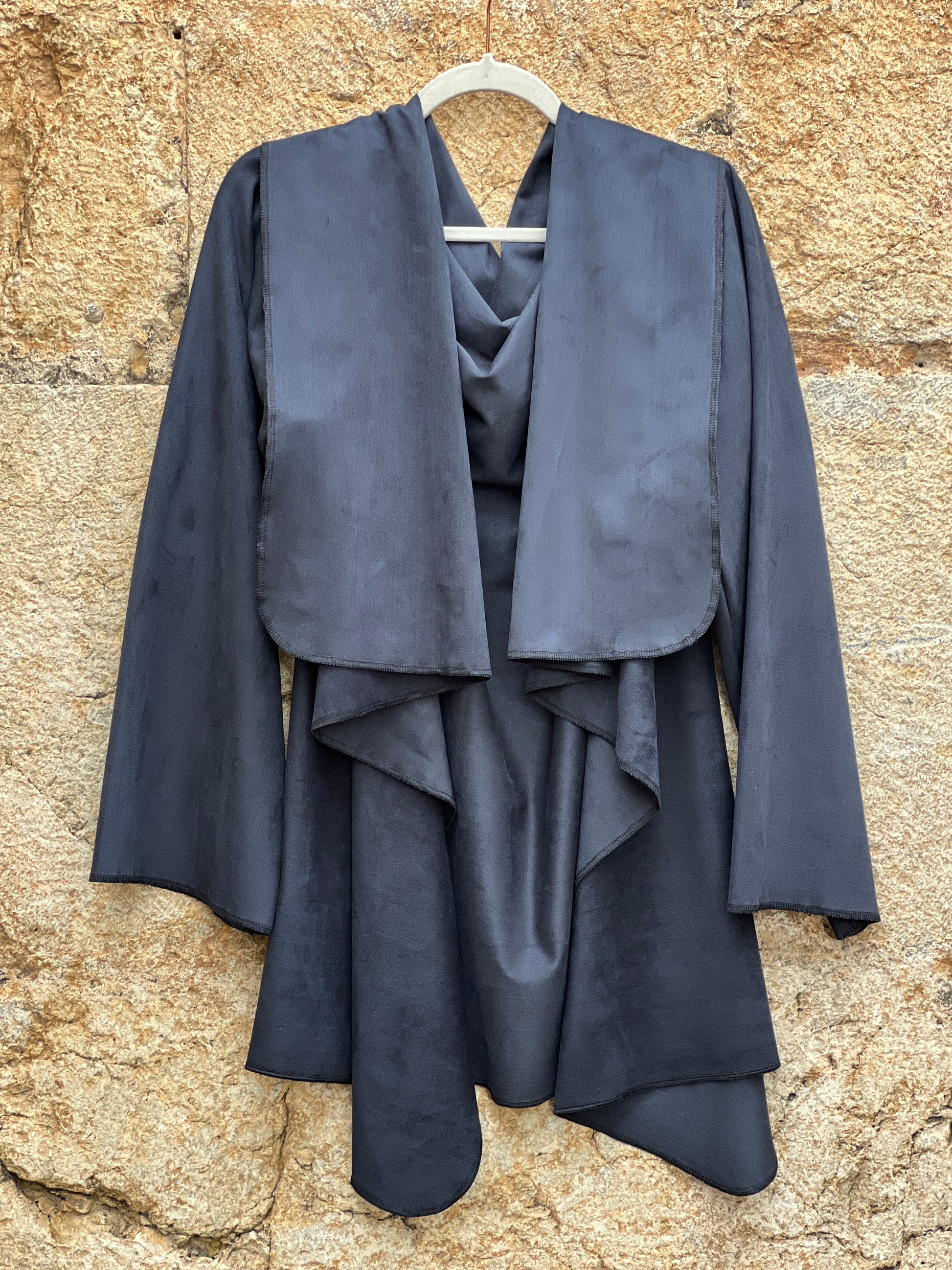 Abrigo en antelina azul petróleo, con textura suave y acabado mate aterciopelado. Su tejido ligero ofrece una caída fluida y limpia, creando un drapeado elegante y minimalista. Una pieza versátil, moderna y muy estilizada.