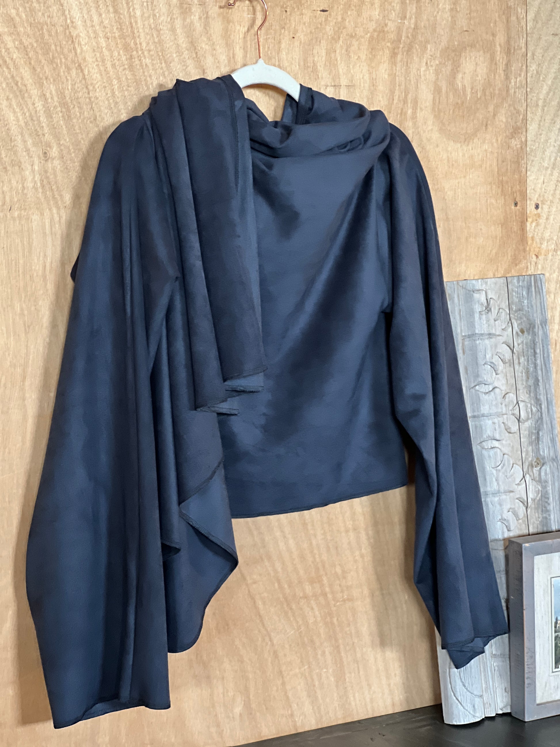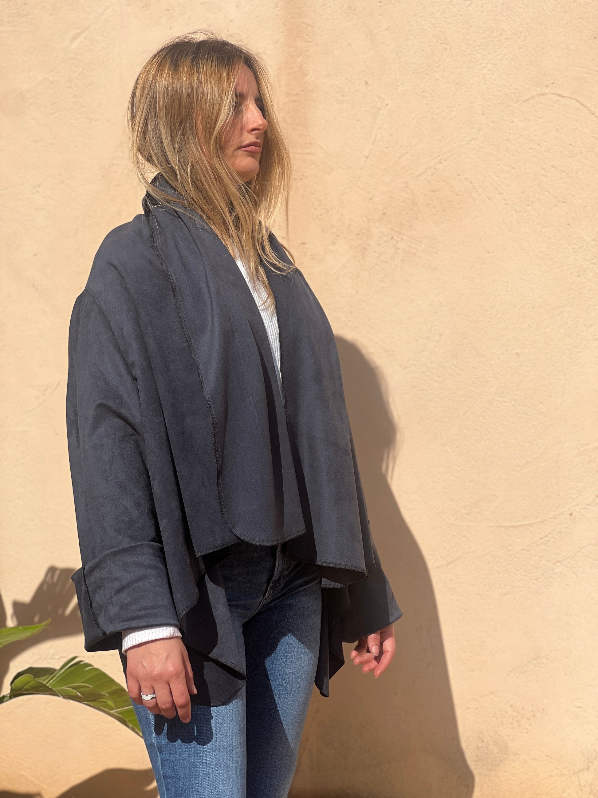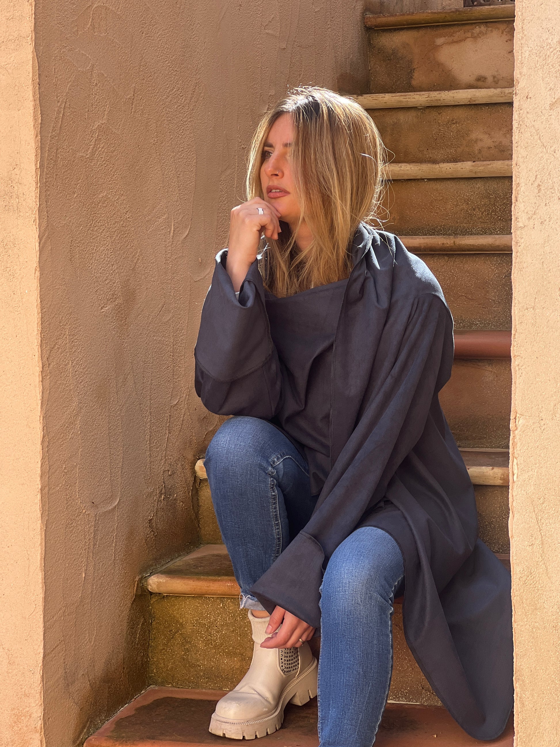Abrigo en antelina azul petróleo, con textura suave y acabado mate aterciopelado. Su tejido ligero ofrece una caída fluida y limpia, creando un drapeado elegante y minimalista. Una pieza versátil, moderna y muy estilizada.