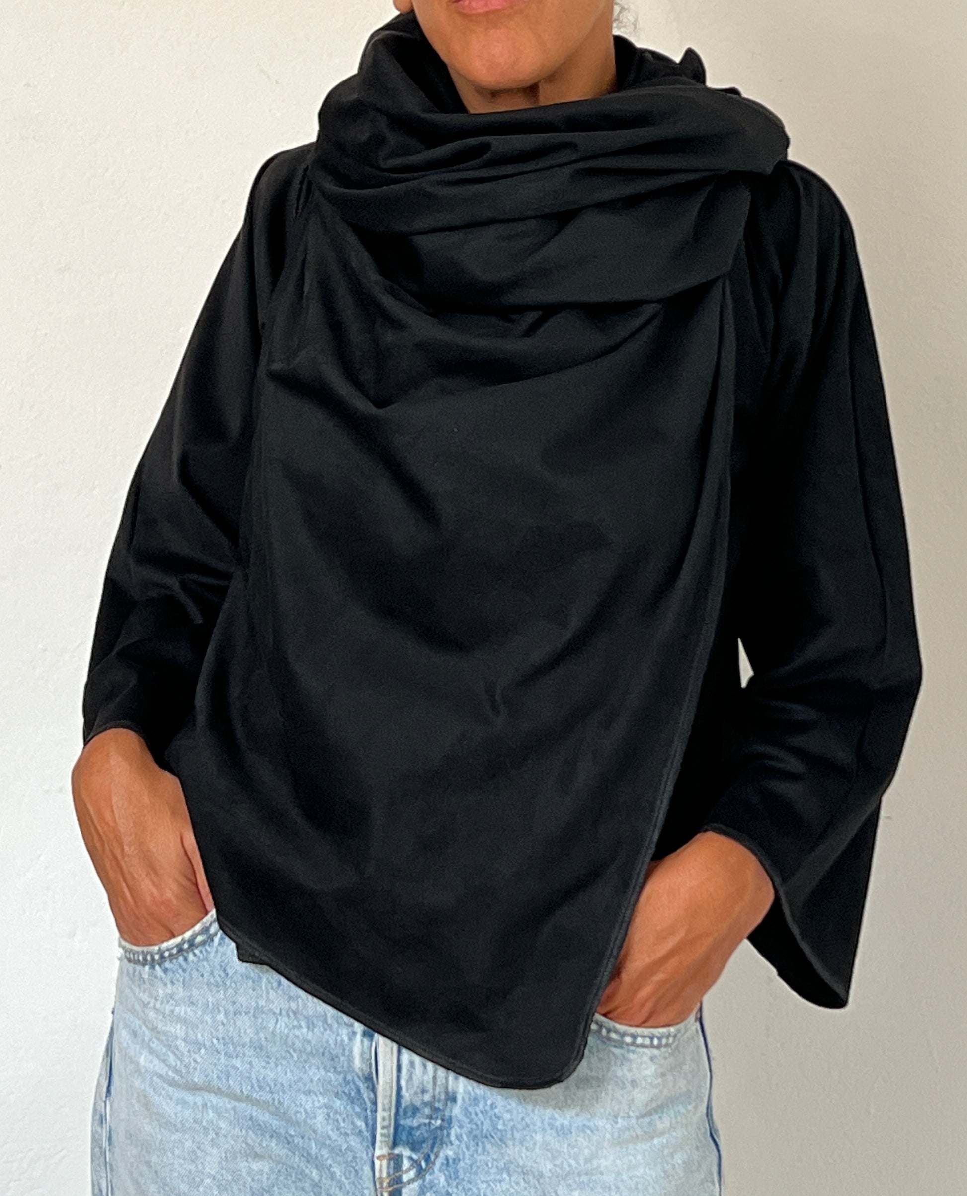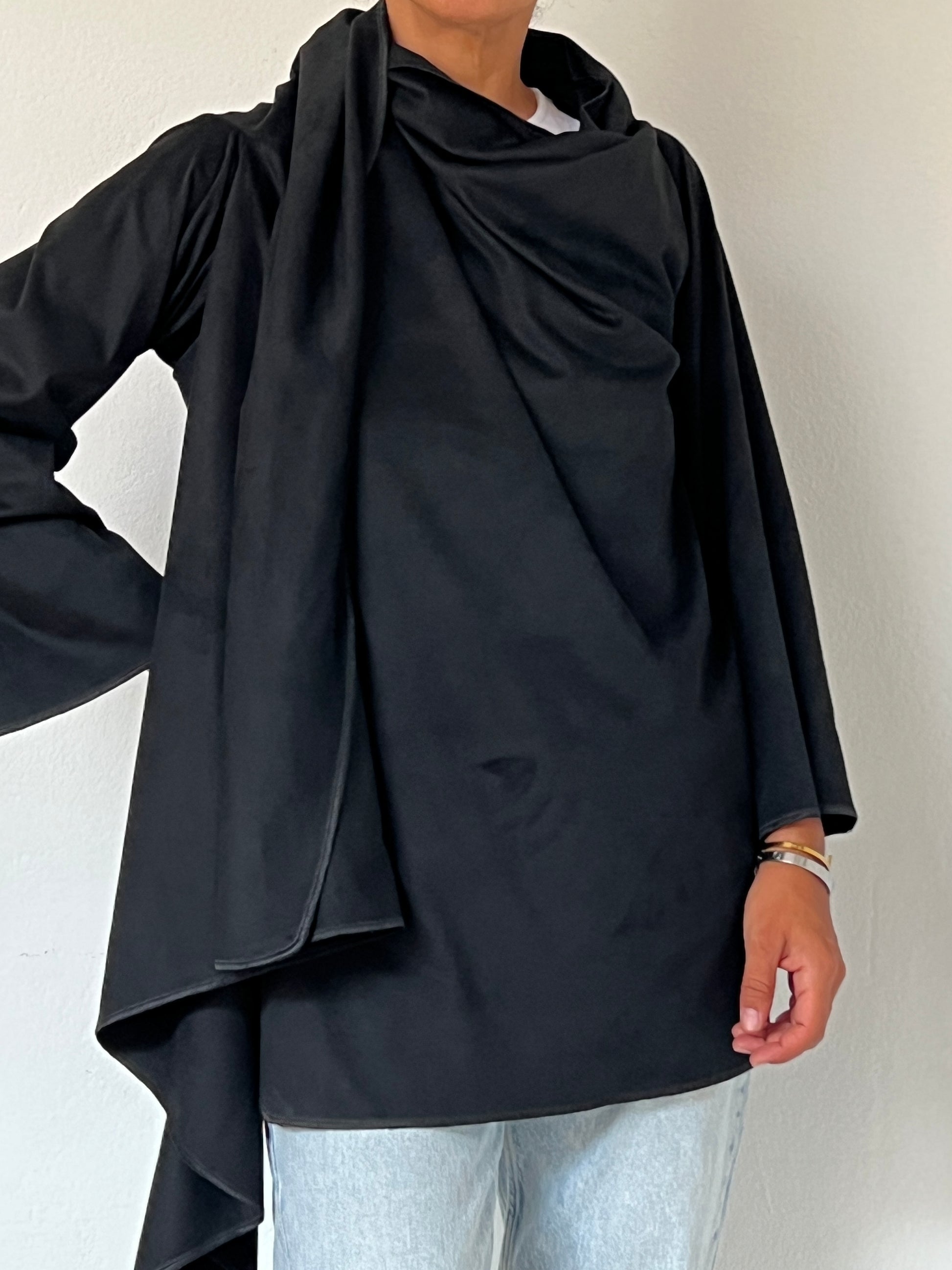El color negro profundo refuerza su carácter atemporal y versátil. Absorbe la luz de forma uniforme, destacando la fluidez del diseño y aportando una sensación de calma y sofisticación.