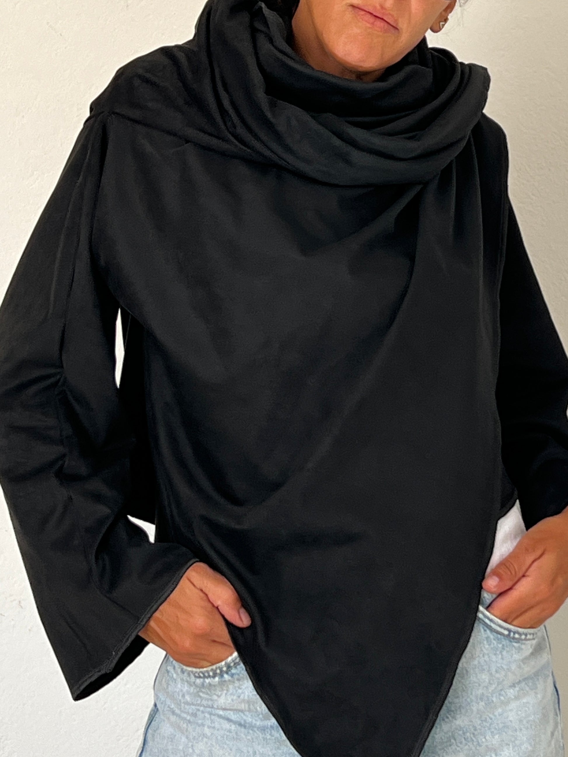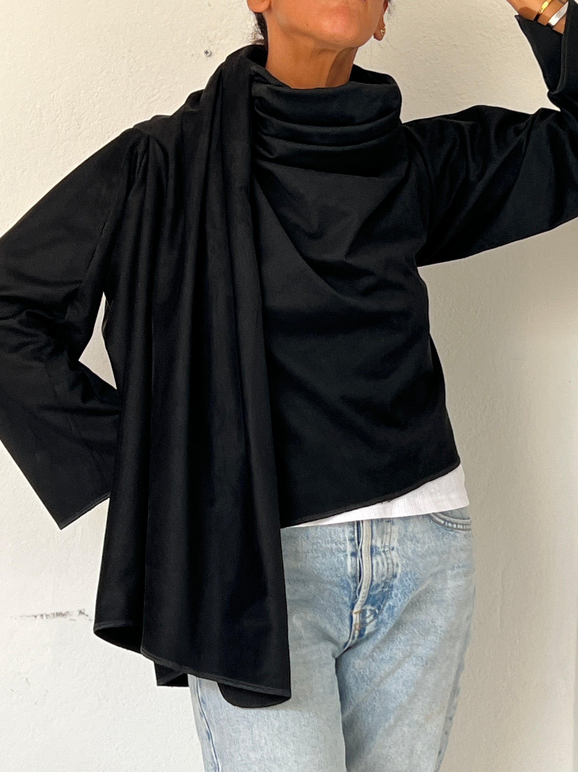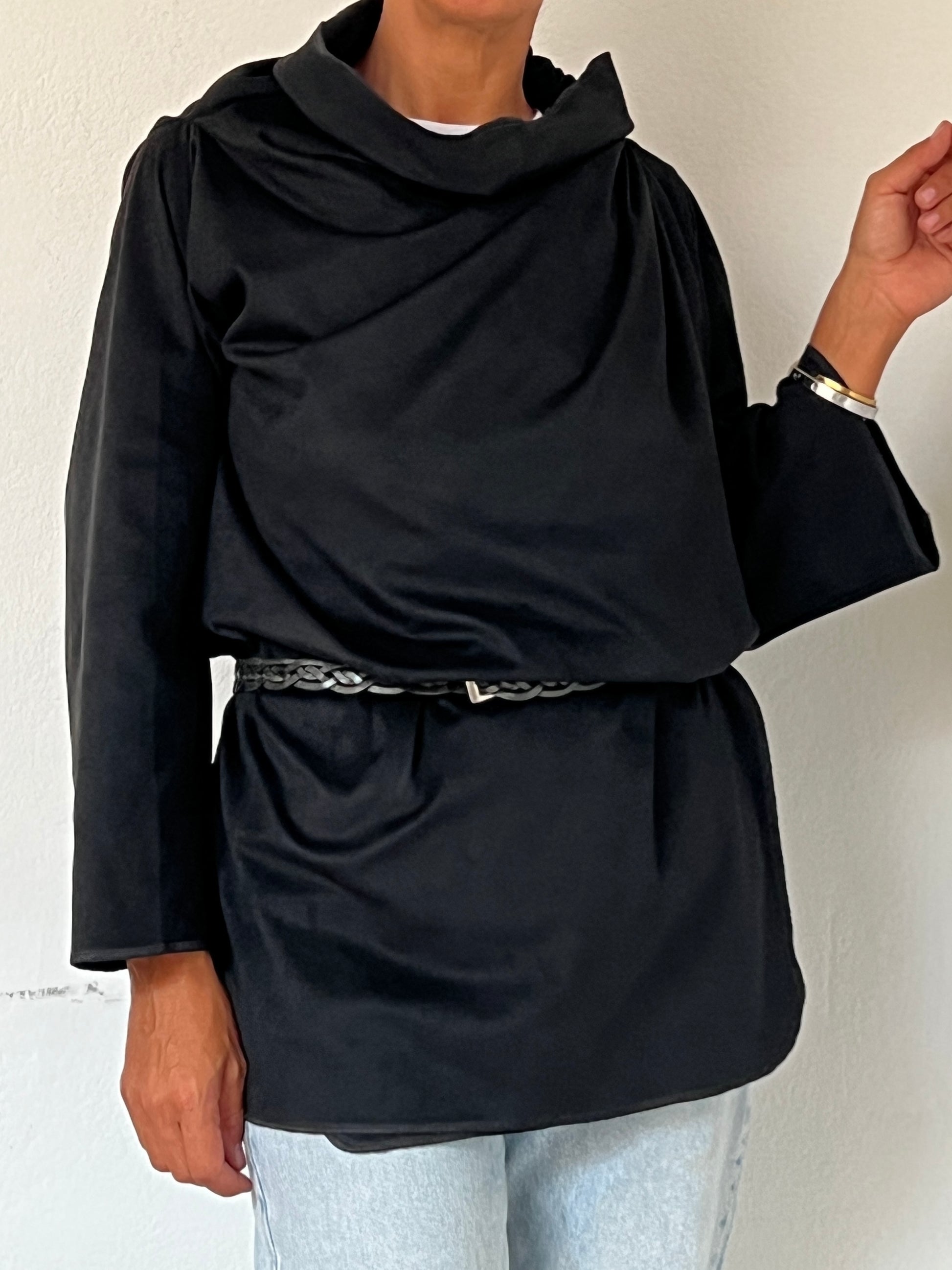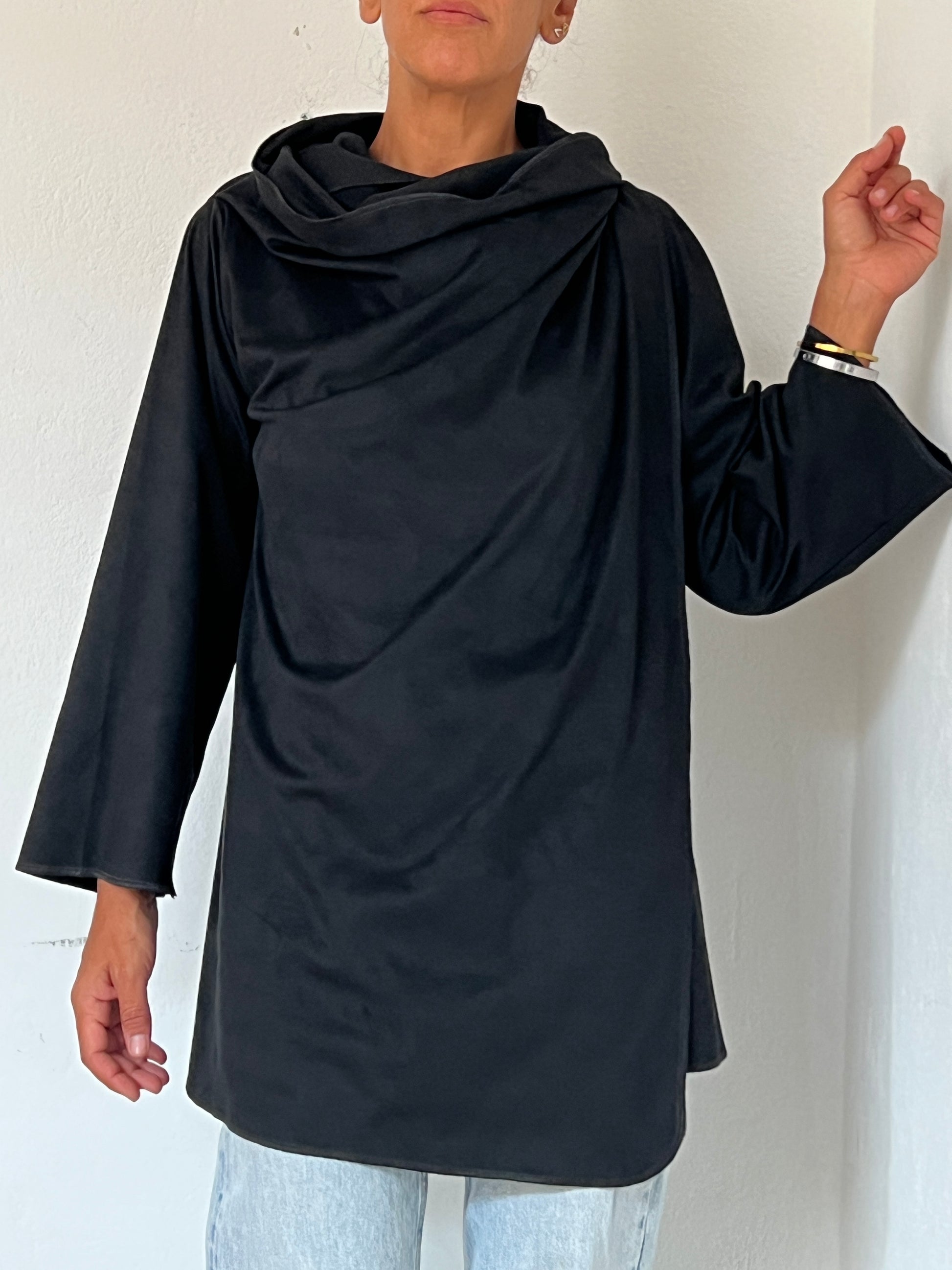 Está confeccionado en una tela ligera y suave, ligeramente aterciopelada, con una caída limpia aporta movimiento sin rigidez. El tejido se adapta al cuerpo con discreción, envolviendo sin marcar y manteniendo una silueta relajada pero cuidada.